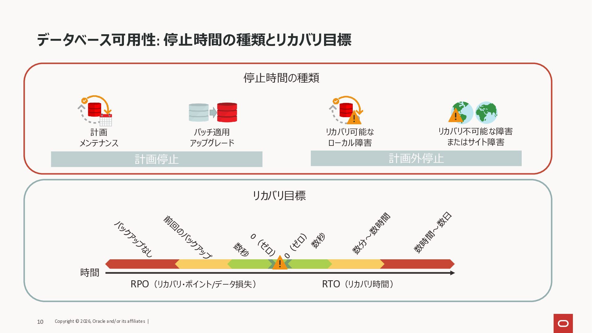 RPO(リカバリ・ポイント/データ損失) RTO(リカバリ時間) 停止時間の種類 リカバリ目標 時間 計画停止 計画外停止 Copyright © 2026, Oracle and/or its affiliates | 10