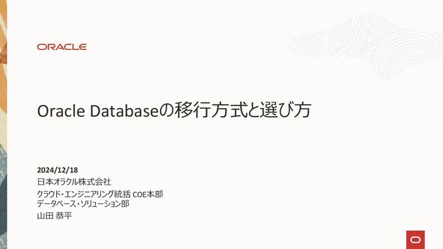 Service) Oracle Databaseの移行ツール/サービスであるZDMとDMSとは • Oracle Database用の移行ツール • Data Pump, GoldenGate, RMAN, Data Guardを内部 的に動作してダウンタイムを極小化した移行を実行す る • コマンド・ベースの操作 • 詳細な移行要件の指定が可能 • 無償 • Oracle Database用の移行サービス • ZDM (Data Pump, GoldenGate)を内部的に動作してダ ウンタイムを極小化した移行を実行する • OCI上でのGUIベースの操作 • 無償 Copyright © 2024, Oracle and/or its affiliates 18