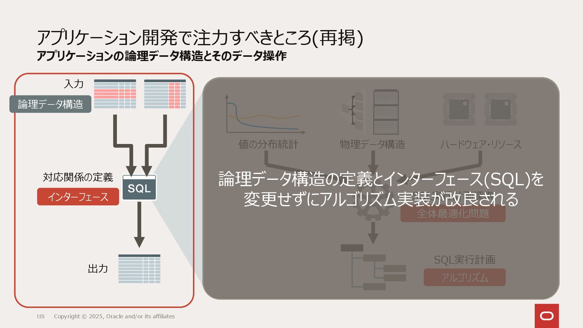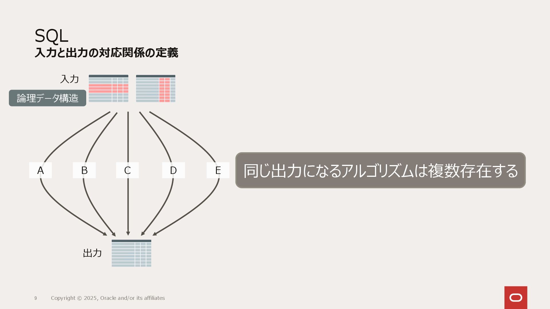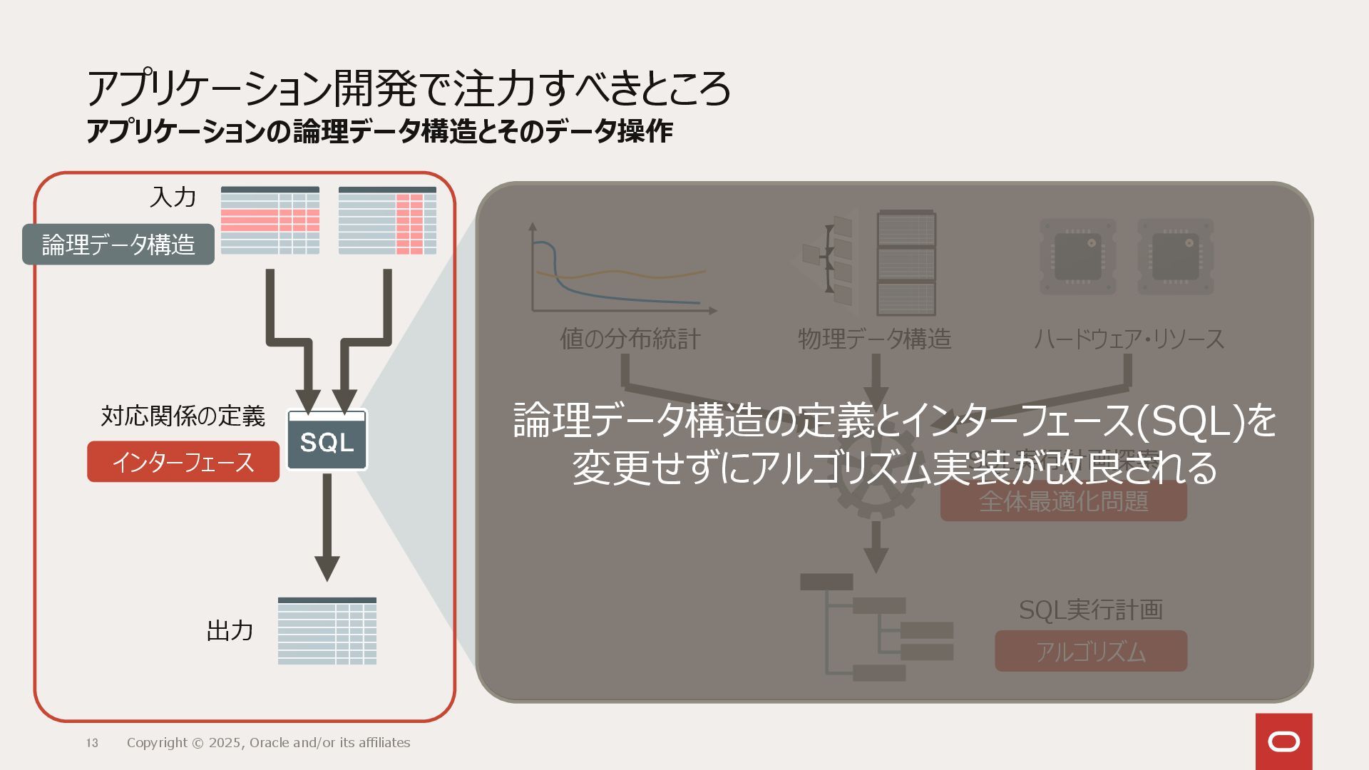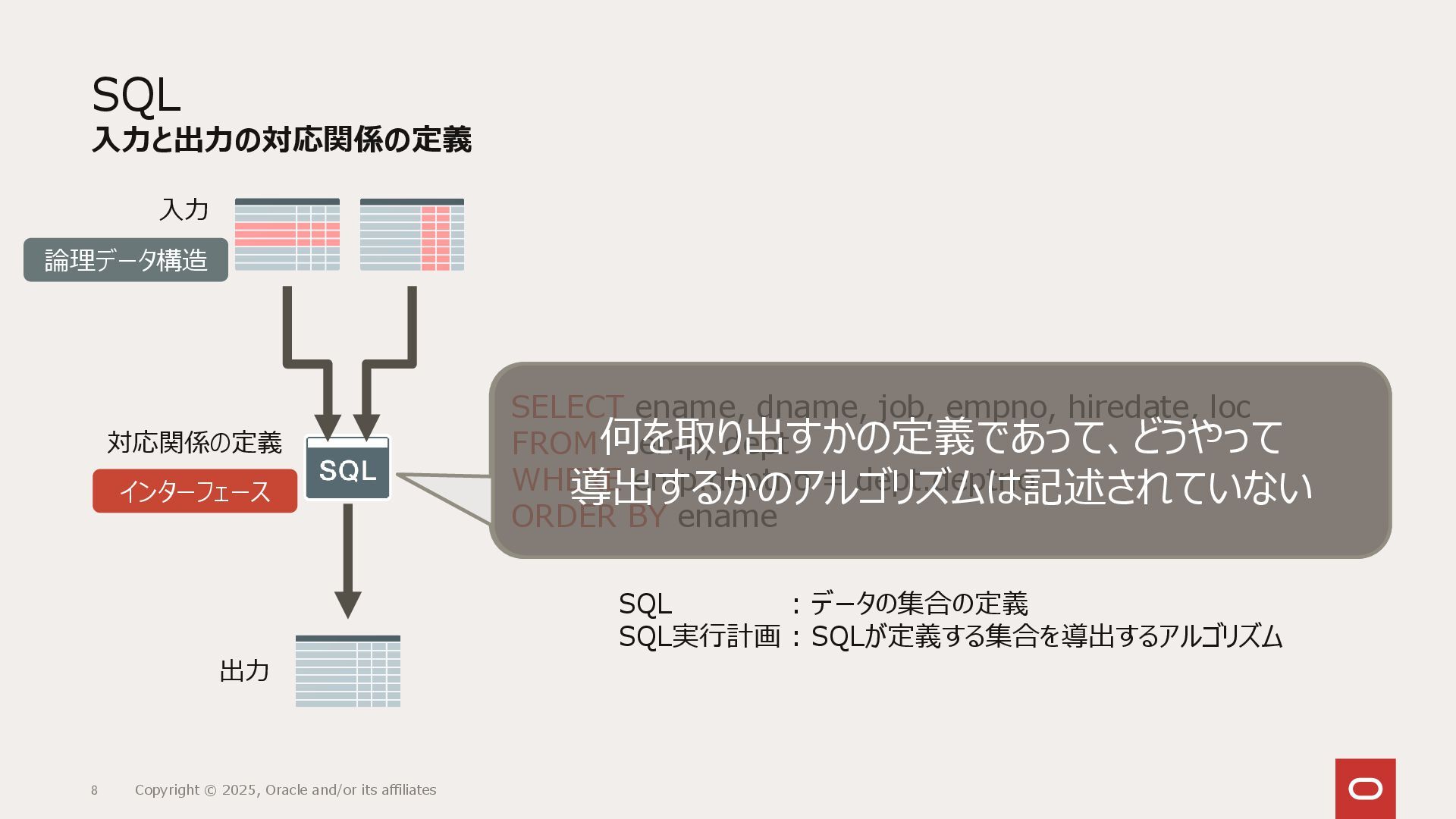 つまり、SQLをインターフェースとして、内部実装をユーザーに見せないように動作します。