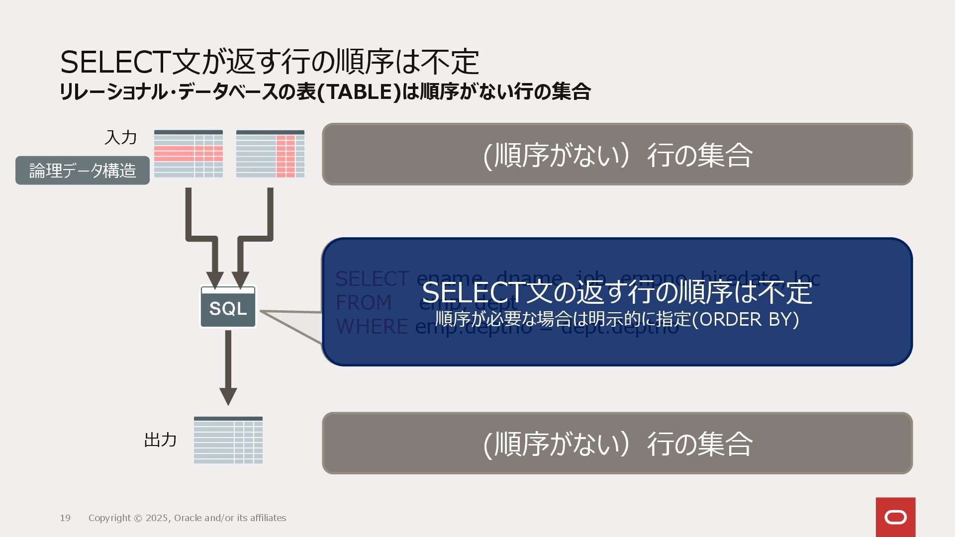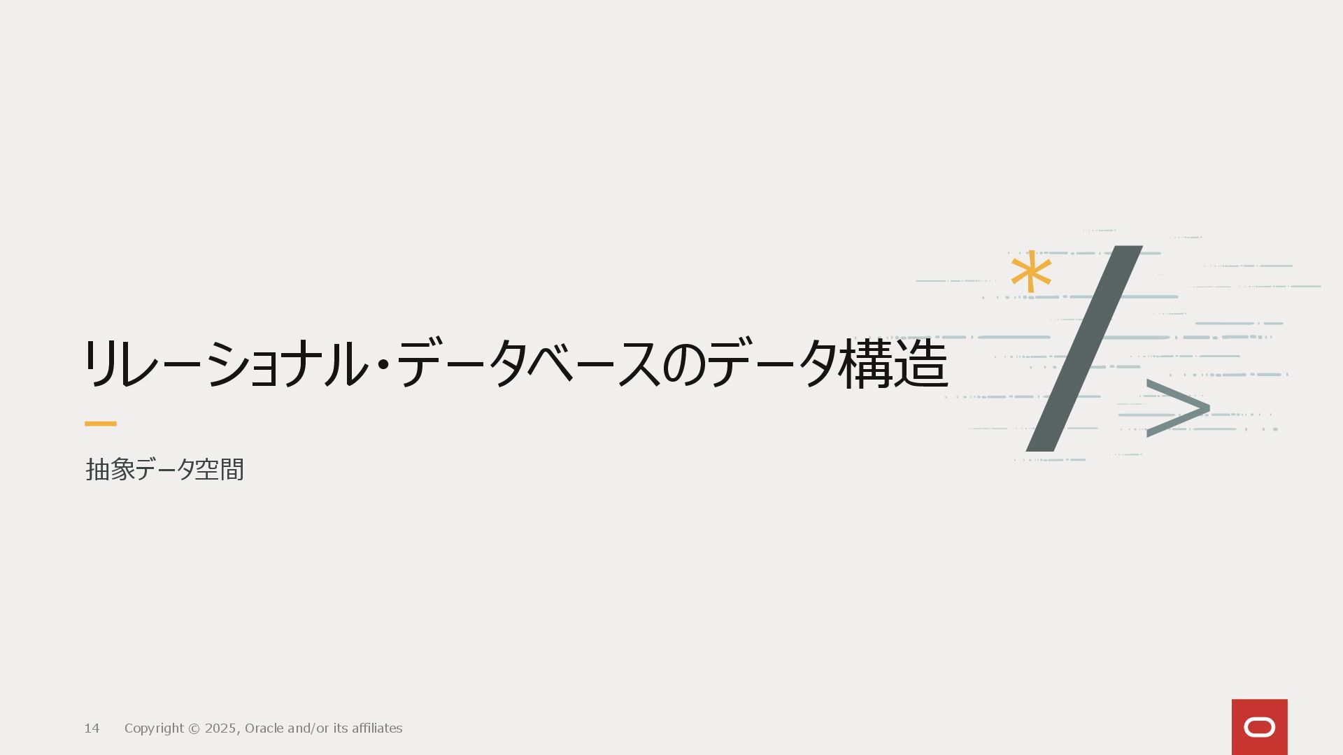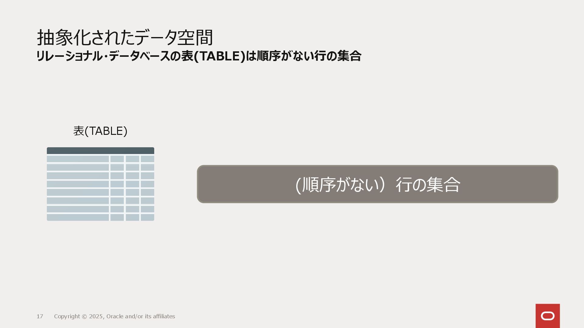リレーショナル・データベース(RDBMS)は表として抽象化されたデータの集合に対し、どういうデータを取り出すかの集合のみを定義するSQLによってアクセスします。