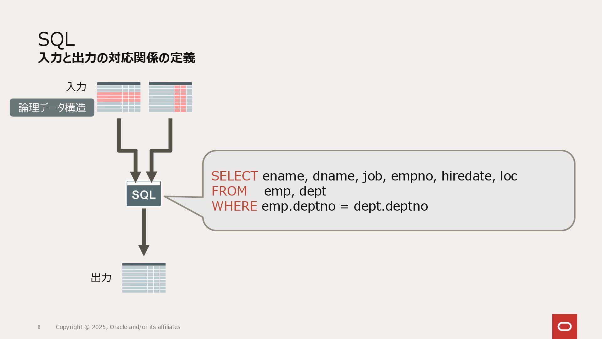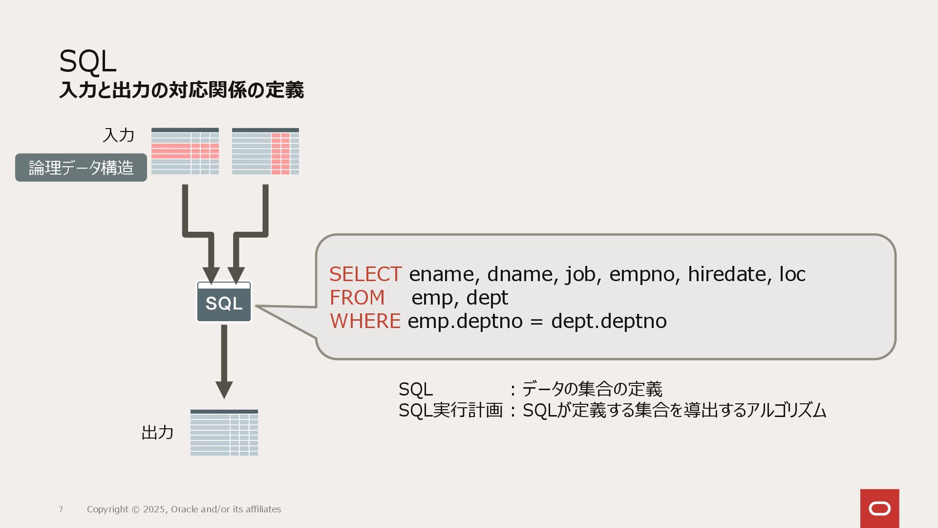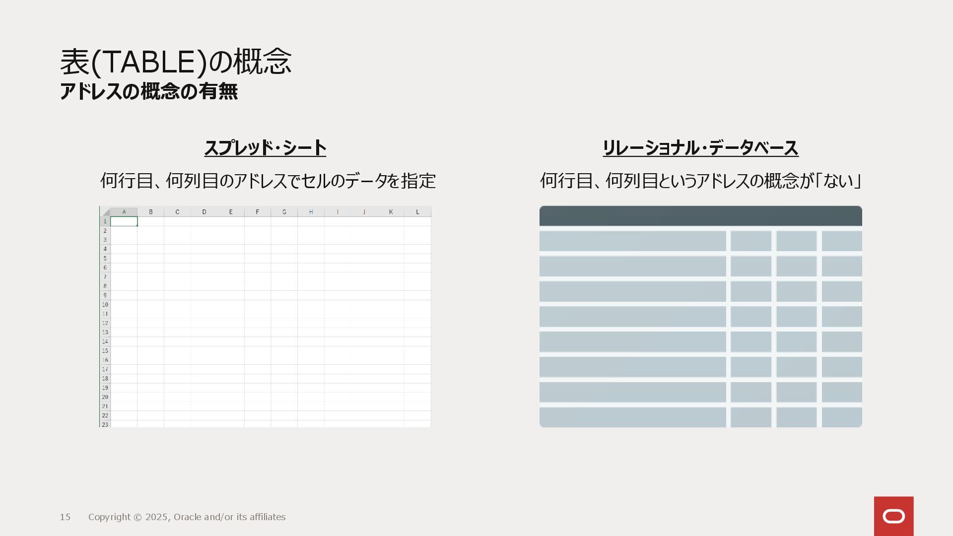 リレーショナル・データベース(RDBMS)は表として抽象化されたデータの集合に対し、どういうデータを取り出すかの集合のみを定義するSQLによってアクセスします。