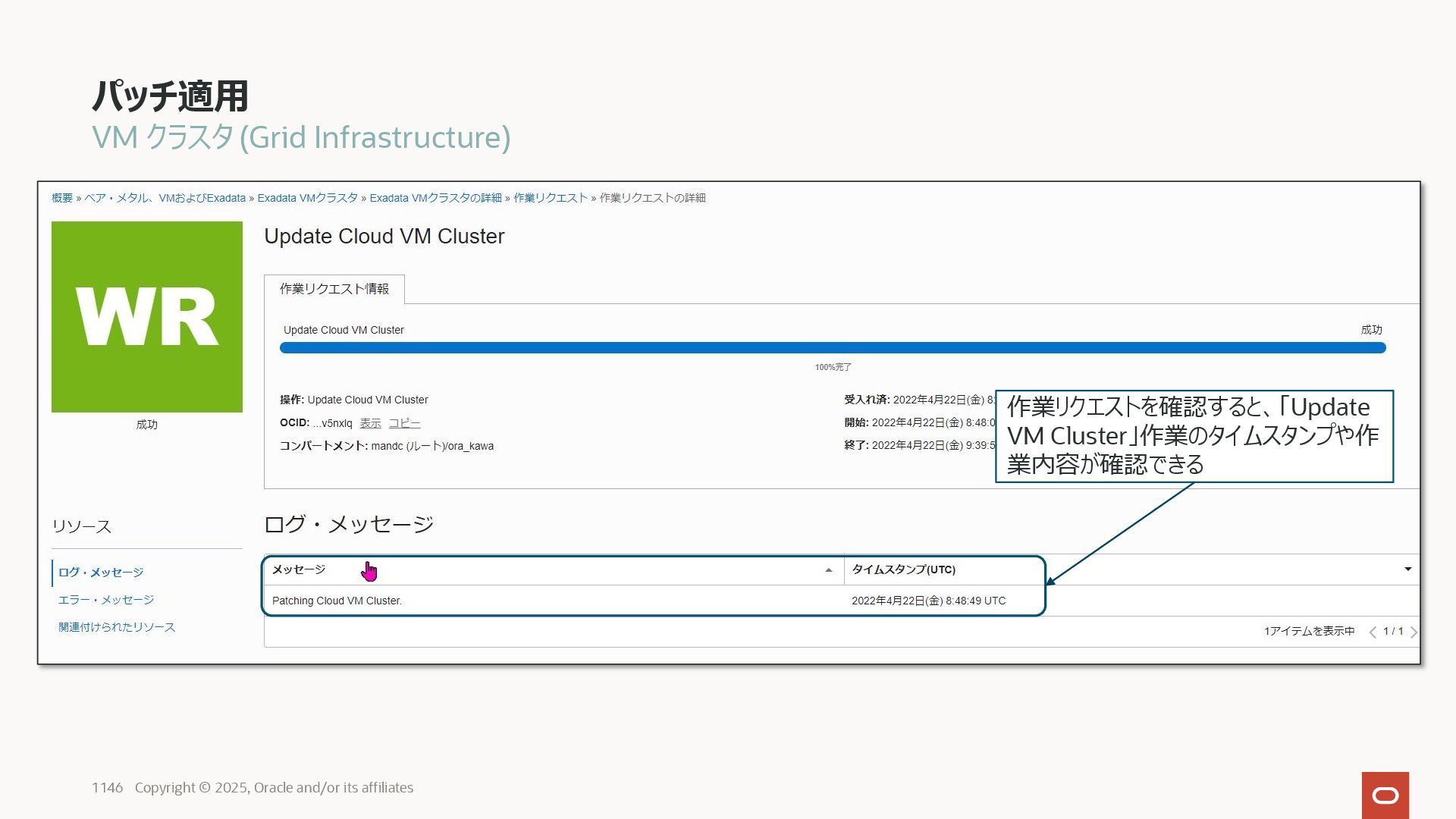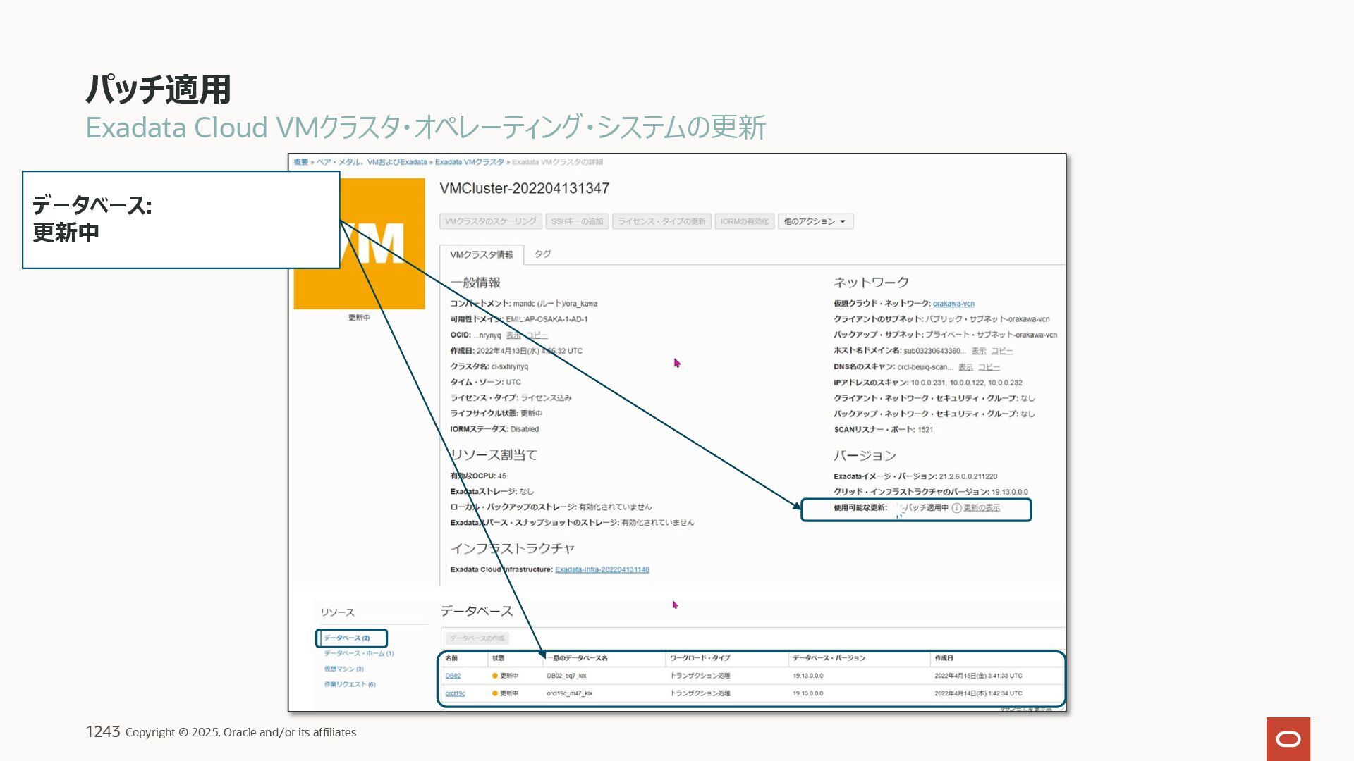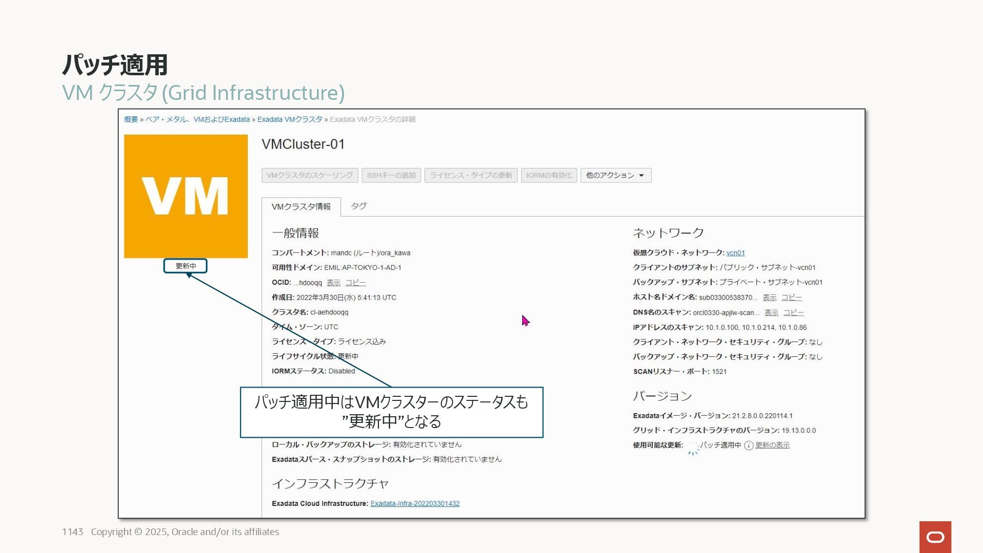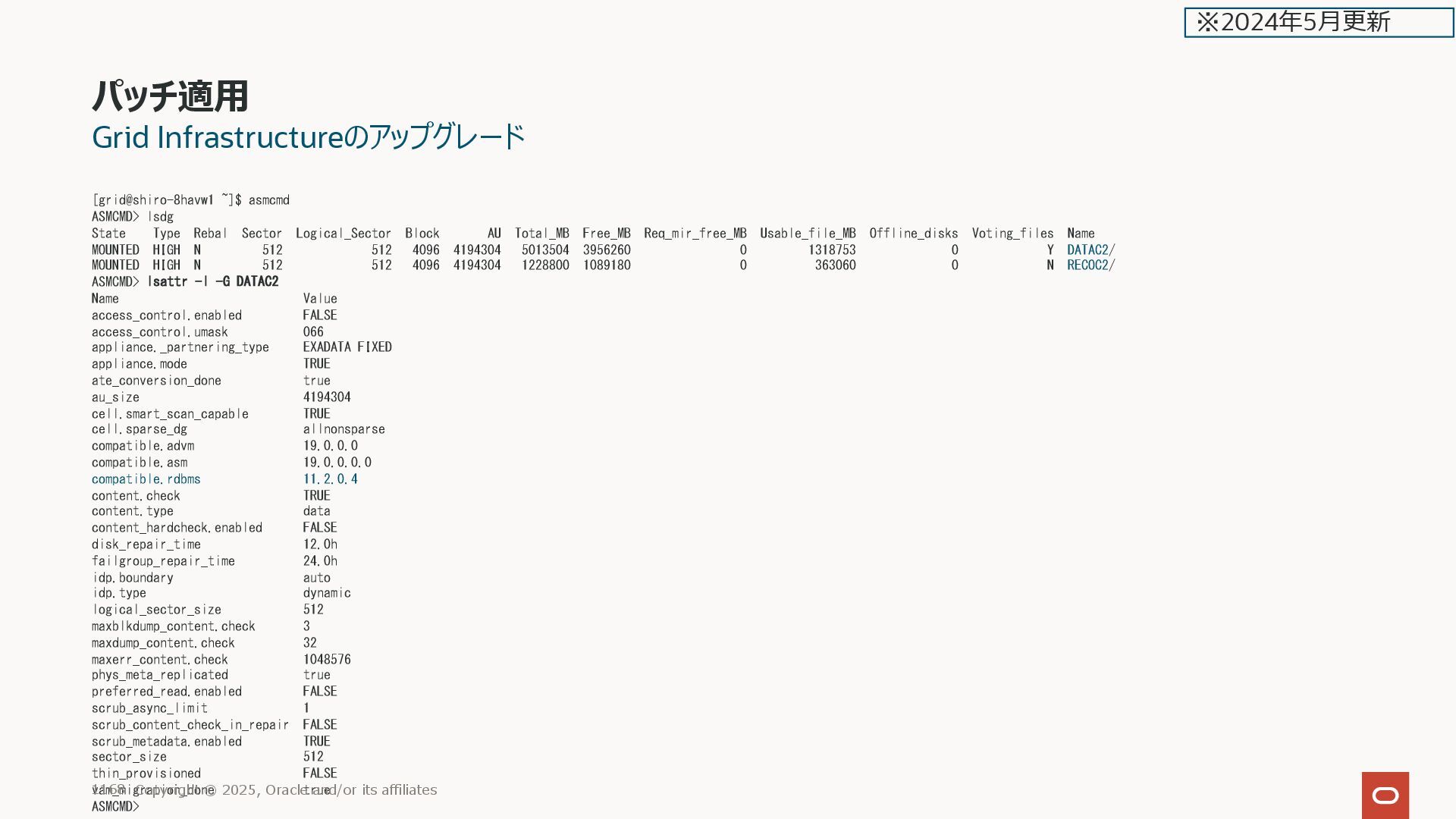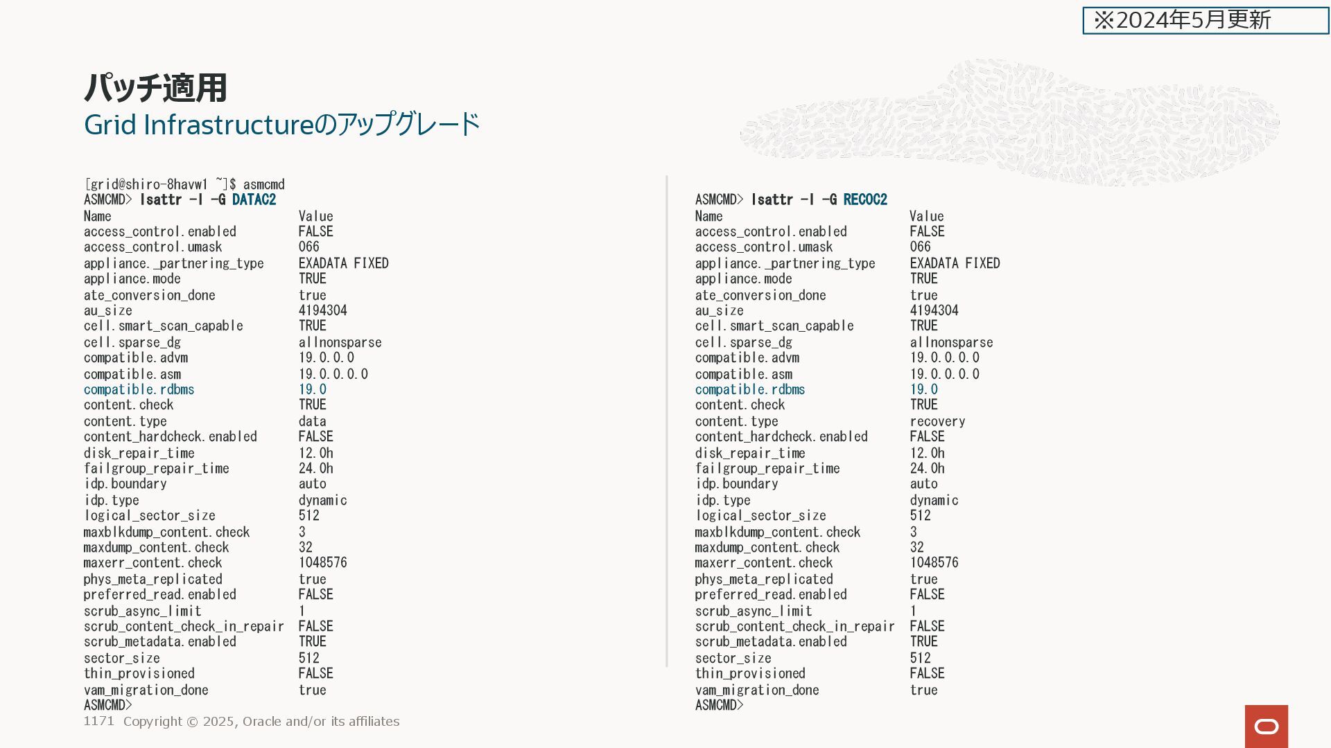 2025-04-03T01:31:51.131744+00:00 SQL> ALTER DISKGROUP DATAC2 DROP DISK 'DATAC2_CD_00_kix101117exdcl10', 'DATAC2_CD_01_kix101117exdcl10', 'DATAC2_CD_02_kix101117exdcl10', 'DATAC2_CD_03_kix101117exdcl10', 'DATAC2_CD_04_kix101117exdcl10', 'DATAC2_CD_05_kix101117exdcl10', 'DATAC2_CD_06_kix101117exdcl10', 'DATAC2_CD_07_kix101117exdcl10', 'DATAC2_CD_08_kix101117exdcl10', 'DATAC2_CD_09_kix101117exdcl10', 'DATAC2_CD_10_kix101117exdcl10', 'DATAC2_CD_11_kix101117exdcl10' REBALANCE POWER 4 略 SUCCESS: ALTER DISKGROUP RECOC2 DROP DISK 'RECOC2_CD_00_kix101117exdcl10', 'RECOC2_CD_01_kix101117exdcl10', 'RECOC2_CD_02_kix101117exdcl10', 'RECOC2_CD_03_kix101117exdcl10', 'RECOC2_CD_04_kix101117exdcl10', 'RECOC2_CD_05_kix101117exdcl10', 'RECOC2_CD_06_kix101117exdcl10', 'RECOC2_CD_07_kix101117exdcl10', 'RECOC2_CD_08_kix101117exdcl10', 'RECOC2_CD_09_kix101117exdcl10', 'RECOC2_CD_10_kix101117exdcl10', 'RECOC2_CD_11_kix101117exdcl10' REBALANCE POWER 4 NOTE: Attempting voting file refresh on diskgroup RECOC2 NOTE: Refresh completed on diskgroup RECOC2. No voting file found. 2025-04-03T01:32:19.466977+00:00 Exadata Infrastructure Copyright © 2025, Oracle and/or its affiliates 132 ※2025年4⽉更新