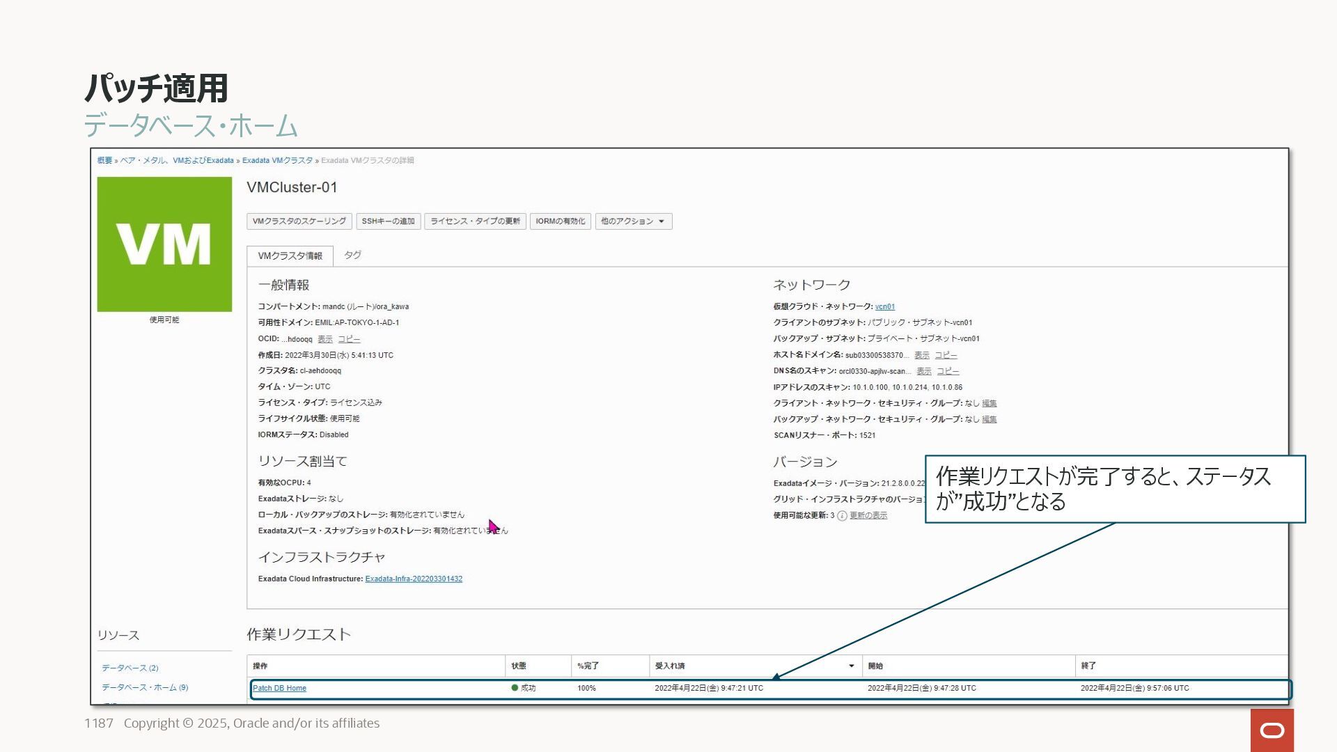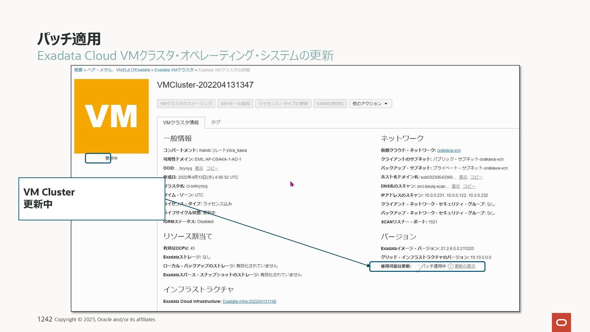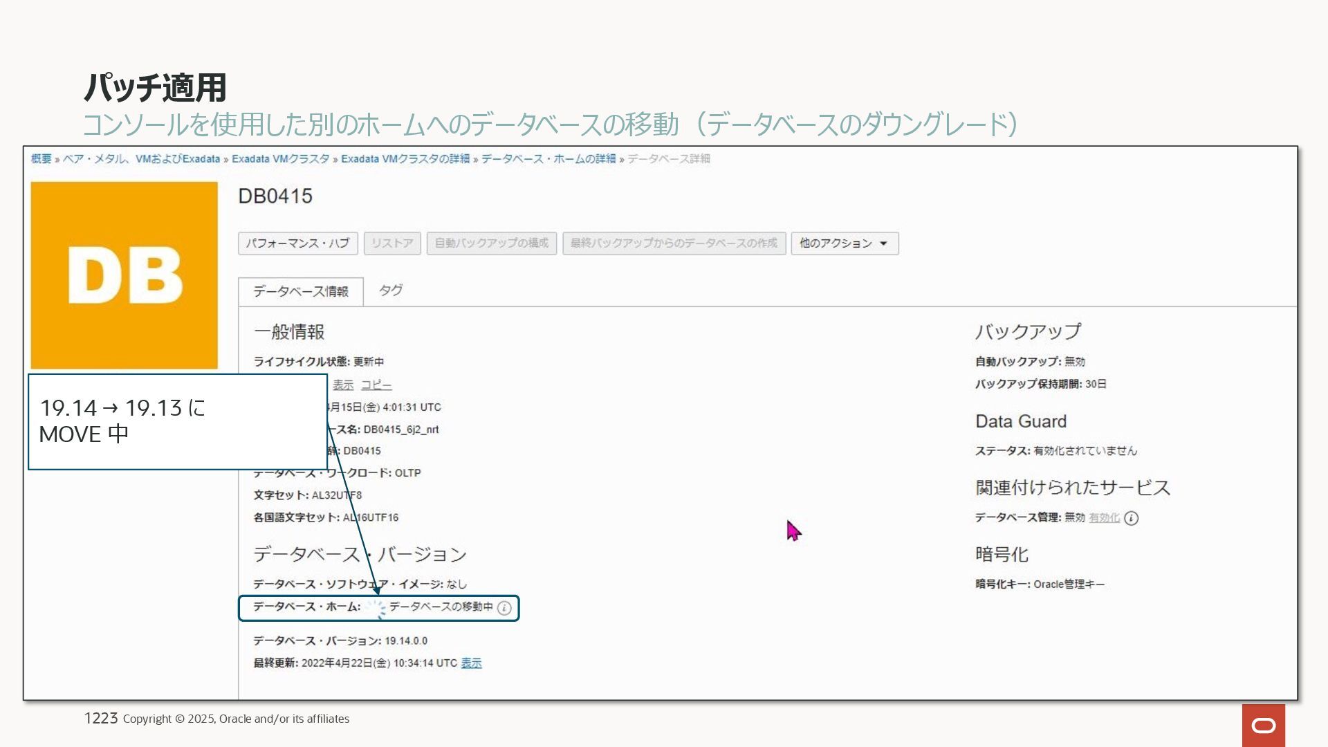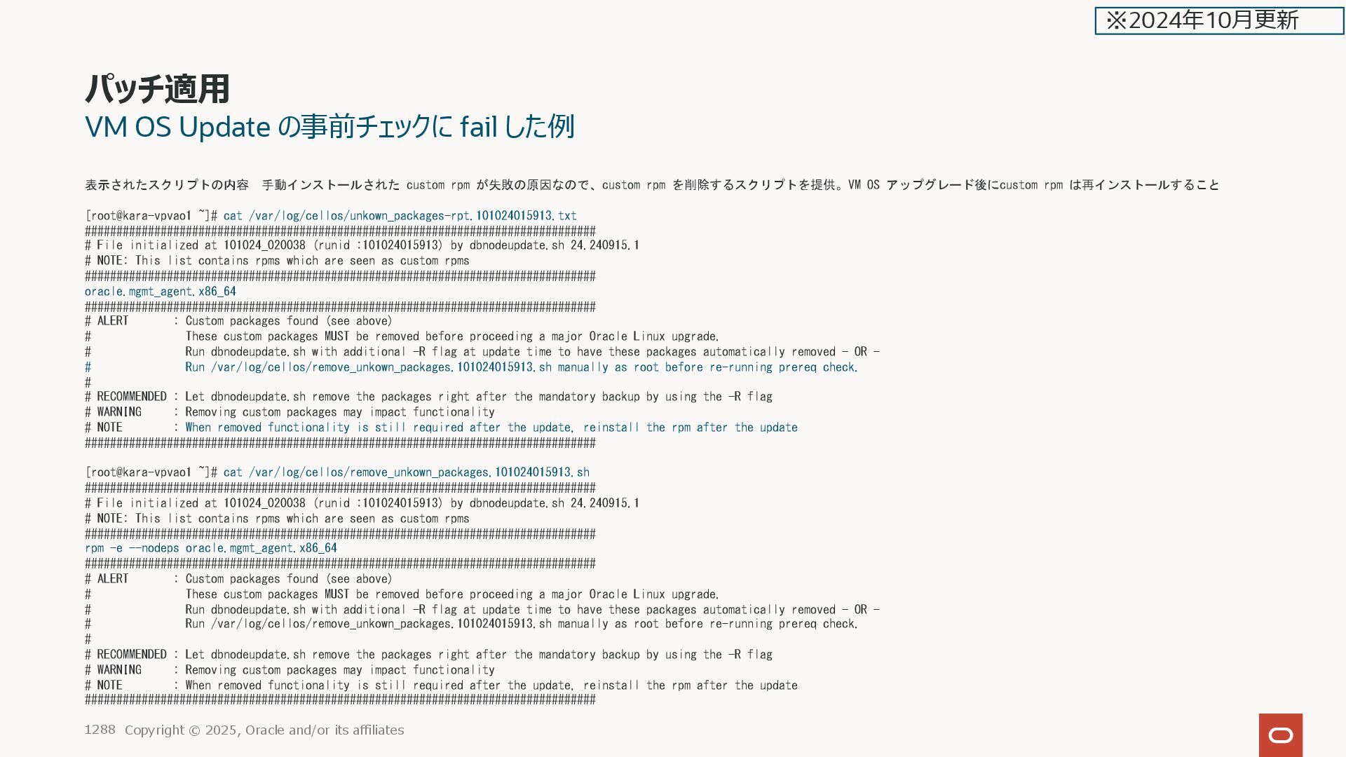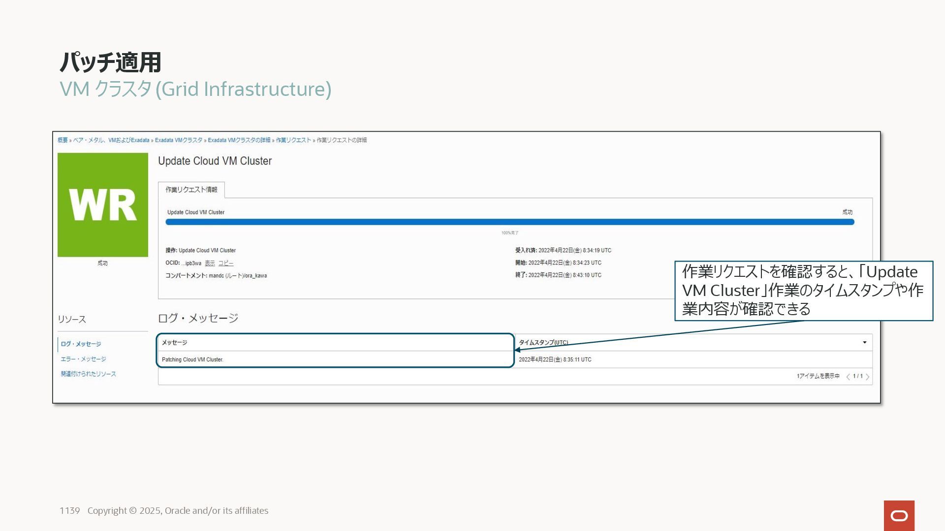 2025-04-03T01:31:51.131744+00:00 SQL> ALTER DISKGROUP DATAC2 DROP DISK 'DATAC2_CD_00_kix101117exdcl10', 'DATAC2_CD_01_kix101117exdcl10', 'DATAC2_CD_02_kix101117exdcl10', 'DATAC2_CD_03_kix101117exdcl10', 'DATAC2_CD_04_kix101117exdcl10', 'DATAC2_CD_05_kix101117exdcl10', 'DATAC2_CD_06_kix101117exdcl10', 'DATAC2_CD_07_kix101117exdcl10', 'DATAC2_CD_08_kix101117exdcl10', 'DATAC2_CD_09_kix101117exdcl10', 'DATAC2_CD_10_kix101117exdcl10', 'DATAC2_CD_11_kix101117exdcl10' REBALANCE POWER 4 略 SUCCESS: ALTER DISKGROUP RECOC2 DROP DISK 'RECOC2_CD_00_kix101117exdcl10', 'RECOC2_CD_01_kix101117exdcl10', 'RECOC2_CD_02_kix101117exdcl10', 'RECOC2_CD_03_kix101117exdcl10', 'RECOC2_CD_04_kix101117exdcl10', 'RECOC2_CD_05_kix101117exdcl10', 'RECOC2_CD_06_kix101117exdcl10', 'RECOC2_CD_07_kix101117exdcl10', 'RECOC2_CD_08_kix101117exdcl10', 'RECOC2_CD_09_kix101117exdcl10', 'RECOC2_CD_10_kix101117exdcl10', 'RECOC2_CD_11_kix101117exdcl10' REBALANCE POWER 4 NOTE: Attempting voting file refresh on diskgroup RECOC2 NOTE: Refresh completed on diskgroup RECOC2. No voting file found. 2025-04-03T01:32:19.466977+00:00 Exadata Infrastructure Copyright © 2025, Oracle and/or its affiliates 132 ※2025年4⽉更新