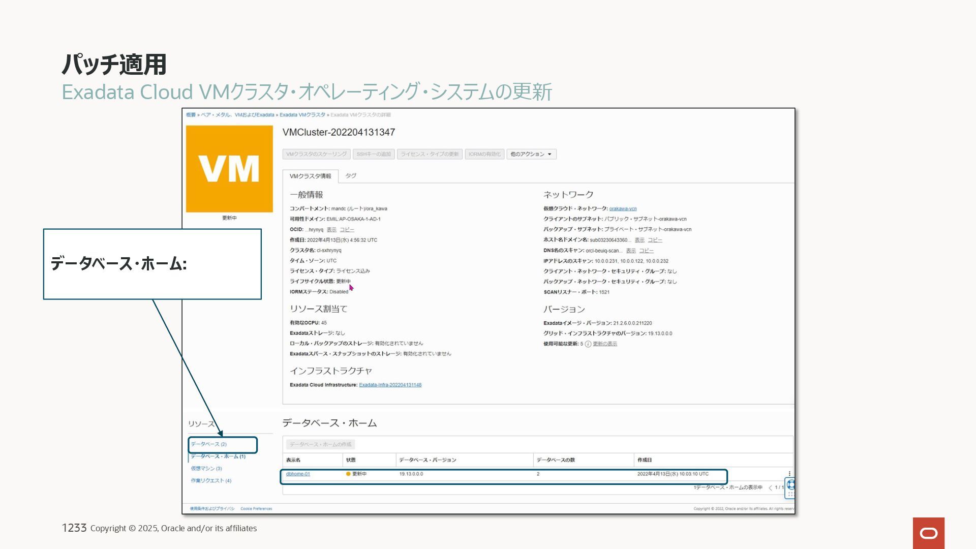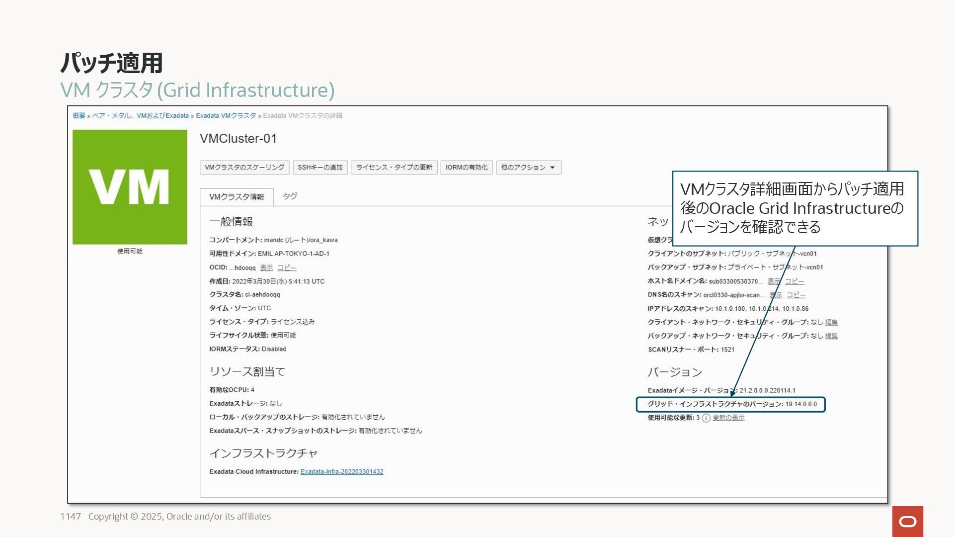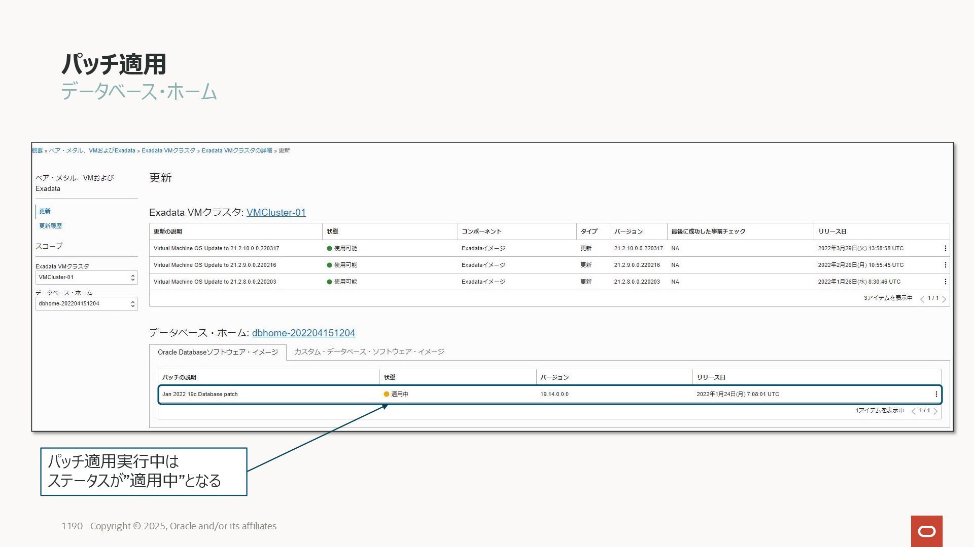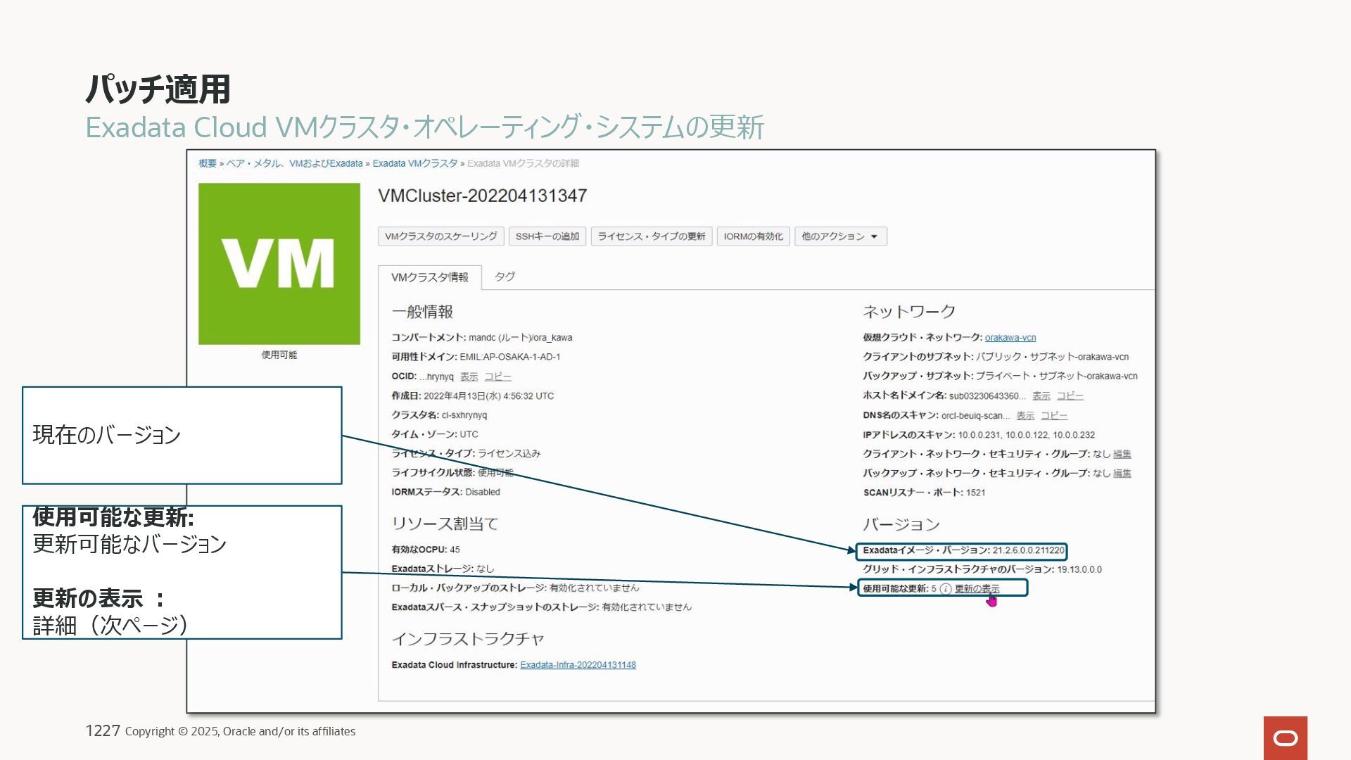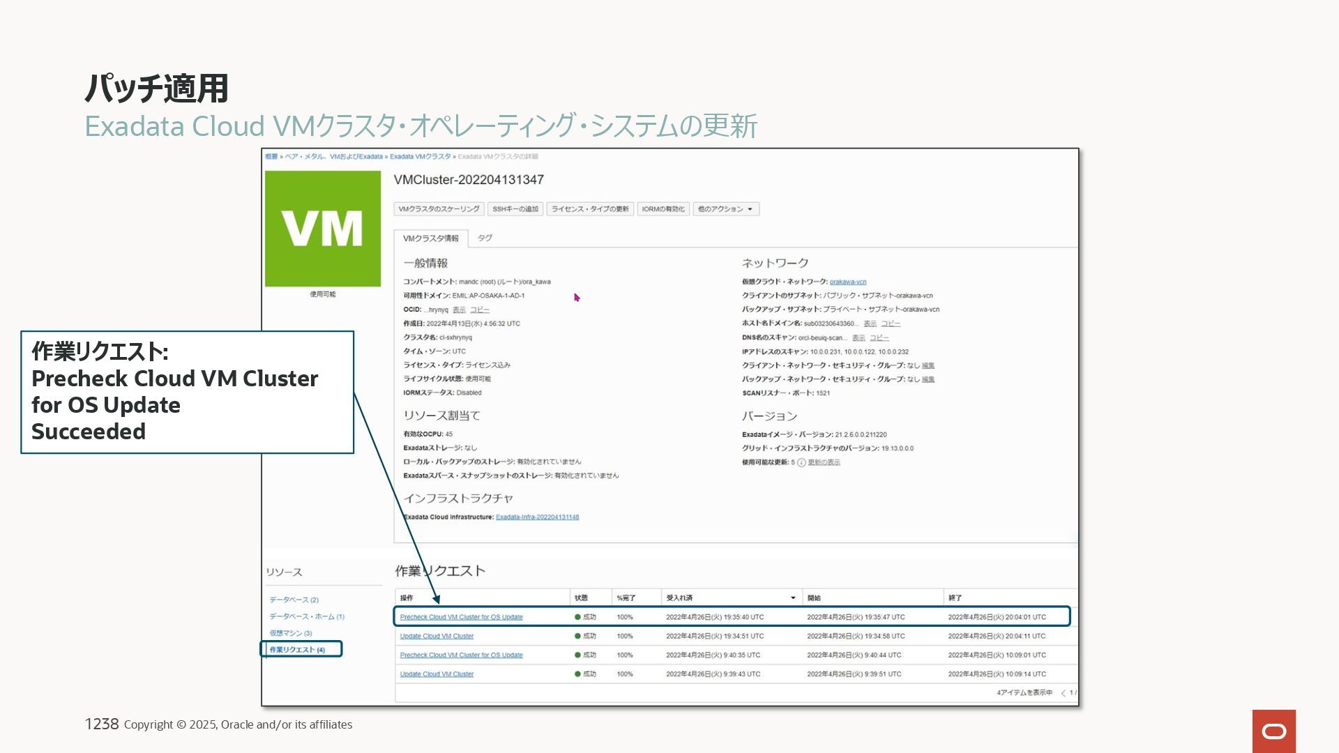 2025-04-03T01:31:51.131744+00:00 SQL> ALTER DISKGROUP DATAC2 DROP DISK 'DATAC2_CD_00_kix101117exdcl10', 'DATAC2_CD_01_kix101117exdcl10', 'DATAC2_CD_02_kix101117exdcl10', 'DATAC2_CD_03_kix101117exdcl10', 'DATAC2_CD_04_kix101117exdcl10', 'DATAC2_CD_05_kix101117exdcl10', 'DATAC2_CD_06_kix101117exdcl10', 'DATAC2_CD_07_kix101117exdcl10', 'DATAC2_CD_08_kix101117exdcl10', 'DATAC2_CD_09_kix101117exdcl10', 'DATAC2_CD_10_kix101117exdcl10', 'DATAC2_CD_11_kix101117exdcl10' REBALANCE POWER 4 略 SUCCESS: ALTER DISKGROUP RECOC2 DROP DISK 'RECOC2_CD_00_kix101117exdcl10', 'RECOC2_CD_01_kix101117exdcl10', 'RECOC2_CD_02_kix101117exdcl10', 'RECOC2_CD_03_kix101117exdcl10', 'RECOC2_CD_04_kix101117exdcl10', 'RECOC2_CD_05_kix101117exdcl10', 'RECOC2_CD_06_kix101117exdcl10', 'RECOC2_CD_07_kix101117exdcl10', 'RECOC2_CD_08_kix101117exdcl10', 'RECOC2_CD_09_kix101117exdcl10', 'RECOC2_CD_10_kix101117exdcl10', 'RECOC2_CD_11_kix101117exdcl10' REBALANCE POWER 4 NOTE: Attempting voting file refresh on diskgroup RECOC2 NOTE: Refresh completed on diskgroup RECOC2. No voting file found. 2025-04-03T01:32:19.466977+00:00 Exadata Infrastructure Copyright © 2025, Oracle and/or its affiliates 132 ※2025年4⽉更新