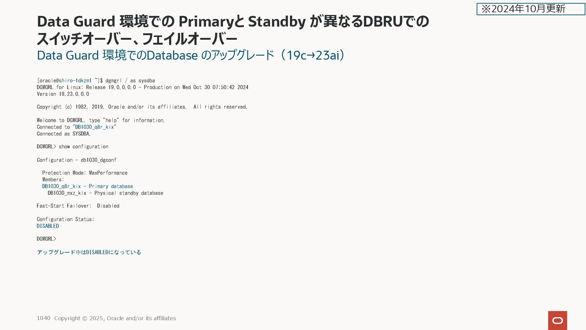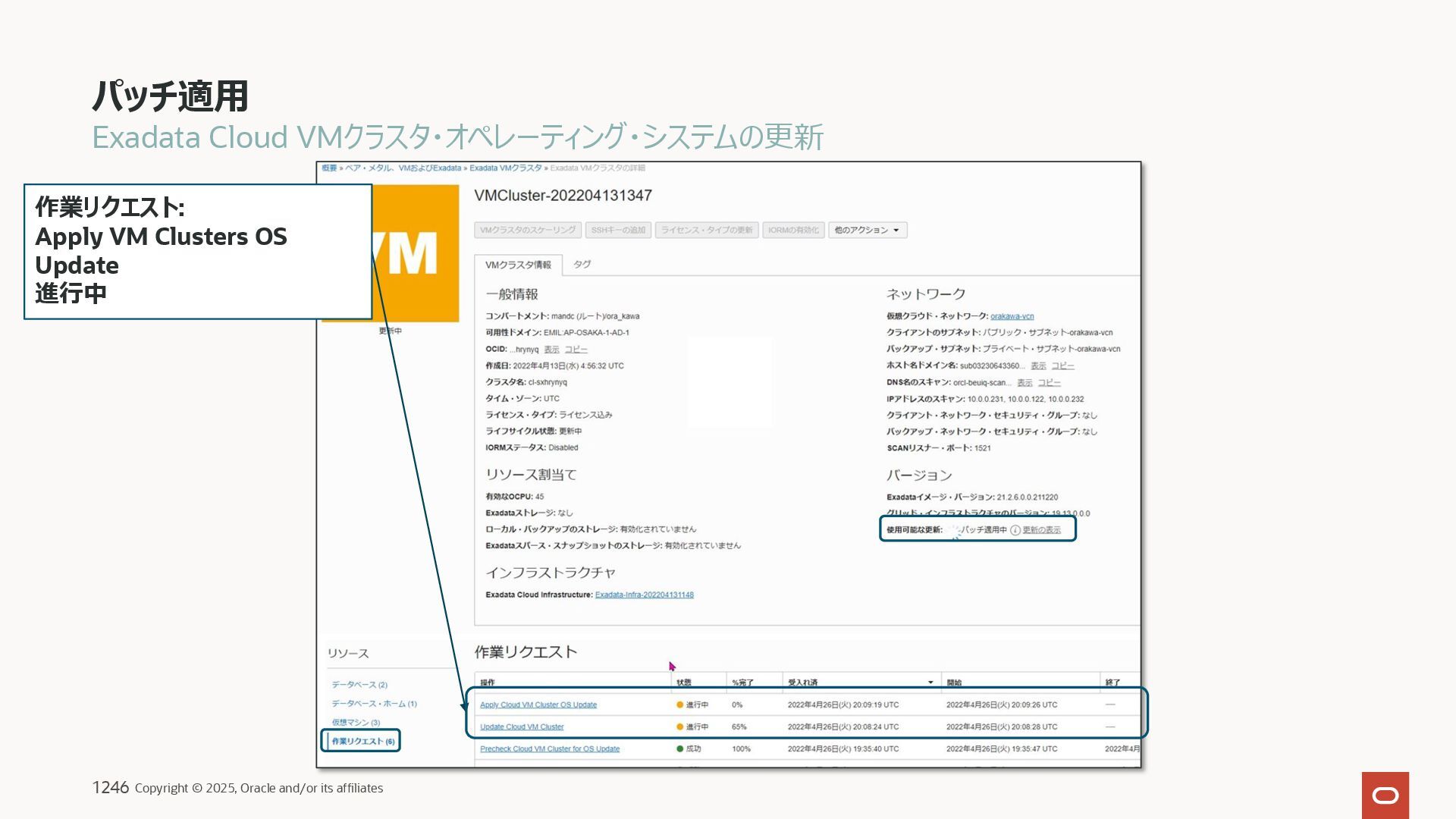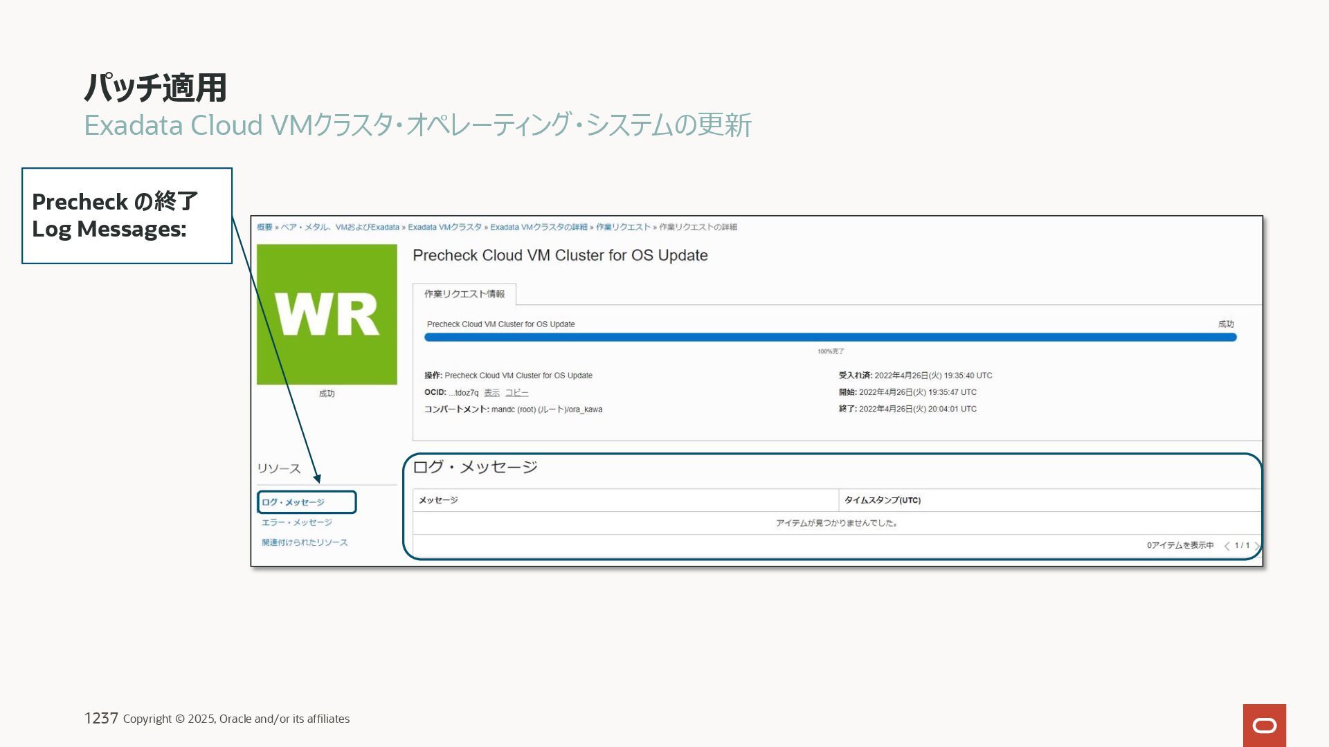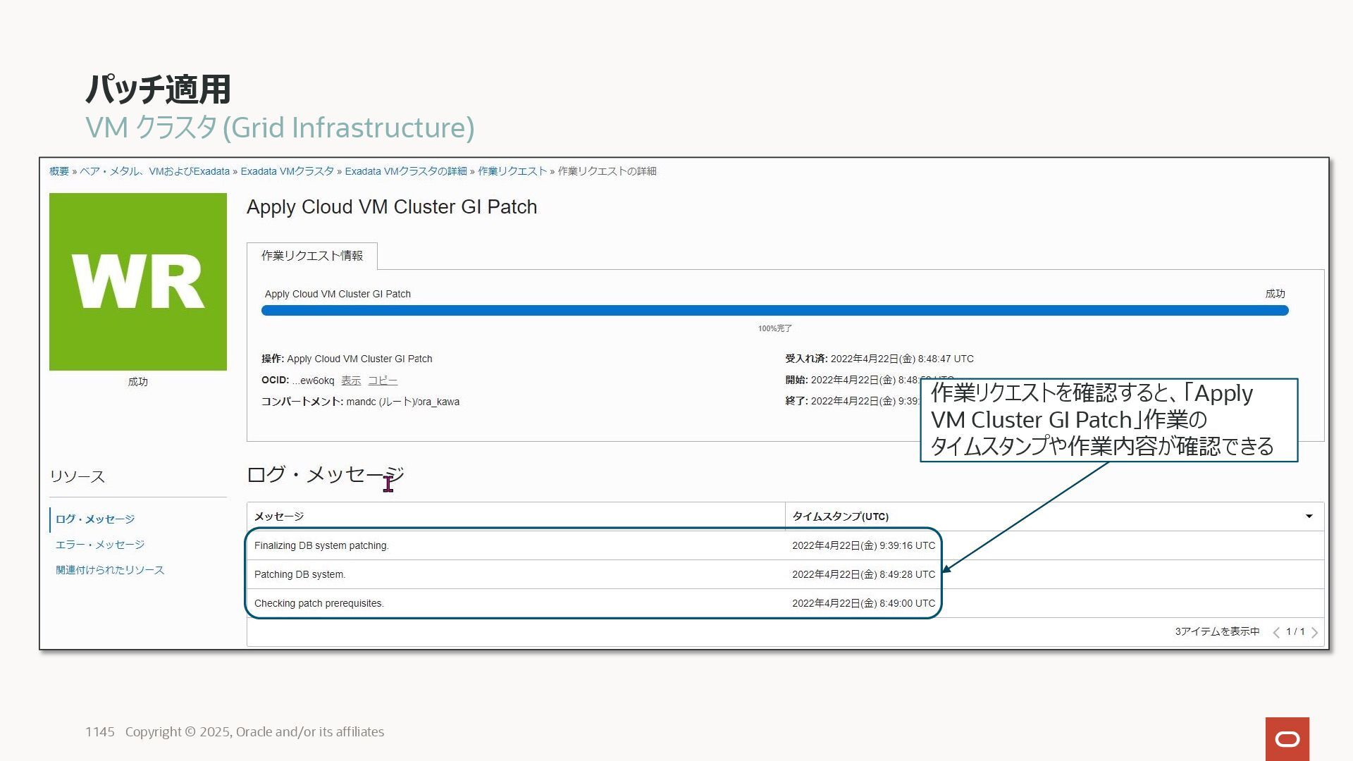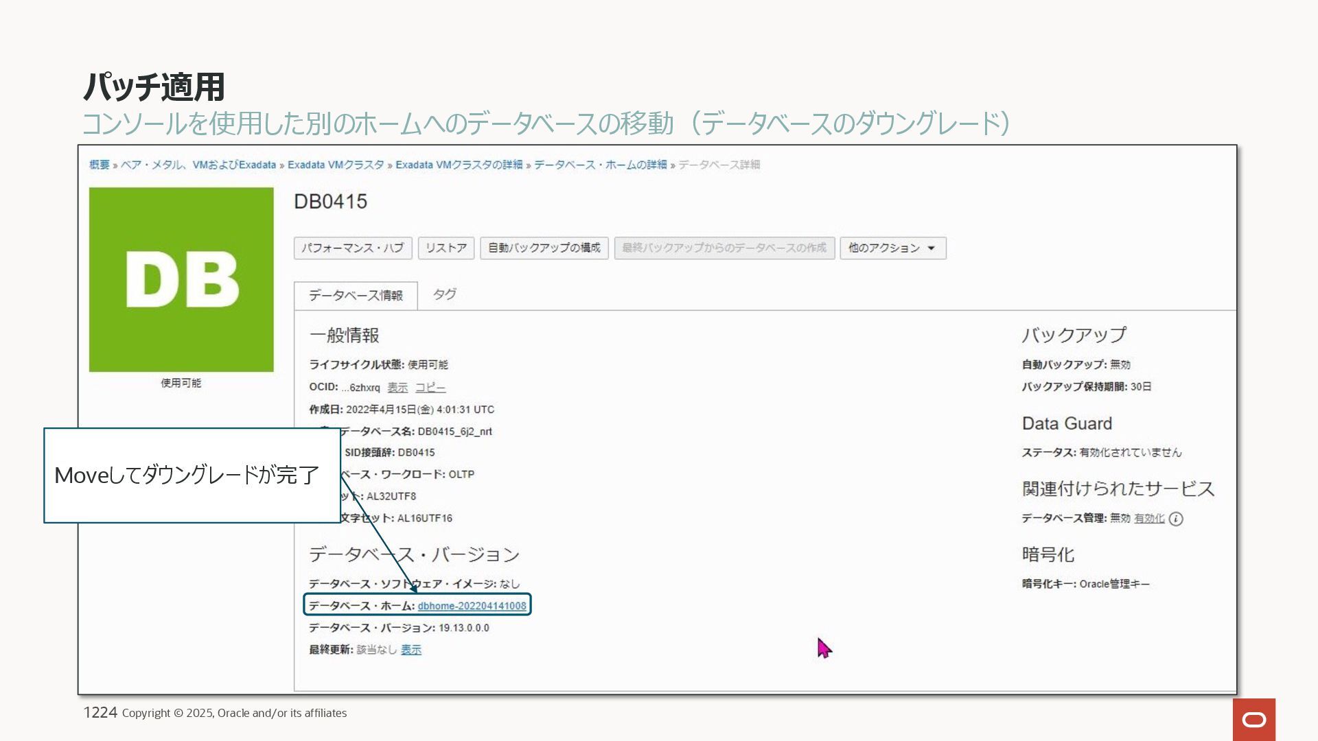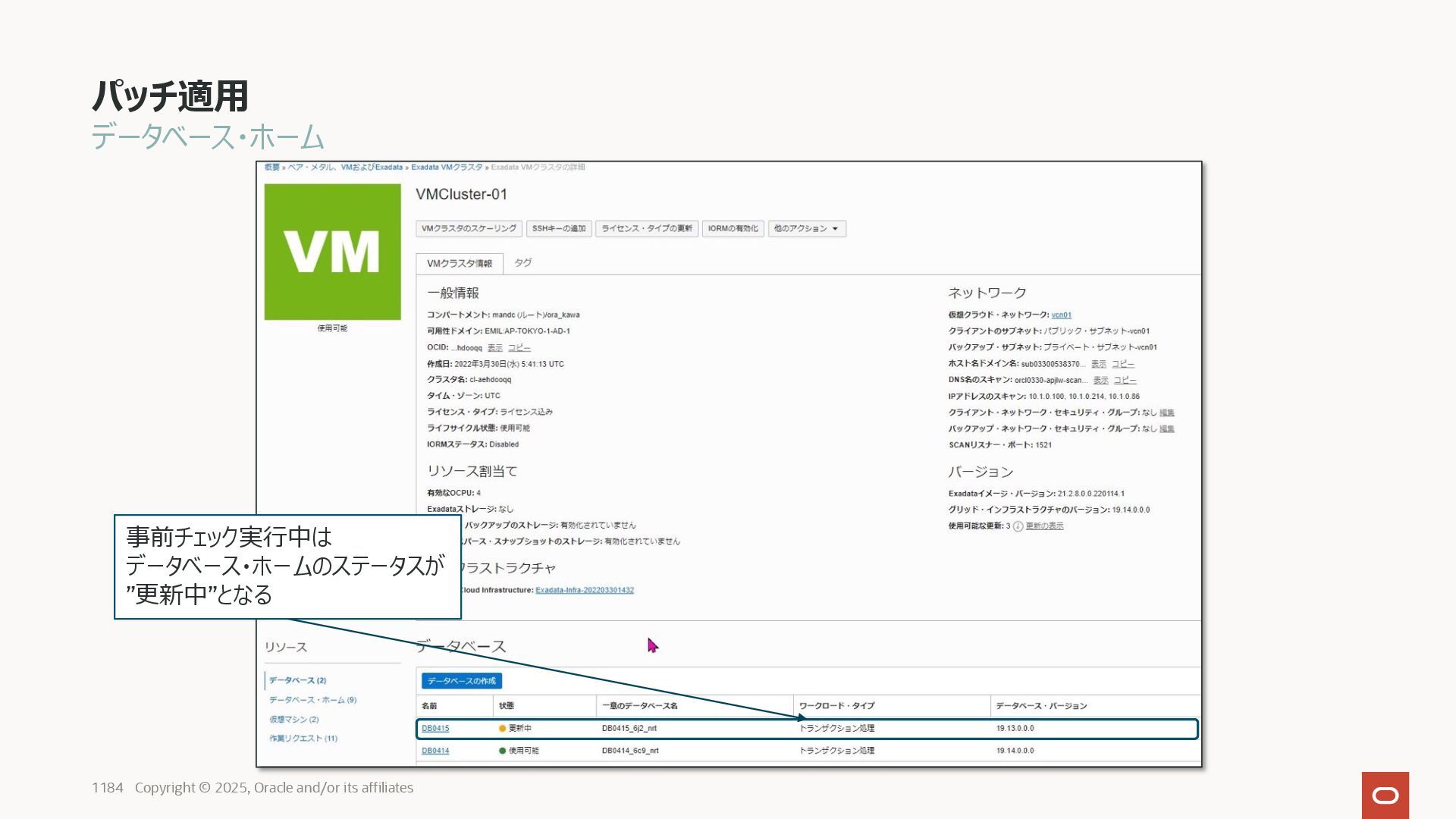 2025-04-03T01:31:51.131744+00:00 SQL> ALTER DISKGROUP DATAC2 DROP DISK 'DATAC2_CD_00_kix101117exdcl10', 'DATAC2_CD_01_kix101117exdcl10', 'DATAC2_CD_02_kix101117exdcl10', 'DATAC2_CD_03_kix101117exdcl10', 'DATAC2_CD_04_kix101117exdcl10', 'DATAC2_CD_05_kix101117exdcl10', 'DATAC2_CD_06_kix101117exdcl10', 'DATAC2_CD_07_kix101117exdcl10', 'DATAC2_CD_08_kix101117exdcl10', 'DATAC2_CD_09_kix101117exdcl10', 'DATAC2_CD_10_kix101117exdcl10', 'DATAC2_CD_11_kix101117exdcl10' REBALANCE POWER 4 略 SUCCESS: ALTER DISKGROUP RECOC2 DROP DISK 'RECOC2_CD_00_kix101117exdcl10', 'RECOC2_CD_01_kix101117exdcl10', 'RECOC2_CD_02_kix101117exdcl10', 'RECOC2_CD_03_kix101117exdcl10', 'RECOC2_CD_04_kix101117exdcl10', 'RECOC2_CD_05_kix101117exdcl10', 'RECOC2_CD_06_kix101117exdcl10', 'RECOC2_CD_07_kix101117exdcl10', 'RECOC2_CD_08_kix101117exdcl10', 'RECOC2_CD_09_kix101117exdcl10', 'RECOC2_CD_10_kix101117exdcl10', 'RECOC2_CD_11_kix101117exdcl10' REBALANCE POWER 4 NOTE: Attempting voting file refresh on diskgroup RECOC2 NOTE: Refresh completed on diskgroup RECOC2. No voting file found. 2025-04-03T01:32:19.466977+00:00 Exadata Infrastructure Copyright © 2025, Oracle and/or its affiliates 132 ※2025年4⽉更新