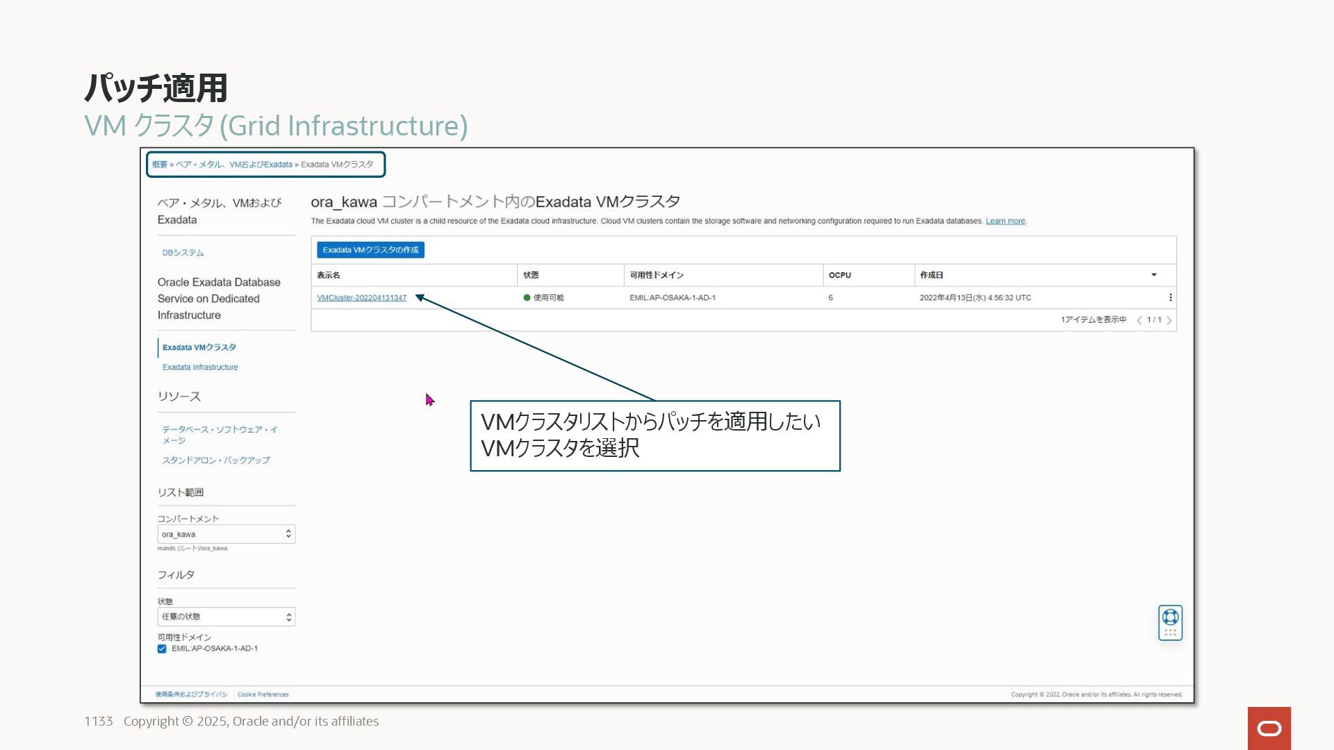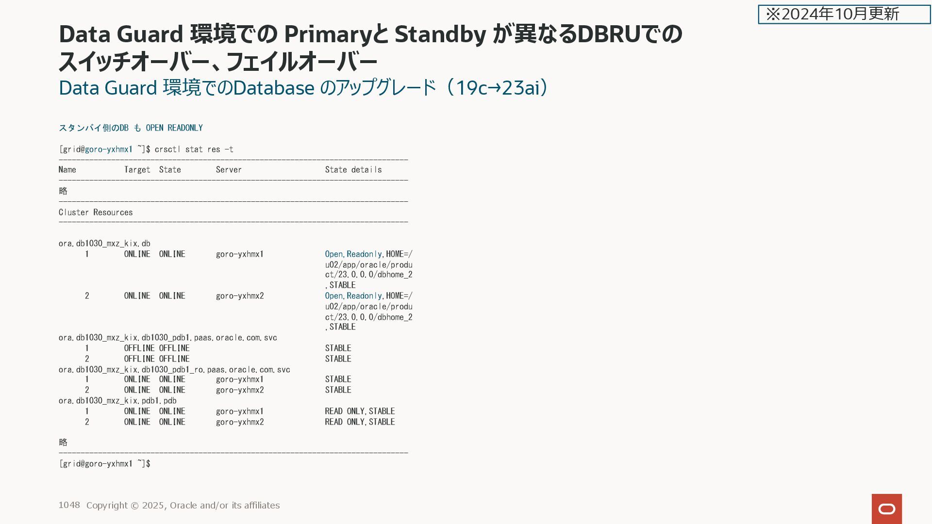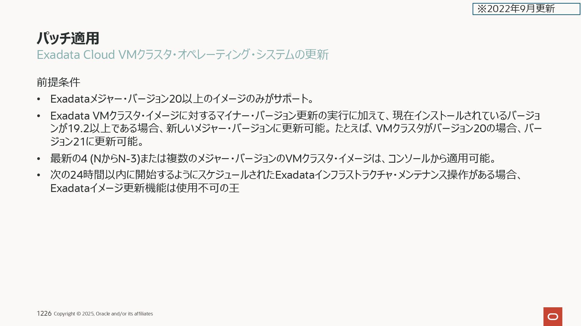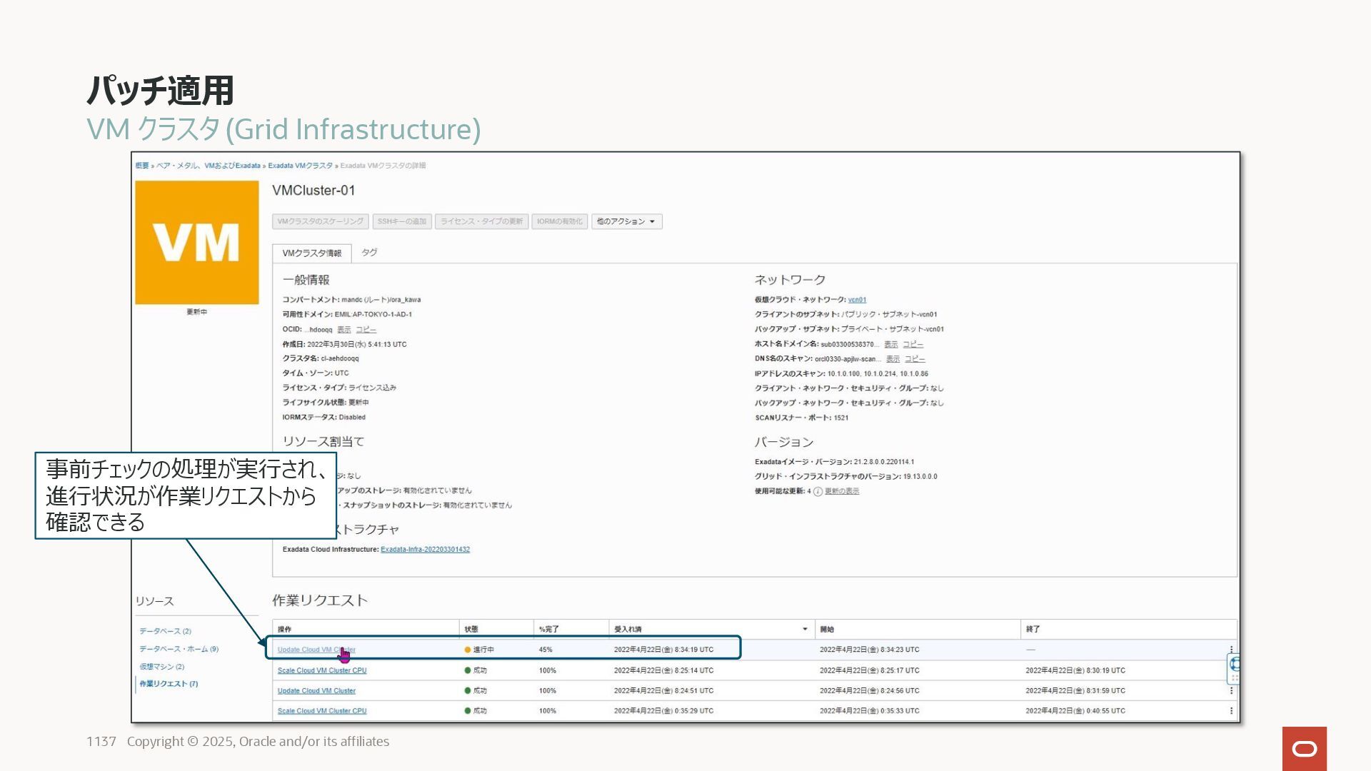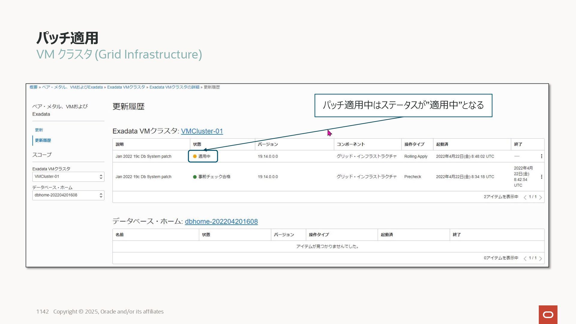 2025-04-03T01:31:51.131744+00:00 SQL> ALTER DISKGROUP DATAC2 DROP DISK 'DATAC2_CD_00_kix101117exdcl10', 'DATAC2_CD_01_kix101117exdcl10', 'DATAC2_CD_02_kix101117exdcl10', 'DATAC2_CD_03_kix101117exdcl10', 'DATAC2_CD_04_kix101117exdcl10', 'DATAC2_CD_05_kix101117exdcl10', 'DATAC2_CD_06_kix101117exdcl10', 'DATAC2_CD_07_kix101117exdcl10', 'DATAC2_CD_08_kix101117exdcl10', 'DATAC2_CD_09_kix101117exdcl10', 'DATAC2_CD_10_kix101117exdcl10', 'DATAC2_CD_11_kix101117exdcl10' REBALANCE POWER 4 略 SUCCESS: ALTER DISKGROUP RECOC2 DROP DISK 'RECOC2_CD_00_kix101117exdcl10', 'RECOC2_CD_01_kix101117exdcl10', 'RECOC2_CD_02_kix101117exdcl10', 'RECOC2_CD_03_kix101117exdcl10', 'RECOC2_CD_04_kix101117exdcl10', 'RECOC2_CD_05_kix101117exdcl10', 'RECOC2_CD_06_kix101117exdcl10', 'RECOC2_CD_07_kix101117exdcl10', 'RECOC2_CD_08_kix101117exdcl10', 'RECOC2_CD_09_kix101117exdcl10', 'RECOC2_CD_10_kix101117exdcl10', 'RECOC2_CD_11_kix101117exdcl10' REBALANCE POWER 4 NOTE: Attempting voting file refresh on diskgroup RECOC2 NOTE: Refresh completed on diskgroup RECOC2. No voting file found. 2025-04-03T01:32:19.466977+00:00 Exadata Infrastructure Copyright © 2025, Oracle and/or its affiliates 132 ※2025年4⽉更新
