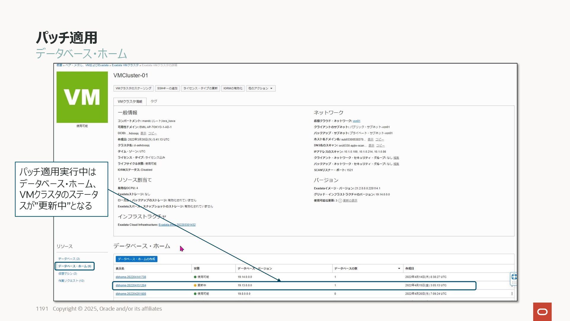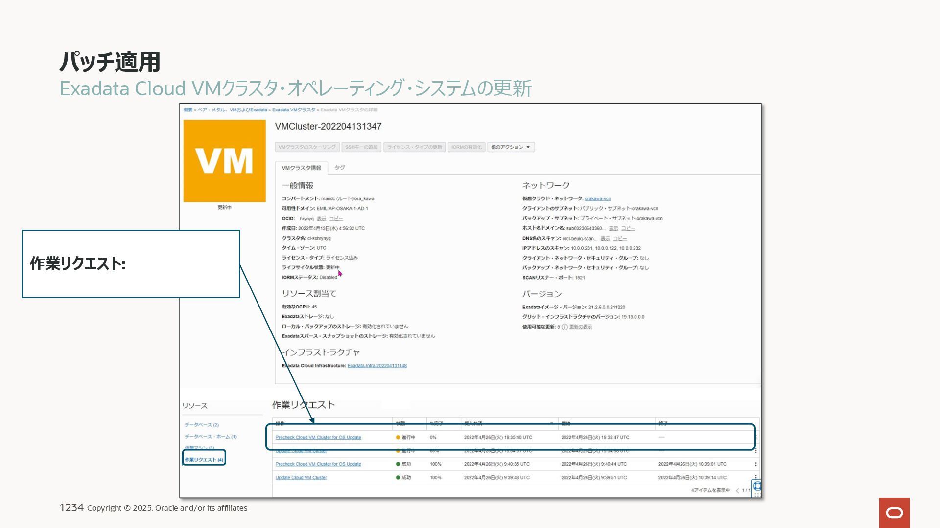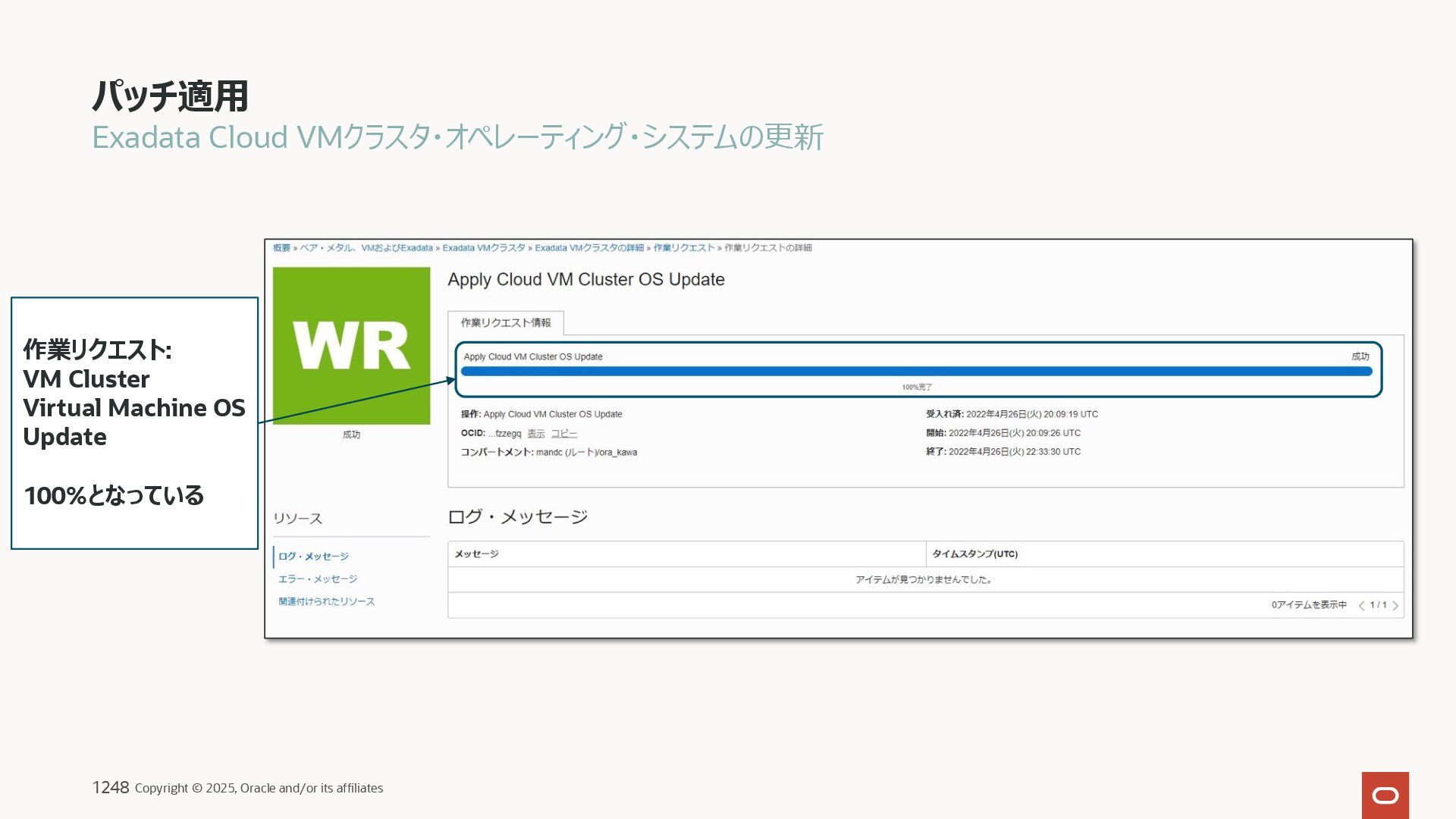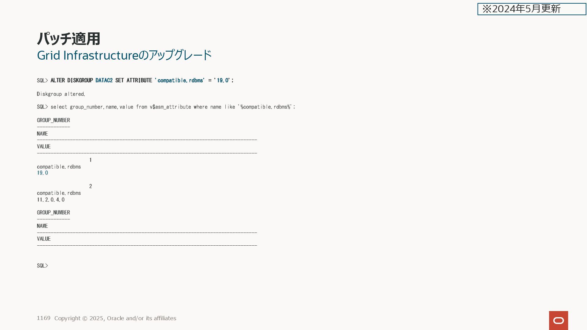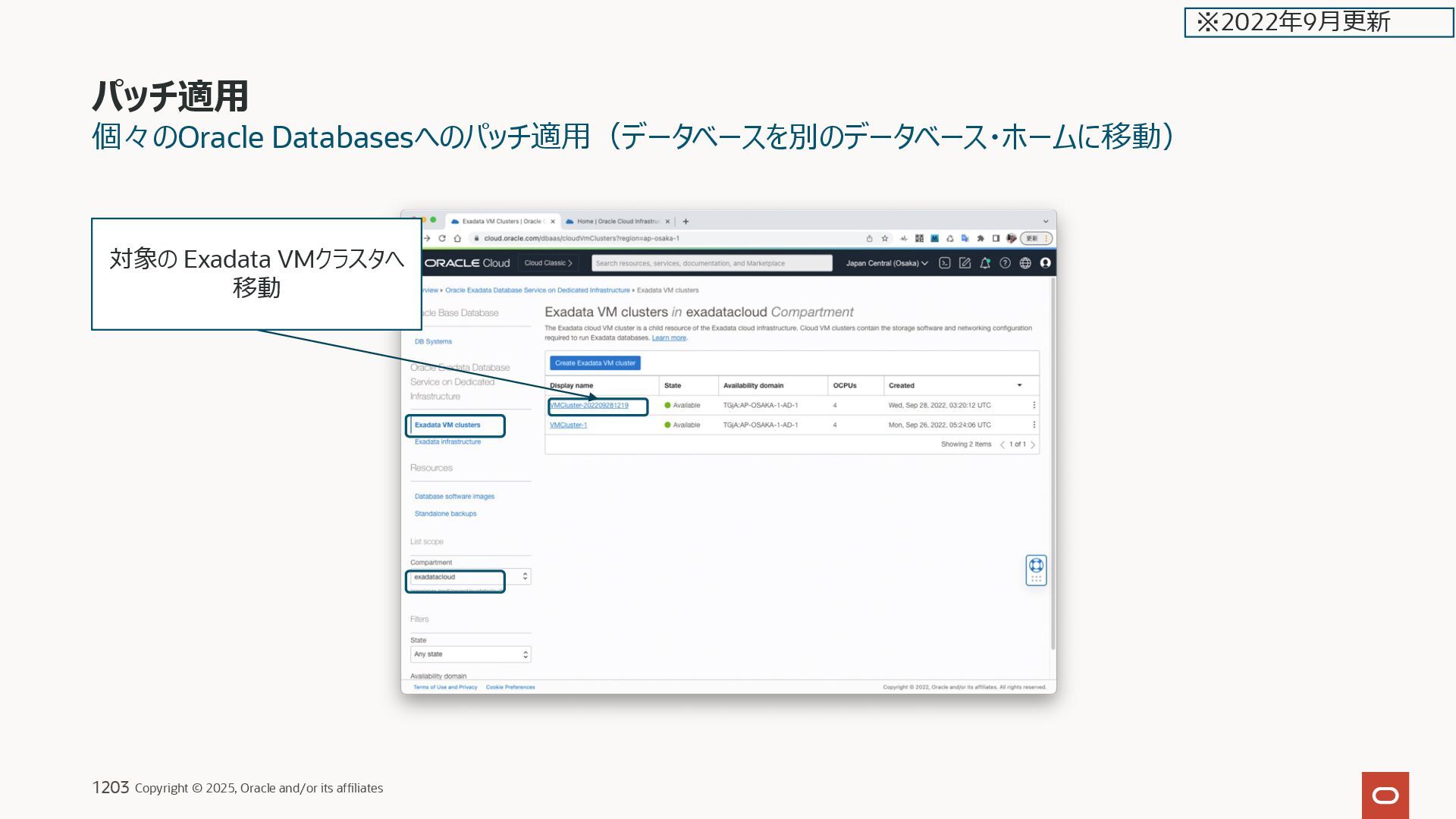 2025-04-03T01:31:51.131744+00:00 SQL> ALTER DISKGROUP DATAC2 DROP DISK 'DATAC2_CD_00_kix101117exdcl10', 'DATAC2_CD_01_kix101117exdcl10', 'DATAC2_CD_02_kix101117exdcl10', 'DATAC2_CD_03_kix101117exdcl10', 'DATAC2_CD_04_kix101117exdcl10', 'DATAC2_CD_05_kix101117exdcl10', 'DATAC2_CD_06_kix101117exdcl10', 'DATAC2_CD_07_kix101117exdcl10', 'DATAC2_CD_08_kix101117exdcl10', 'DATAC2_CD_09_kix101117exdcl10', 'DATAC2_CD_10_kix101117exdcl10', 'DATAC2_CD_11_kix101117exdcl10' REBALANCE POWER 4 略 SUCCESS: ALTER DISKGROUP RECOC2 DROP DISK 'RECOC2_CD_00_kix101117exdcl10', 'RECOC2_CD_01_kix101117exdcl10', 'RECOC2_CD_02_kix101117exdcl10', 'RECOC2_CD_03_kix101117exdcl10', 'RECOC2_CD_04_kix101117exdcl10', 'RECOC2_CD_05_kix101117exdcl10', 'RECOC2_CD_06_kix101117exdcl10', 'RECOC2_CD_07_kix101117exdcl10', 'RECOC2_CD_08_kix101117exdcl10', 'RECOC2_CD_09_kix101117exdcl10', 'RECOC2_CD_10_kix101117exdcl10', 'RECOC2_CD_11_kix101117exdcl10' REBALANCE POWER 4 NOTE: Attempting voting file refresh on diskgroup RECOC2 NOTE: Refresh completed on diskgroup RECOC2. No voting file found. 2025-04-03T01:32:19.466977+00:00 Exadata Infrastructure Copyright © 2025, Oracle and/or its affiliates 132 ※2025年4⽉更新