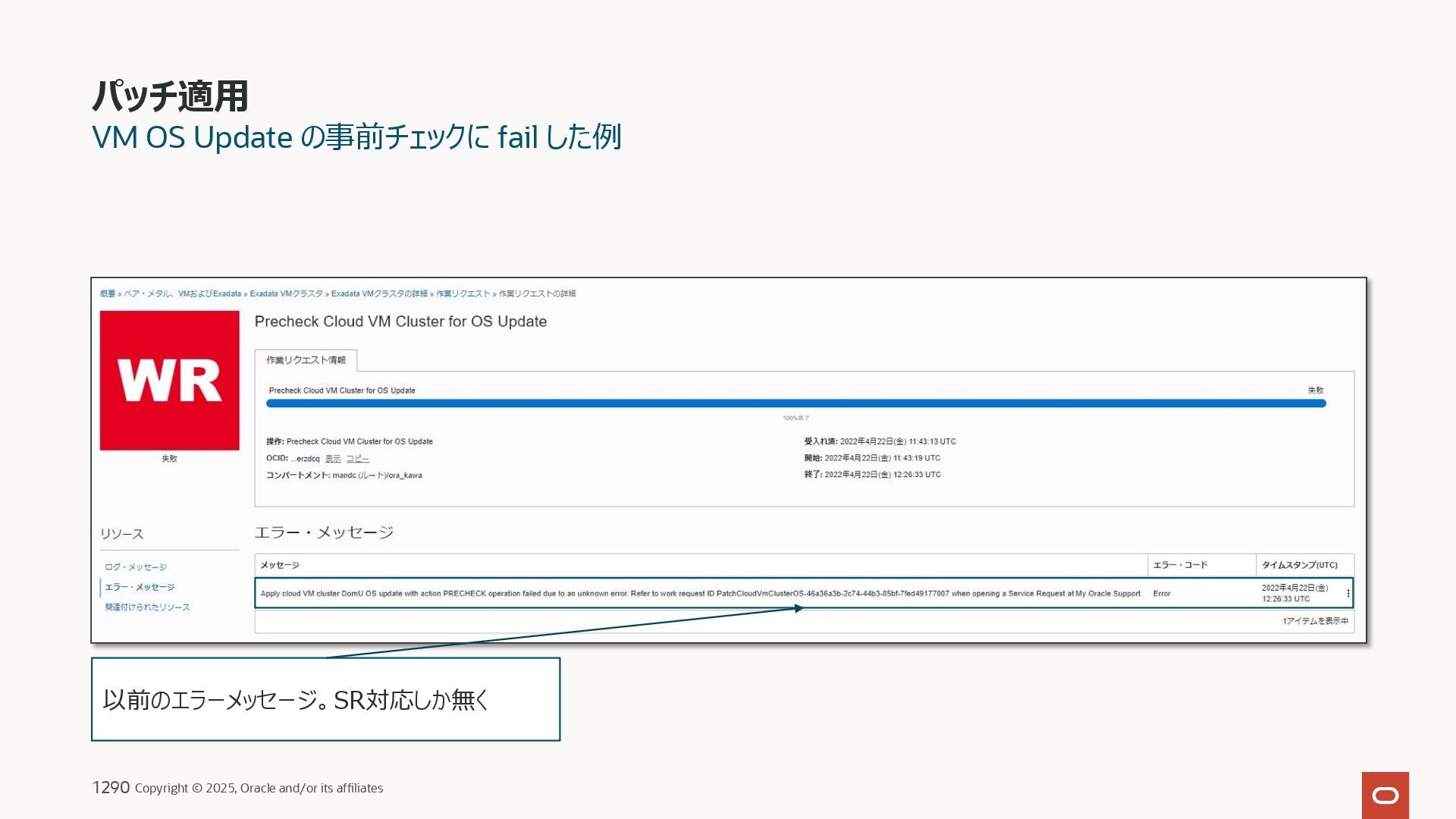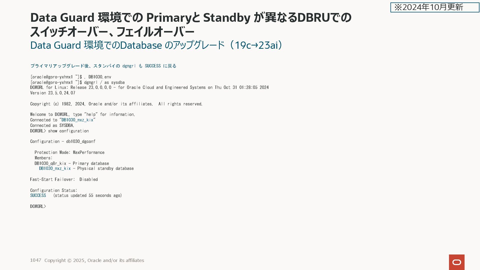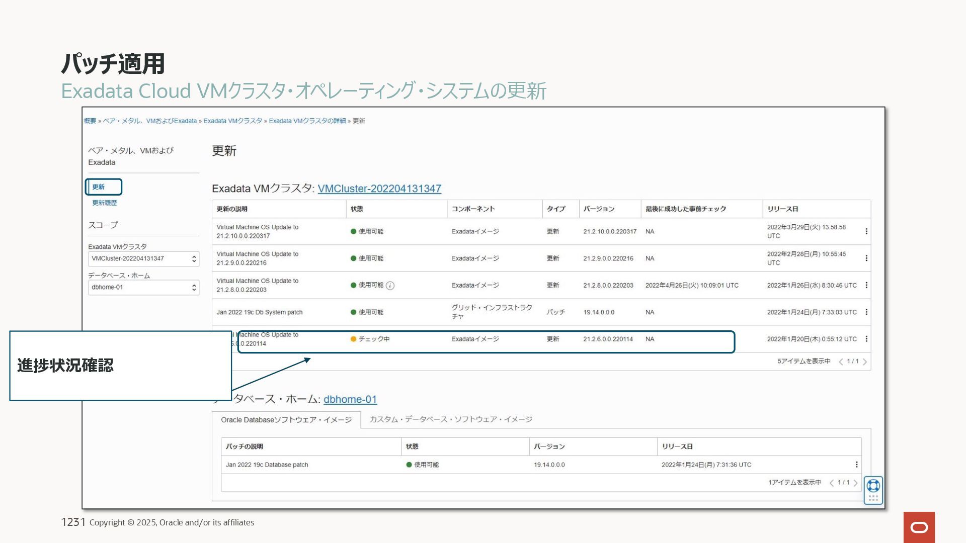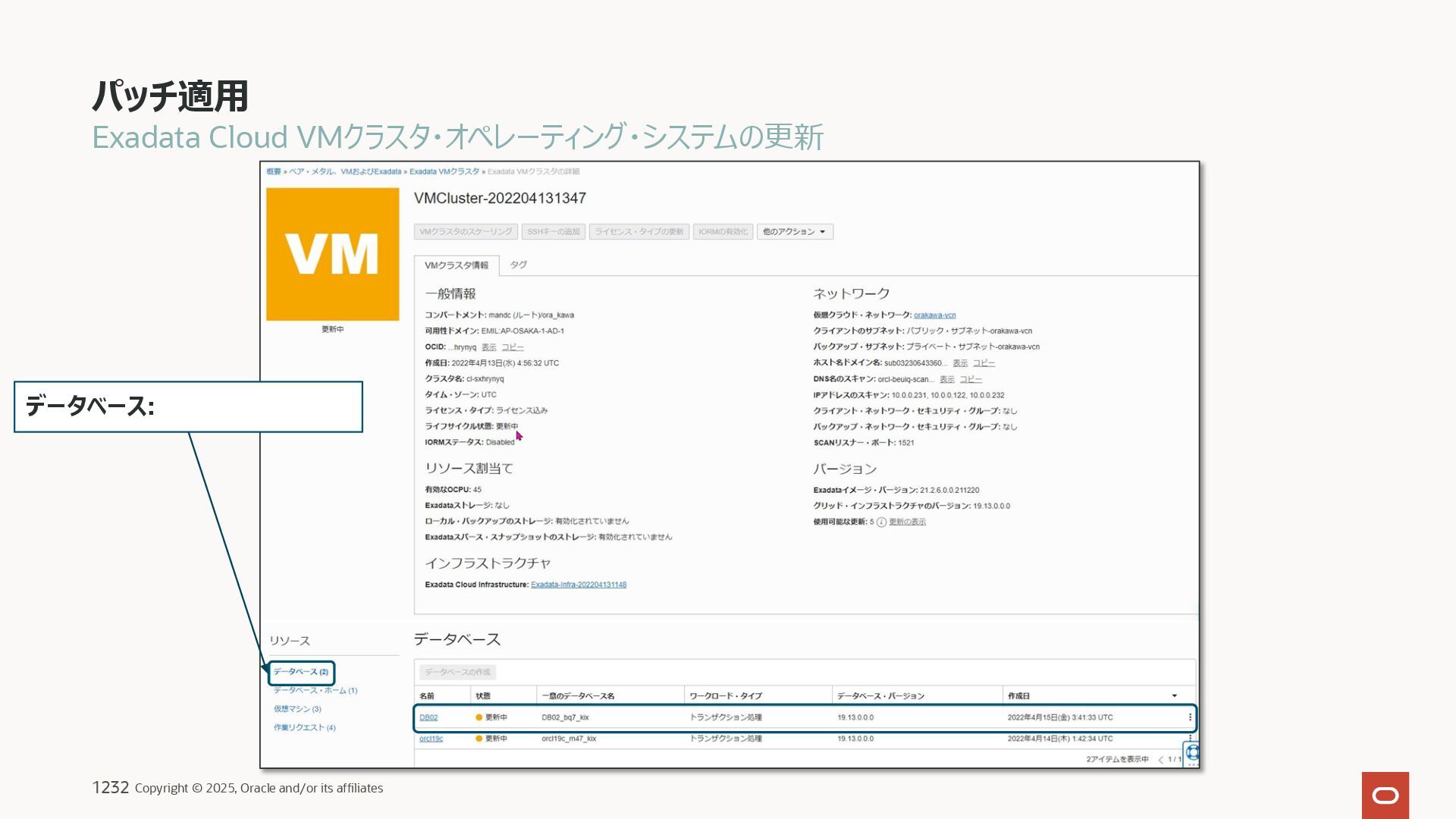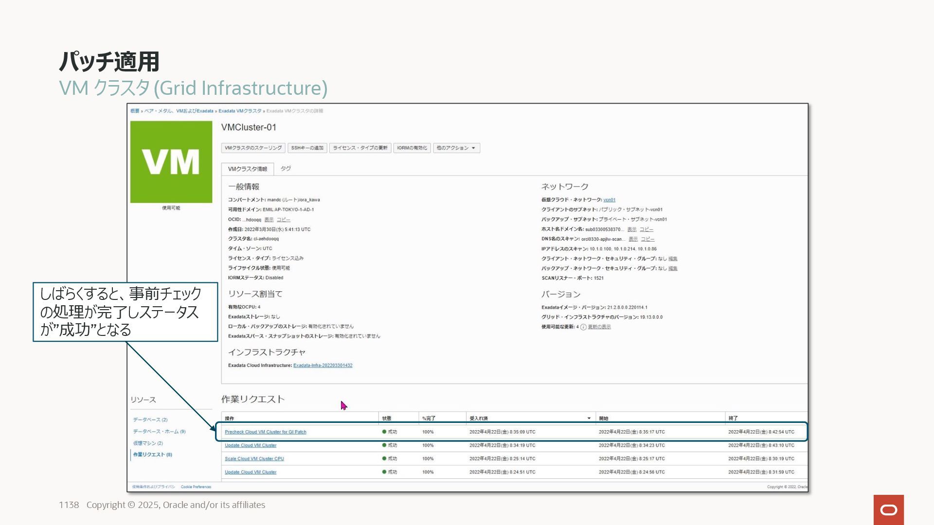2025-04-03T01:31:51.131744+00:00 SQL> ALTER DISKGROUP DATAC2 DROP DISK 'DATAC2_CD_00_kix101117exdcl10', 'DATAC2_CD_01_kix101117exdcl10', 'DATAC2_CD_02_kix101117exdcl10', 'DATAC2_CD_03_kix101117exdcl10', 'DATAC2_CD_04_kix101117exdcl10', 'DATAC2_CD_05_kix101117exdcl10', 'DATAC2_CD_06_kix101117exdcl10', 'DATAC2_CD_07_kix101117exdcl10', 'DATAC2_CD_08_kix101117exdcl10', 'DATAC2_CD_09_kix101117exdcl10', 'DATAC2_CD_10_kix101117exdcl10', 'DATAC2_CD_11_kix101117exdcl10' REBALANCE POWER 4 略 SUCCESS: ALTER DISKGROUP RECOC2 DROP DISK 'RECOC2_CD_00_kix101117exdcl10', 'RECOC2_CD_01_kix101117exdcl10', 'RECOC2_CD_02_kix101117exdcl10', 'RECOC2_CD_03_kix101117exdcl10', 'RECOC2_CD_04_kix101117exdcl10', 'RECOC2_CD_05_kix101117exdcl10', 'RECOC2_CD_06_kix101117exdcl10', 'RECOC2_CD_07_kix101117exdcl10', 'RECOC2_CD_08_kix101117exdcl10', 'RECOC2_CD_09_kix101117exdcl10', 'RECOC2_CD_10_kix101117exdcl10', 'RECOC2_CD_11_kix101117exdcl10' REBALANCE POWER 4 NOTE: Attempting voting file refresh on diskgroup RECOC2 NOTE: Refresh completed on diskgroup RECOC2. No voting file found. 2025-04-03T01:32:19.466977+00:00 Exadata Infrastructure Copyright © 2025, Oracle and/or its affiliates 132 ※2025年4⽉更新