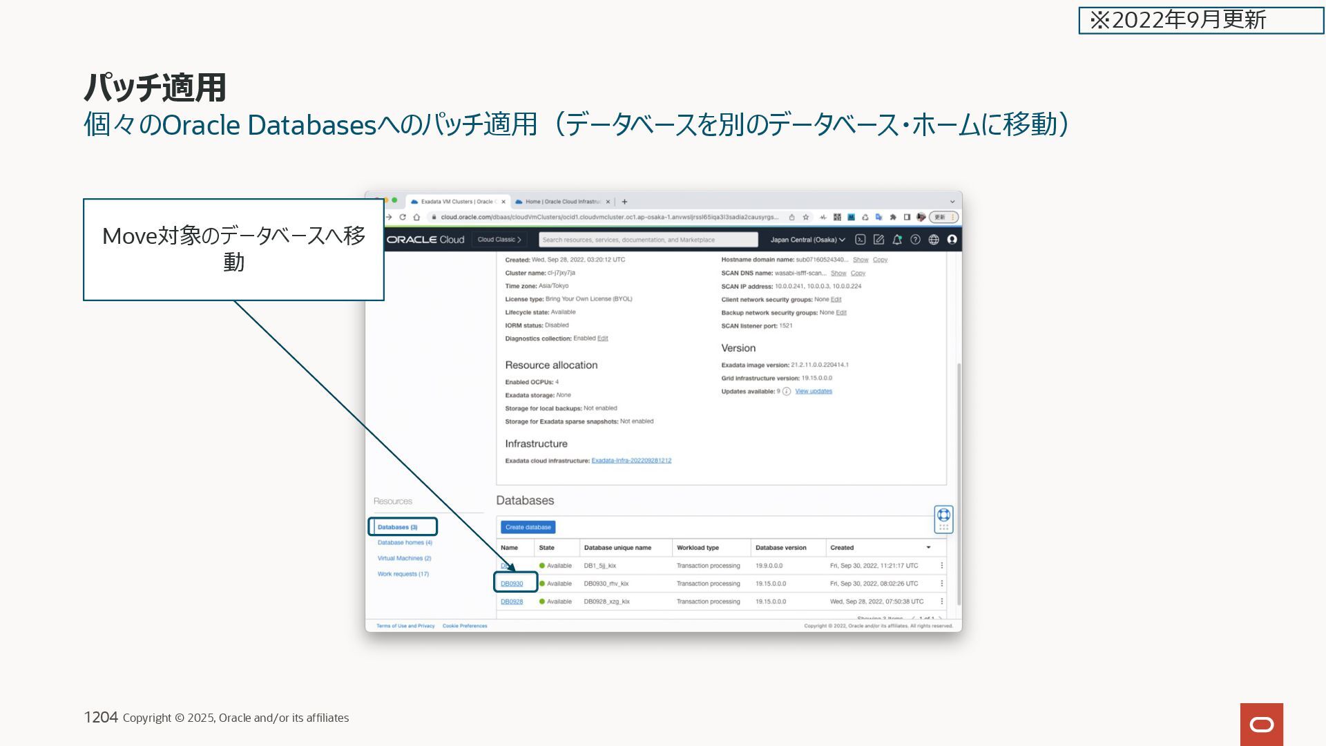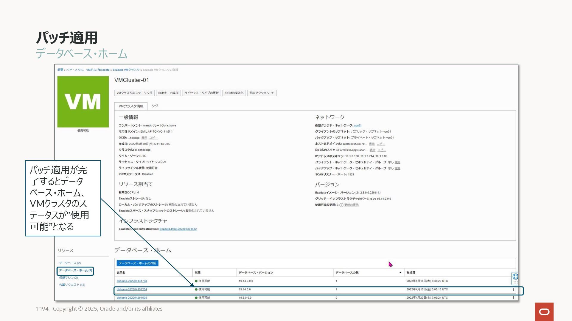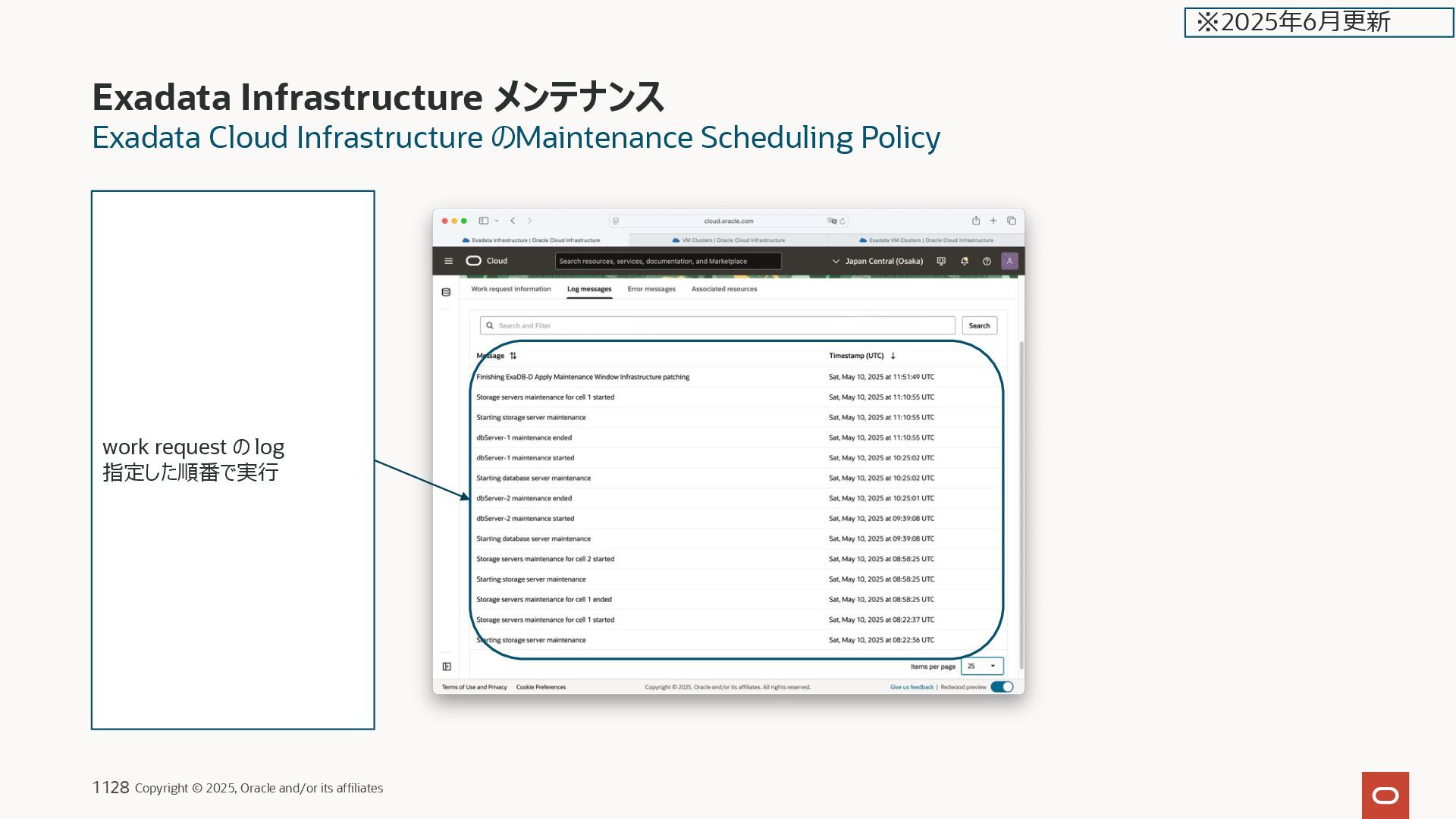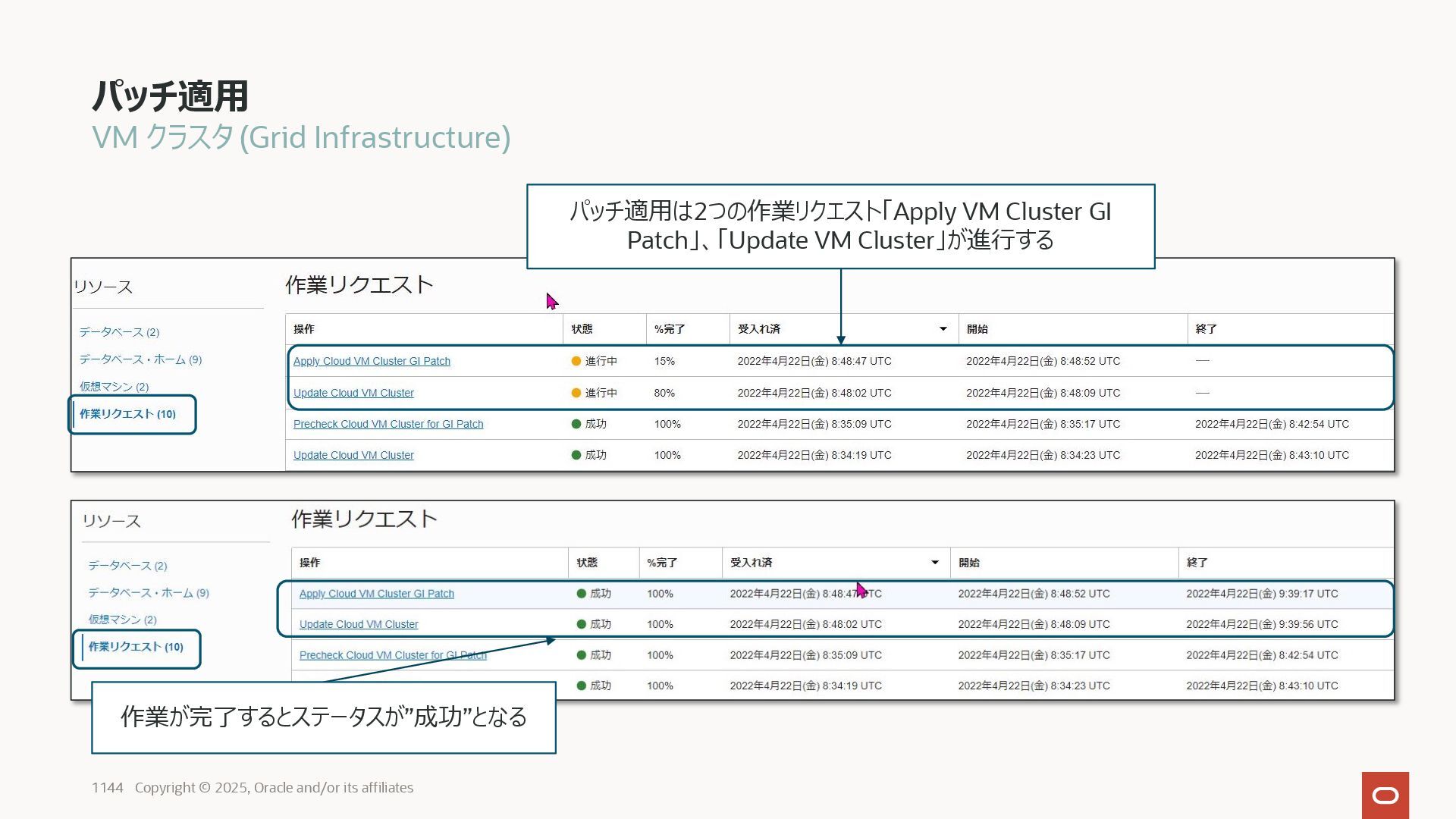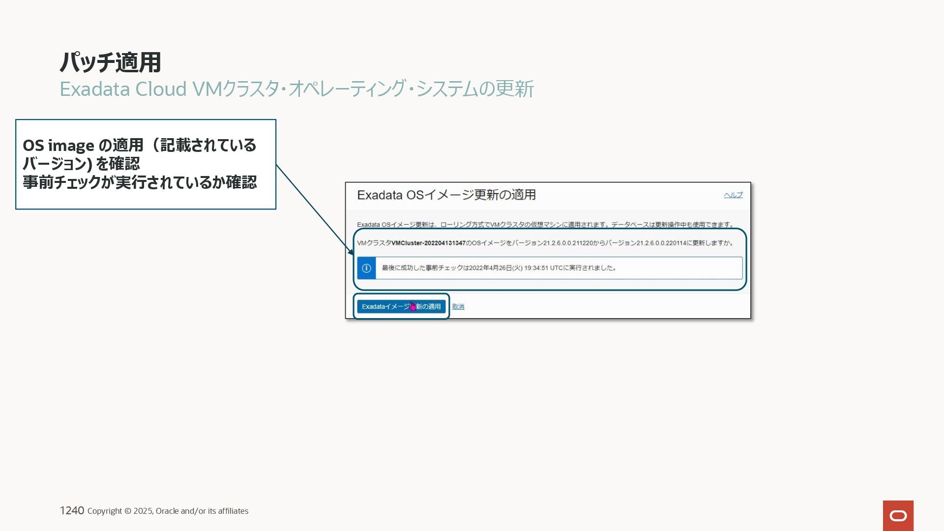 2025-04-03T01:31:51.131744+00:00 SQL> ALTER DISKGROUP DATAC2 DROP DISK 'DATAC2_CD_00_kix101117exdcl10', 'DATAC2_CD_01_kix101117exdcl10', 'DATAC2_CD_02_kix101117exdcl10', 'DATAC2_CD_03_kix101117exdcl10', 'DATAC2_CD_04_kix101117exdcl10', 'DATAC2_CD_05_kix101117exdcl10', 'DATAC2_CD_06_kix101117exdcl10', 'DATAC2_CD_07_kix101117exdcl10', 'DATAC2_CD_08_kix101117exdcl10', 'DATAC2_CD_09_kix101117exdcl10', 'DATAC2_CD_10_kix101117exdcl10', 'DATAC2_CD_11_kix101117exdcl10' REBALANCE POWER 4 略 SUCCESS: ALTER DISKGROUP RECOC2 DROP DISK 'RECOC2_CD_00_kix101117exdcl10', 'RECOC2_CD_01_kix101117exdcl10', 'RECOC2_CD_02_kix101117exdcl10', 'RECOC2_CD_03_kix101117exdcl10', 'RECOC2_CD_04_kix101117exdcl10', 'RECOC2_CD_05_kix101117exdcl10', 'RECOC2_CD_06_kix101117exdcl10', 'RECOC2_CD_07_kix101117exdcl10', 'RECOC2_CD_08_kix101117exdcl10', 'RECOC2_CD_09_kix101117exdcl10', 'RECOC2_CD_10_kix101117exdcl10', 'RECOC2_CD_11_kix101117exdcl10' REBALANCE POWER 4 NOTE: Attempting voting file refresh on diskgroup RECOC2 NOTE: Refresh completed on diskgroup RECOC2. No voting file found. 2025-04-03T01:32:19.466977+00:00 Exadata Infrastructure Copyright © 2025, Oracle and/or its affiliates 132 ※2025年4⽉更新