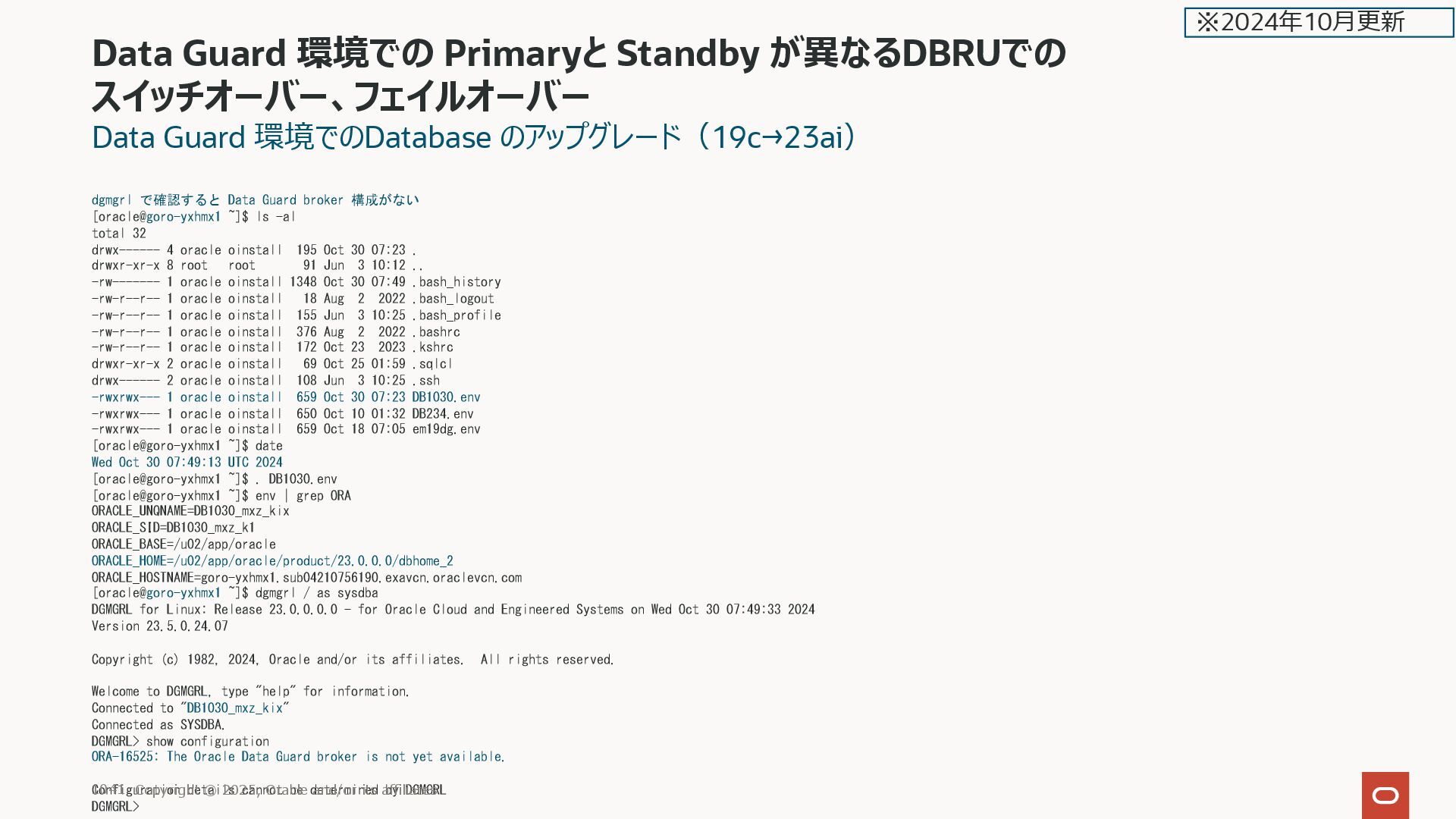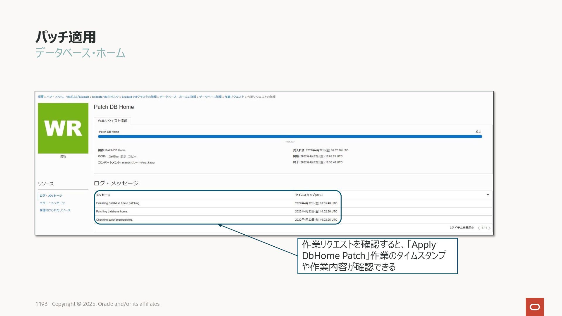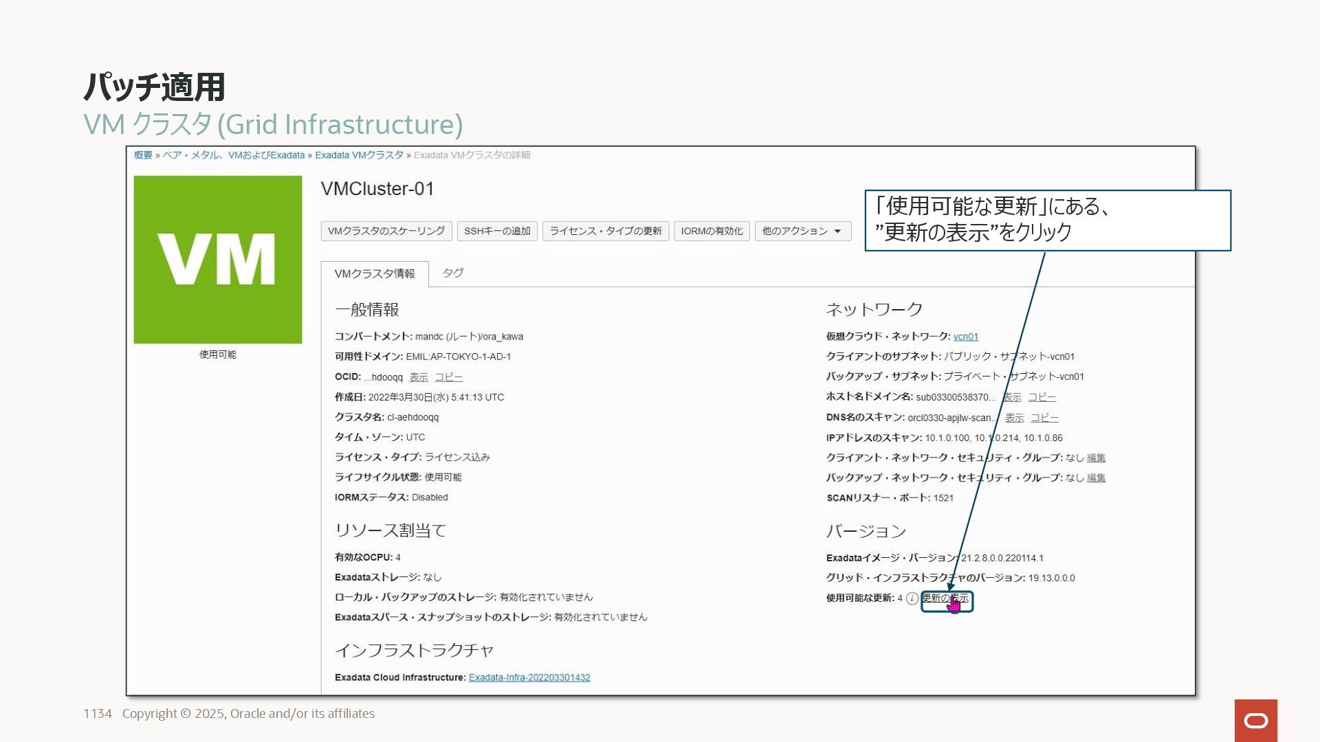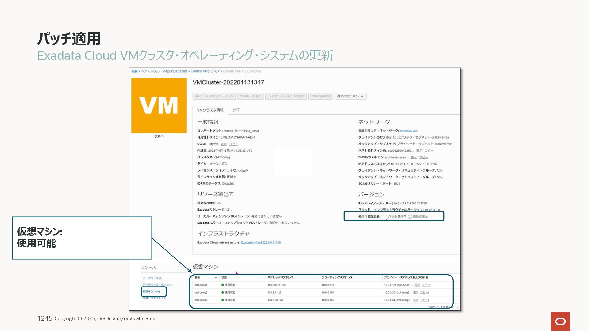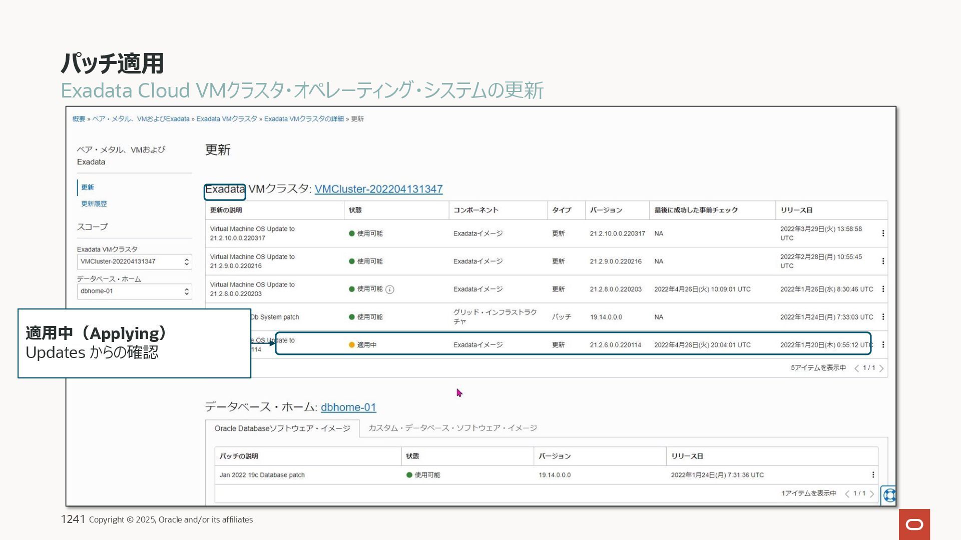 2025-04-03T01:31:51.131744+00:00 SQL> ALTER DISKGROUP DATAC2 DROP DISK 'DATAC2_CD_00_kix101117exdcl10', 'DATAC2_CD_01_kix101117exdcl10', 'DATAC2_CD_02_kix101117exdcl10', 'DATAC2_CD_03_kix101117exdcl10', 'DATAC2_CD_04_kix101117exdcl10', 'DATAC2_CD_05_kix101117exdcl10', 'DATAC2_CD_06_kix101117exdcl10', 'DATAC2_CD_07_kix101117exdcl10', 'DATAC2_CD_08_kix101117exdcl10', 'DATAC2_CD_09_kix101117exdcl10', 'DATAC2_CD_10_kix101117exdcl10', 'DATAC2_CD_11_kix101117exdcl10' REBALANCE POWER 4 略 SUCCESS: ALTER DISKGROUP RECOC2 DROP DISK 'RECOC2_CD_00_kix101117exdcl10', 'RECOC2_CD_01_kix101117exdcl10', 'RECOC2_CD_02_kix101117exdcl10', 'RECOC2_CD_03_kix101117exdcl10', 'RECOC2_CD_04_kix101117exdcl10', 'RECOC2_CD_05_kix101117exdcl10', 'RECOC2_CD_06_kix101117exdcl10', 'RECOC2_CD_07_kix101117exdcl10', 'RECOC2_CD_08_kix101117exdcl10', 'RECOC2_CD_09_kix101117exdcl10', 'RECOC2_CD_10_kix101117exdcl10', 'RECOC2_CD_11_kix101117exdcl10' REBALANCE POWER 4 NOTE: Attempting voting file refresh on diskgroup RECOC2 NOTE: Refresh completed on diskgroup RECOC2. No voting file found. 2025-04-03T01:32:19.466977+00:00 Exadata Infrastructure Copyright © 2025, Oracle and/or its affiliates 132 ※2025年4⽉更新