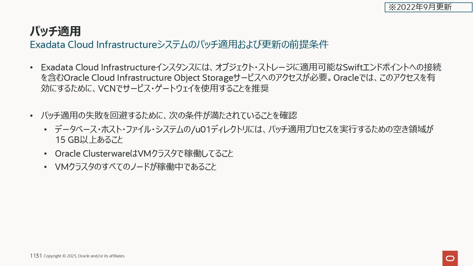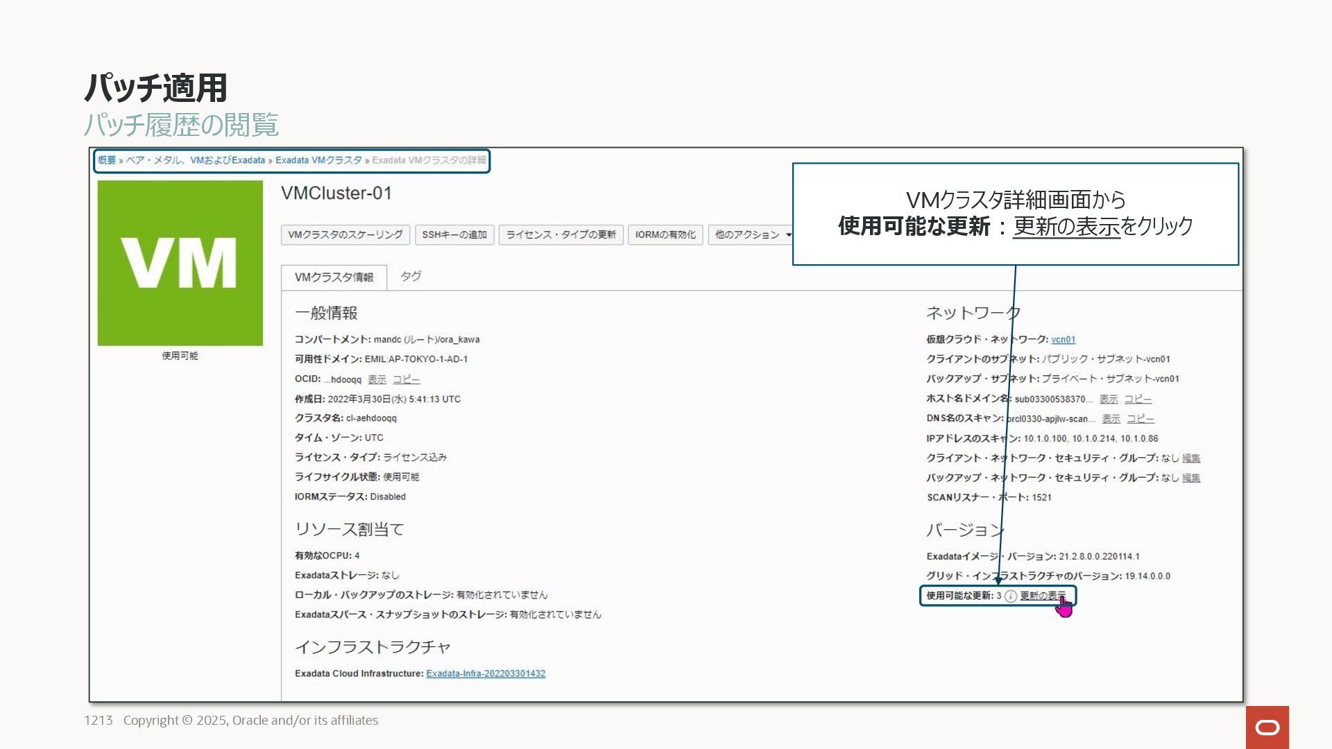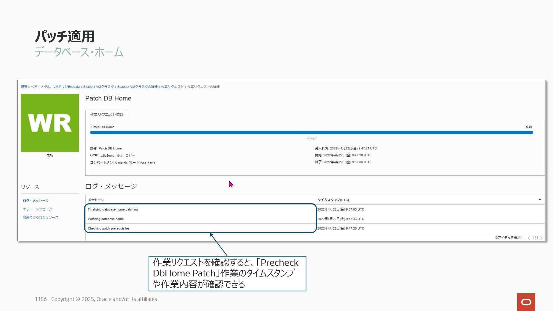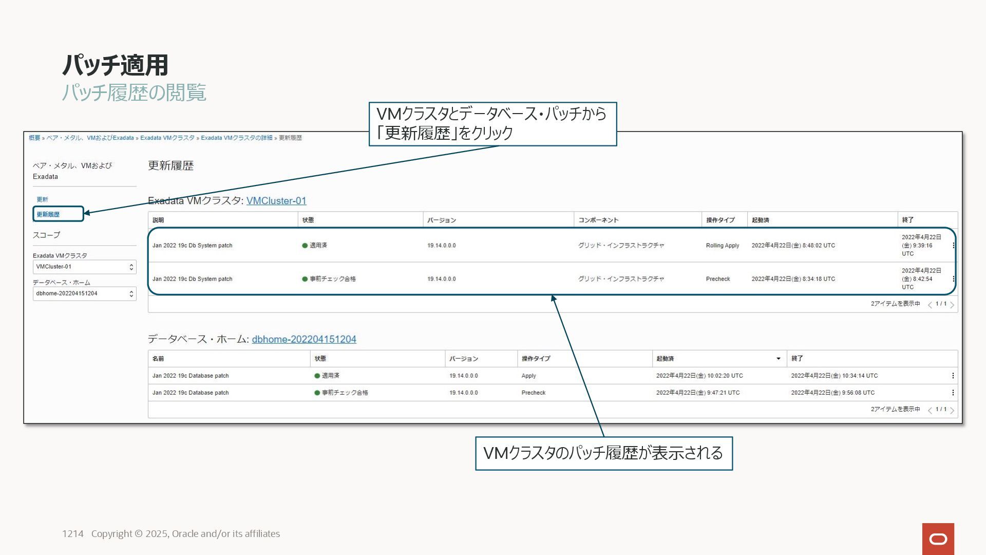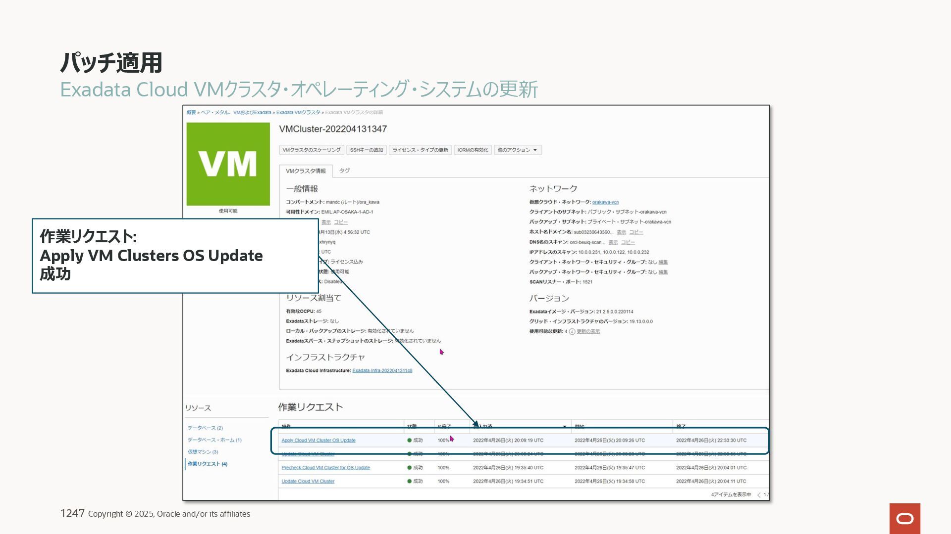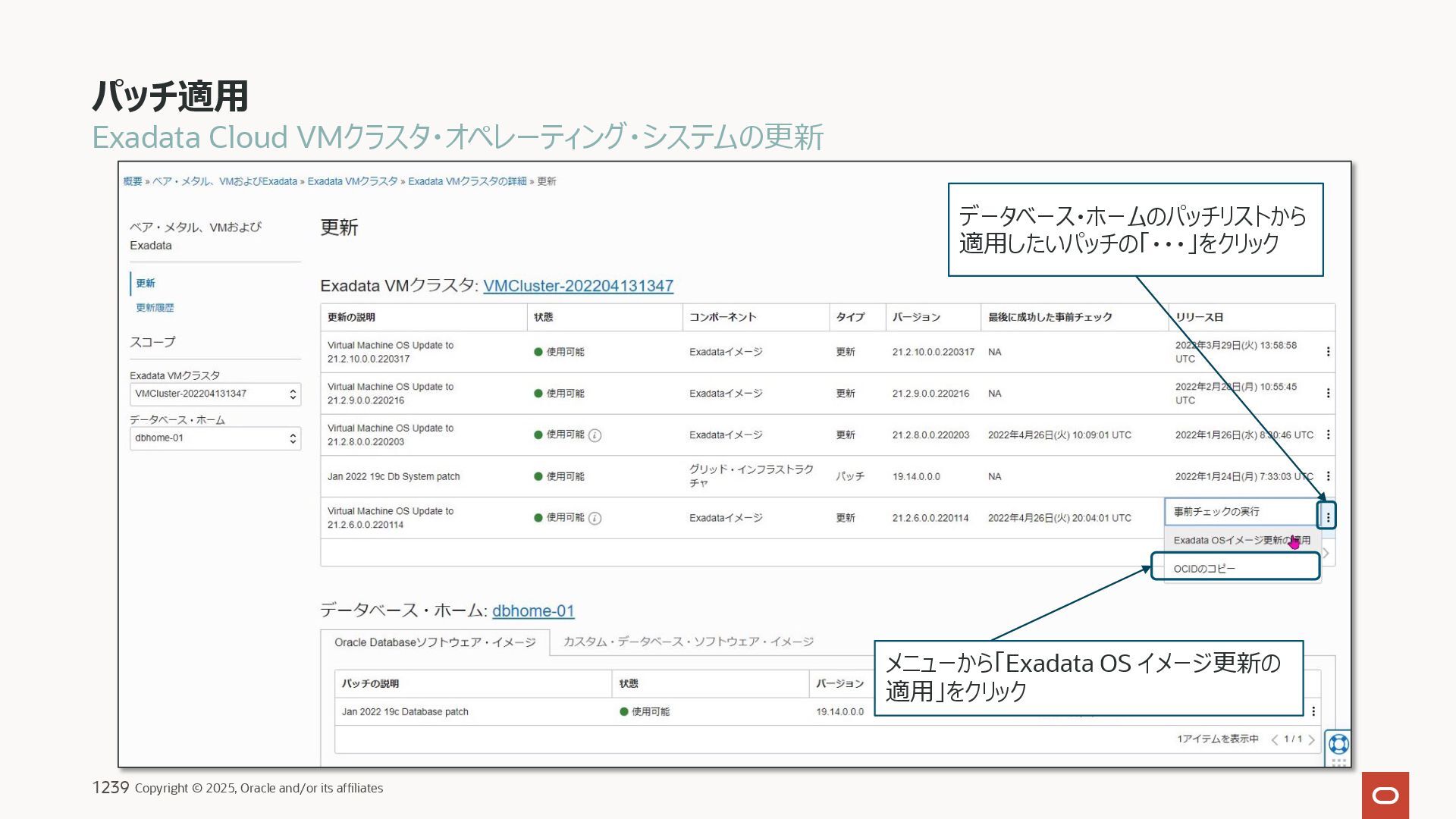2025-04-03T01:31:51.131744+00:00 SQL> ALTER DISKGROUP DATAC2 DROP DISK 'DATAC2_CD_00_kix101117exdcl10', 'DATAC2_CD_01_kix101117exdcl10', 'DATAC2_CD_02_kix101117exdcl10', 'DATAC2_CD_03_kix101117exdcl10', 'DATAC2_CD_04_kix101117exdcl10', 'DATAC2_CD_05_kix101117exdcl10', 'DATAC2_CD_06_kix101117exdcl10', 'DATAC2_CD_07_kix101117exdcl10', 'DATAC2_CD_08_kix101117exdcl10', 'DATAC2_CD_09_kix101117exdcl10', 'DATAC2_CD_10_kix101117exdcl10', 'DATAC2_CD_11_kix101117exdcl10' REBALANCE POWER 4 略 SUCCESS: ALTER DISKGROUP RECOC2 DROP DISK 'RECOC2_CD_00_kix101117exdcl10', 'RECOC2_CD_01_kix101117exdcl10', 'RECOC2_CD_02_kix101117exdcl10', 'RECOC2_CD_03_kix101117exdcl10', 'RECOC2_CD_04_kix101117exdcl10', 'RECOC2_CD_05_kix101117exdcl10', 'RECOC2_CD_06_kix101117exdcl10', 'RECOC2_CD_07_kix101117exdcl10', 'RECOC2_CD_08_kix101117exdcl10', 'RECOC2_CD_09_kix101117exdcl10', 'RECOC2_CD_10_kix101117exdcl10', 'RECOC2_CD_11_kix101117exdcl10' REBALANCE POWER 4 NOTE: Attempting voting file refresh on diskgroup RECOC2 NOTE: Refresh completed on diskgroup RECOC2. No voting file found. 2025-04-03T01:32:19.466977+00:00 Exadata Infrastructure Copyright © 2025, Oracle and/or its affiliates 132 ※2025年4⽉更新