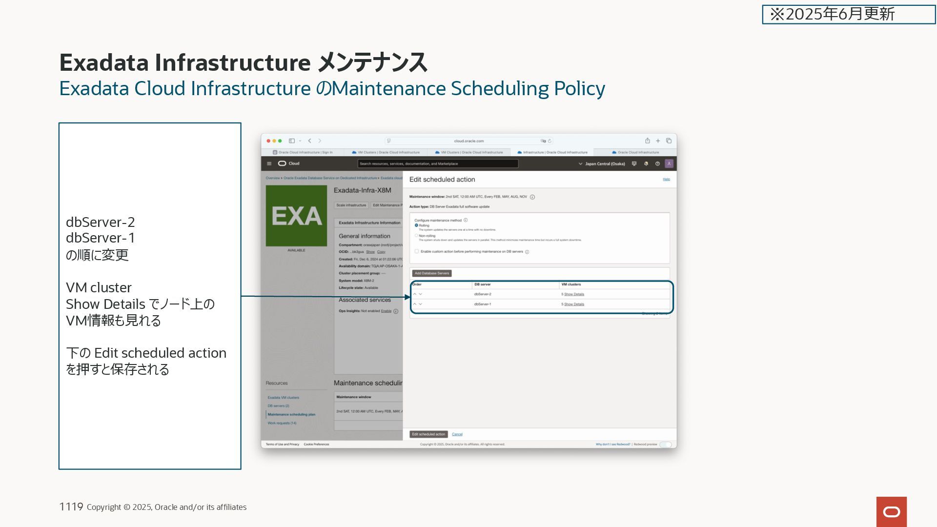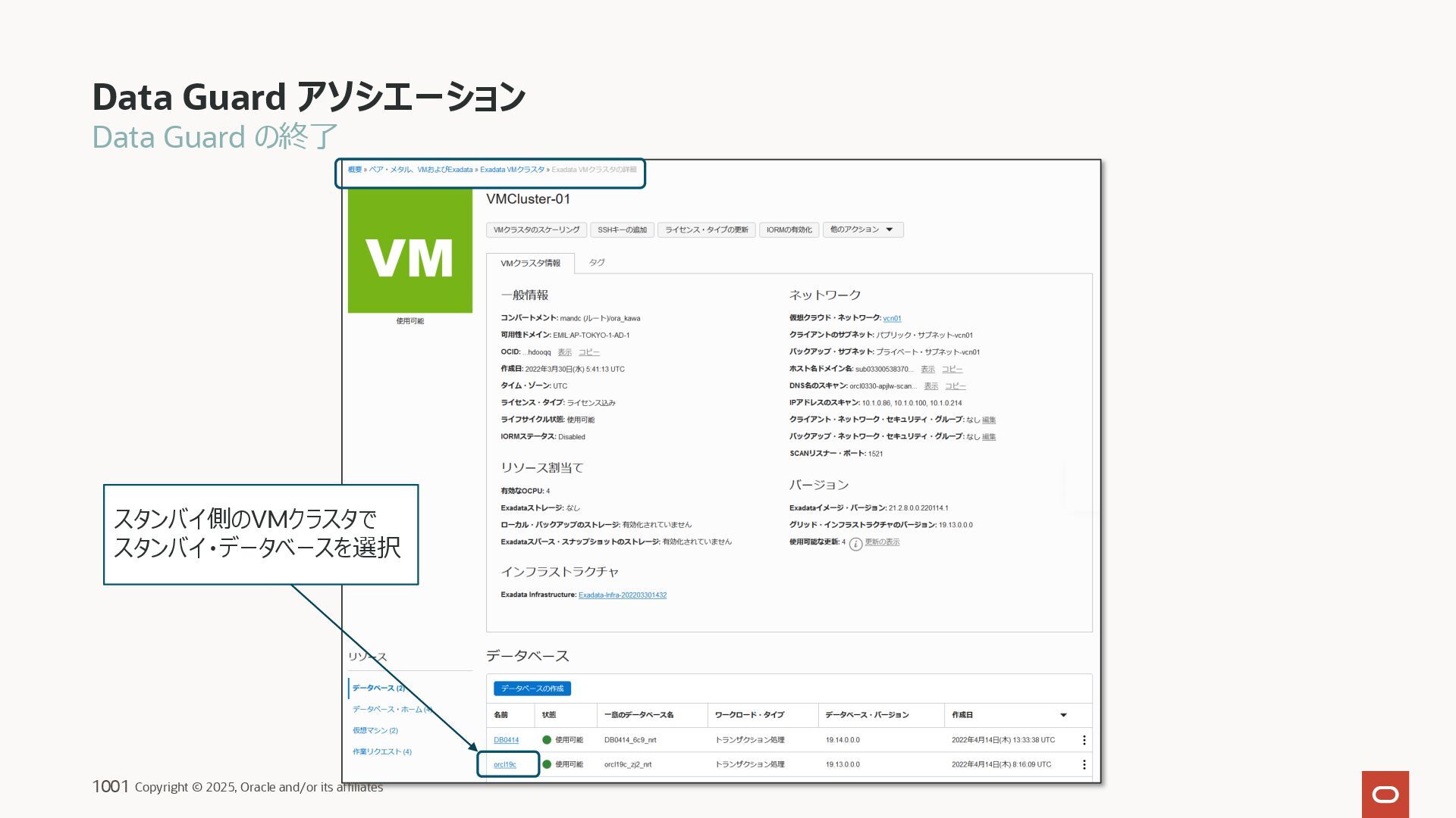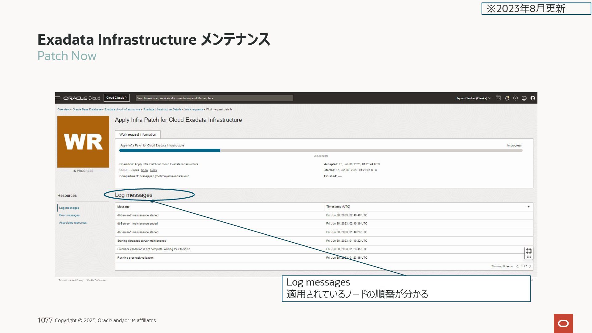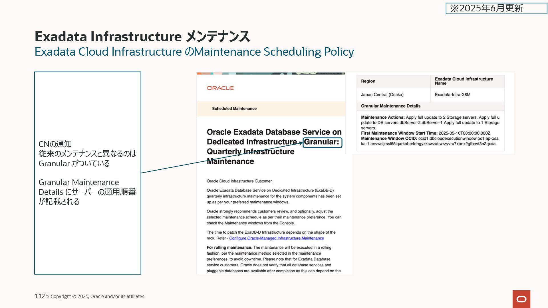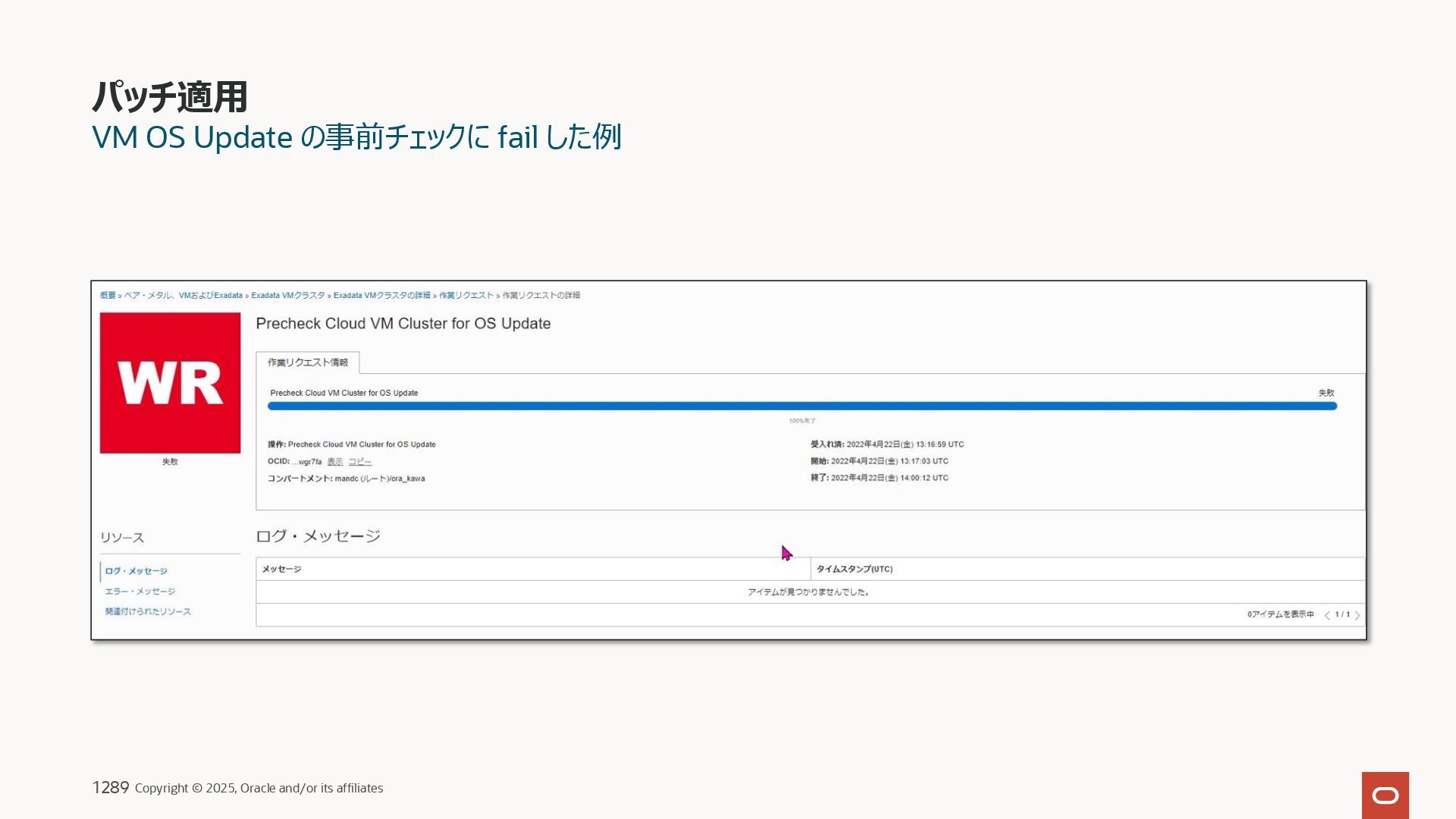 2025-04-03T01:31:51.131744+00:00 SQL> ALTER DISKGROUP DATAC2 DROP DISK 'DATAC2_CD_00_kix101117exdcl10', 'DATAC2_CD_01_kix101117exdcl10', 'DATAC2_CD_02_kix101117exdcl10', 'DATAC2_CD_03_kix101117exdcl10', 'DATAC2_CD_04_kix101117exdcl10', 'DATAC2_CD_05_kix101117exdcl10', 'DATAC2_CD_06_kix101117exdcl10', 'DATAC2_CD_07_kix101117exdcl10', 'DATAC2_CD_08_kix101117exdcl10', 'DATAC2_CD_09_kix101117exdcl10', 'DATAC2_CD_10_kix101117exdcl10', 'DATAC2_CD_11_kix101117exdcl10' REBALANCE POWER 4 略 SUCCESS: ALTER DISKGROUP RECOC2 DROP DISK 'RECOC2_CD_00_kix101117exdcl10', 'RECOC2_CD_01_kix101117exdcl10', 'RECOC2_CD_02_kix101117exdcl10', 'RECOC2_CD_03_kix101117exdcl10', 'RECOC2_CD_04_kix101117exdcl10', 'RECOC2_CD_05_kix101117exdcl10', 'RECOC2_CD_06_kix101117exdcl10', 'RECOC2_CD_07_kix101117exdcl10', 'RECOC2_CD_08_kix101117exdcl10', 'RECOC2_CD_09_kix101117exdcl10', 'RECOC2_CD_10_kix101117exdcl10', 'RECOC2_CD_11_kix101117exdcl10' REBALANCE POWER 4 NOTE: Attempting voting file refresh on diskgroup RECOC2 NOTE: Refresh completed on diskgroup RECOC2. No voting file found. 2025-04-03T01:32:19.466977+00:00 Exadata Infrastructure Copyright © 2025, Oracle and/or its affiliates 132 ※2025年4⽉更新