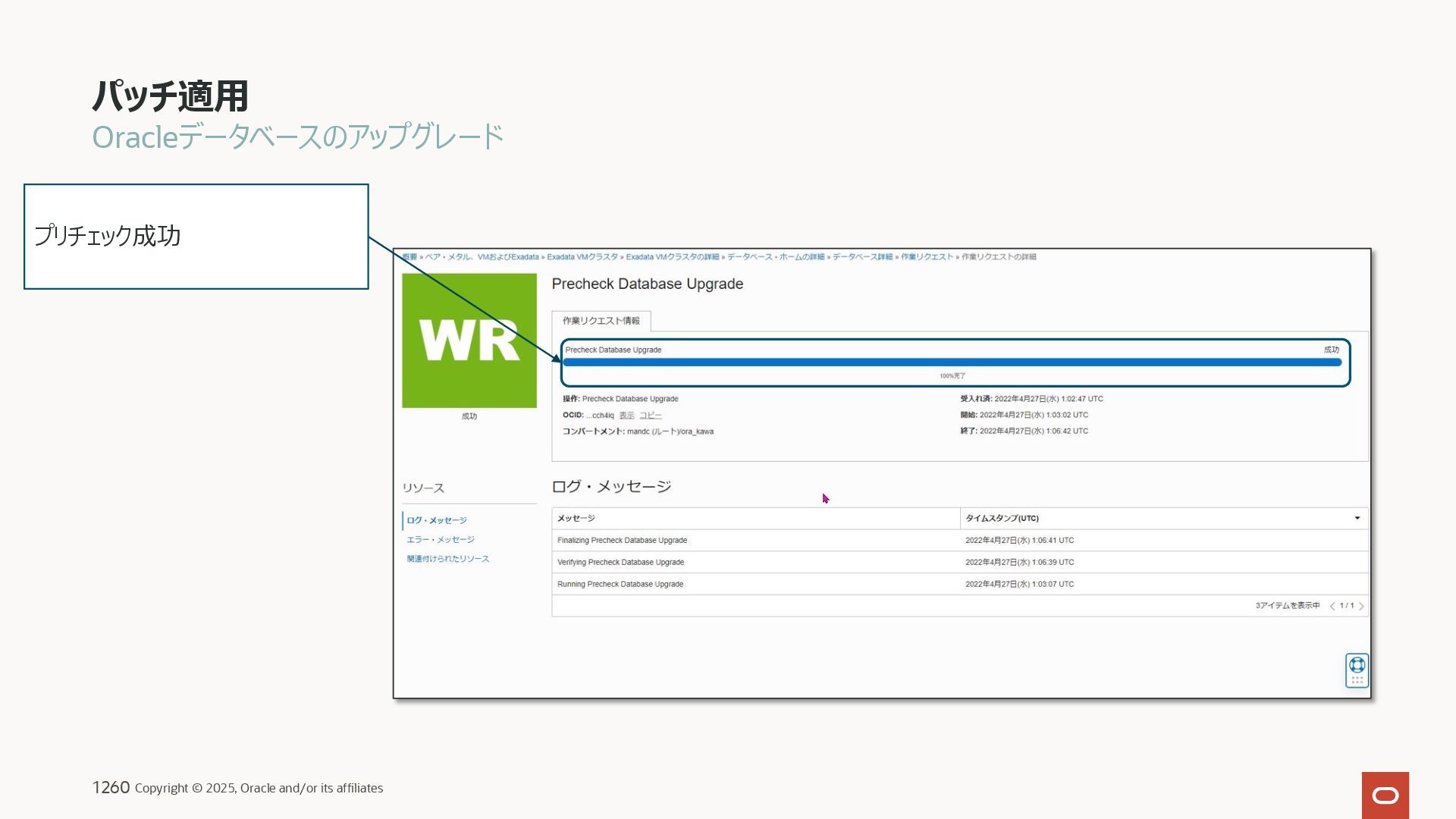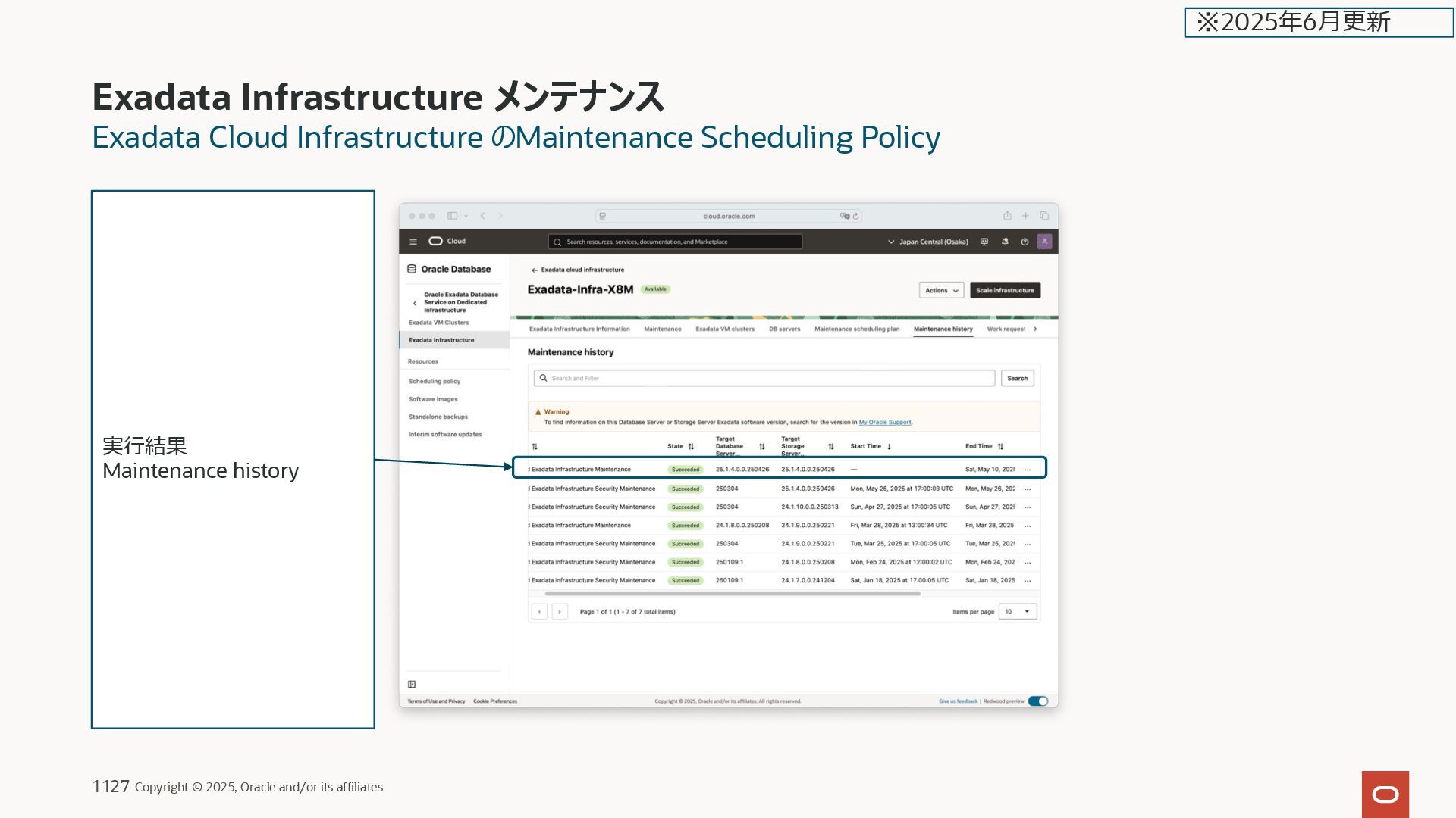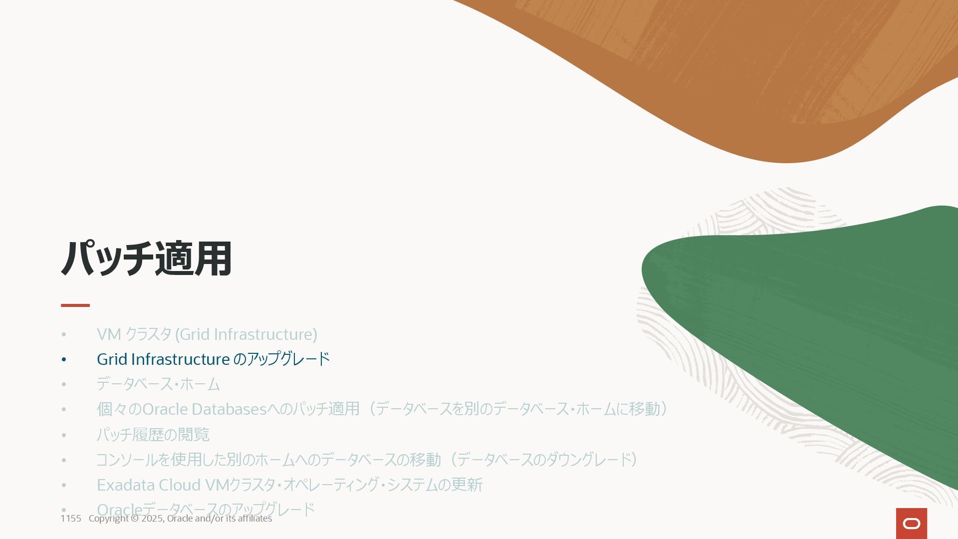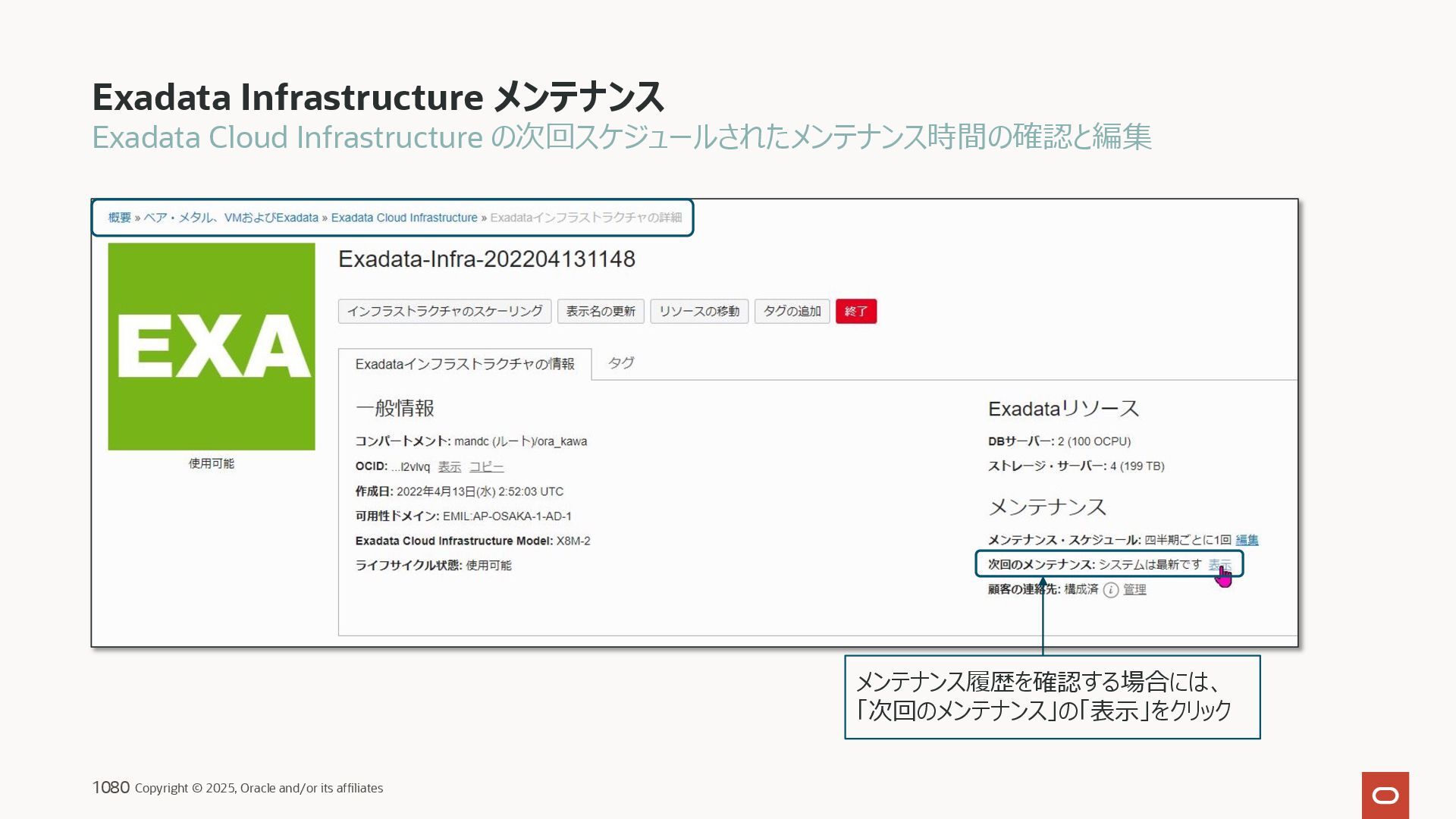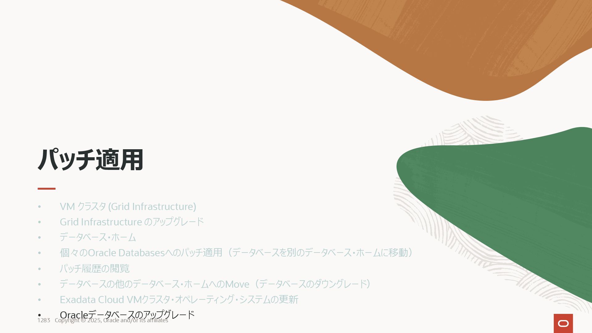 2025-04-03T01:31:51.131744+00:00 SQL> ALTER DISKGROUP DATAC2 DROP DISK 'DATAC2_CD_00_kix101117exdcl10', 'DATAC2_CD_01_kix101117exdcl10', 'DATAC2_CD_02_kix101117exdcl10', 'DATAC2_CD_03_kix101117exdcl10', 'DATAC2_CD_04_kix101117exdcl10', 'DATAC2_CD_05_kix101117exdcl10', 'DATAC2_CD_06_kix101117exdcl10', 'DATAC2_CD_07_kix101117exdcl10', 'DATAC2_CD_08_kix101117exdcl10', 'DATAC2_CD_09_kix101117exdcl10', 'DATAC2_CD_10_kix101117exdcl10', 'DATAC2_CD_11_kix101117exdcl10' REBALANCE POWER 4 略 SUCCESS: ALTER DISKGROUP RECOC2 DROP DISK 'RECOC2_CD_00_kix101117exdcl10', 'RECOC2_CD_01_kix101117exdcl10', 'RECOC2_CD_02_kix101117exdcl10', 'RECOC2_CD_03_kix101117exdcl10', 'RECOC2_CD_04_kix101117exdcl10', 'RECOC2_CD_05_kix101117exdcl10', 'RECOC2_CD_06_kix101117exdcl10', 'RECOC2_CD_07_kix101117exdcl10', 'RECOC2_CD_08_kix101117exdcl10', 'RECOC2_CD_09_kix101117exdcl10', 'RECOC2_CD_10_kix101117exdcl10', 'RECOC2_CD_11_kix101117exdcl10' REBALANCE POWER 4 NOTE: Attempting voting file refresh on diskgroup RECOC2 NOTE: Refresh completed on diskgroup RECOC2. No voting file found. 2025-04-03T01:32:19.466977+00:00 Exadata Infrastructure Copyright © 2025, Oracle and/or its affiliates 132 ※2025年4⽉更新