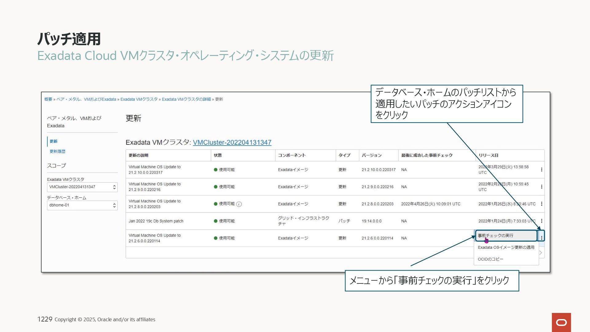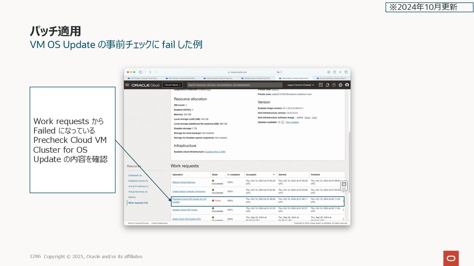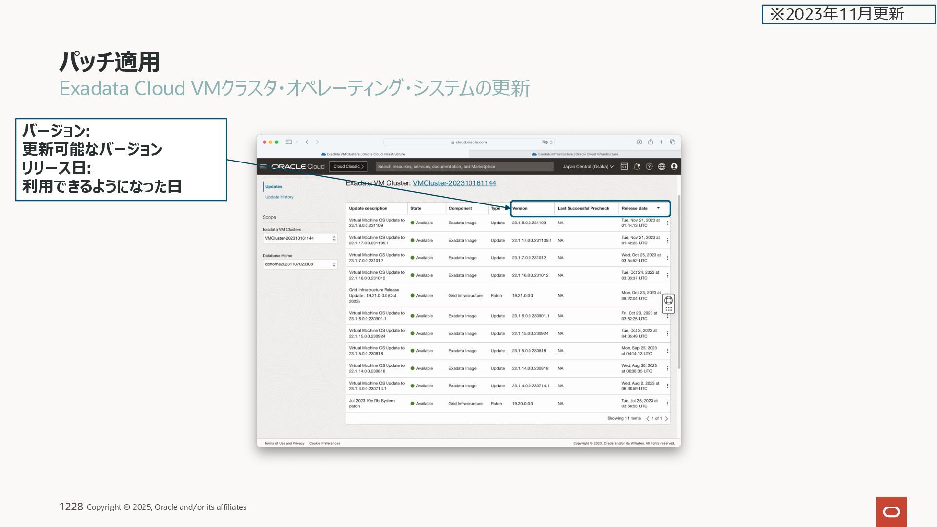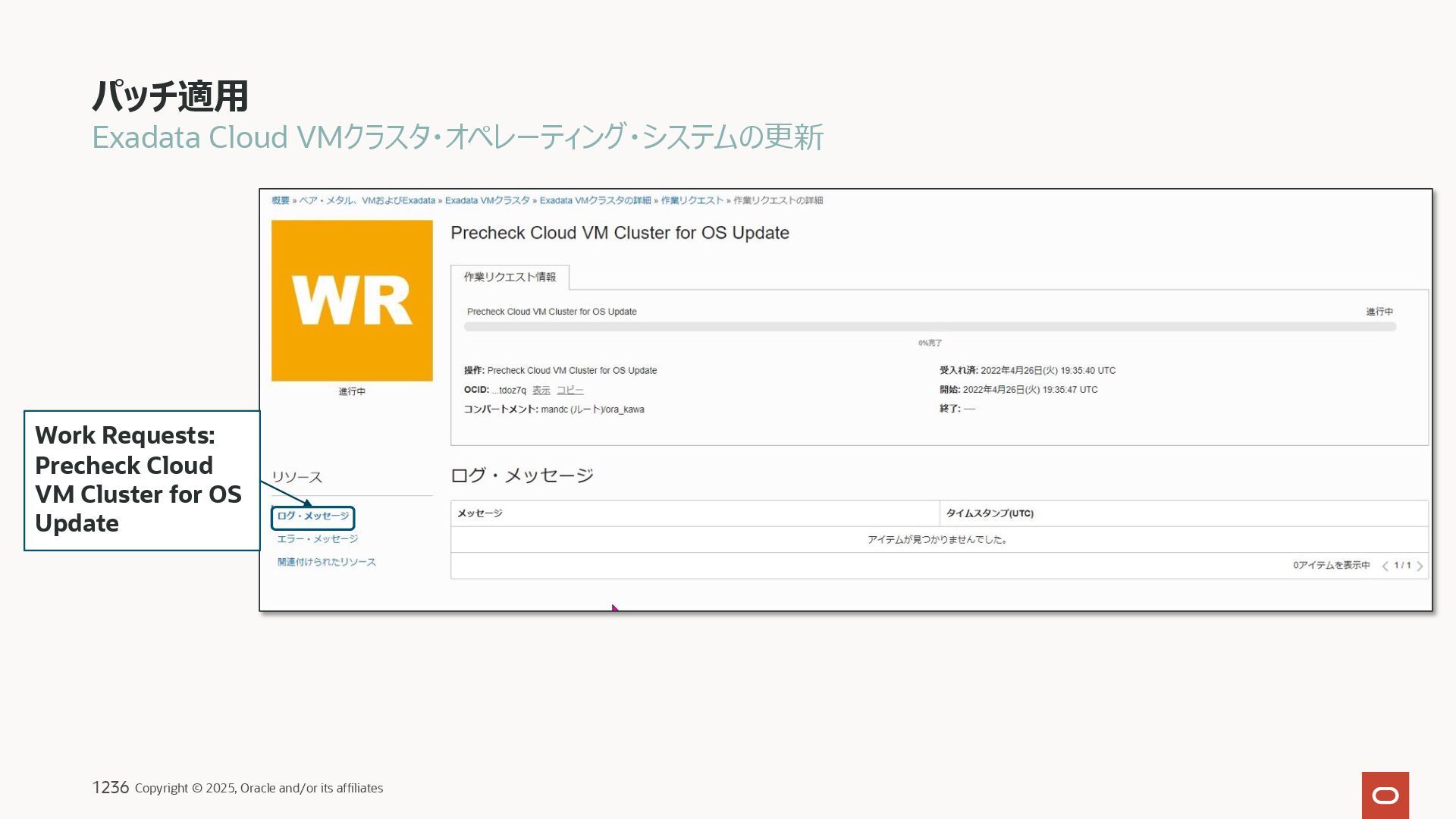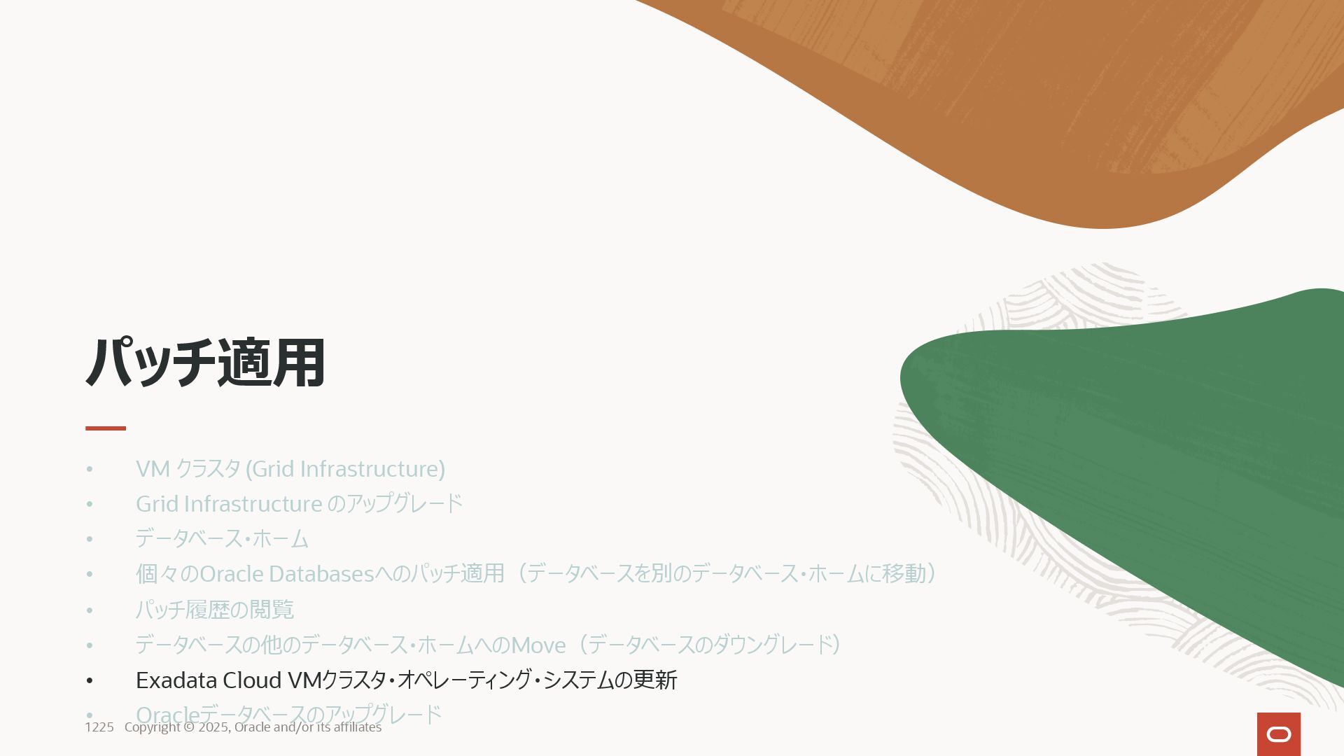 2025-04-03T01:31:51.131744+00:00 SQL> ALTER DISKGROUP DATAC2 DROP DISK 'DATAC2_CD_00_kix101117exdcl10', 'DATAC2_CD_01_kix101117exdcl10', 'DATAC2_CD_02_kix101117exdcl10', 'DATAC2_CD_03_kix101117exdcl10', 'DATAC2_CD_04_kix101117exdcl10', 'DATAC2_CD_05_kix101117exdcl10', 'DATAC2_CD_06_kix101117exdcl10', 'DATAC2_CD_07_kix101117exdcl10', 'DATAC2_CD_08_kix101117exdcl10', 'DATAC2_CD_09_kix101117exdcl10', 'DATAC2_CD_10_kix101117exdcl10', 'DATAC2_CD_11_kix101117exdcl10' REBALANCE POWER 4 略 SUCCESS: ALTER DISKGROUP RECOC2 DROP DISK 'RECOC2_CD_00_kix101117exdcl10', 'RECOC2_CD_01_kix101117exdcl10', 'RECOC2_CD_02_kix101117exdcl10', 'RECOC2_CD_03_kix101117exdcl10', 'RECOC2_CD_04_kix101117exdcl10', 'RECOC2_CD_05_kix101117exdcl10', 'RECOC2_CD_06_kix101117exdcl10', 'RECOC2_CD_07_kix101117exdcl10', 'RECOC2_CD_08_kix101117exdcl10', 'RECOC2_CD_09_kix101117exdcl10', 'RECOC2_CD_10_kix101117exdcl10', 'RECOC2_CD_11_kix101117exdcl10' REBALANCE POWER 4 NOTE: Attempting voting file refresh on diskgroup RECOC2 NOTE: Refresh completed on diskgroup RECOC2. No voting file found. 2025-04-03T01:32:19.466977+00:00 Exadata Infrastructure Copyright © 2025, Oracle and/or its affiliates 132 ※2025年4⽉更新