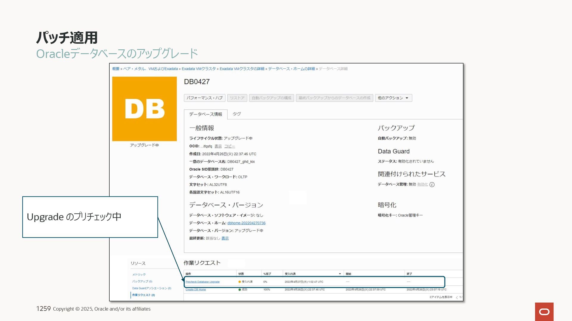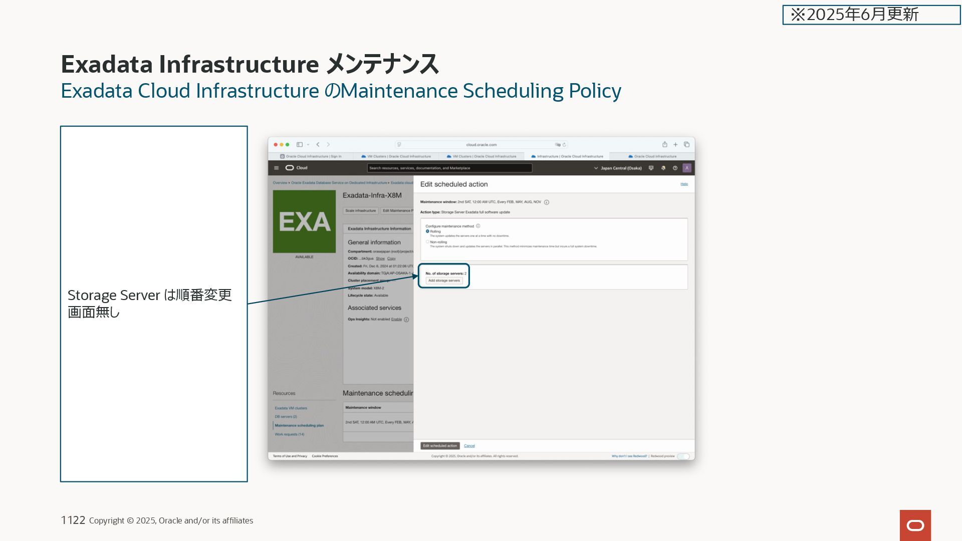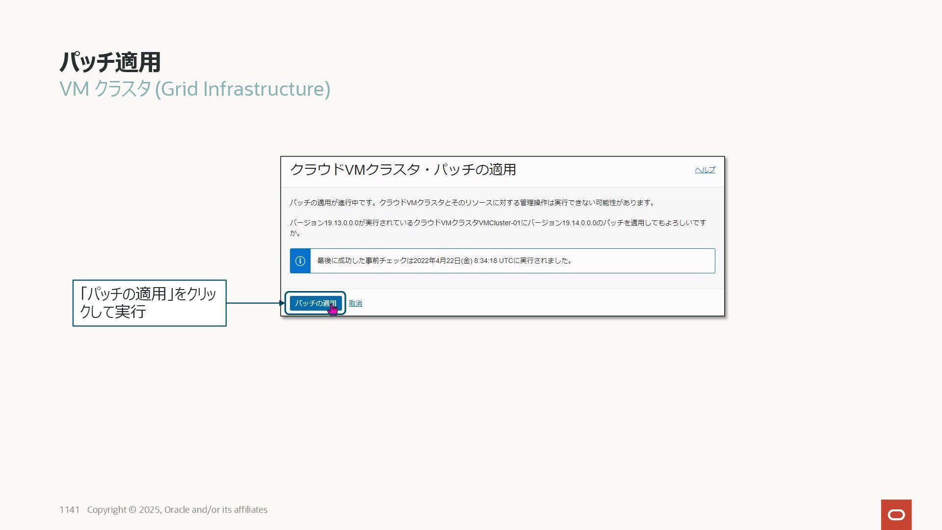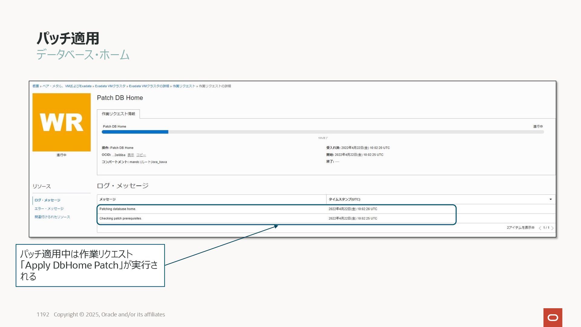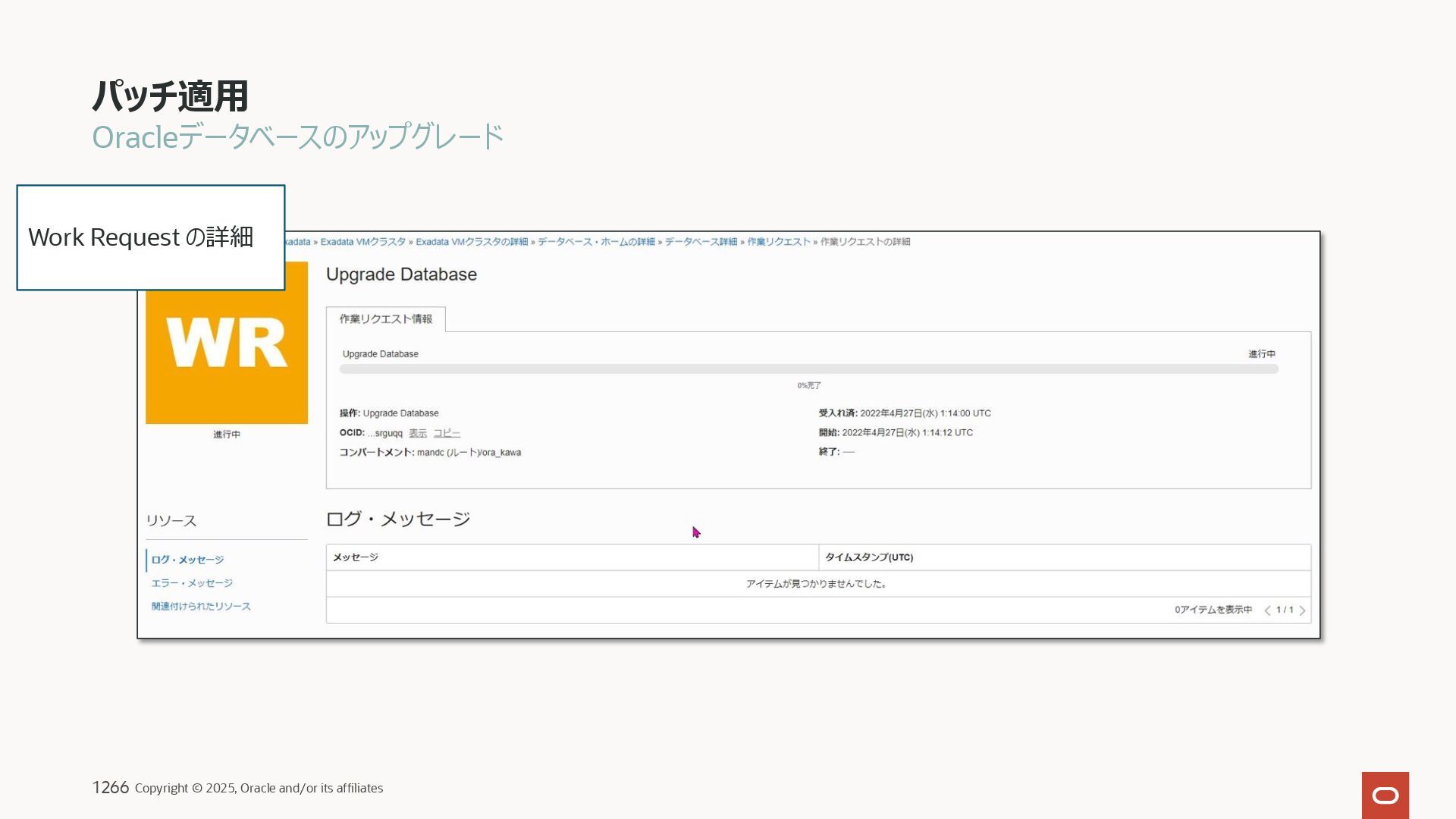 2025-04-03T01:31:51.131744+00:00 SQL> ALTER DISKGROUP DATAC2 DROP DISK 'DATAC2_CD_00_kix101117exdcl10', 'DATAC2_CD_01_kix101117exdcl10', 'DATAC2_CD_02_kix101117exdcl10', 'DATAC2_CD_03_kix101117exdcl10', 'DATAC2_CD_04_kix101117exdcl10', 'DATAC2_CD_05_kix101117exdcl10', 'DATAC2_CD_06_kix101117exdcl10', 'DATAC2_CD_07_kix101117exdcl10', 'DATAC2_CD_08_kix101117exdcl10', 'DATAC2_CD_09_kix101117exdcl10', 'DATAC2_CD_10_kix101117exdcl10', 'DATAC2_CD_11_kix101117exdcl10' REBALANCE POWER 4 略 SUCCESS: ALTER DISKGROUP RECOC2 DROP DISK 'RECOC2_CD_00_kix101117exdcl10', 'RECOC2_CD_01_kix101117exdcl10', 'RECOC2_CD_02_kix101117exdcl10', 'RECOC2_CD_03_kix101117exdcl10', 'RECOC2_CD_04_kix101117exdcl10', 'RECOC2_CD_05_kix101117exdcl10', 'RECOC2_CD_06_kix101117exdcl10', 'RECOC2_CD_07_kix101117exdcl10', 'RECOC2_CD_08_kix101117exdcl10', 'RECOC2_CD_09_kix101117exdcl10', 'RECOC2_CD_10_kix101117exdcl10', 'RECOC2_CD_11_kix101117exdcl10' REBALANCE POWER 4 NOTE: Attempting voting file refresh on diskgroup RECOC2 NOTE: Refresh completed on diskgroup RECOC2. No voting file found. 2025-04-03T01:32:19.466977+00:00 Exadata Infrastructure Copyright © 2025, Oracle and/or its affiliates 132 ※2025年4⽉更新
