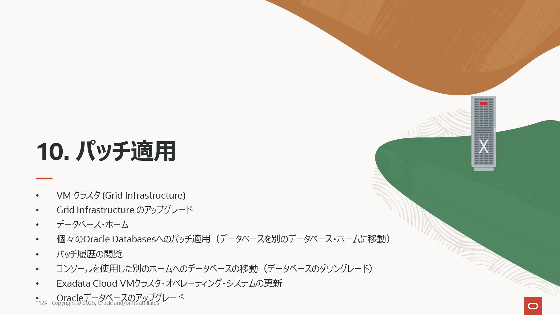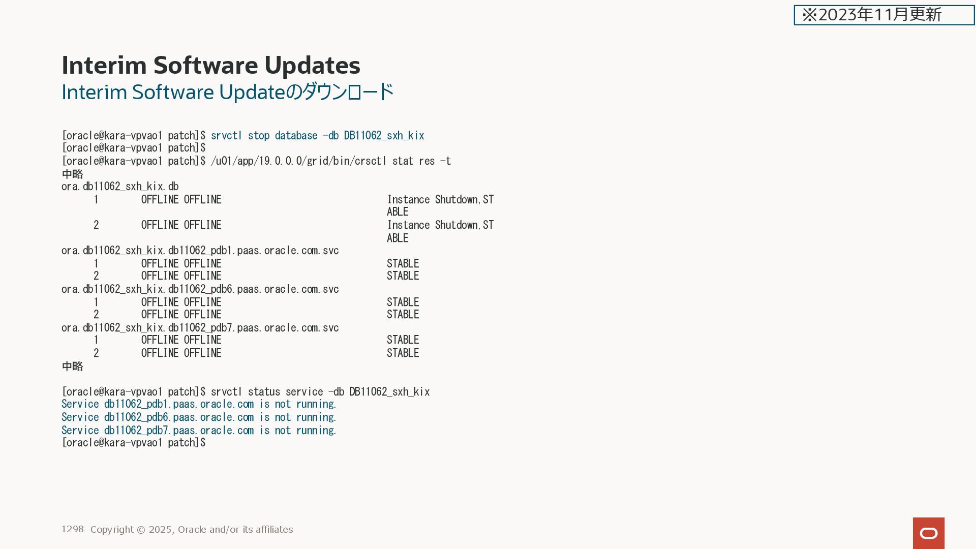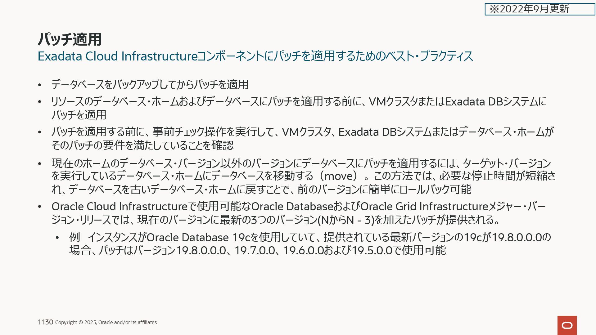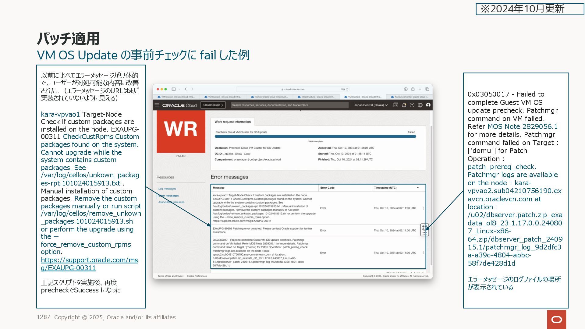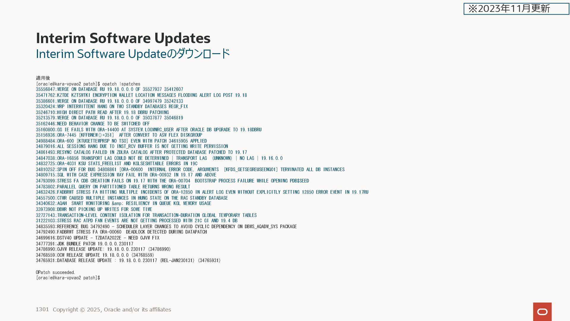 2025-04-03T01:31:51.131744+00:00 SQL> ALTER DISKGROUP DATAC2 DROP DISK 'DATAC2_CD_00_kix101117exdcl10', 'DATAC2_CD_01_kix101117exdcl10', 'DATAC2_CD_02_kix101117exdcl10', 'DATAC2_CD_03_kix101117exdcl10', 'DATAC2_CD_04_kix101117exdcl10', 'DATAC2_CD_05_kix101117exdcl10', 'DATAC2_CD_06_kix101117exdcl10', 'DATAC2_CD_07_kix101117exdcl10', 'DATAC2_CD_08_kix101117exdcl10', 'DATAC2_CD_09_kix101117exdcl10', 'DATAC2_CD_10_kix101117exdcl10', 'DATAC2_CD_11_kix101117exdcl10' REBALANCE POWER 4 略 SUCCESS: ALTER DISKGROUP RECOC2 DROP DISK 'RECOC2_CD_00_kix101117exdcl10', 'RECOC2_CD_01_kix101117exdcl10', 'RECOC2_CD_02_kix101117exdcl10', 'RECOC2_CD_03_kix101117exdcl10', 'RECOC2_CD_04_kix101117exdcl10', 'RECOC2_CD_05_kix101117exdcl10', 'RECOC2_CD_06_kix101117exdcl10', 'RECOC2_CD_07_kix101117exdcl10', 'RECOC2_CD_08_kix101117exdcl10', 'RECOC2_CD_09_kix101117exdcl10', 'RECOC2_CD_10_kix101117exdcl10', 'RECOC2_CD_11_kix101117exdcl10' REBALANCE POWER 4 NOTE: Attempting voting file refresh on diskgroup RECOC2 NOTE: Refresh completed on diskgroup RECOC2. No voting file found. 2025-04-03T01:32:19.466977+00:00 Exadata Infrastructure Copyright © 2025, Oracle and/or its affiliates 132 ※2025年4⽉更新