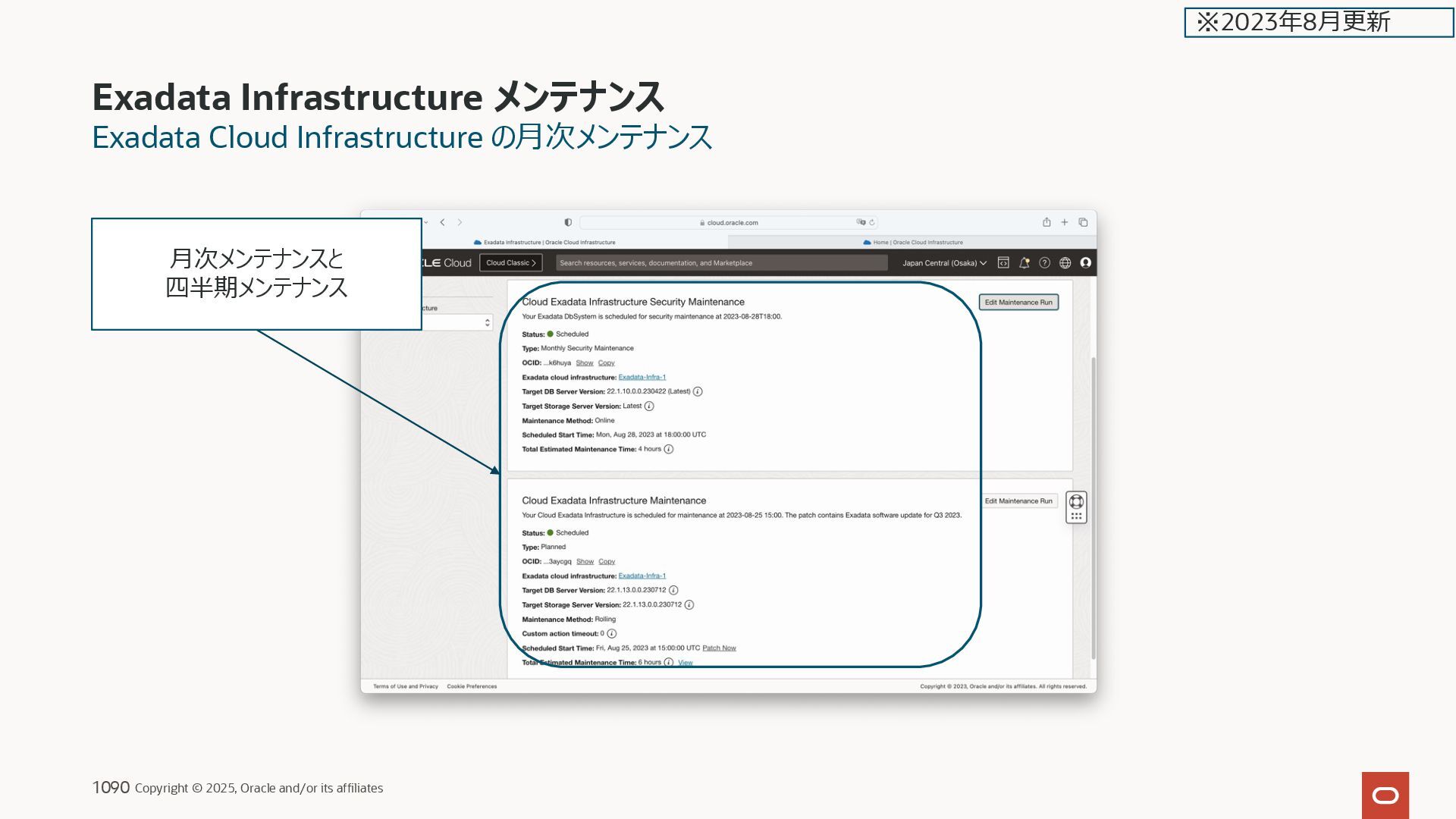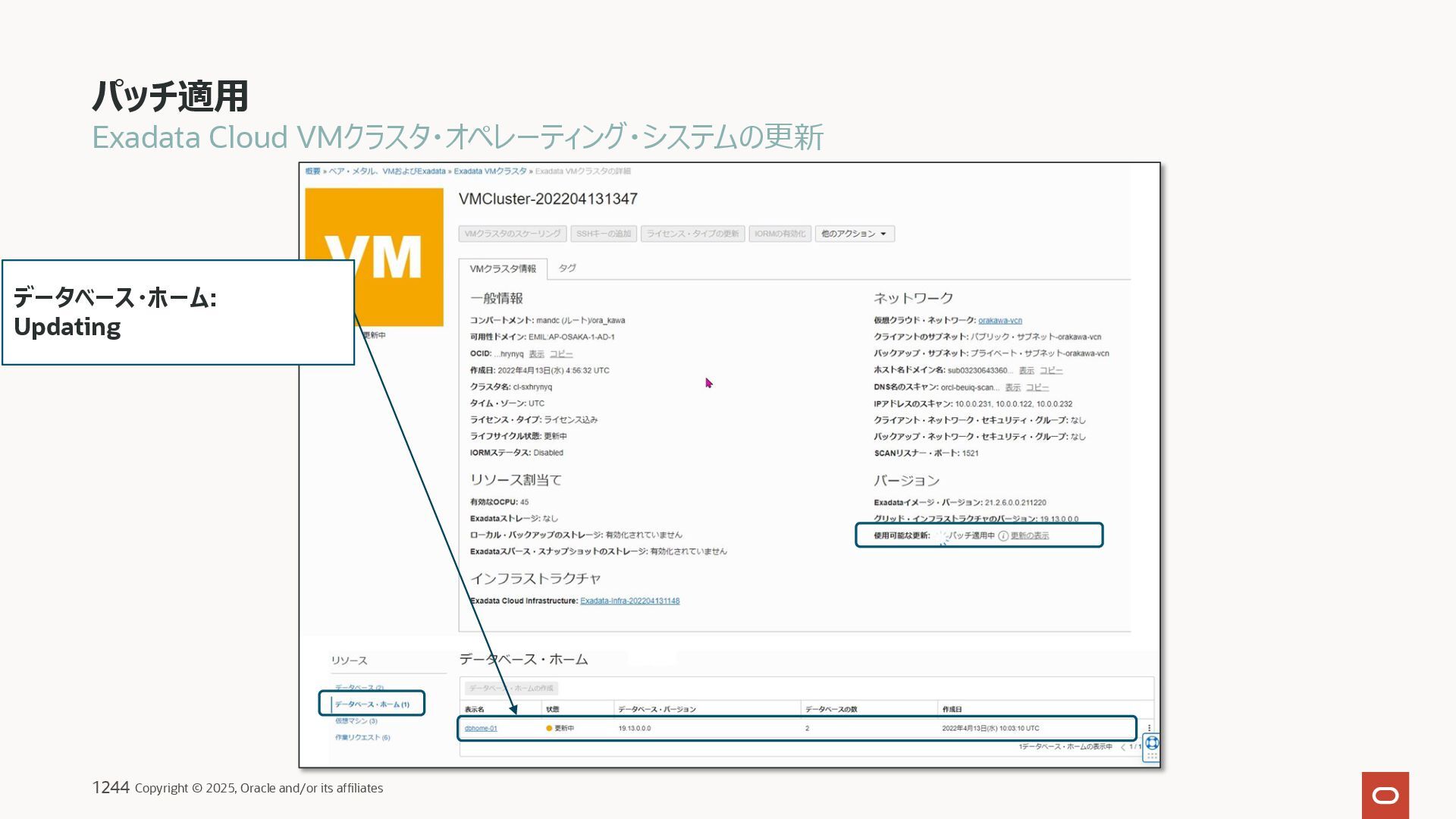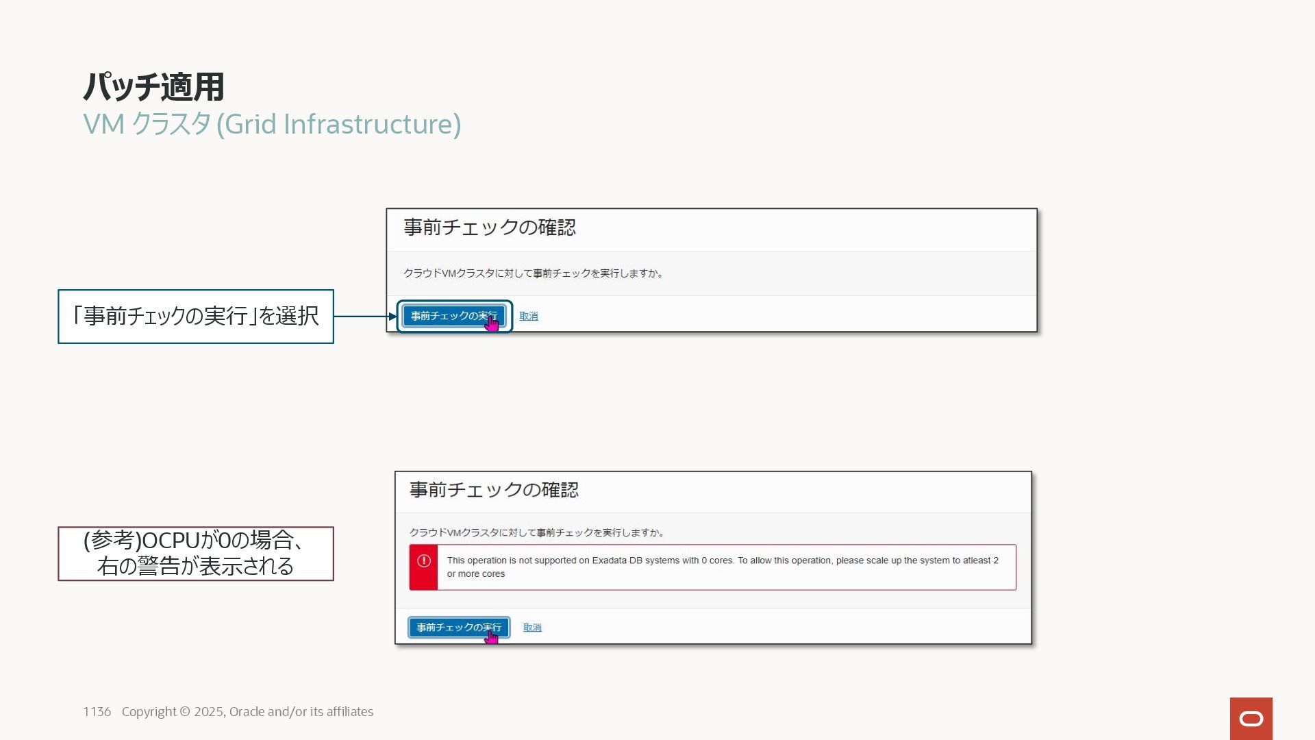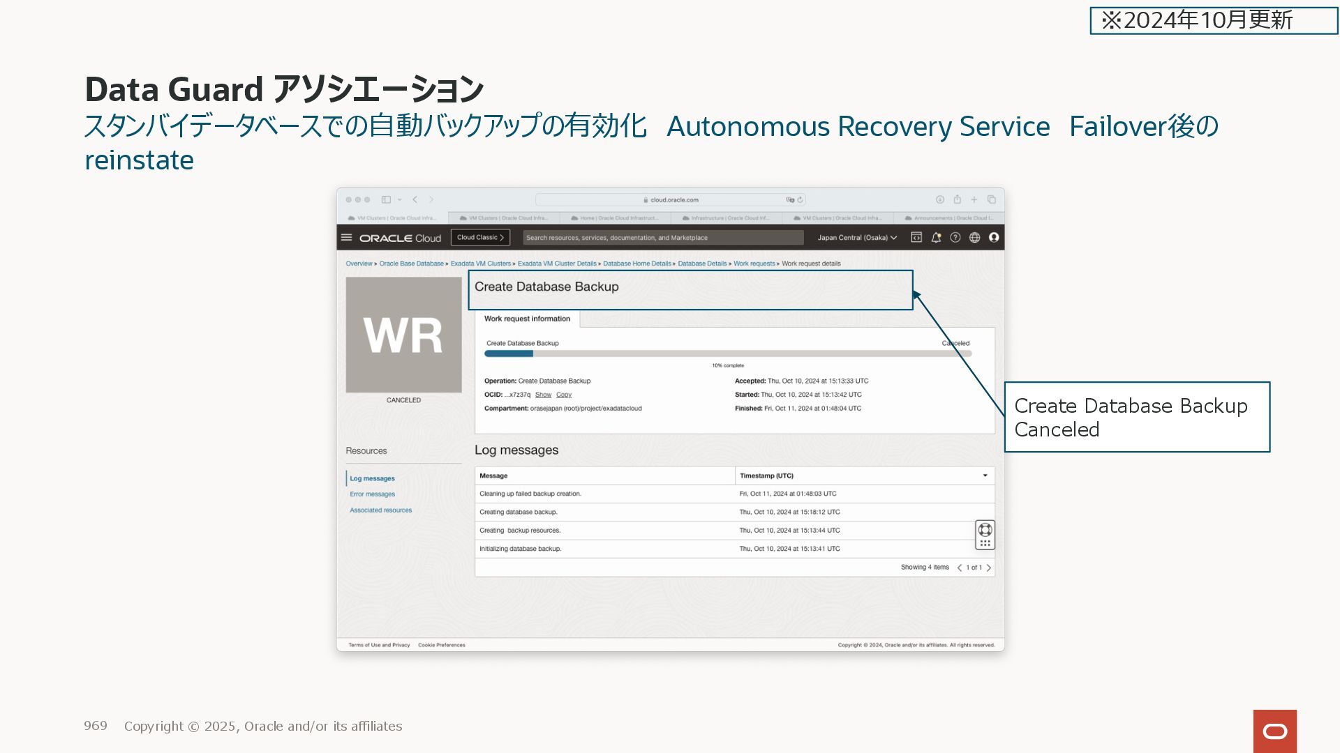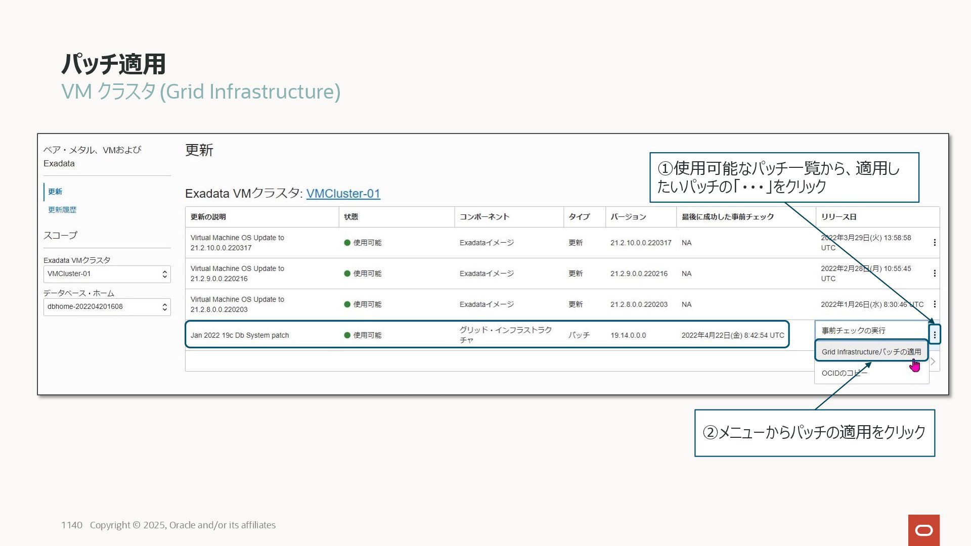 2025-04-03T01:31:51.131744+00:00 SQL> ALTER DISKGROUP DATAC2 DROP DISK 'DATAC2_CD_00_kix101117exdcl10', 'DATAC2_CD_01_kix101117exdcl10', 'DATAC2_CD_02_kix101117exdcl10', 'DATAC2_CD_03_kix101117exdcl10', 'DATAC2_CD_04_kix101117exdcl10', 'DATAC2_CD_05_kix101117exdcl10', 'DATAC2_CD_06_kix101117exdcl10', 'DATAC2_CD_07_kix101117exdcl10', 'DATAC2_CD_08_kix101117exdcl10', 'DATAC2_CD_09_kix101117exdcl10', 'DATAC2_CD_10_kix101117exdcl10', 'DATAC2_CD_11_kix101117exdcl10' REBALANCE POWER 4 略 SUCCESS: ALTER DISKGROUP RECOC2 DROP DISK 'RECOC2_CD_00_kix101117exdcl10', 'RECOC2_CD_01_kix101117exdcl10', 'RECOC2_CD_02_kix101117exdcl10', 'RECOC2_CD_03_kix101117exdcl10', 'RECOC2_CD_04_kix101117exdcl10', 'RECOC2_CD_05_kix101117exdcl10', 'RECOC2_CD_06_kix101117exdcl10', 'RECOC2_CD_07_kix101117exdcl10', 'RECOC2_CD_08_kix101117exdcl10', 'RECOC2_CD_09_kix101117exdcl10', 'RECOC2_CD_10_kix101117exdcl10', 'RECOC2_CD_11_kix101117exdcl10' REBALANCE POWER 4 NOTE: Attempting voting file refresh on diskgroup RECOC2 NOTE: Refresh completed on diskgroup RECOC2. No voting file found. 2025-04-03T01:32:19.466977+00:00 Exadata Infrastructure Copyright © 2025, Oracle and/or its affiliates 132 ※2025年4⽉更新