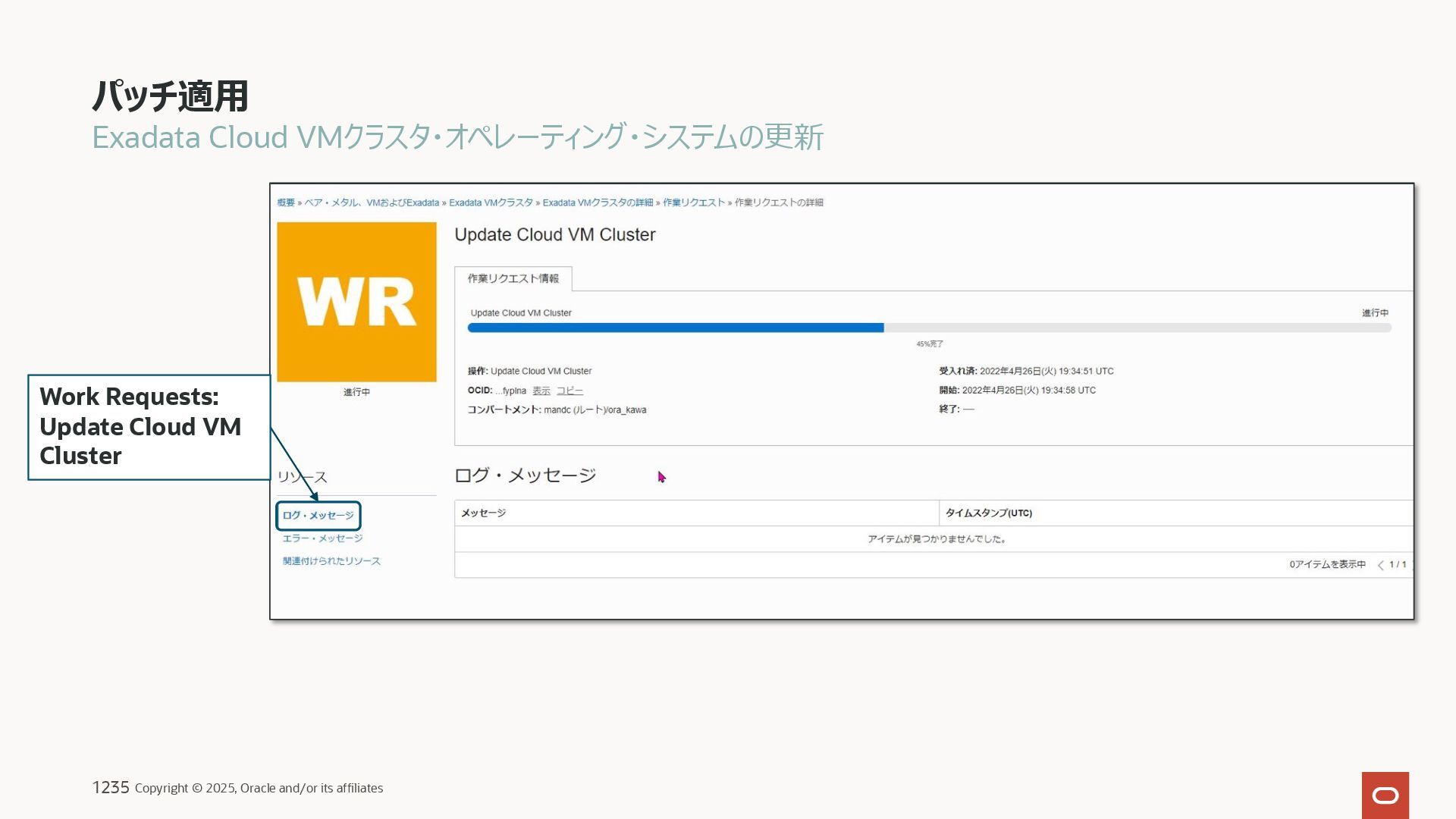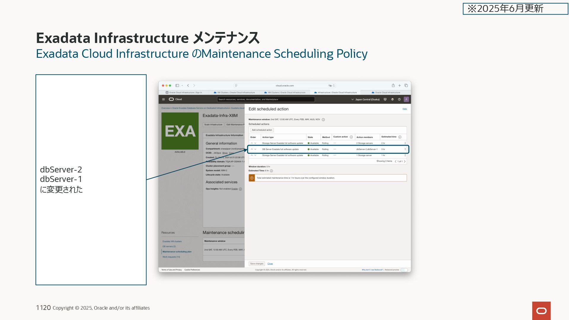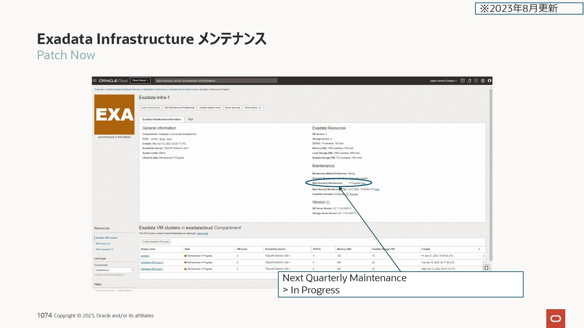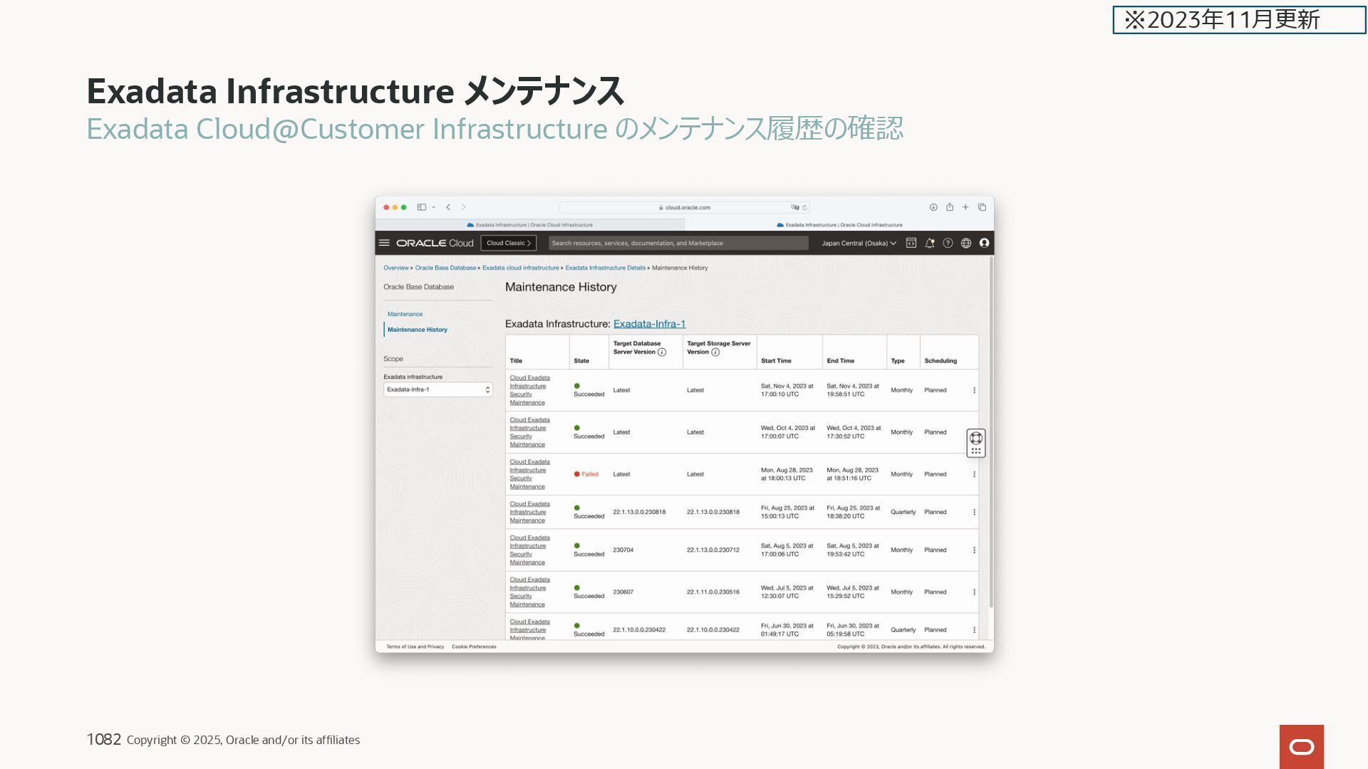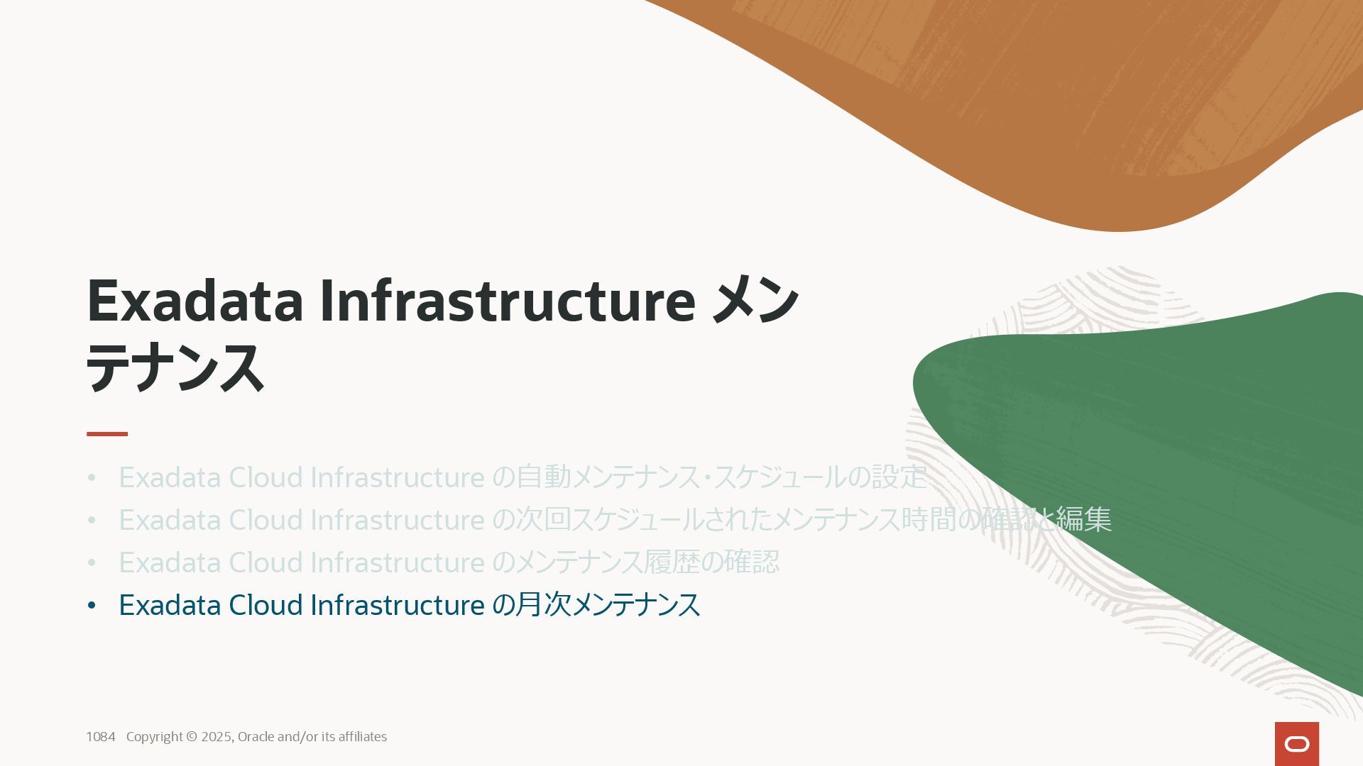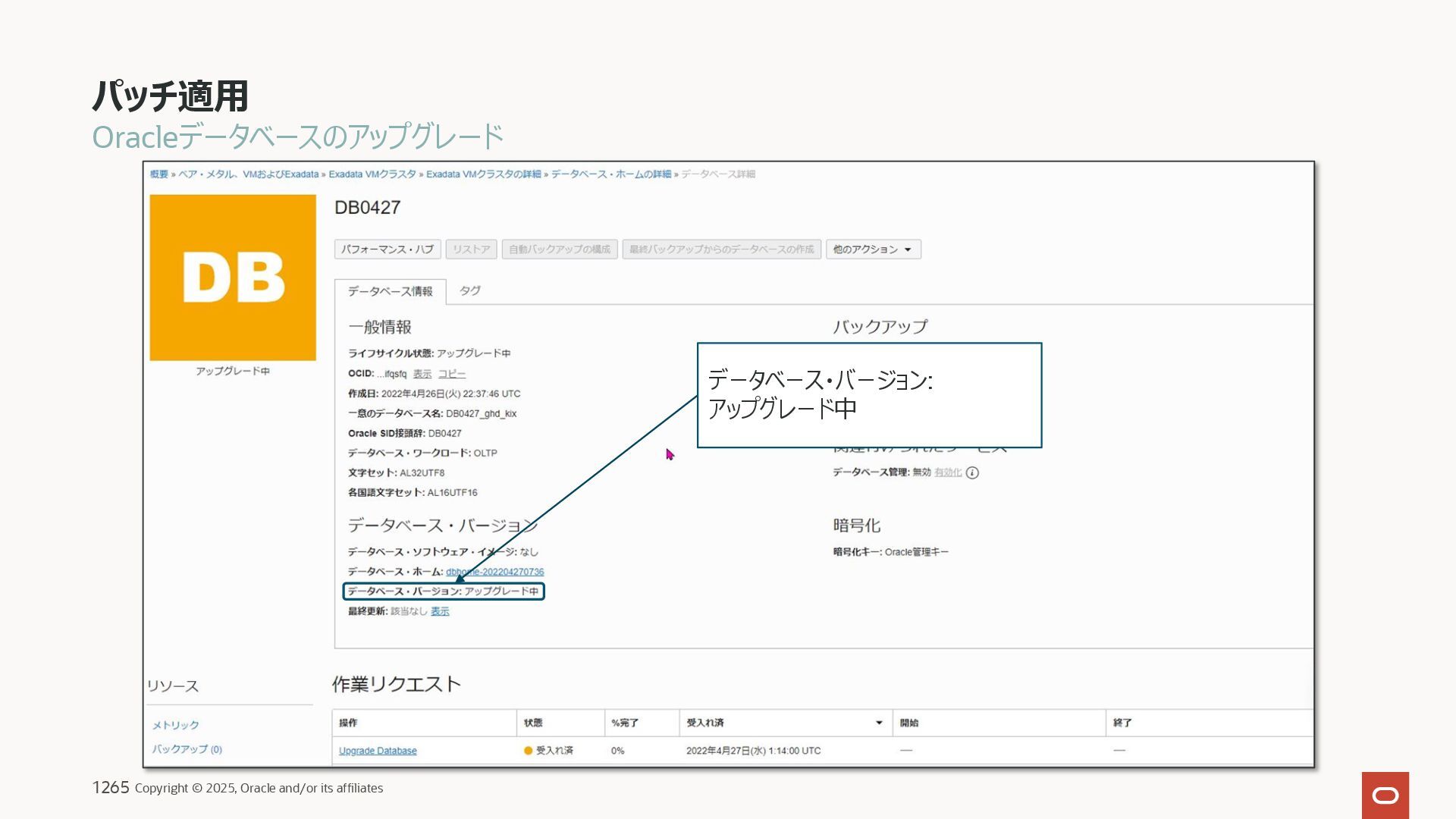 2025-04-03T01:31:51.131744+00:00 SQL> ALTER DISKGROUP DATAC2 DROP DISK 'DATAC2_CD_00_kix101117exdcl10', 'DATAC2_CD_01_kix101117exdcl10', 'DATAC2_CD_02_kix101117exdcl10', 'DATAC2_CD_03_kix101117exdcl10', 'DATAC2_CD_04_kix101117exdcl10', 'DATAC2_CD_05_kix101117exdcl10', 'DATAC2_CD_06_kix101117exdcl10', 'DATAC2_CD_07_kix101117exdcl10', 'DATAC2_CD_08_kix101117exdcl10', 'DATAC2_CD_09_kix101117exdcl10', 'DATAC2_CD_10_kix101117exdcl10', 'DATAC2_CD_11_kix101117exdcl10' REBALANCE POWER 4 略 SUCCESS: ALTER DISKGROUP RECOC2 DROP DISK 'RECOC2_CD_00_kix101117exdcl10', 'RECOC2_CD_01_kix101117exdcl10', 'RECOC2_CD_02_kix101117exdcl10', 'RECOC2_CD_03_kix101117exdcl10', 'RECOC2_CD_04_kix101117exdcl10', 'RECOC2_CD_05_kix101117exdcl10', 'RECOC2_CD_06_kix101117exdcl10', 'RECOC2_CD_07_kix101117exdcl10', 'RECOC2_CD_08_kix101117exdcl10', 'RECOC2_CD_09_kix101117exdcl10', 'RECOC2_CD_10_kix101117exdcl10', 'RECOC2_CD_11_kix101117exdcl10' REBALANCE POWER 4 NOTE: Attempting voting file refresh on diskgroup RECOC2 NOTE: Refresh completed on diskgroup RECOC2. No voting file found. 2025-04-03T01:32:19.466977+00:00 Exadata Infrastructure Copyright © 2025, Oracle and/or its affiliates 132 ※2025年4⽉更新