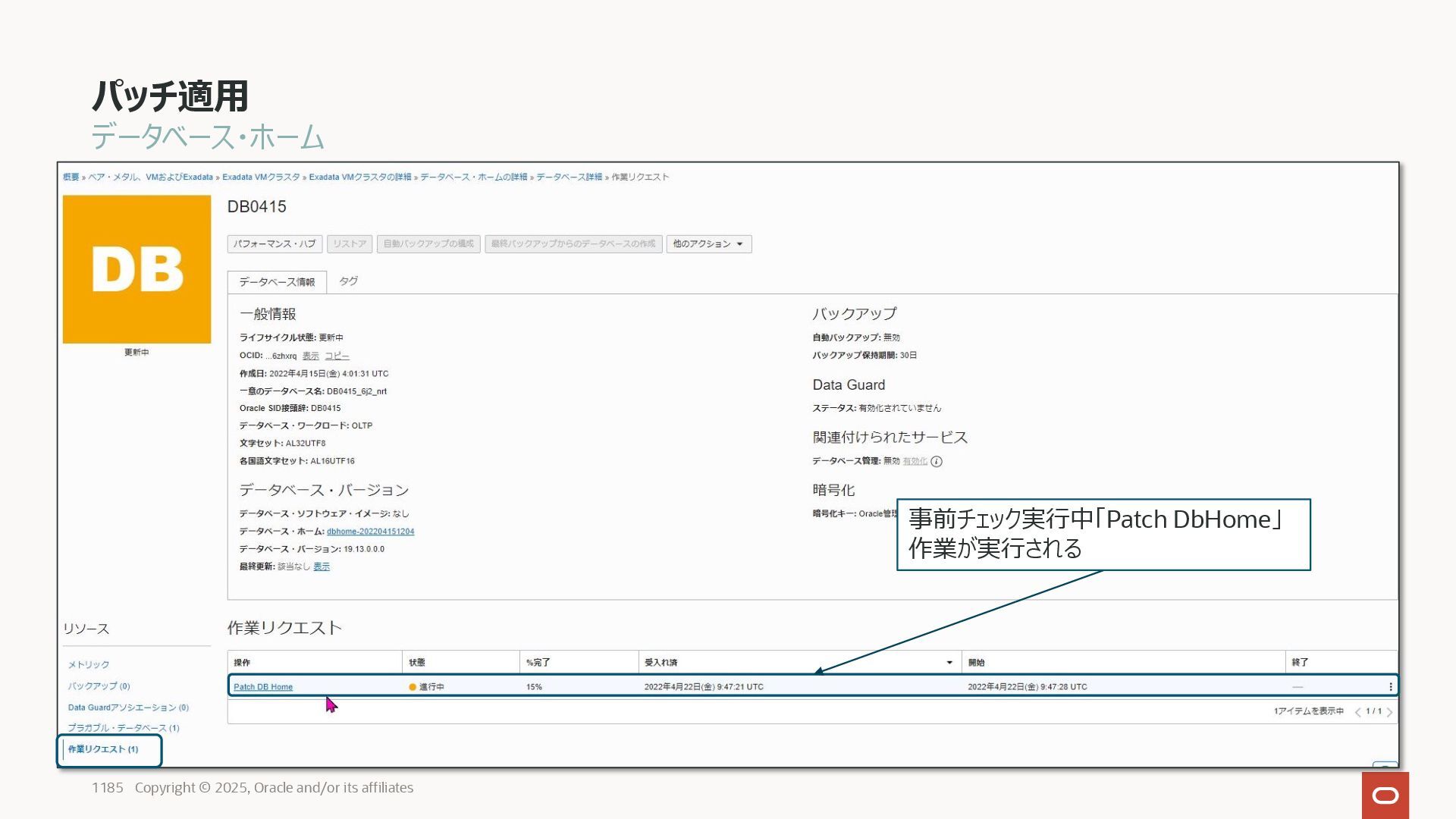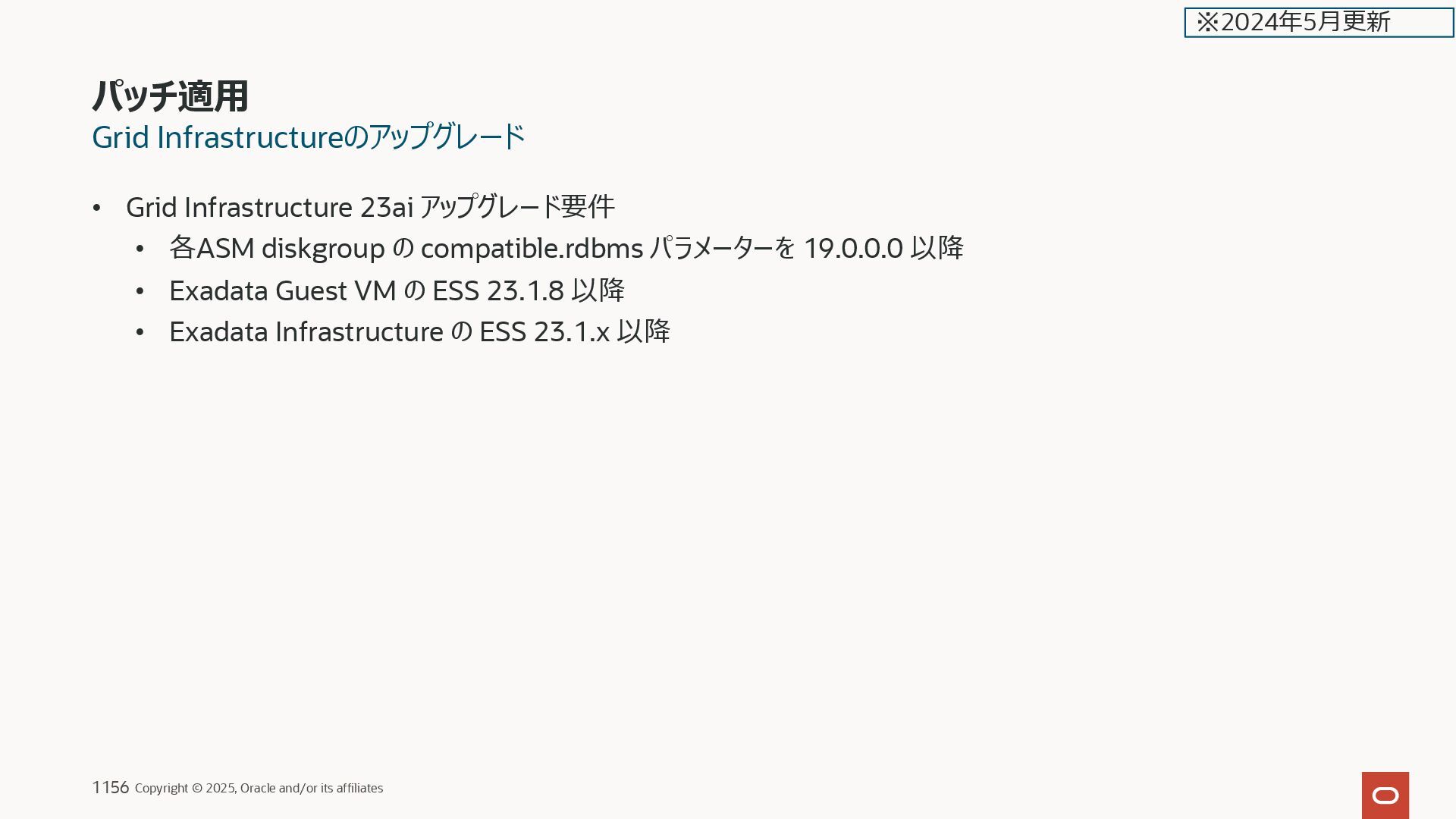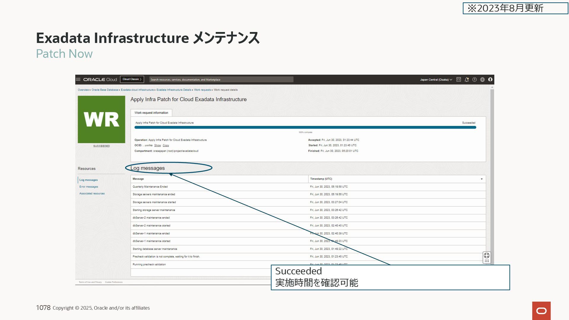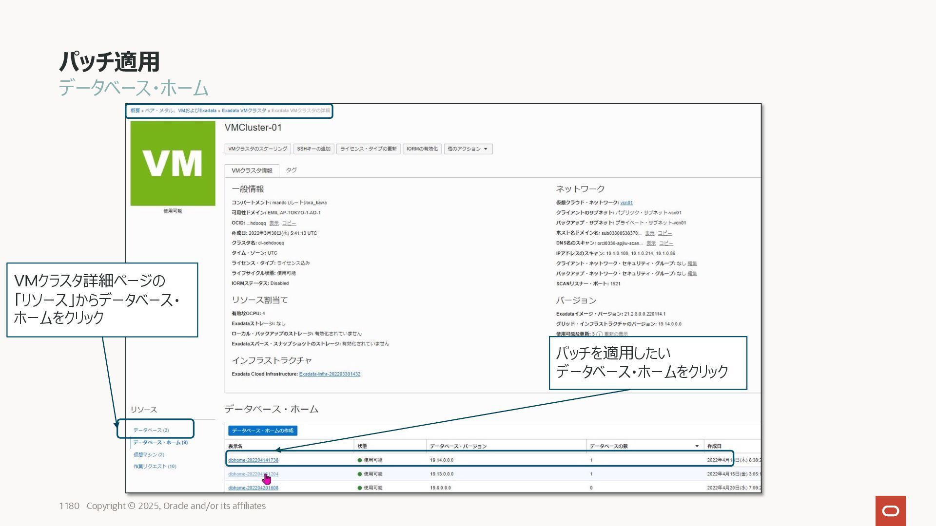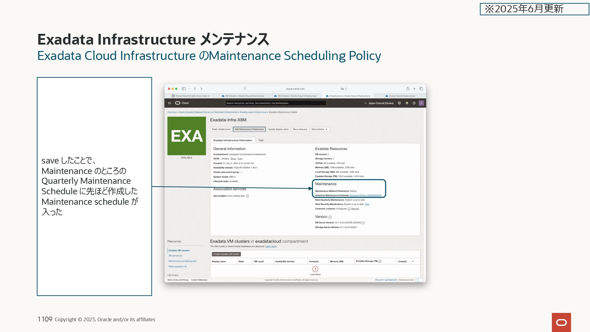 2025-04-03T01:31:51.131744+00:00 SQL> ALTER DISKGROUP DATAC2 DROP DISK 'DATAC2_CD_00_kix101117exdcl10', 'DATAC2_CD_01_kix101117exdcl10', 'DATAC2_CD_02_kix101117exdcl10', 'DATAC2_CD_03_kix101117exdcl10', 'DATAC2_CD_04_kix101117exdcl10', 'DATAC2_CD_05_kix101117exdcl10', 'DATAC2_CD_06_kix101117exdcl10', 'DATAC2_CD_07_kix101117exdcl10', 'DATAC2_CD_08_kix101117exdcl10', 'DATAC2_CD_09_kix101117exdcl10', 'DATAC2_CD_10_kix101117exdcl10', 'DATAC2_CD_11_kix101117exdcl10' REBALANCE POWER 4 略 SUCCESS: ALTER DISKGROUP RECOC2 DROP DISK 'RECOC2_CD_00_kix101117exdcl10', 'RECOC2_CD_01_kix101117exdcl10', 'RECOC2_CD_02_kix101117exdcl10', 'RECOC2_CD_03_kix101117exdcl10', 'RECOC2_CD_04_kix101117exdcl10', 'RECOC2_CD_05_kix101117exdcl10', 'RECOC2_CD_06_kix101117exdcl10', 'RECOC2_CD_07_kix101117exdcl10', 'RECOC2_CD_08_kix101117exdcl10', 'RECOC2_CD_09_kix101117exdcl10', 'RECOC2_CD_10_kix101117exdcl10', 'RECOC2_CD_11_kix101117exdcl10' REBALANCE POWER 4 NOTE: Attempting voting file refresh on diskgroup RECOC2 NOTE: Refresh completed on diskgroup RECOC2. No voting file found. 2025-04-03T01:32:19.466977+00:00 Exadata Infrastructure Copyright © 2025, Oracle and/or its affiliates 132 ※2025年4⽉更新