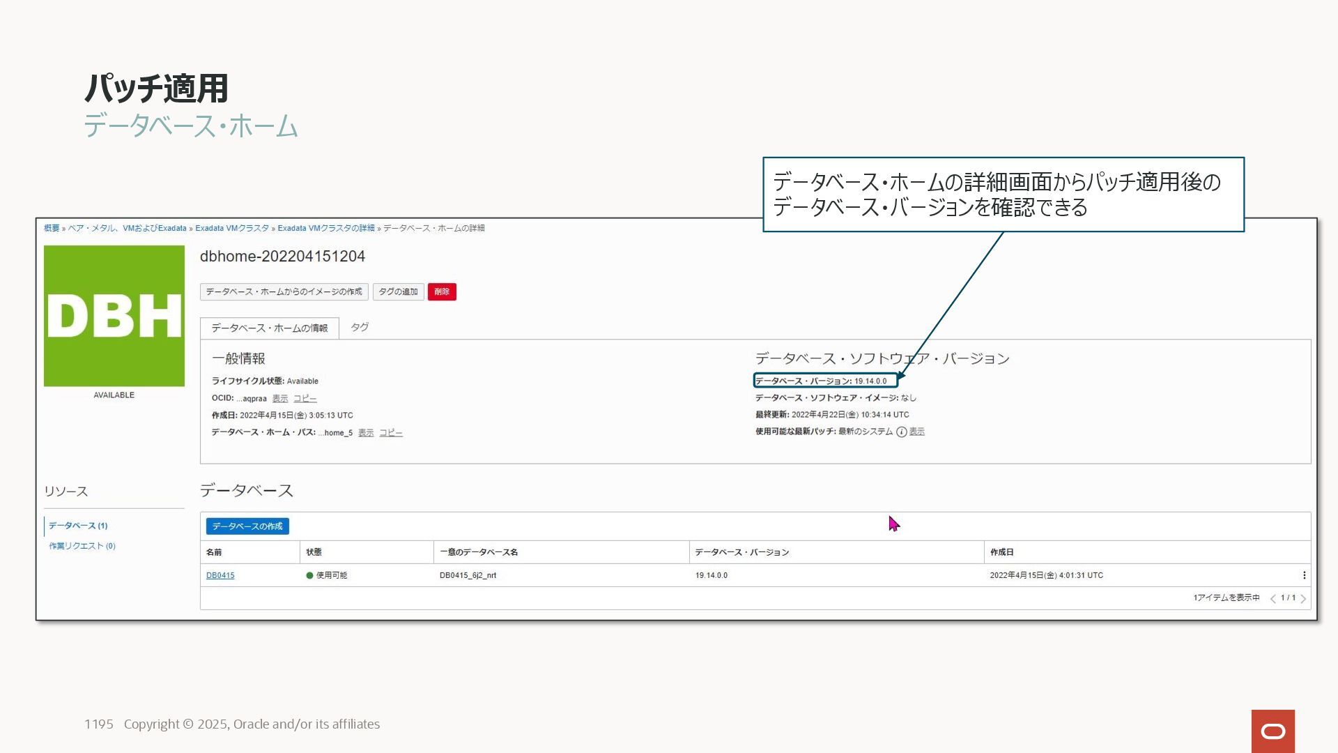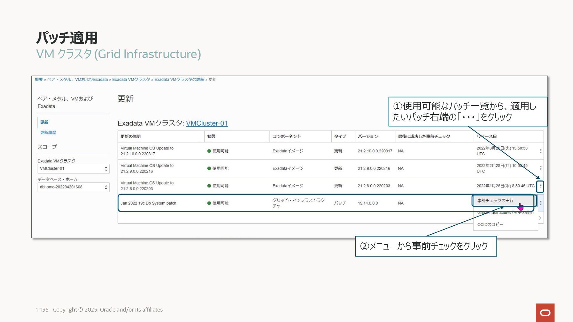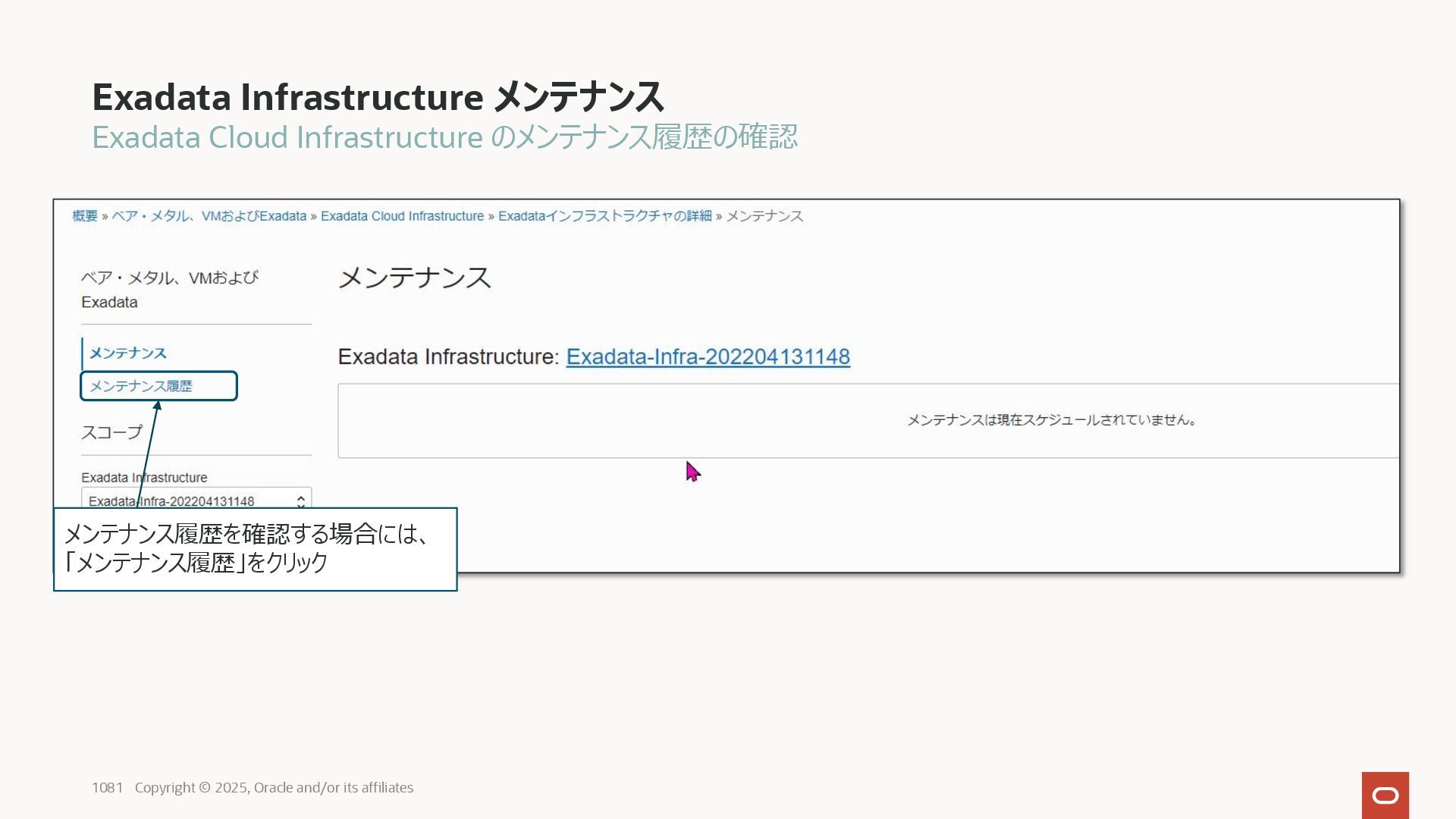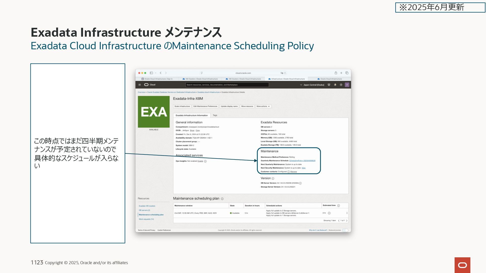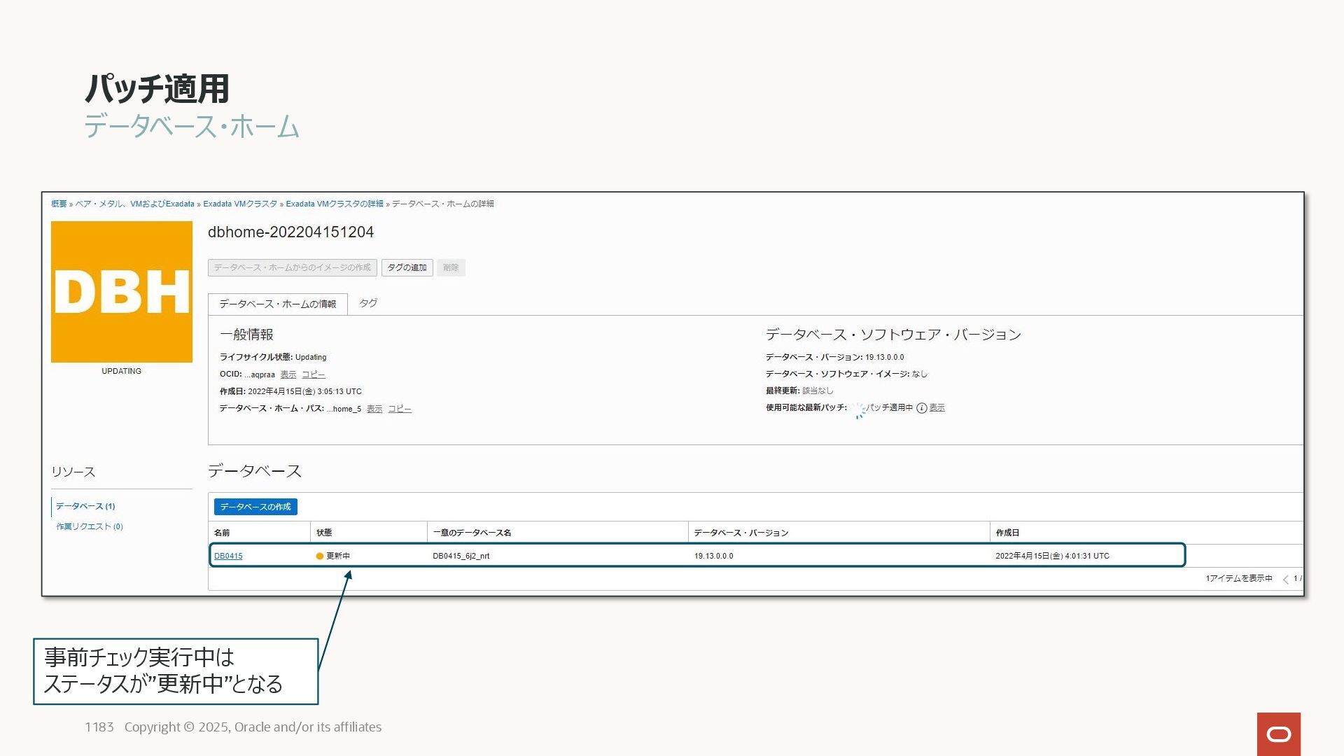 2025-04-03T01:31:51.131744+00:00 SQL> ALTER DISKGROUP DATAC2 DROP DISK 'DATAC2_CD_00_kix101117exdcl10', 'DATAC2_CD_01_kix101117exdcl10', 'DATAC2_CD_02_kix101117exdcl10', 'DATAC2_CD_03_kix101117exdcl10', 'DATAC2_CD_04_kix101117exdcl10', 'DATAC2_CD_05_kix101117exdcl10', 'DATAC2_CD_06_kix101117exdcl10', 'DATAC2_CD_07_kix101117exdcl10', 'DATAC2_CD_08_kix101117exdcl10', 'DATAC2_CD_09_kix101117exdcl10', 'DATAC2_CD_10_kix101117exdcl10', 'DATAC2_CD_11_kix101117exdcl10' REBALANCE POWER 4 略 SUCCESS: ALTER DISKGROUP RECOC2 DROP DISK 'RECOC2_CD_00_kix101117exdcl10', 'RECOC2_CD_01_kix101117exdcl10', 'RECOC2_CD_02_kix101117exdcl10', 'RECOC2_CD_03_kix101117exdcl10', 'RECOC2_CD_04_kix101117exdcl10', 'RECOC2_CD_05_kix101117exdcl10', 'RECOC2_CD_06_kix101117exdcl10', 'RECOC2_CD_07_kix101117exdcl10', 'RECOC2_CD_08_kix101117exdcl10', 'RECOC2_CD_09_kix101117exdcl10', 'RECOC2_CD_10_kix101117exdcl10', 'RECOC2_CD_11_kix101117exdcl10' REBALANCE POWER 4 NOTE: Attempting voting file refresh on diskgroup RECOC2 NOTE: Refresh completed on diskgroup RECOC2. No voting file found. 2025-04-03T01:32:19.466977+00:00 Exadata Infrastructure Copyright © 2025, Oracle and/or its affiliates 132 ※2025年4⽉更新