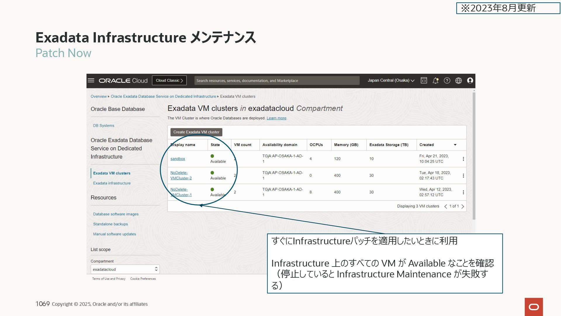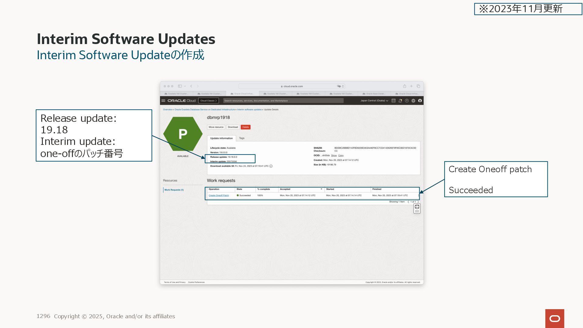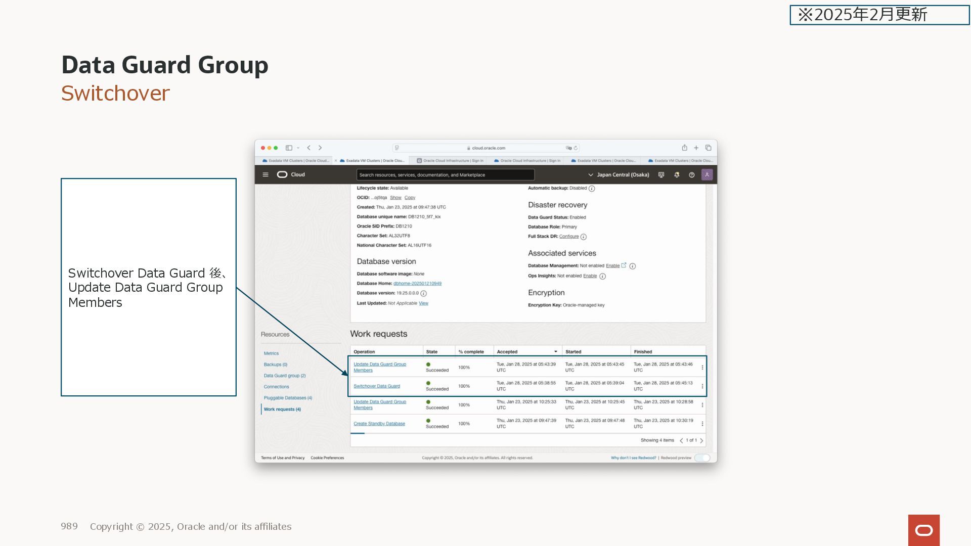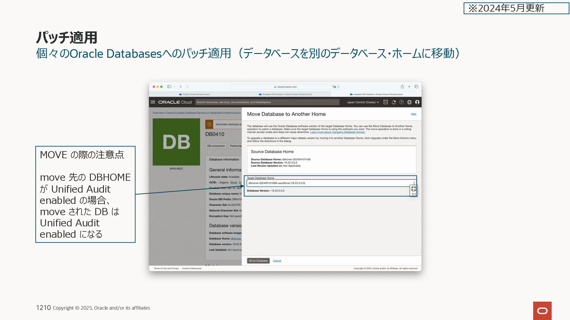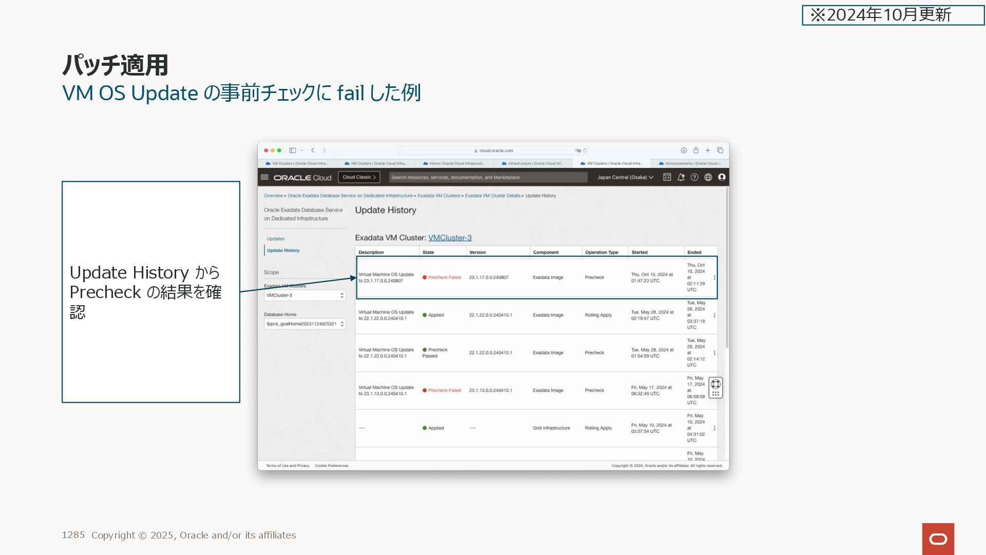 2025-04-03T01:31:51.131744+00:00 SQL> ALTER DISKGROUP DATAC2 DROP DISK 'DATAC2_CD_00_kix101117exdcl10', 'DATAC2_CD_01_kix101117exdcl10', 'DATAC2_CD_02_kix101117exdcl10', 'DATAC2_CD_03_kix101117exdcl10', 'DATAC2_CD_04_kix101117exdcl10', 'DATAC2_CD_05_kix101117exdcl10', 'DATAC2_CD_06_kix101117exdcl10', 'DATAC2_CD_07_kix101117exdcl10', 'DATAC2_CD_08_kix101117exdcl10', 'DATAC2_CD_09_kix101117exdcl10', 'DATAC2_CD_10_kix101117exdcl10', 'DATAC2_CD_11_kix101117exdcl10' REBALANCE POWER 4 略 SUCCESS: ALTER DISKGROUP RECOC2 DROP DISK 'RECOC2_CD_00_kix101117exdcl10', 'RECOC2_CD_01_kix101117exdcl10', 'RECOC2_CD_02_kix101117exdcl10', 'RECOC2_CD_03_kix101117exdcl10', 'RECOC2_CD_04_kix101117exdcl10', 'RECOC2_CD_05_kix101117exdcl10', 'RECOC2_CD_06_kix101117exdcl10', 'RECOC2_CD_07_kix101117exdcl10', 'RECOC2_CD_08_kix101117exdcl10', 'RECOC2_CD_09_kix101117exdcl10', 'RECOC2_CD_10_kix101117exdcl10', 'RECOC2_CD_11_kix101117exdcl10' REBALANCE POWER 4 NOTE: Attempting voting file refresh on diskgroup RECOC2 NOTE: Refresh completed on diskgroup RECOC2. No voting file found. 2025-04-03T01:32:19.466977+00:00 Exadata Infrastructure Copyright © 2025, Oracle and/or its affiliates 132 ※2025年4⽉更新