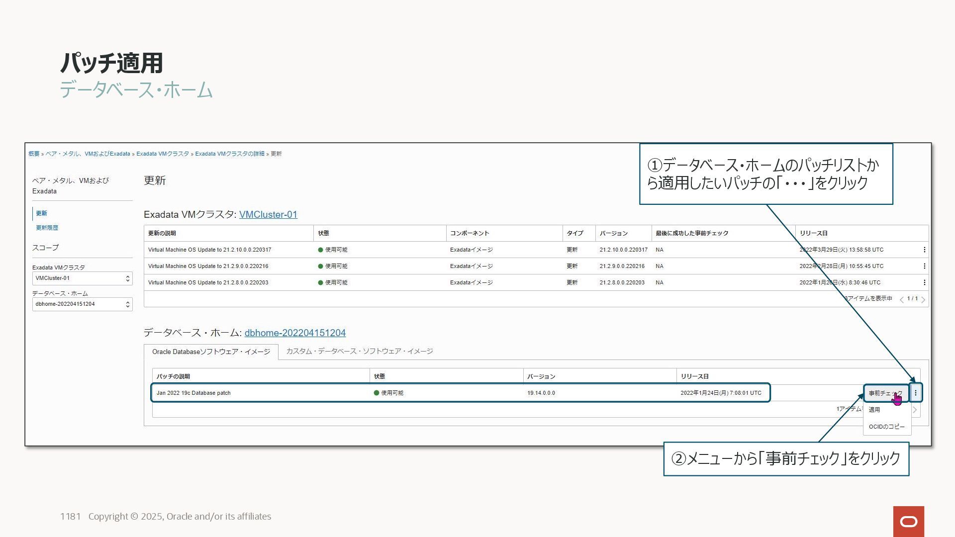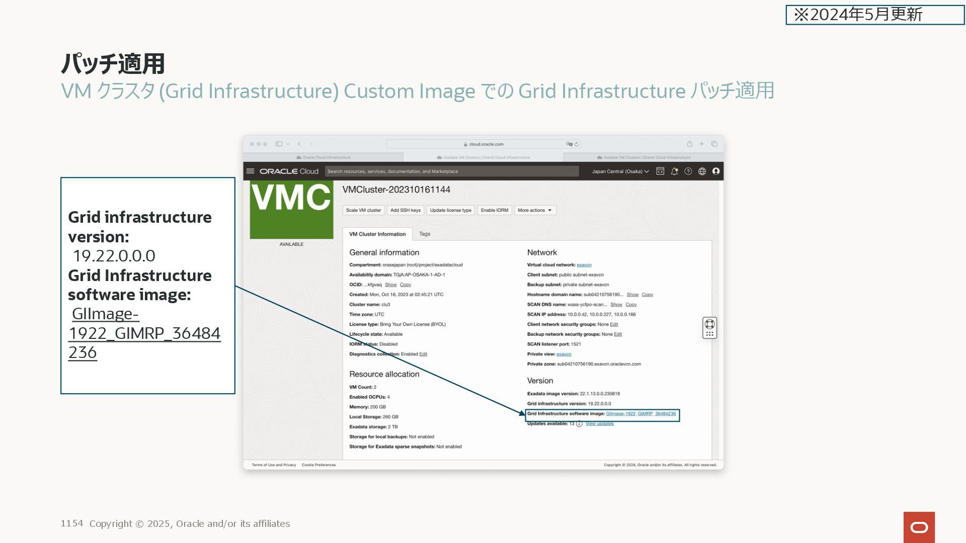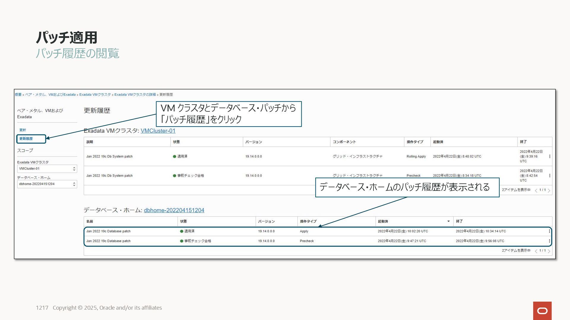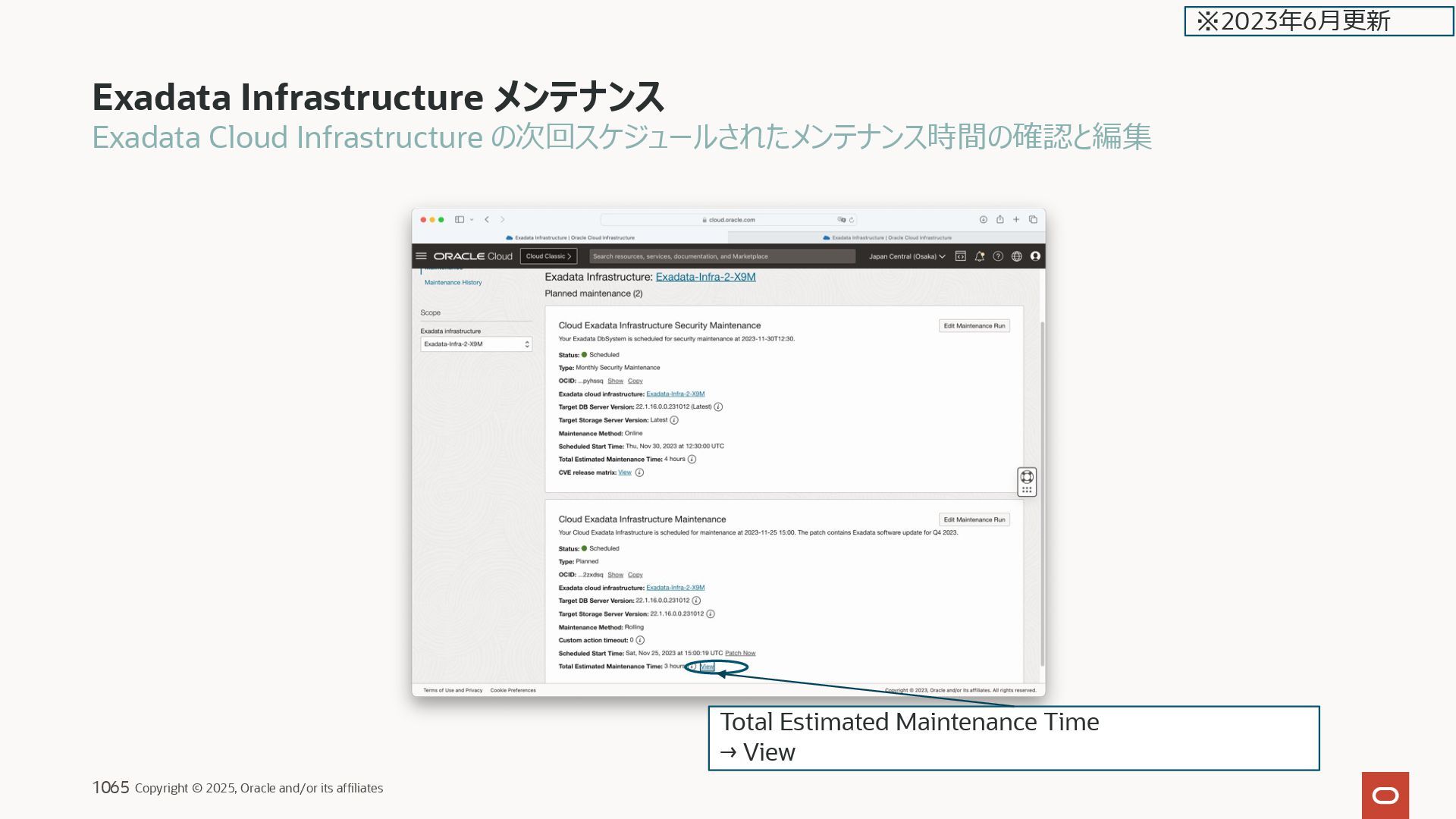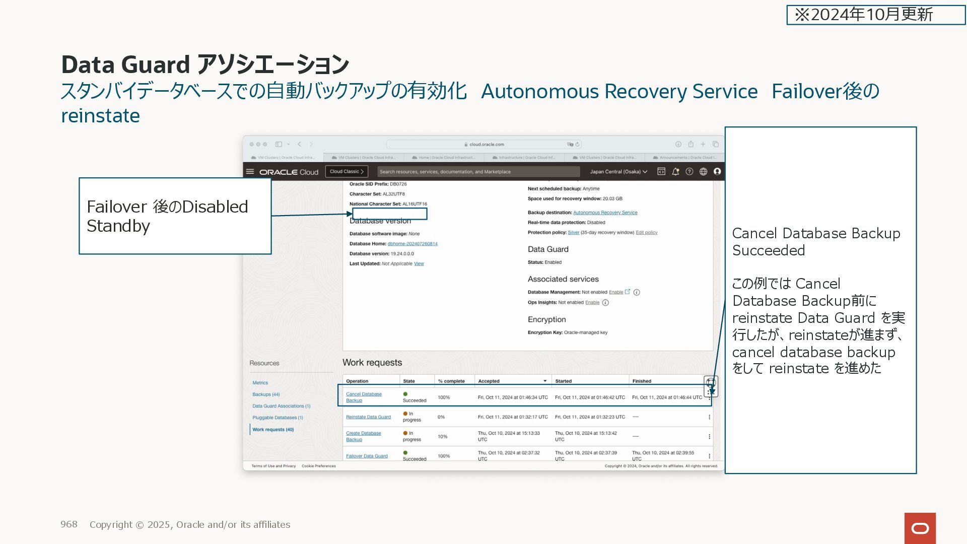 2025-04-03T01:31:51.131744+00:00 SQL> ALTER DISKGROUP DATAC2 DROP DISK 'DATAC2_CD_00_kix101117exdcl10', 'DATAC2_CD_01_kix101117exdcl10', 'DATAC2_CD_02_kix101117exdcl10', 'DATAC2_CD_03_kix101117exdcl10', 'DATAC2_CD_04_kix101117exdcl10', 'DATAC2_CD_05_kix101117exdcl10', 'DATAC2_CD_06_kix101117exdcl10', 'DATAC2_CD_07_kix101117exdcl10', 'DATAC2_CD_08_kix101117exdcl10', 'DATAC2_CD_09_kix101117exdcl10', 'DATAC2_CD_10_kix101117exdcl10', 'DATAC2_CD_11_kix101117exdcl10' REBALANCE POWER 4 略 SUCCESS: ALTER DISKGROUP RECOC2 DROP DISK 'RECOC2_CD_00_kix101117exdcl10', 'RECOC2_CD_01_kix101117exdcl10', 'RECOC2_CD_02_kix101117exdcl10', 'RECOC2_CD_03_kix101117exdcl10', 'RECOC2_CD_04_kix101117exdcl10', 'RECOC2_CD_05_kix101117exdcl10', 'RECOC2_CD_06_kix101117exdcl10', 'RECOC2_CD_07_kix101117exdcl10', 'RECOC2_CD_08_kix101117exdcl10', 'RECOC2_CD_09_kix101117exdcl10', 'RECOC2_CD_10_kix101117exdcl10', 'RECOC2_CD_11_kix101117exdcl10' REBALANCE POWER 4 NOTE: Attempting voting file refresh on diskgroup RECOC2 NOTE: Refresh completed on diskgroup RECOC2. No voting file found. 2025-04-03T01:32:19.466977+00:00 Exadata Infrastructure Copyright © 2025, Oracle and/or its affiliates 132 ※2025年4⽉更新