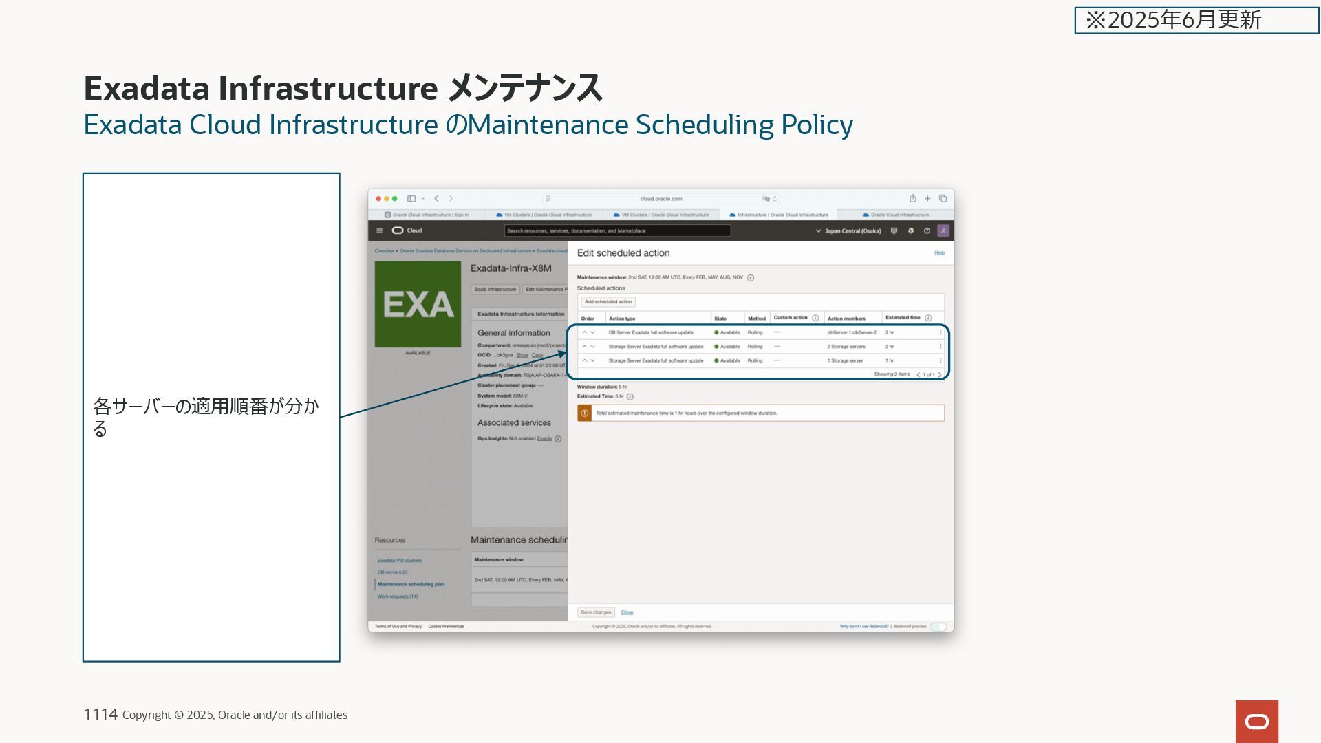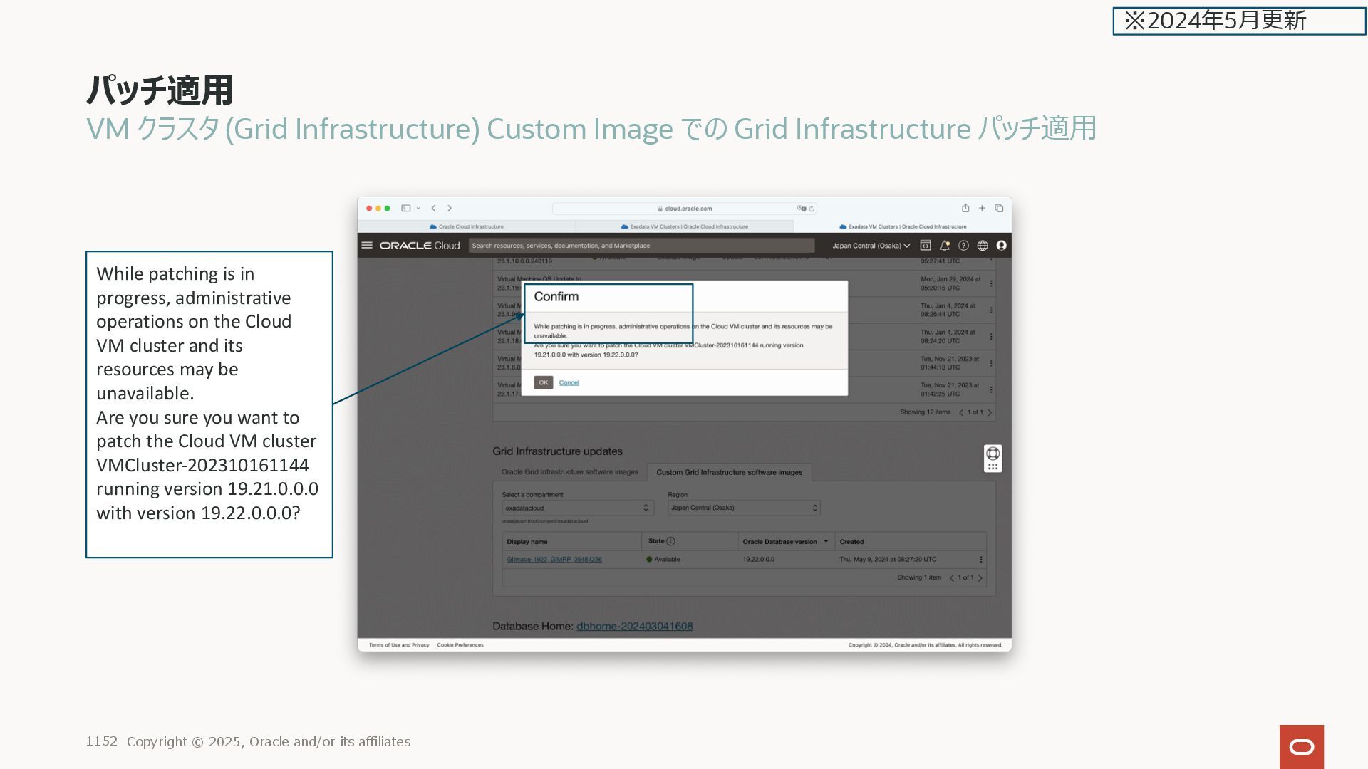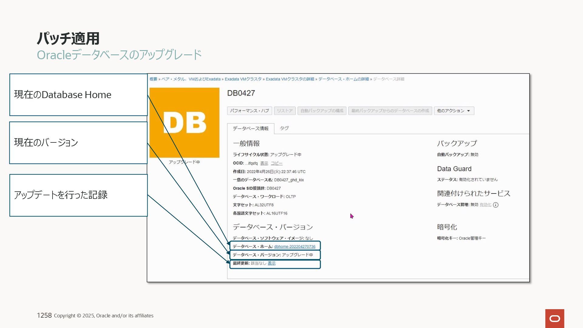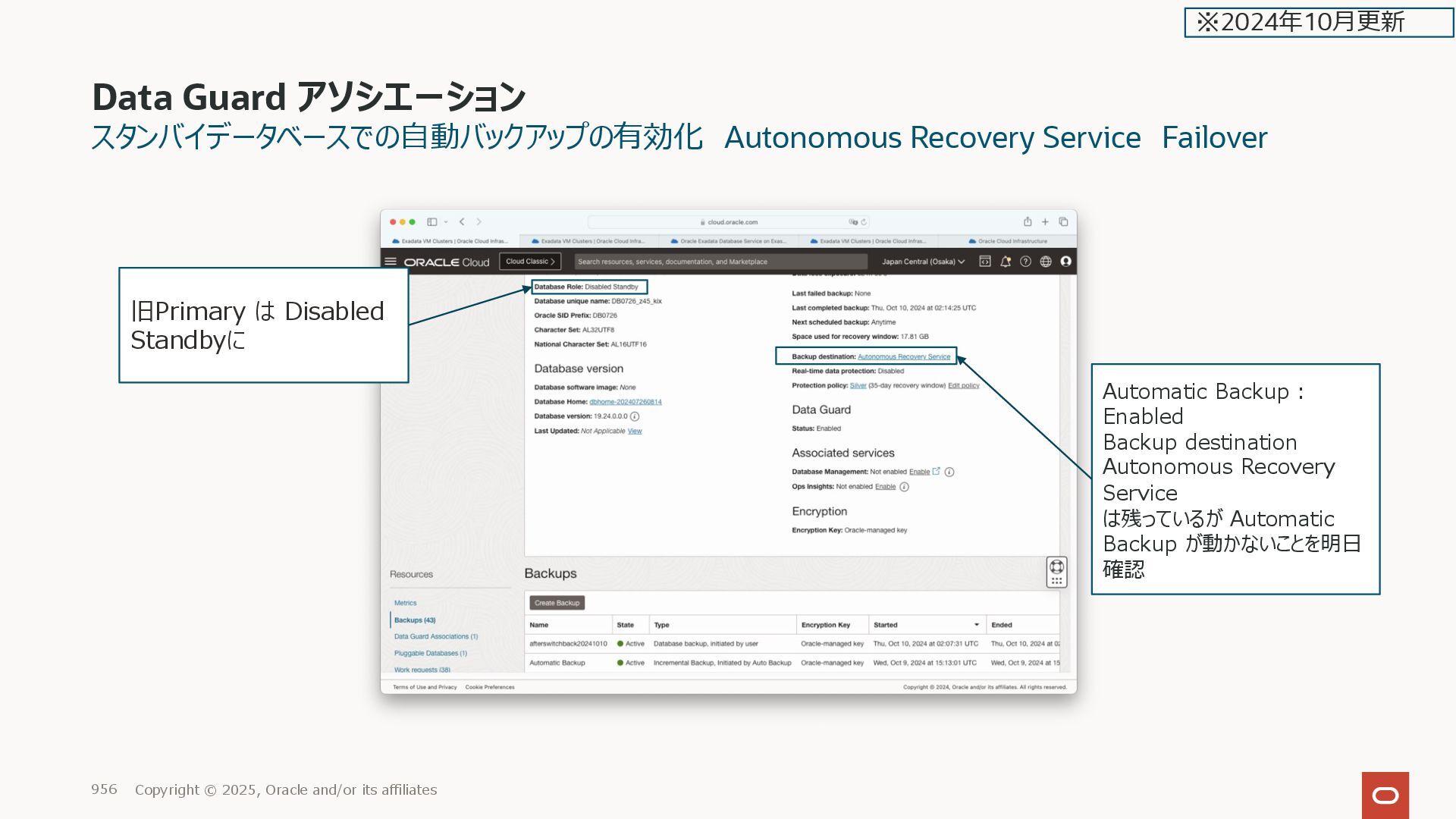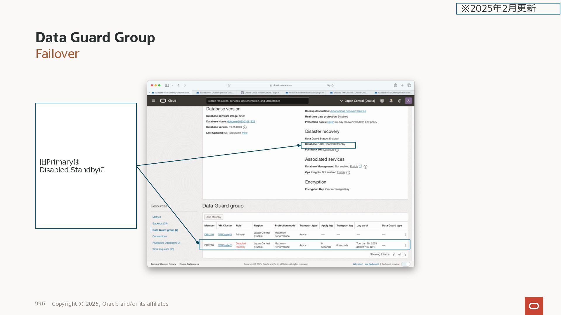 2025-04-03T01:31:51.131744+00:00 SQL> ALTER DISKGROUP DATAC2 DROP DISK 'DATAC2_CD_00_kix101117exdcl10', 'DATAC2_CD_01_kix101117exdcl10', 'DATAC2_CD_02_kix101117exdcl10', 'DATAC2_CD_03_kix101117exdcl10', 'DATAC2_CD_04_kix101117exdcl10', 'DATAC2_CD_05_kix101117exdcl10', 'DATAC2_CD_06_kix101117exdcl10', 'DATAC2_CD_07_kix101117exdcl10', 'DATAC2_CD_08_kix101117exdcl10', 'DATAC2_CD_09_kix101117exdcl10', 'DATAC2_CD_10_kix101117exdcl10', 'DATAC2_CD_11_kix101117exdcl10' REBALANCE POWER 4 略 SUCCESS: ALTER DISKGROUP RECOC2 DROP DISK 'RECOC2_CD_00_kix101117exdcl10', 'RECOC2_CD_01_kix101117exdcl10', 'RECOC2_CD_02_kix101117exdcl10', 'RECOC2_CD_03_kix101117exdcl10', 'RECOC2_CD_04_kix101117exdcl10', 'RECOC2_CD_05_kix101117exdcl10', 'RECOC2_CD_06_kix101117exdcl10', 'RECOC2_CD_07_kix101117exdcl10', 'RECOC2_CD_08_kix101117exdcl10', 'RECOC2_CD_09_kix101117exdcl10', 'RECOC2_CD_10_kix101117exdcl10', 'RECOC2_CD_11_kix101117exdcl10' REBALANCE POWER 4 NOTE: Attempting voting file refresh on diskgroup RECOC2 NOTE: Refresh completed on diskgroup RECOC2. No voting file found. 2025-04-03T01:32:19.466977+00:00 Exadata Infrastructure Copyright © 2025, Oracle and/or its affiliates 132 ※2025年4⽉更新