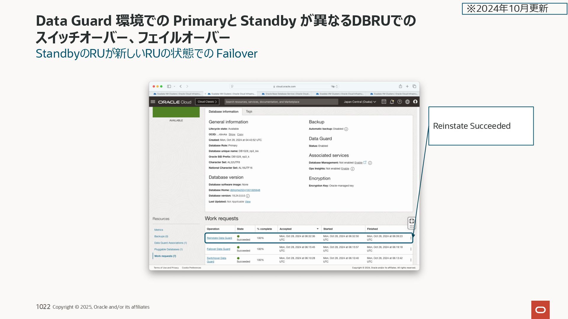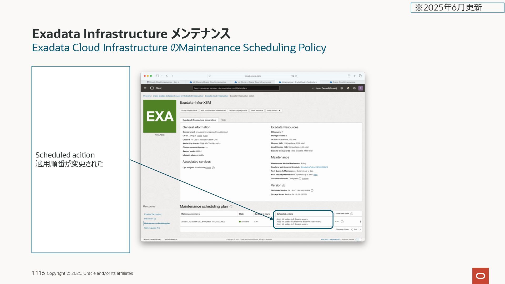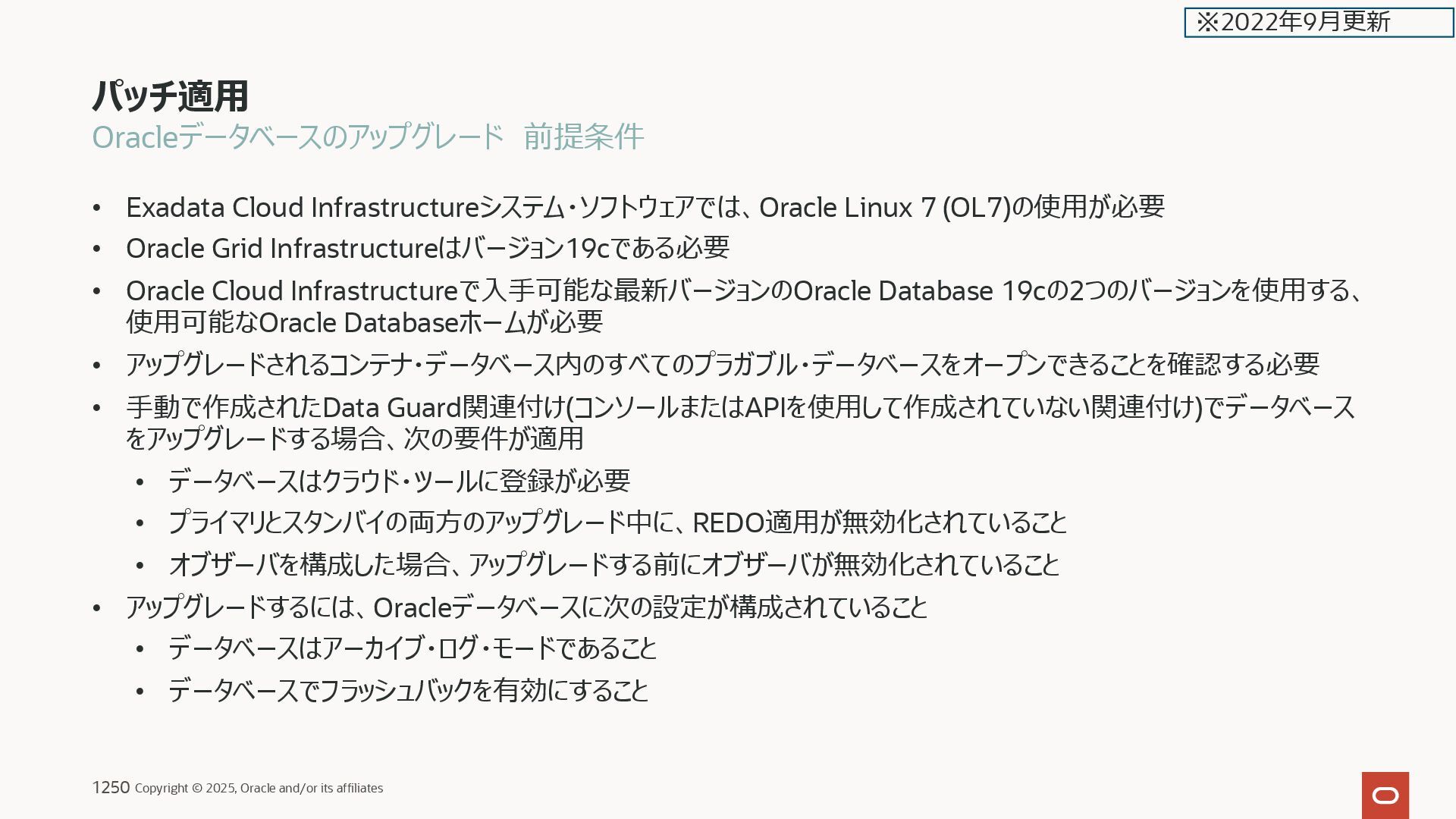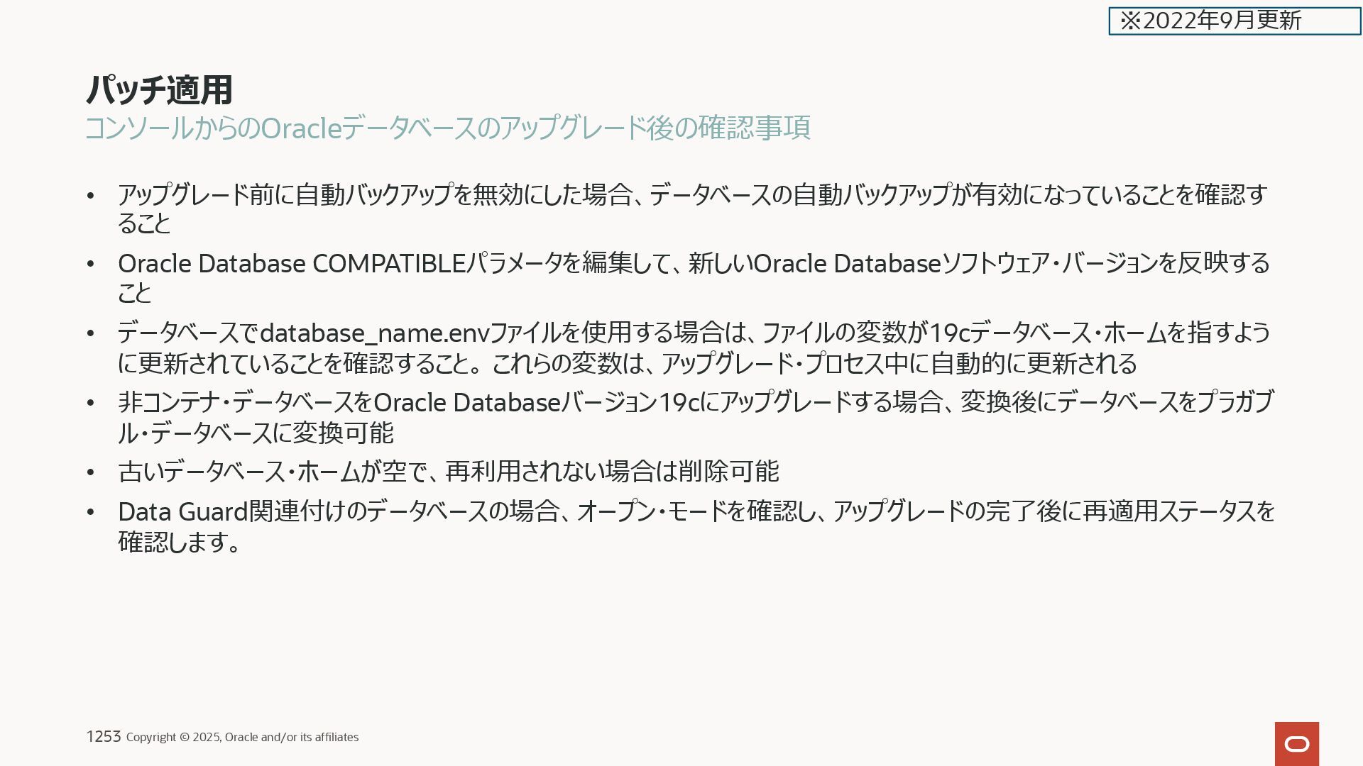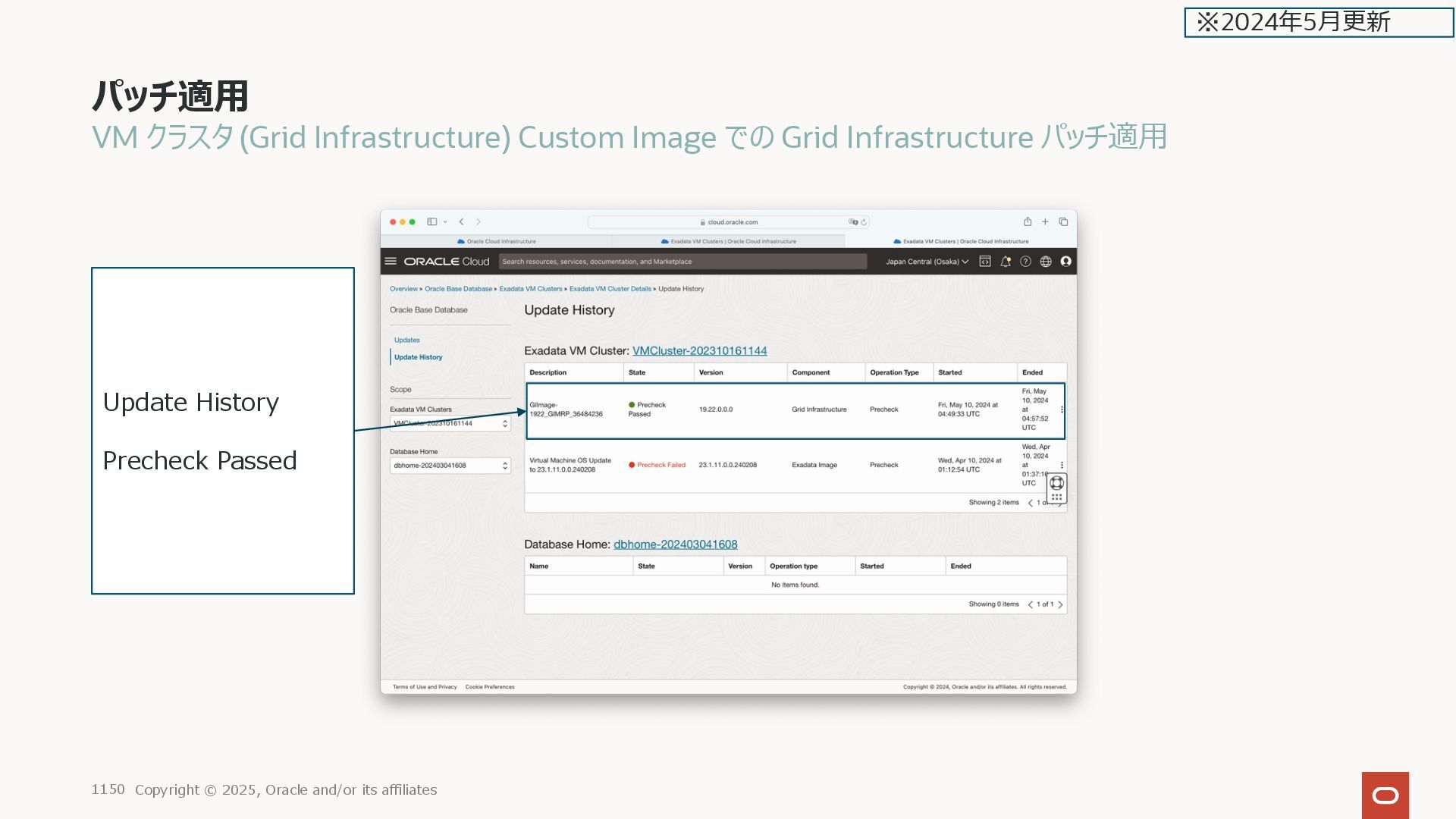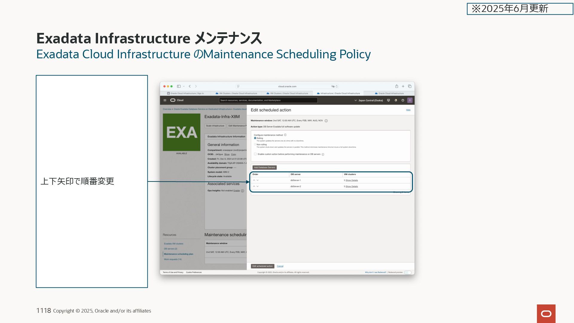 2025-04-03T01:31:51.131744+00:00 SQL> ALTER DISKGROUP DATAC2 DROP DISK 'DATAC2_CD_00_kix101117exdcl10', 'DATAC2_CD_01_kix101117exdcl10', 'DATAC2_CD_02_kix101117exdcl10', 'DATAC2_CD_03_kix101117exdcl10', 'DATAC2_CD_04_kix101117exdcl10', 'DATAC2_CD_05_kix101117exdcl10', 'DATAC2_CD_06_kix101117exdcl10', 'DATAC2_CD_07_kix101117exdcl10', 'DATAC2_CD_08_kix101117exdcl10', 'DATAC2_CD_09_kix101117exdcl10', 'DATAC2_CD_10_kix101117exdcl10', 'DATAC2_CD_11_kix101117exdcl10' REBALANCE POWER 4 略 SUCCESS: ALTER DISKGROUP RECOC2 DROP DISK 'RECOC2_CD_00_kix101117exdcl10', 'RECOC2_CD_01_kix101117exdcl10', 'RECOC2_CD_02_kix101117exdcl10', 'RECOC2_CD_03_kix101117exdcl10', 'RECOC2_CD_04_kix101117exdcl10', 'RECOC2_CD_05_kix101117exdcl10', 'RECOC2_CD_06_kix101117exdcl10', 'RECOC2_CD_07_kix101117exdcl10', 'RECOC2_CD_08_kix101117exdcl10', 'RECOC2_CD_09_kix101117exdcl10', 'RECOC2_CD_10_kix101117exdcl10', 'RECOC2_CD_11_kix101117exdcl10' REBALANCE POWER 4 NOTE: Attempting voting file refresh on diskgroup RECOC2 NOTE: Refresh completed on diskgroup RECOC2. No voting file found. 2025-04-03T01:32:19.466977+00:00 Exadata Infrastructure Copyright © 2025, Oracle and/or its affiliates 132 ※2025年4⽉更新
