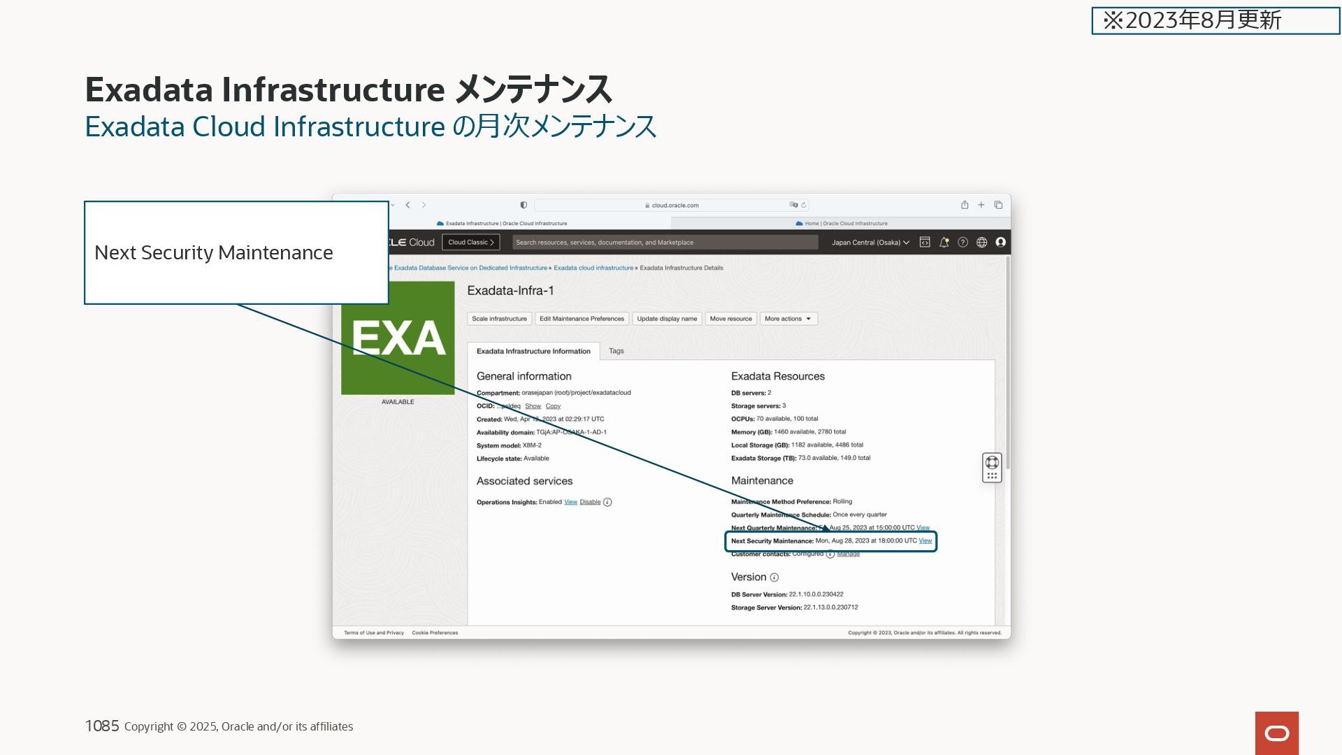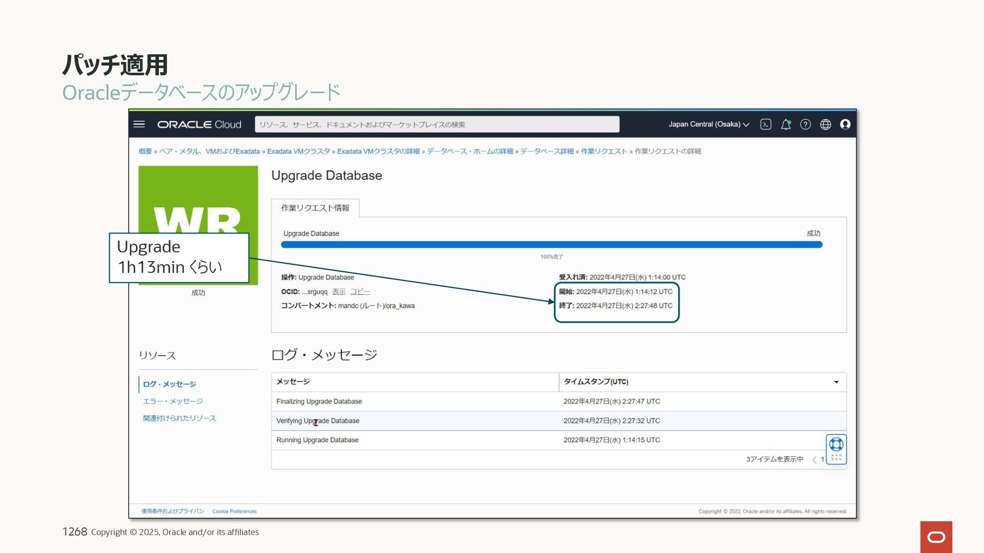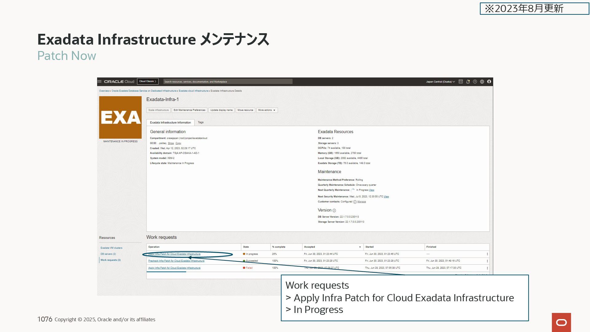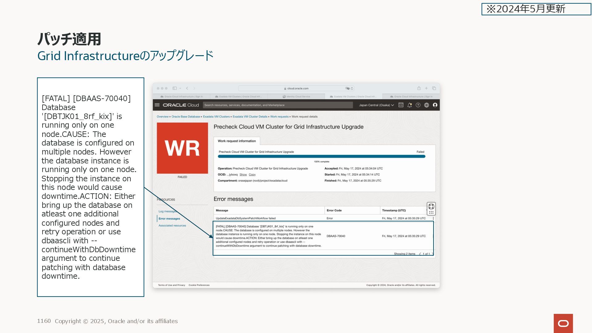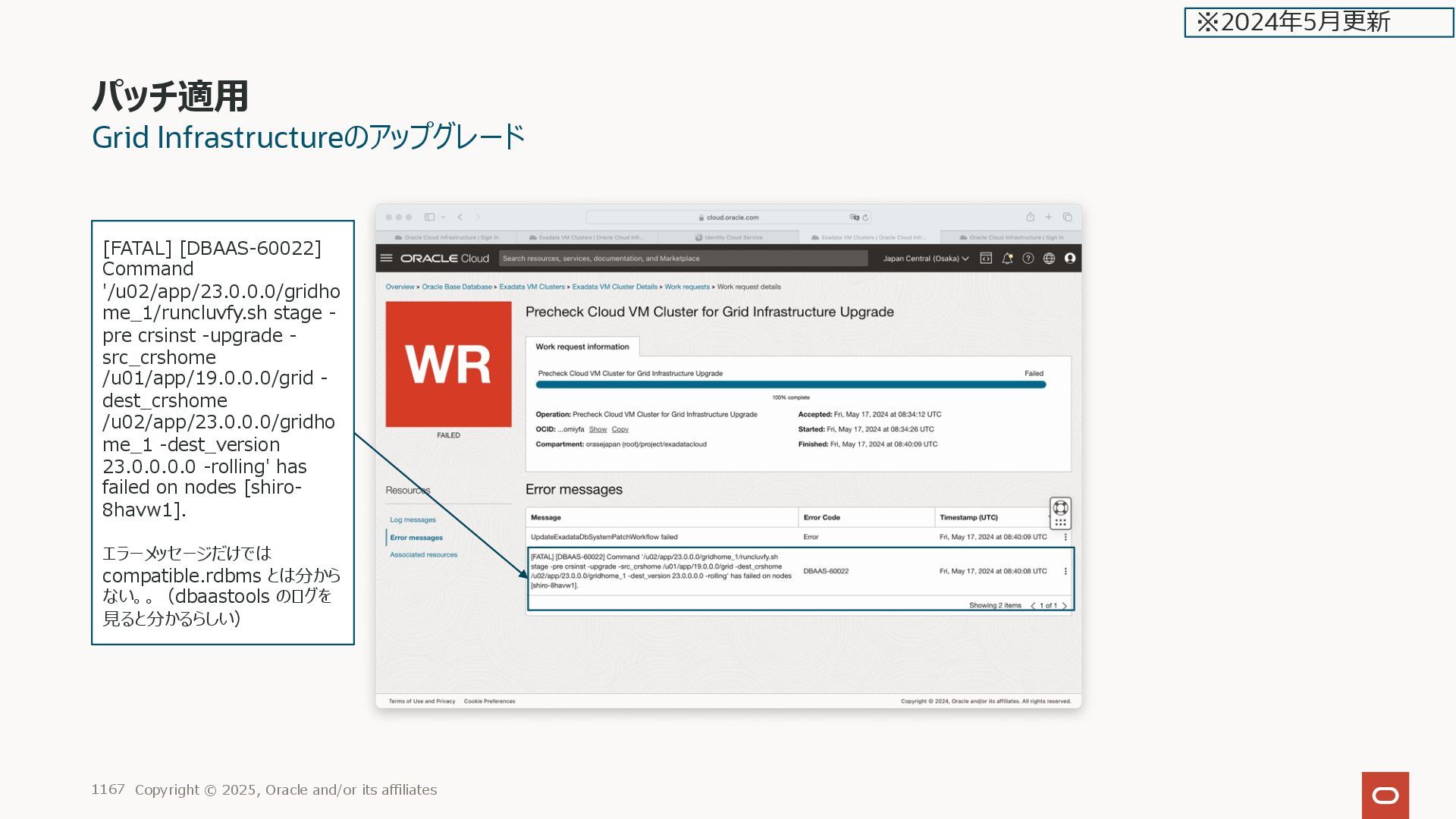 2025-04-03T01:31:51.131744+00:00 SQL> ALTER DISKGROUP DATAC2 DROP DISK 'DATAC2_CD_00_kix101117exdcl10', 'DATAC2_CD_01_kix101117exdcl10', 'DATAC2_CD_02_kix101117exdcl10', 'DATAC2_CD_03_kix101117exdcl10', 'DATAC2_CD_04_kix101117exdcl10', 'DATAC2_CD_05_kix101117exdcl10', 'DATAC2_CD_06_kix101117exdcl10', 'DATAC2_CD_07_kix101117exdcl10', 'DATAC2_CD_08_kix101117exdcl10', 'DATAC2_CD_09_kix101117exdcl10', 'DATAC2_CD_10_kix101117exdcl10', 'DATAC2_CD_11_kix101117exdcl10' REBALANCE POWER 4 略 SUCCESS: ALTER DISKGROUP RECOC2 DROP DISK 'RECOC2_CD_00_kix101117exdcl10', 'RECOC2_CD_01_kix101117exdcl10', 'RECOC2_CD_02_kix101117exdcl10', 'RECOC2_CD_03_kix101117exdcl10', 'RECOC2_CD_04_kix101117exdcl10', 'RECOC2_CD_05_kix101117exdcl10', 'RECOC2_CD_06_kix101117exdcl10', 'RECOC2_CD_07_kix101117exdcl10', 'RECOC2_CD_08_kix101117exdcl10', 'RECOC2_CD_09_kix101117exdcl10', 'RECOC2_CD_10_kix101117exdcl10', 'RECOC2_CD_11_kix101117exdcl10' REBALANCE POWER 4 NOTE: Attempting voting file refresh on diskgroup RECOC2 NOTE: Refresh completed on diskgroup RECOC2. No voting file found. 2025-04-03T01:32:19.466977+00:00 Exadata Infrastructure Copyright © 2025, Oracle and/or its affiliates 132 ※2025年4⽉更新