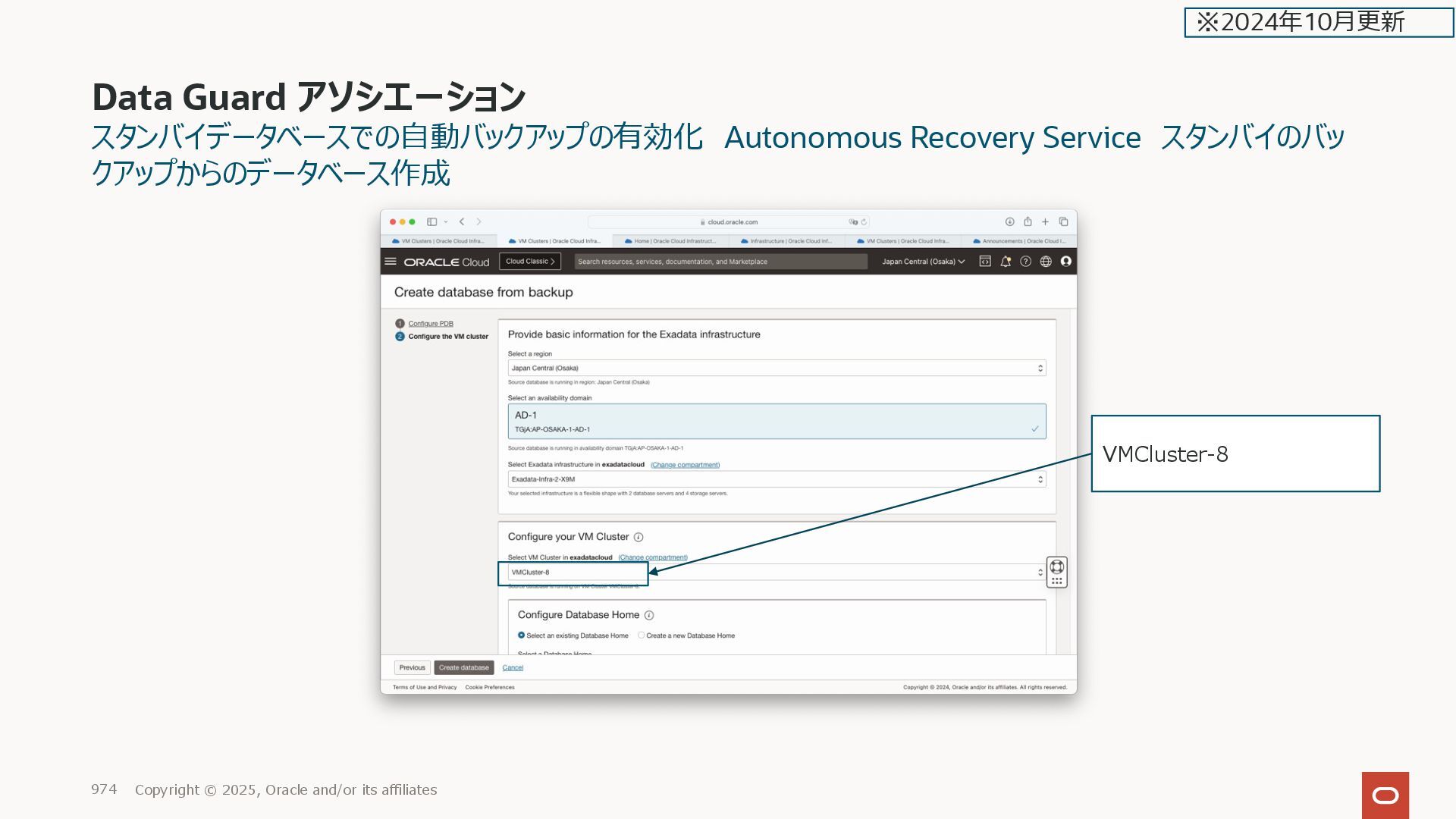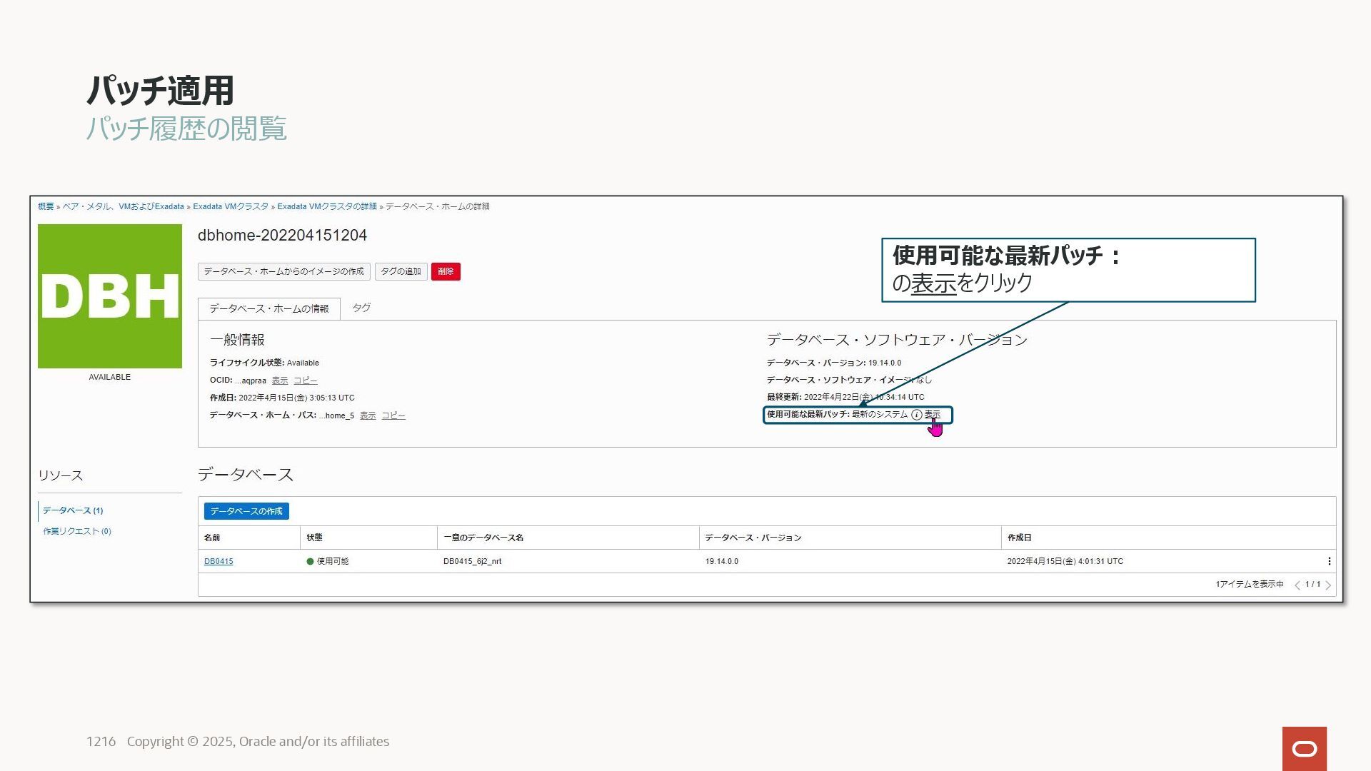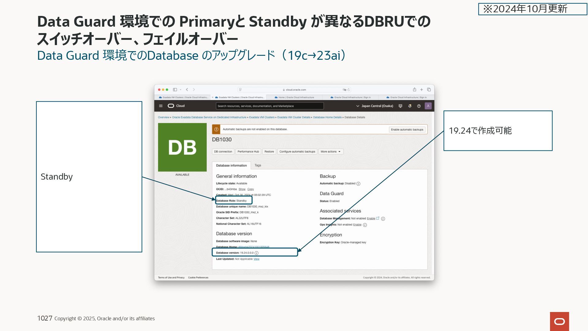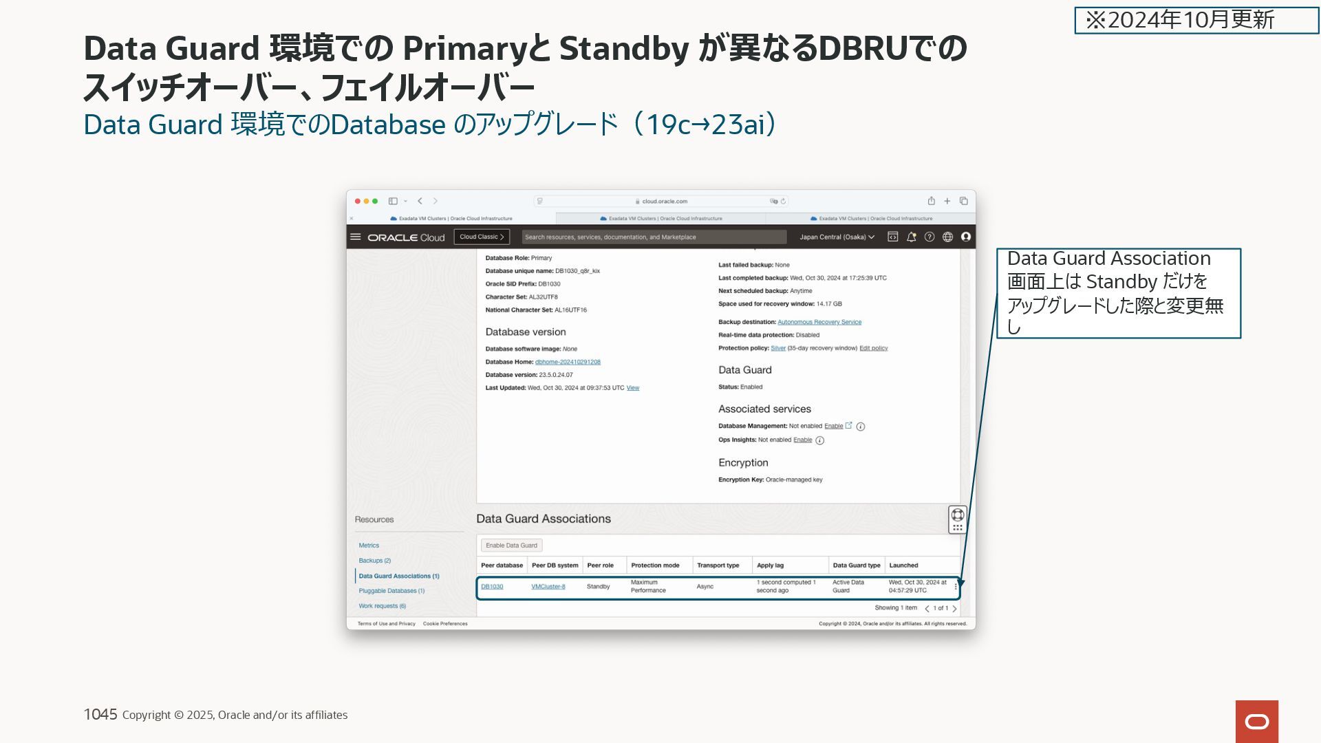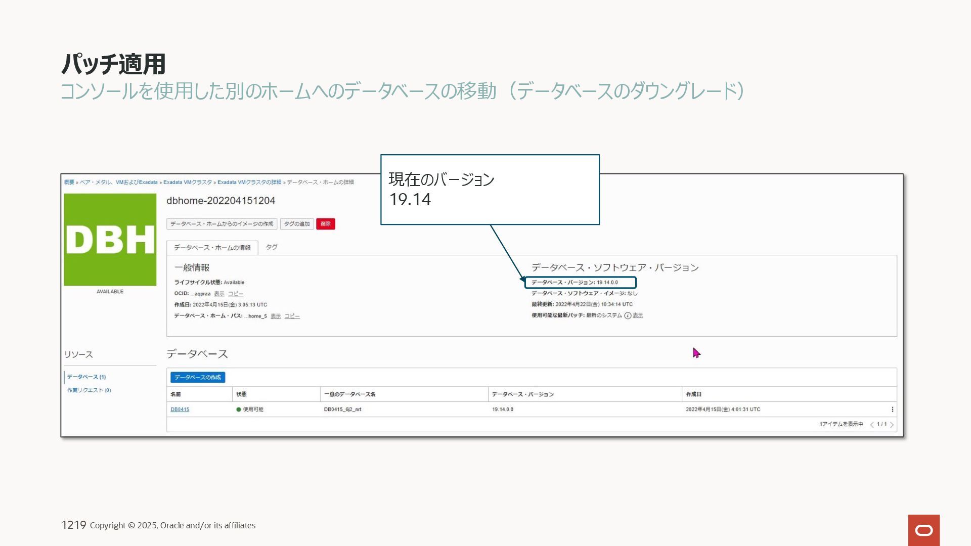 2025-04-03T01:31:51.131744+00:00 SQL> ALTER DISKGROUP DATAC2 DROP DISK 'DATAC2_CD_00_kix101117exdcl10', 'DATAC2_CD_01_kix101117exdcl10', 'DATAC2_CD_02_kix101117exdcl10', 'DATAC2_CD_03_kix101117exdcl10', 'DATAC2_CD_04_kix101117exdcl10', 'DATAC2_CD_05_kix101117exdcl10', 'DATAC2_CD_06_kix101117exdcl10', 'DATAC2_CD_07_kix101117exdcl10', 'DATAC2_CD_08_kix101117exdcl10', 'DATAC2_CD_09_kix101117exdcl10', 'DATAC2_CD_10_kix101117exdcl10', 'DATAC2_CD_11_kix101117exdcl10' REBALANCE POWER 4 略 SUCCESS: ALTER DISKGROUP RECOC2 DROP DISK 'RECOC2_CD_00_kix101117exdcl10', 'RECOC2_CD_01_kix101117exdcl10', 'RECOC2_CD_02_kix101117exdcl10', 'RECOC2_CD_03_kix101117exdcl10', 'RECOC2_CD_04_kix101117exdcl10', 'RECOC2_CD_05_kix101117exdcl10', 'RECOC2_CD_06_kix101117exdcl10', 'RECOC2_CD_07_kix101117exdcl10', 'RECOC2_CD_08_kix101117exdcl10', 'RECOC2_CD_09_kix101117exdcl10', 'RECOC2_CD_10_kix101117exdcl10', 'RECOC2_CD_11_kix101117exdcl10' REBALANCE POWER 4 NOTE: Attempting voting file refresh on diskgroup RECOC2 NOTE: Refresh completed on diskgroup RECOC2. No voting file found. 2025-04-03T01:32:19.466977+00:00 Exadata Infrastructure Copyright © 2025, Oracle and/or its affiliates 132 ※2025年4⽉更新