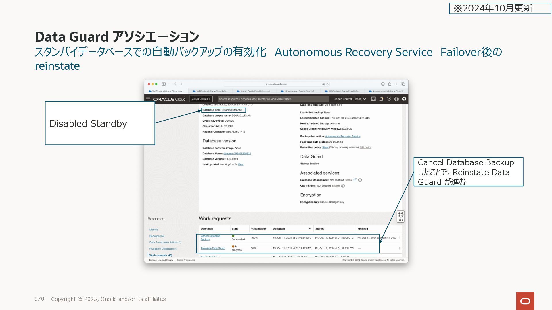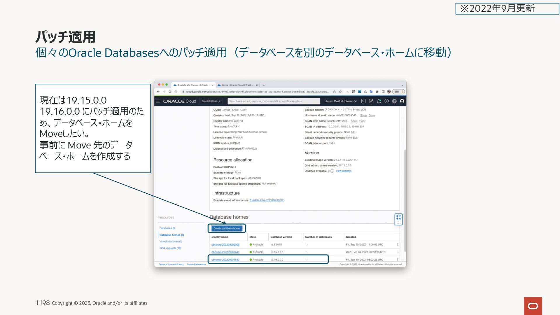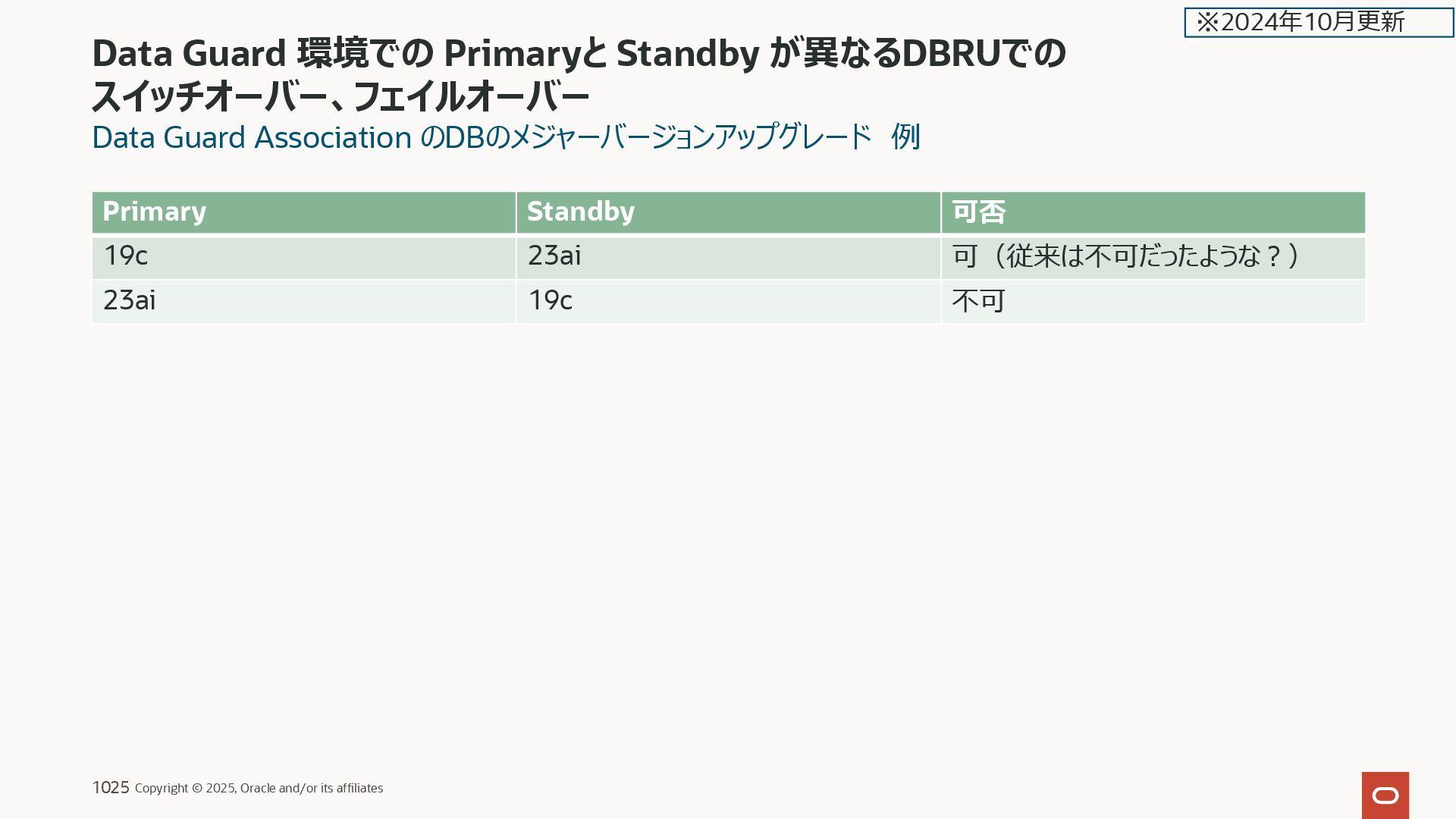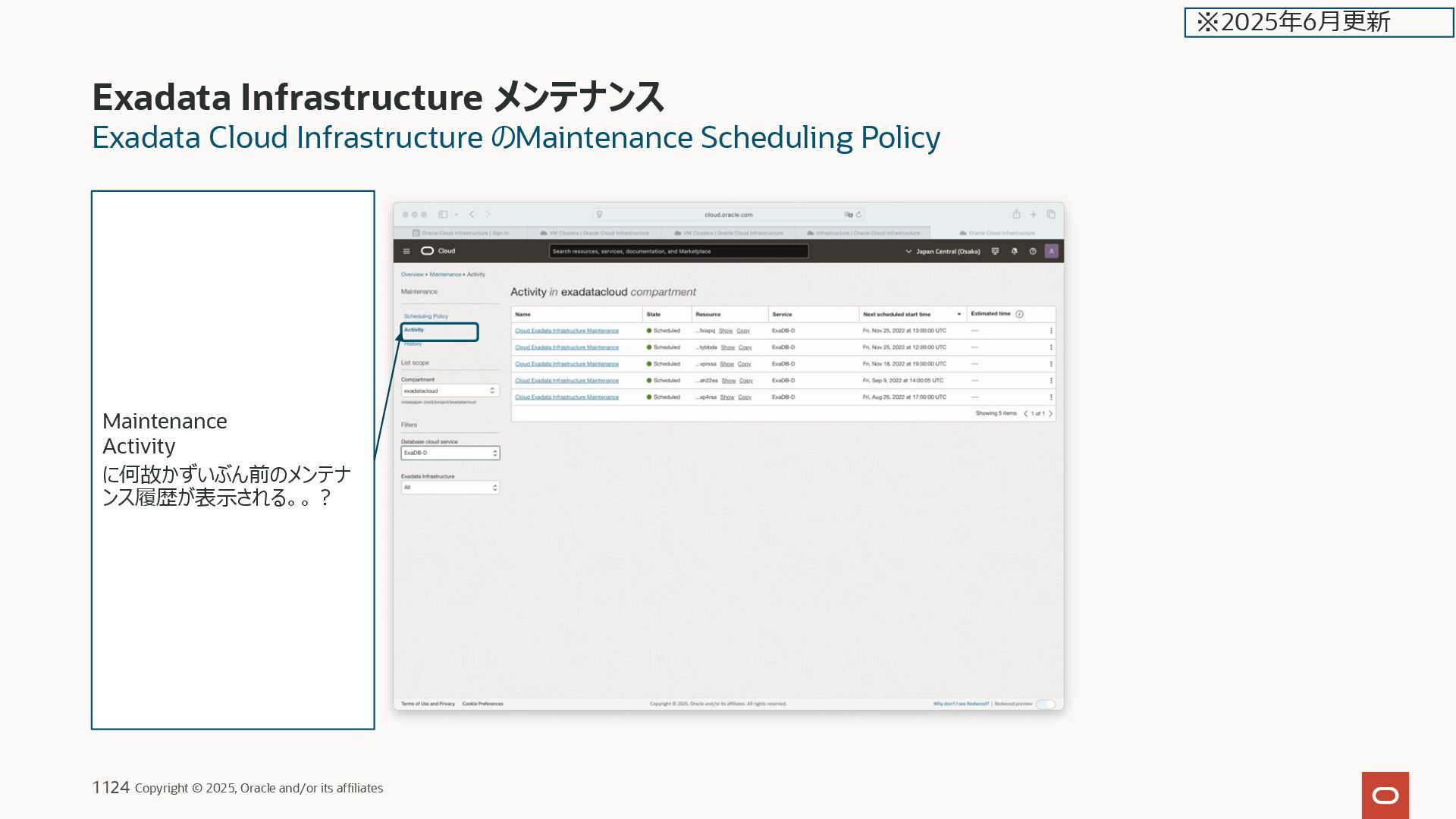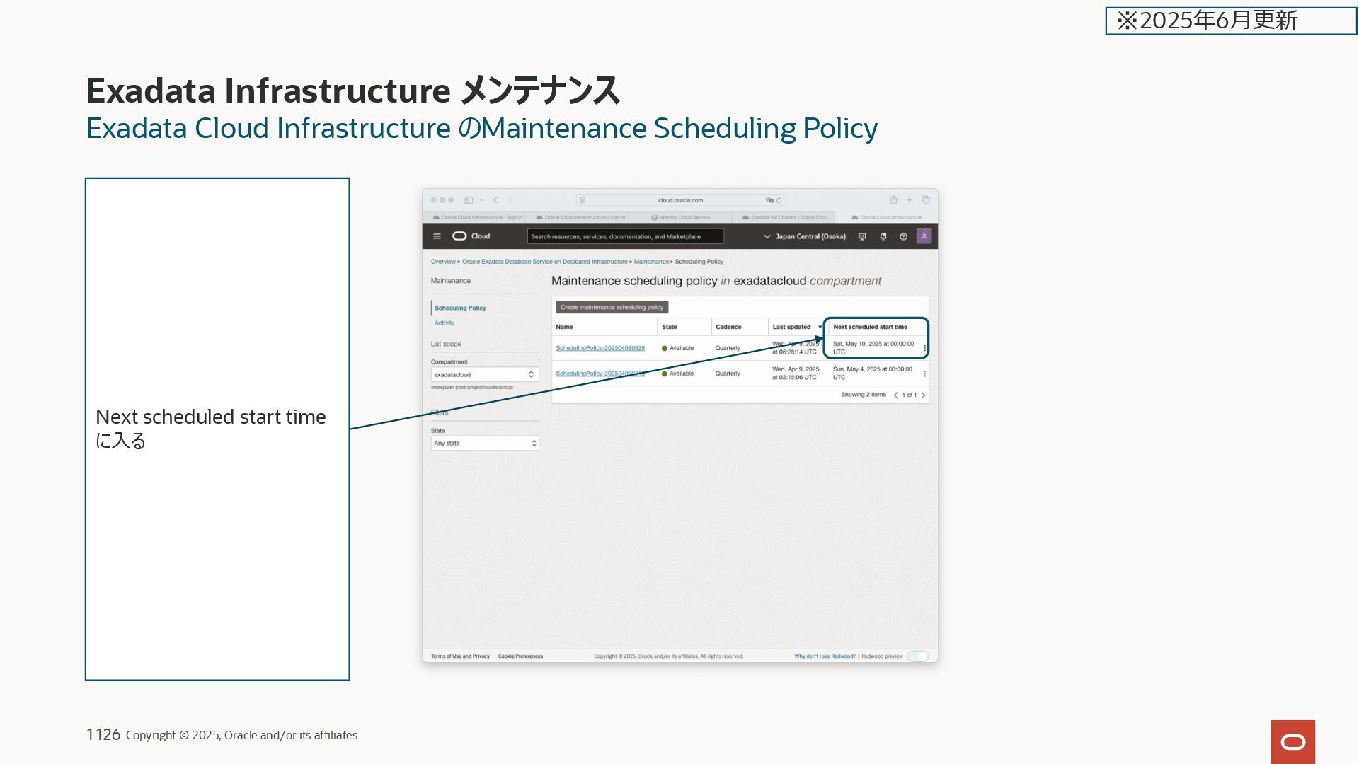 2025-04-03T01:31:51.131744+00:00 SQL> ALTER DISKGROUP DATAC2 DROP DISK 'DATAC2_CD_00_kix101117exdcl10', 'DATAC2_CD_01_kix101117exdcl10', 'DATAC2_CD_02_kix101117exdcl10', 'DATAC2_CD_03_kix101117exdcl10', 'DATAC2_CD_04_kix101117exdcl10', 'DATAC2_CD_05_kix101117exdcl10', 'DATAC2_CD_06_kix101117exdcl10', 'DATAC2_CD_07_kix101117exdcl10', 'DATAC2_CD_08_kix101117exdcl10', 'DATAC2_CD_09_kix101117exdcl10', 'DATAC2_CD_10_kix101117exdcl10', 'DATAC2_CD_11_kix101117exdcl10' REBALANCE POWER 4 略 SUCCESS: ALTER DISKGROUP RECOC2 DROP DISK 'RECOC2_CD_00_kix101117exdcl10', 'RECOC2_CD_01_kix101117exdcl10', 'RECOC2_CD_02_kix101117exdcl10', 'RECOC2_CD_03_kix101117exdcl10', 'RECOC2_CD_04_kix101117exdcl10', 'RECOC2_CD_05_kix101117exdcl10', 'RECOC2_CD_06_kix101117exdcl10', 'RECOC2_CD_07_kix101117exdcl10', 'RECOC2_CD_08_kix101117exdcl10', 'RECOC2_CD_09_kix101117exdcl10', 'RECOC2_CD_10_kix101117exdcl10', 'RECOC2_CD_11_kix101117exdcl10' REBALANCE POWER 4 NOTE: Attempting voting file refresh on diskgroup RECOC2 NOTE: Refresh completed on diskgroup RECOC2. No voting file found. 2025-04-03T01:32:19.466977+00:00 Exadata Infrastructure Copyright © 2025, Oracle and/or its affiliates 132 ※2025年4⽉更新