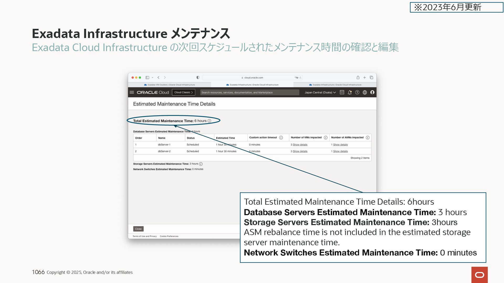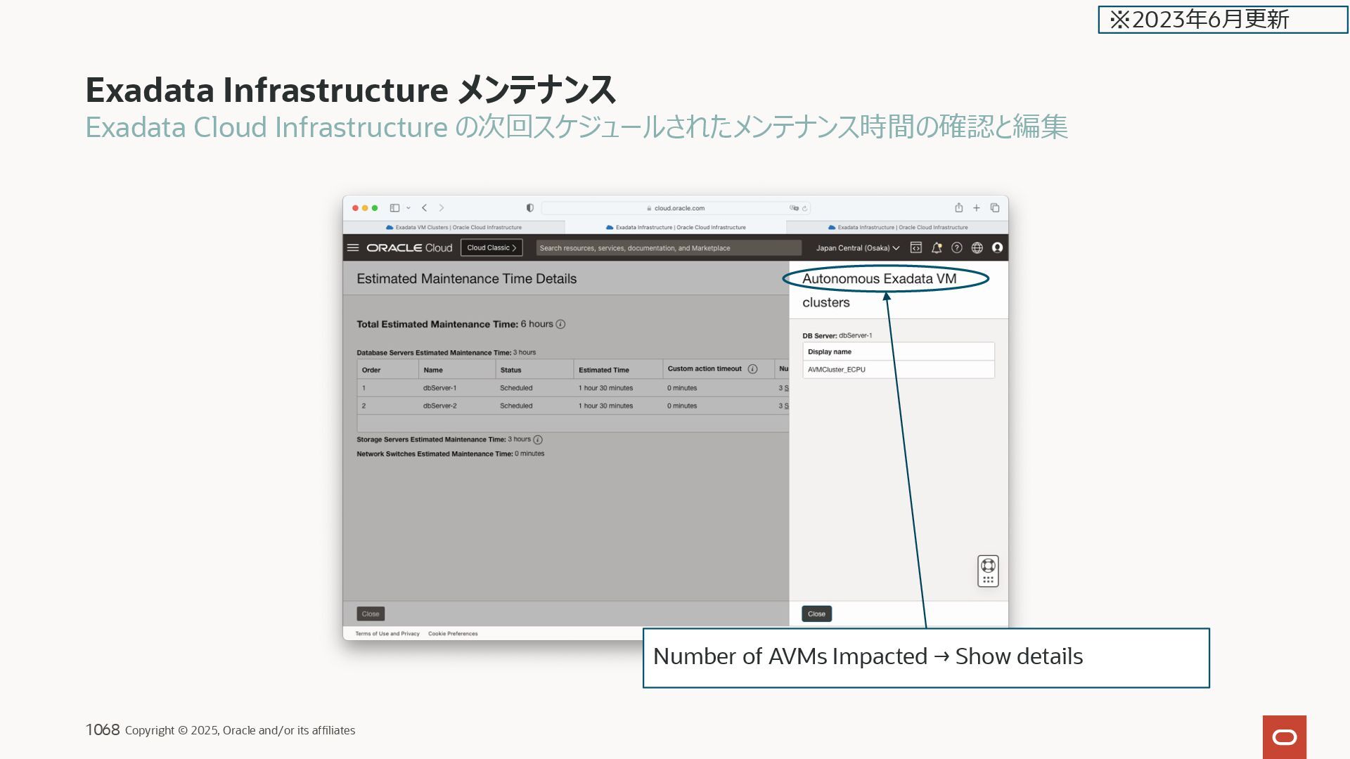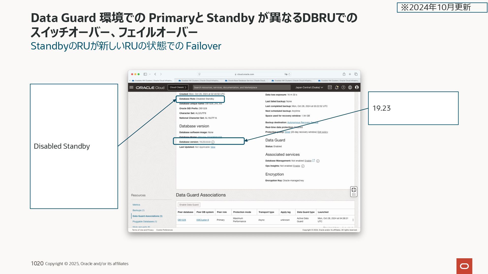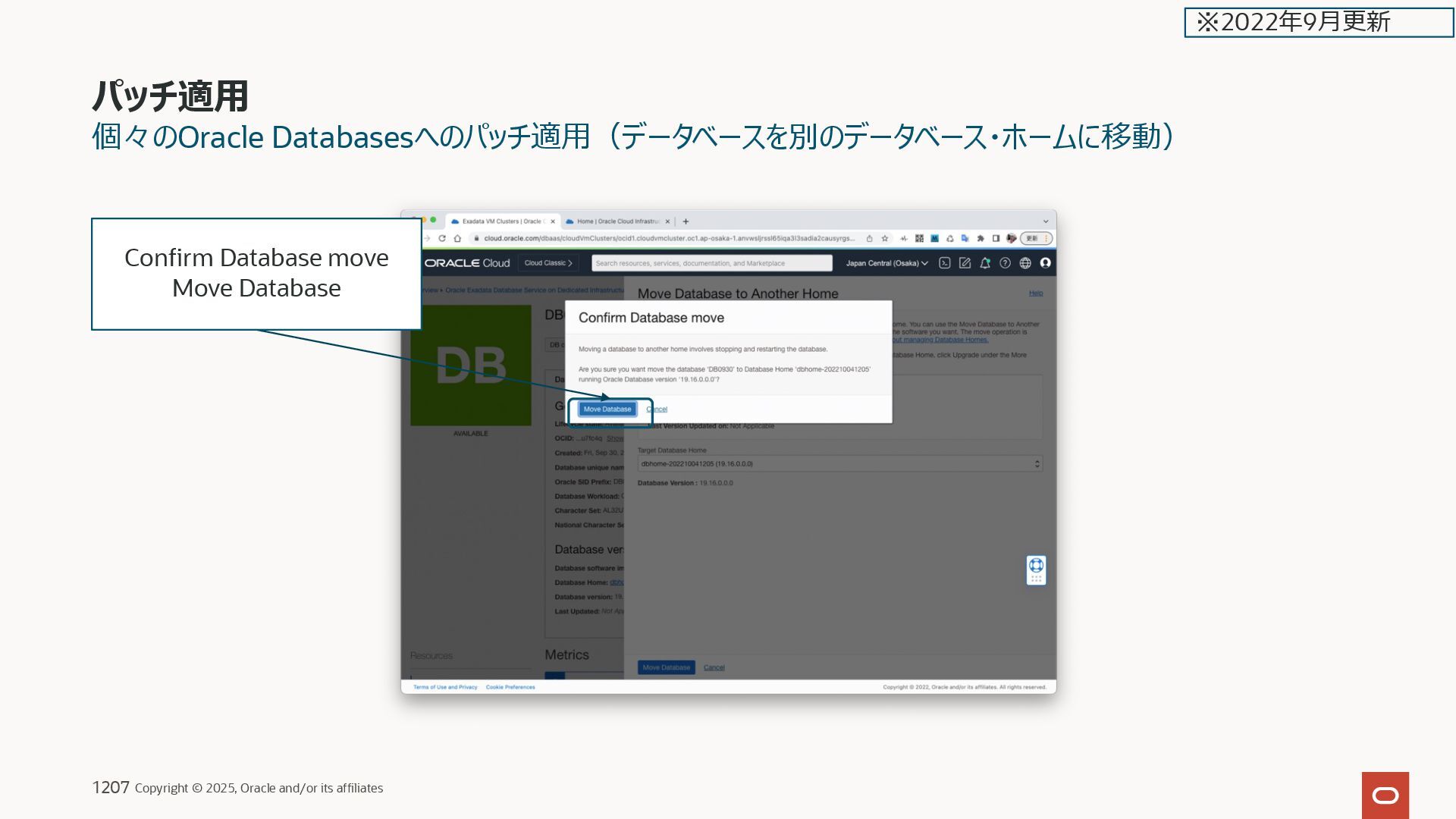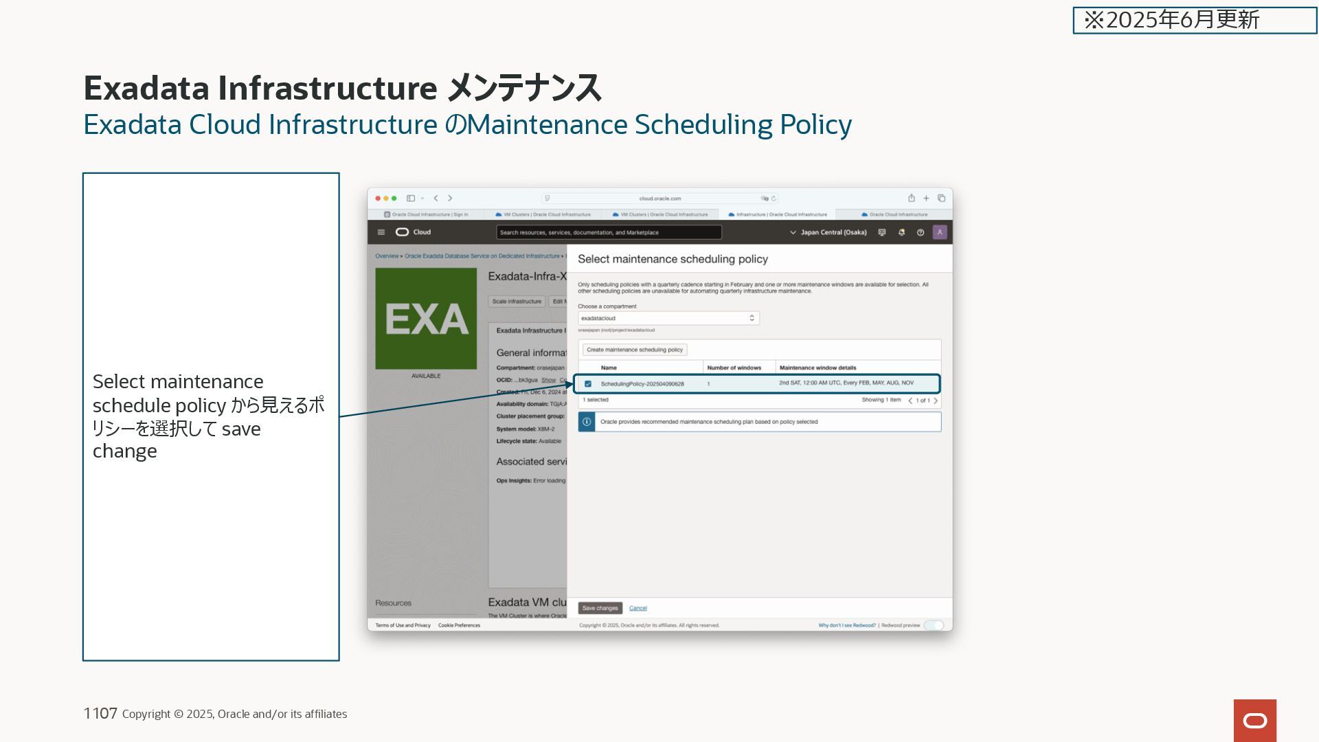 2025-04-03T01:31:51.131744+00:00 SQL> ALTER DISKGROUP DATAC2 DROP DISK 'DATAC2_CD_00_kix101117exdcl10', 'DATAC2_CD_01_kix101117exdcl10', 'DATAC2_CD_02_kix101117exdcl10', 'DATAC2_CD_03_kix101117exdcl10', 'DATAC2_CD_04_kix101117exdcl10', 'DATAC2_CD_05_kix101117exdcl10', 'DATAC2_CD_06_kix101117exdcl10', 'DATAC2_CD_07_kix101117exdcl10', 'DATAC2_CD_08_kix101117exdcl10', 'DATAC2_CD_09_kix101117exdcl10', 'DATAC2_CD_10_kix101117exdcl10', 'DATAC2_CD_11_kix101117exdcl10' REBALANCE POWER 4 略 SUCCESS: ALTER DISKGROUP RECOC2 DROP DISK 'RECOC2_CD_00_kix101117exdcl10', 'RECOC2_CD_01_kix101117exdcl10', 'RECOC2_CD_02_kix101117exdcl10', 'RECOC2_CD_03_kix101117exdcl10', 'RECOC2_CD_04_kix101117exdcl10', 'RECOC2_CD_05_kix101117exdcl10', 'RECOC2_CD_06_kix101117exdcl10', 'RECOC2_CD_07_kix101117exdcl10', 'RECOC2_CD_08_kix101117exdcl10', 'RECOC2_CD_09_kix101117exdcl10', 'RECOC2_CD_10_kix101117exdcl10', 'RECOC2_CD_11_kix101117exdcl10' REBALANCE POWER 4 NOTE: Attempting voting file refresh on diskgroup RECOC2 NOTE: Refresh completed on diskgroup RECOC2. No voting file found. 2025-04-03T01:32:19.466977+00:00 Exadata Infrastructure Copyright © 2025, Oracle and/or its affiliates 132 ※2025年4⽉更新