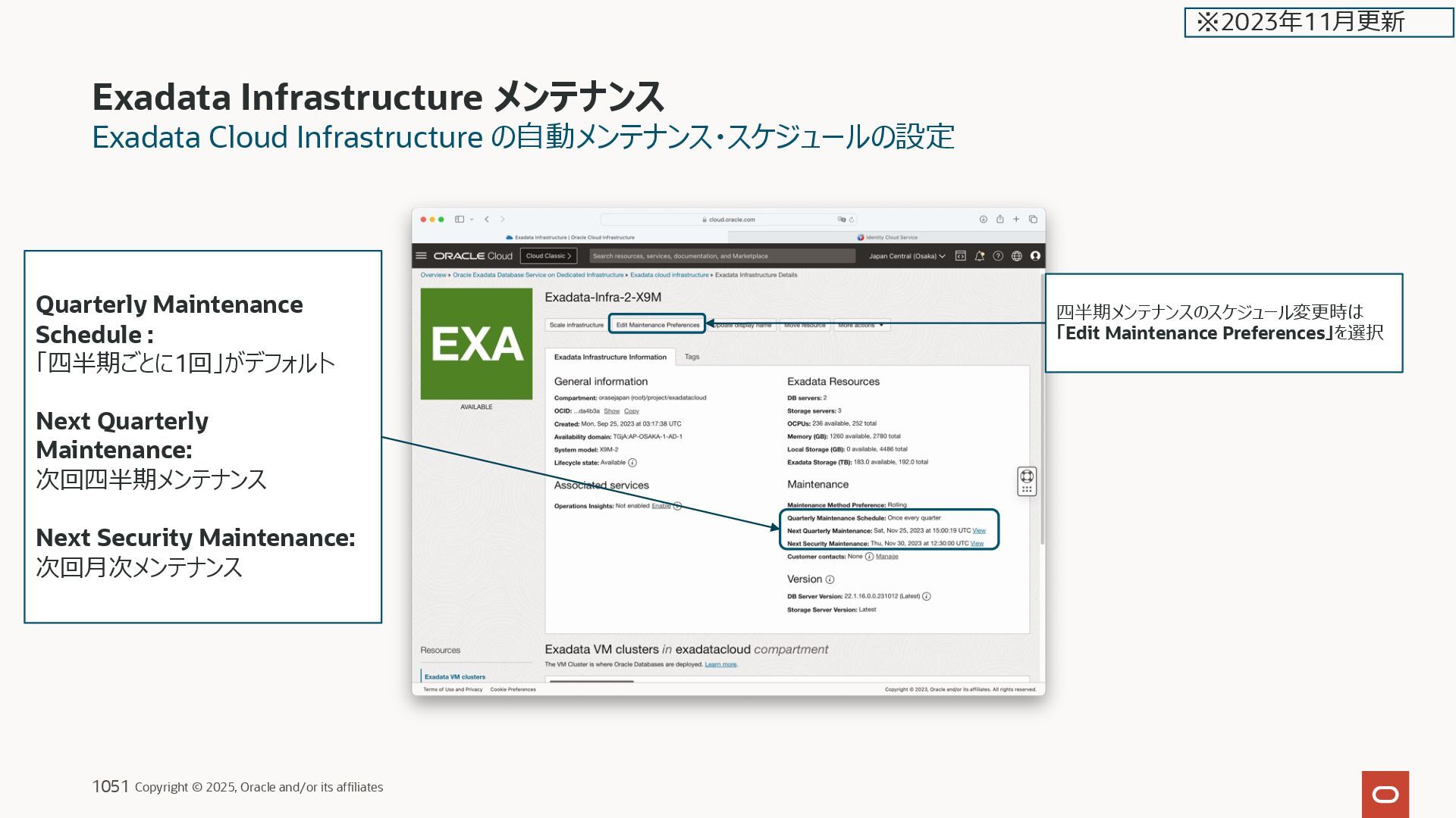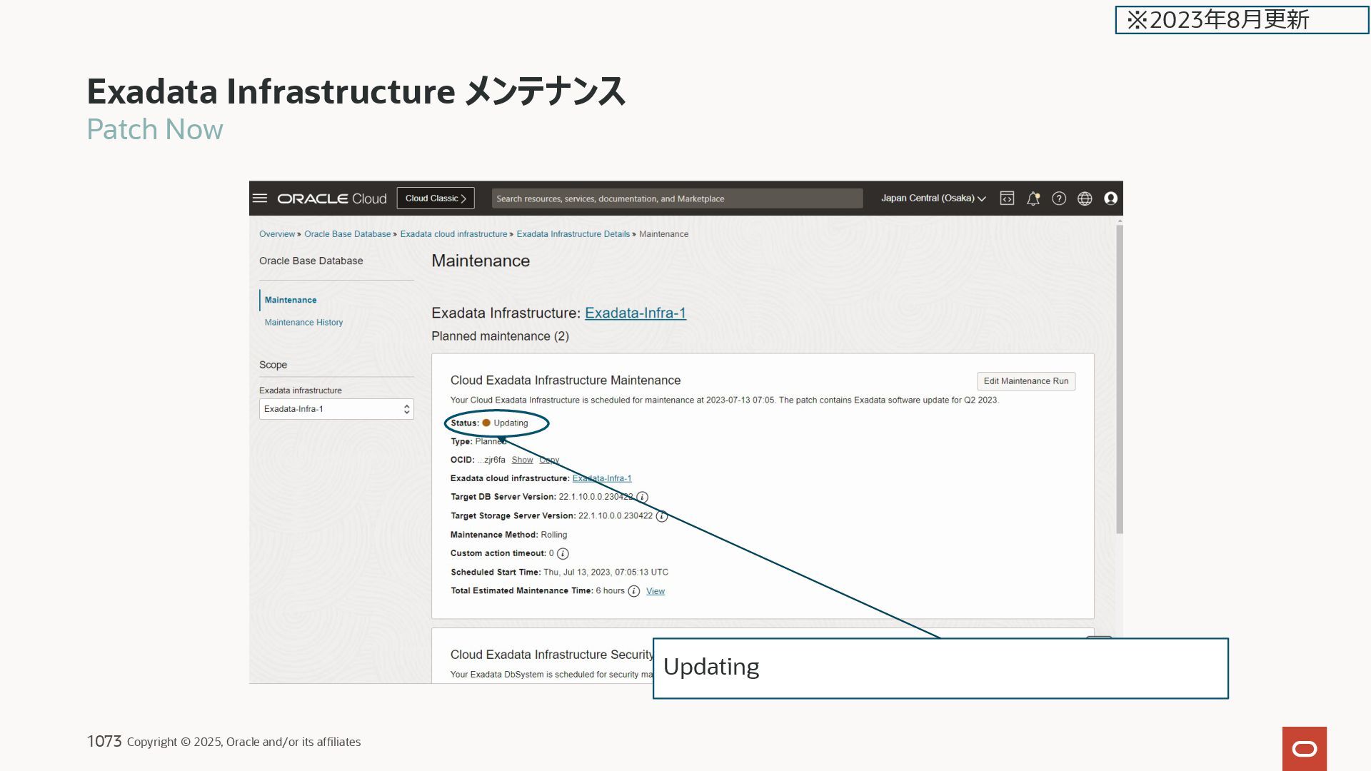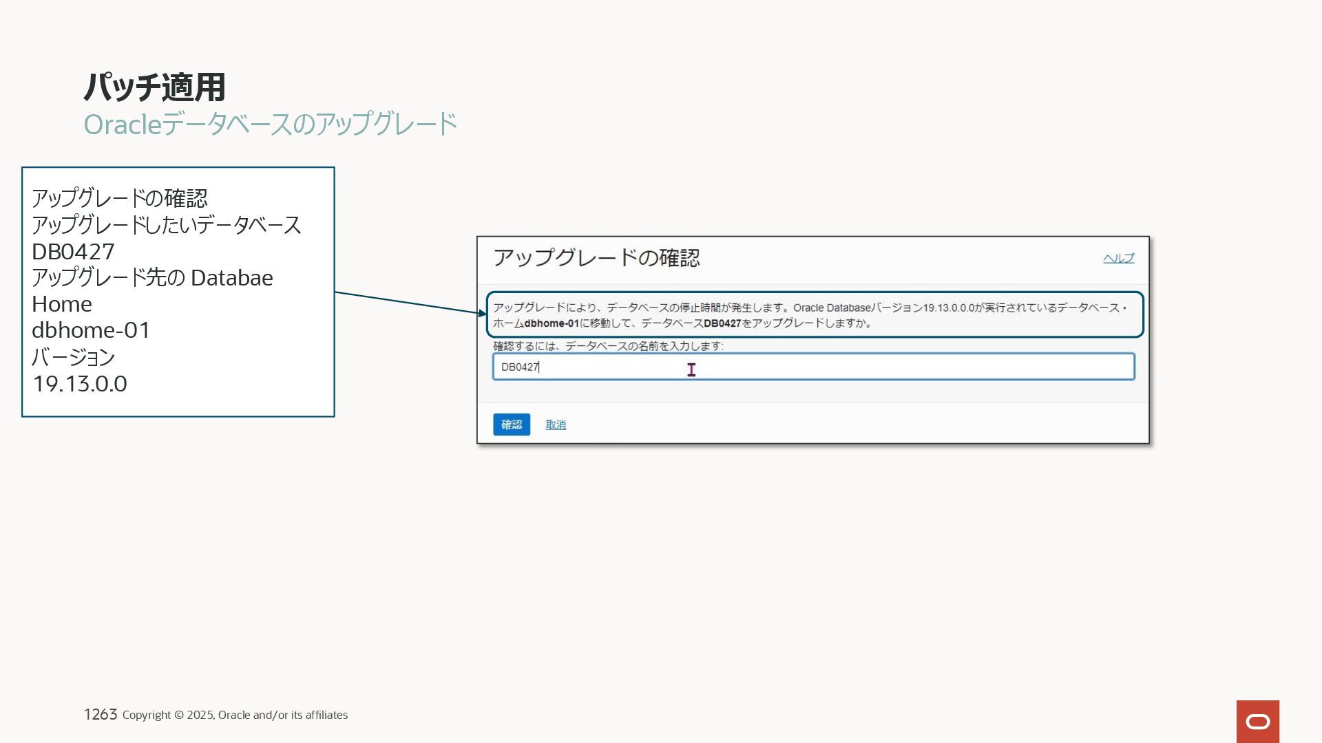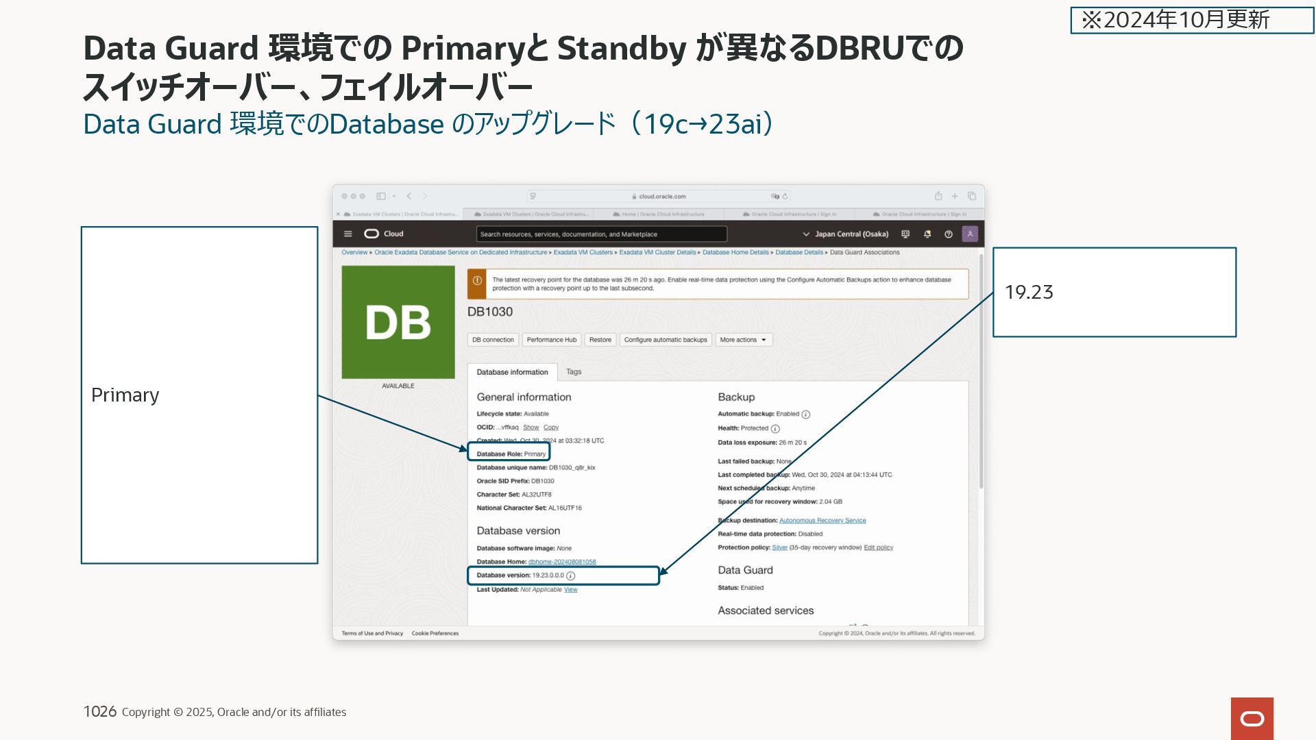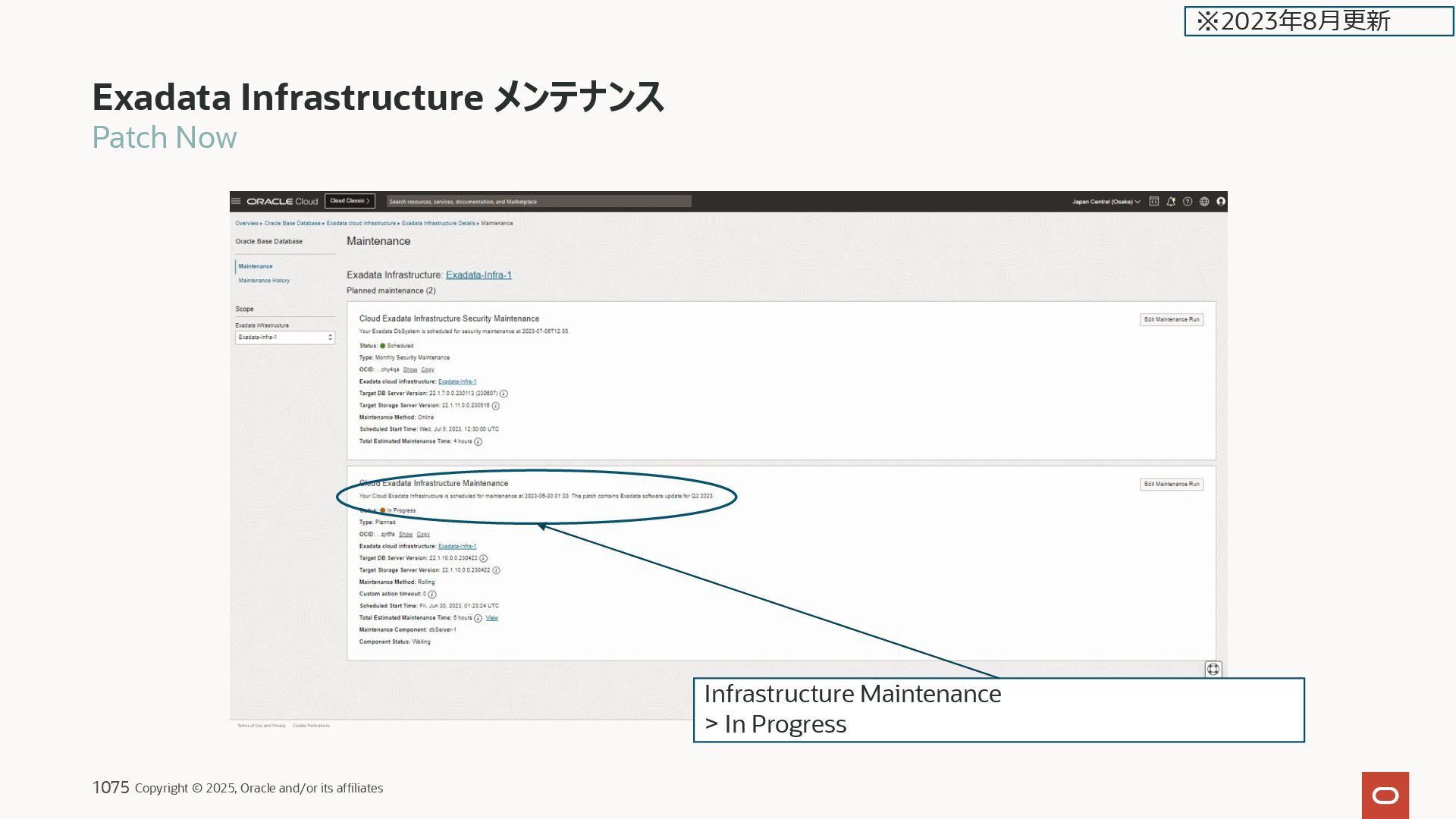 2025-04-03T01:31:51.131744+00:00 SQL> ALTER DISKGROUP DATAC2 DROP DISK 'DATAC2_CD_00_kix101117exdcl10', 'DATAC2_CD_01_kix101117exdcl10', 'DATAC2_CD_02_kix101117exdcl10', 'DATAC2_CD_03_kix101117exdcl10', 'DATAC2_CD_04_kix101117exdcl10', 'DATAC2_CD_05_kix101117exdcl10', 'DATAC2_CD_06_kix101117exdcl10', 'DATAC2_CD_07_kix101117exdcl10', 'DATAC2_CD_08_kix101117exdcl10', 'DATAC2_CD_09_kix101117exdcl10', 'DATAC2_CD_10_kix101117exdcl10', 'DATAC2_CD_11_kix101117exdcl10' REBALANCE POWER 4 略 SUCCESS: ALTER DISKGROUP RECOC2 DROP DISK 'RECOC2_CD_00_kix101117exdcl10', 'RECOC2_CD_01_kix101117exdcl10', 'RECOC2_CD_02_kix101117exdcl10', 'RECOC2_CD_03_kix101117exdcl10', 'RECOC2_CD_04_kix101117exdcl10', 'RECOC2_CD_05_kix101117exdcl10', 'RECOC2_CD_06_kix101117exdcl10', 'RECOC2_CD_07_kix101117exdcl10', 'RECOC2_CD_08_kix101117exdcl10', 'RECOC2_CD_09_kix101117exdcl10', 'RECOC2_CD_10_kix101117exdcl10', 'RECOC2_CD_11_kix101117exdcl10' REBALANCE POWER 4 NOTE: Attempting voting file refresh on diskgroup RECOC2 NOTE: Refresh completed on diskgroup RECOC2. No voting file found. 2025-04-03T01:32:19.466977+00:00 Exadata Infrastructure Copyright © 2025, Oracle and/or its affiliates 132 ※2025年4⽉更新