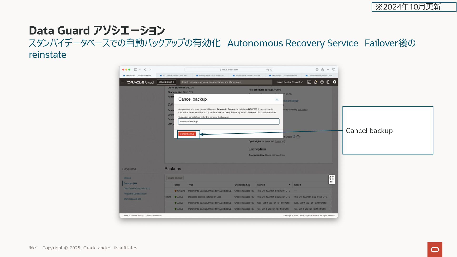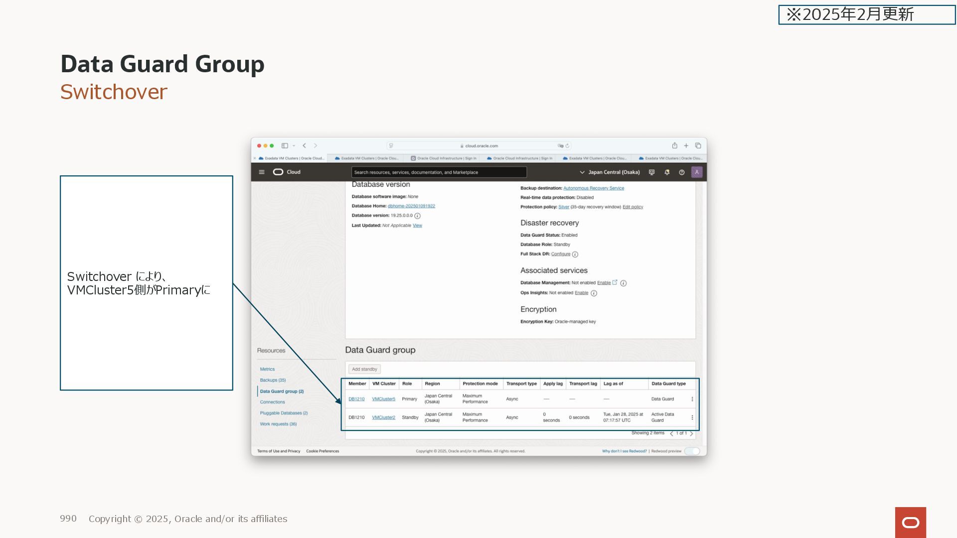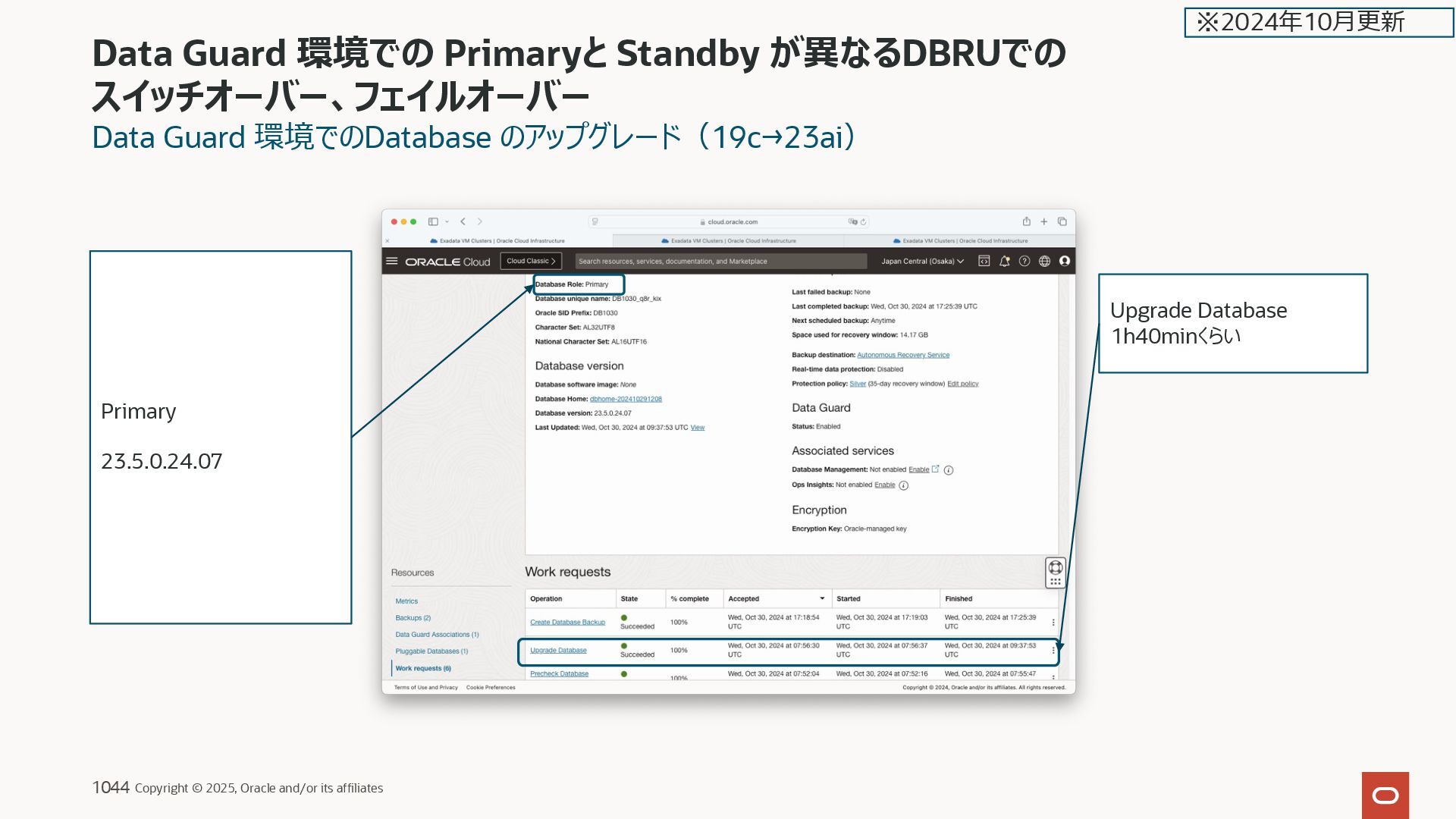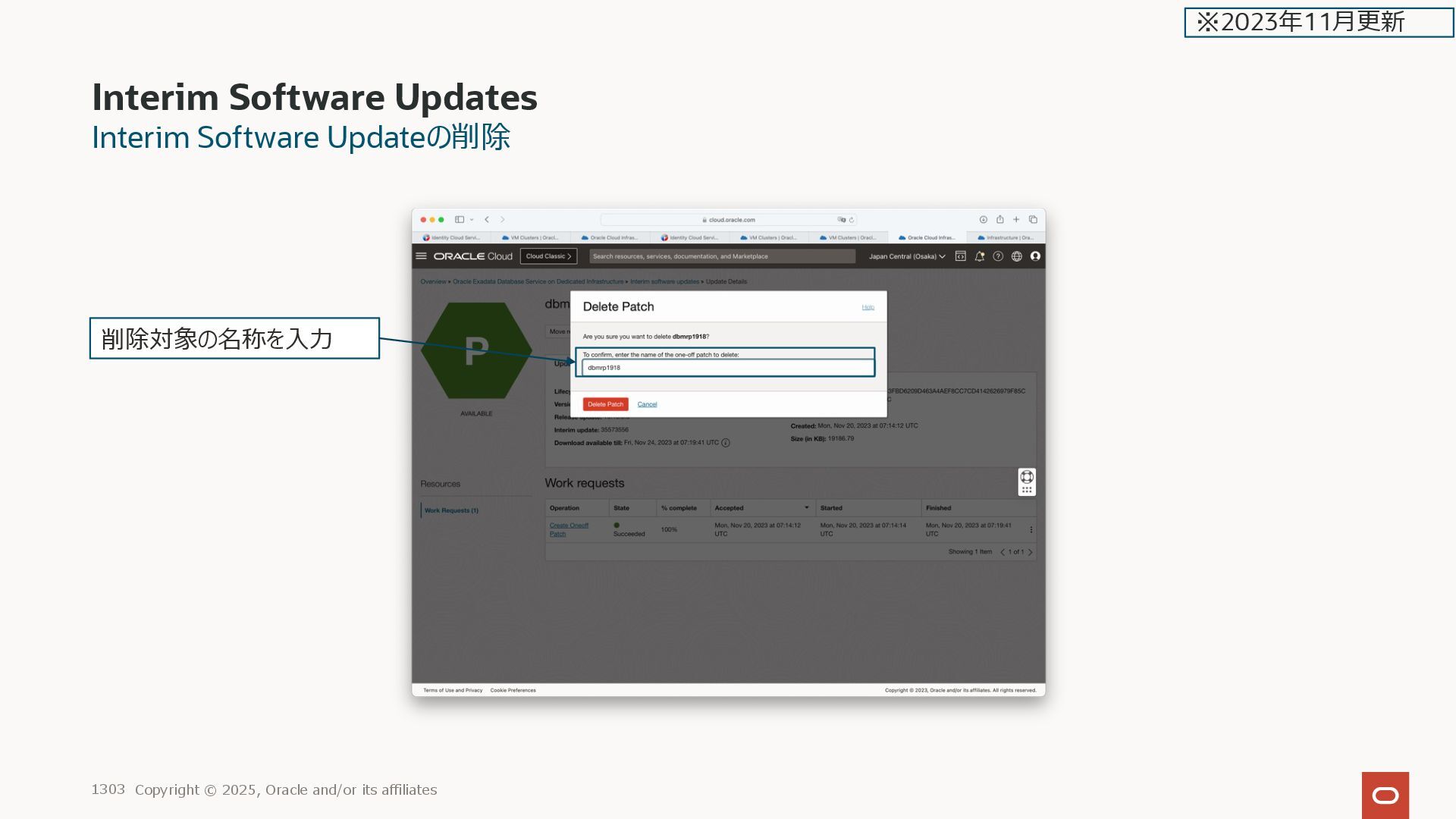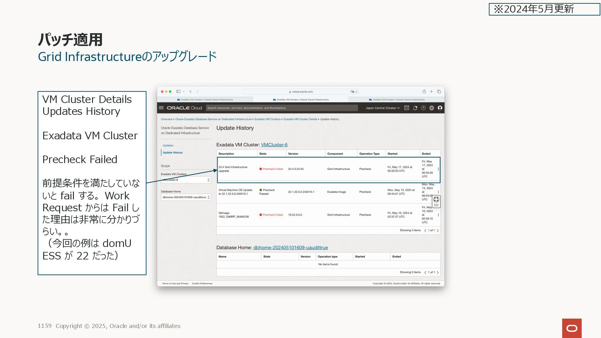 2025-04-03T01:31:51.131744+00:00 SQL> ALTER DISKGROUP DATAC2 DROP DISK 'DATAC2_CD_00_kix101117exdcl10', 'DATAC2_CD_01_kix101117exdcl10', 'DATAC2_CD_02_kix101117exdcl10', 'DATAC2_CD_03_kix101117exdcl10', 'DATAC2_CD_04_kix101117exdcl10', 'DATAC2_CD_05_kix101117exdcl10', 'DATAC2_CD_06_kix101117exdcl10', 'DATAC2_CD_07_kix101117exdcl10', 'DATAC2_CD_08_kix101117exdcl10', 'DATAC2_CD_09_kix101117exdcl10', 'DATAC2_CD_10_kix101117exdcl10', 'DATAC2_CD_11_kix101117exdcl10' REBALANCE POWER 4 略 SUCCESS: ALTER DISKGROUP RECOC2 DROP DISK 'RECOC2_CD_00_kix101117exdcl10', 'RECOC2_CD_01_kix101117exdcl10', 'RECOC2_CD_02_kix101117exdcl10', 'RECOC2_CD_03_kix101117exdcl10', 'RECOC2_CD_04_kix101117exdcl10', 'RECOC2_CD_05_kix101117exdcl10', 'RECOC2_CD_06_kix101117exdcl10', 'RECOC2_CD_07_kix101117exdcl10', 'RECOC2_CD_08_kix101117exdcl10', 'RECOC2_CD_09_kix101117exdcl10', 'RECOC2_CD_10_kix101117exdcl10', 'RECOC2_CD_11_kix101117exdcl10' REBALANCE POWER 4 NOTE: Attempting voting file refresh on diskgroup RECOC2 NOTE: Refresh completed on diskgroup RECOC2. No voting file found. 2025-04-03T01:32:19.466977+00:00 Exadata Infrastructure Copyright © 2025, Oracle and/or its affiliates 132 ※2025年4⽉更新