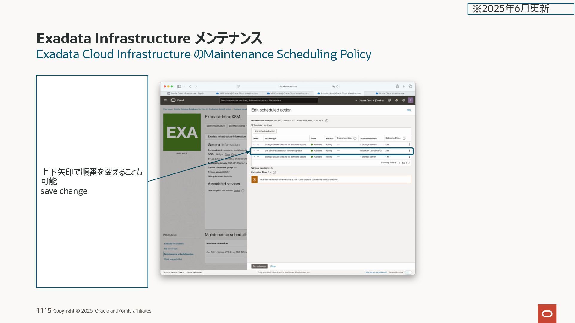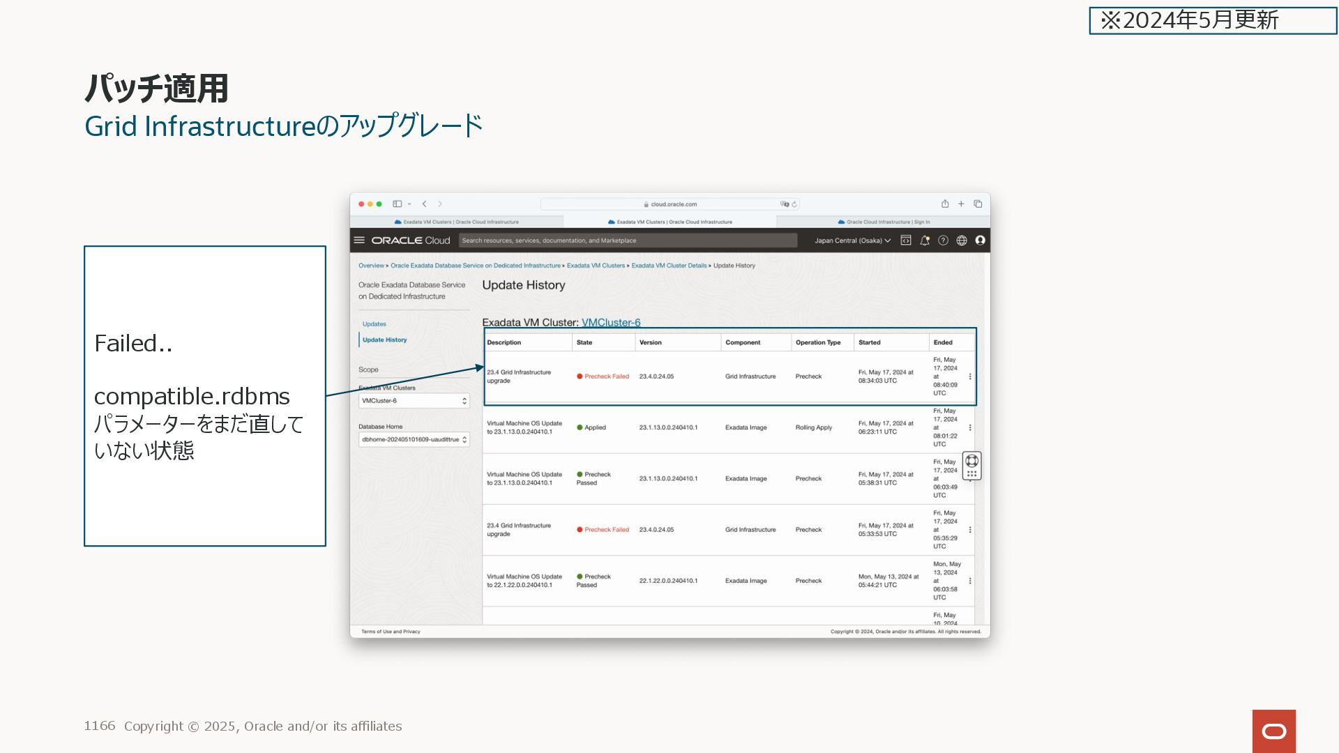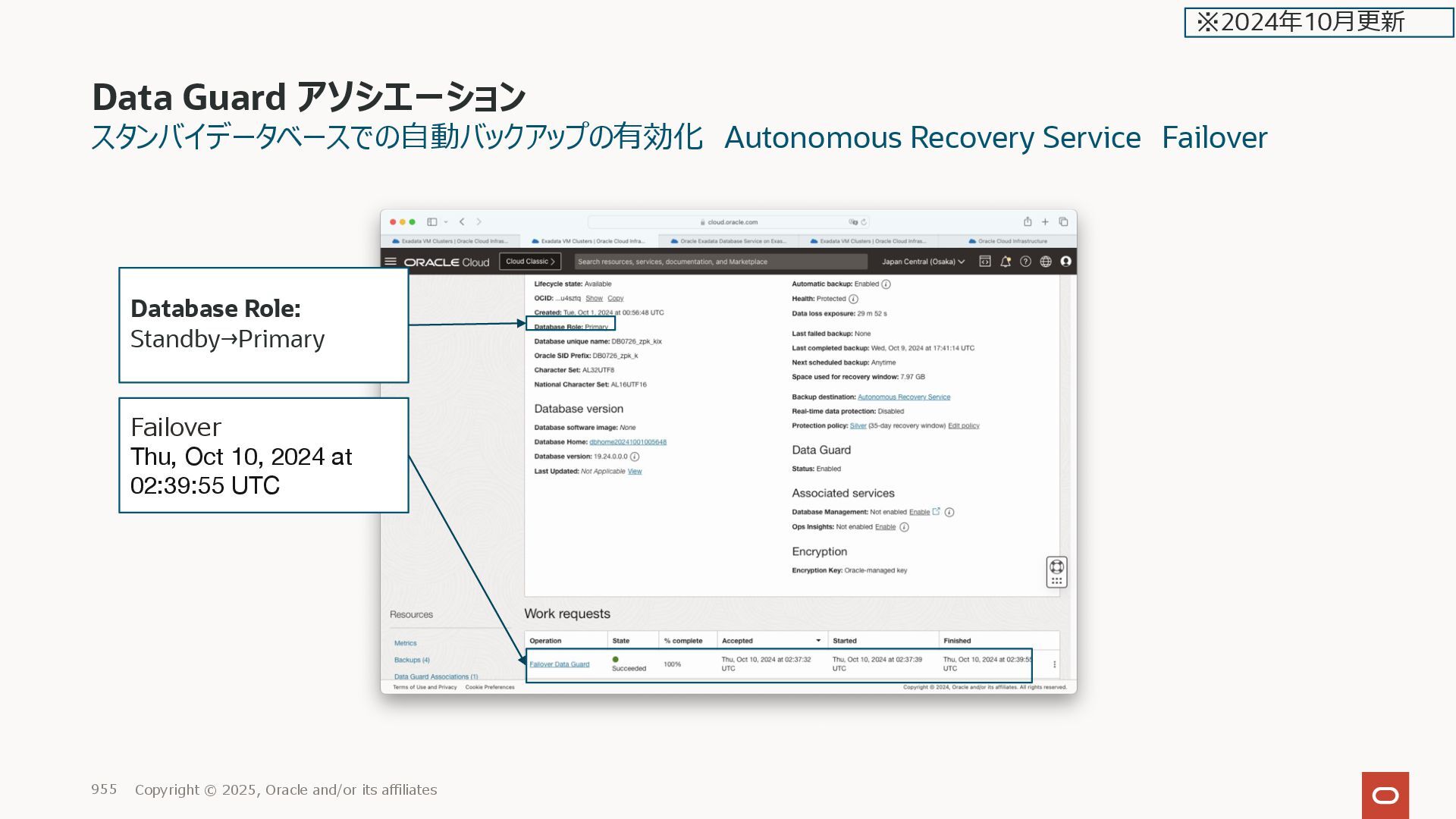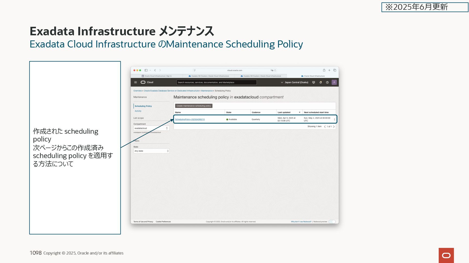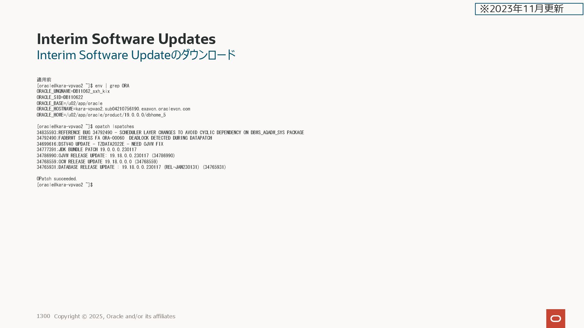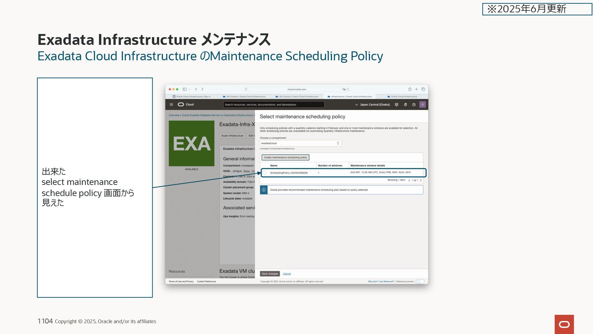 2025-04-03T01:31:51.131744+00:00 SQL> ALTER DISKGROUP DATAC2 DROP DISK 'DATAC2_CD_00_kix101117exdcl10', 'DATAC2_CD_01_kix101117exdcl10', 'DATAC2_CD_02_kix101117exdcl10', 'DATAC2_CD_03_kix101117exdcl10', 'DATAC2_CD_04_kix101117exdcl10', 'DATAC2_CD_05_kix101117exdcl10', 'DATAC2_CD_06_kix101117exdcl10', 'DATAC2_CD_07_kix101117exdcl10', 'DATAC2_CD_08_kix101117exdcl10', 'DATAC2_CD_09_kix101117exdcl10', 'DATAC2_CD_10_kix101117exdcl10', 'DATAC2_CD_11_kix101117exdcl10' REBALANCE POWER 4 略 SUCCESS: ALTER DISKGROUP RECOC2 DROP DISK 'RECOC2_CD_00_kix101117exdcl10', 'RECOC2_CD_01_kix101117exdcl10', 'RECOC2_CD_02_kix101117exdcl10', 'RECOC2_CD_03_kix101117exdcl10', 'RECOC2_CD_04_kix101117exdcl10', 'RECOC2_CD_05_kix101117exdcl10', 'RECOC2_CD_06_kix101117exdcl10', 'RECOC2_CD_07_kix101117exdcl10', 'RECOC2_CD_08_kix101117exdcl10', 'RECOC2_CD_09_kix101117exdcl10', 'RECOC2_CD_10_kix101117exdcl10', 'RECOC2_CD_11_kix101117exdcl10' REBALANCE POWER 4 NOTE: Attempting voting file refresh on diskgroup RECOC2 NOTE: Refresh completed on diskgroup RECOC2. No voting file found. 2025-04-03T01:32:19.466977+00:00 Exadata Infrastructure Copyright © 2025, Oracle and/or its affiliates 132 ※2025年4⽉更新