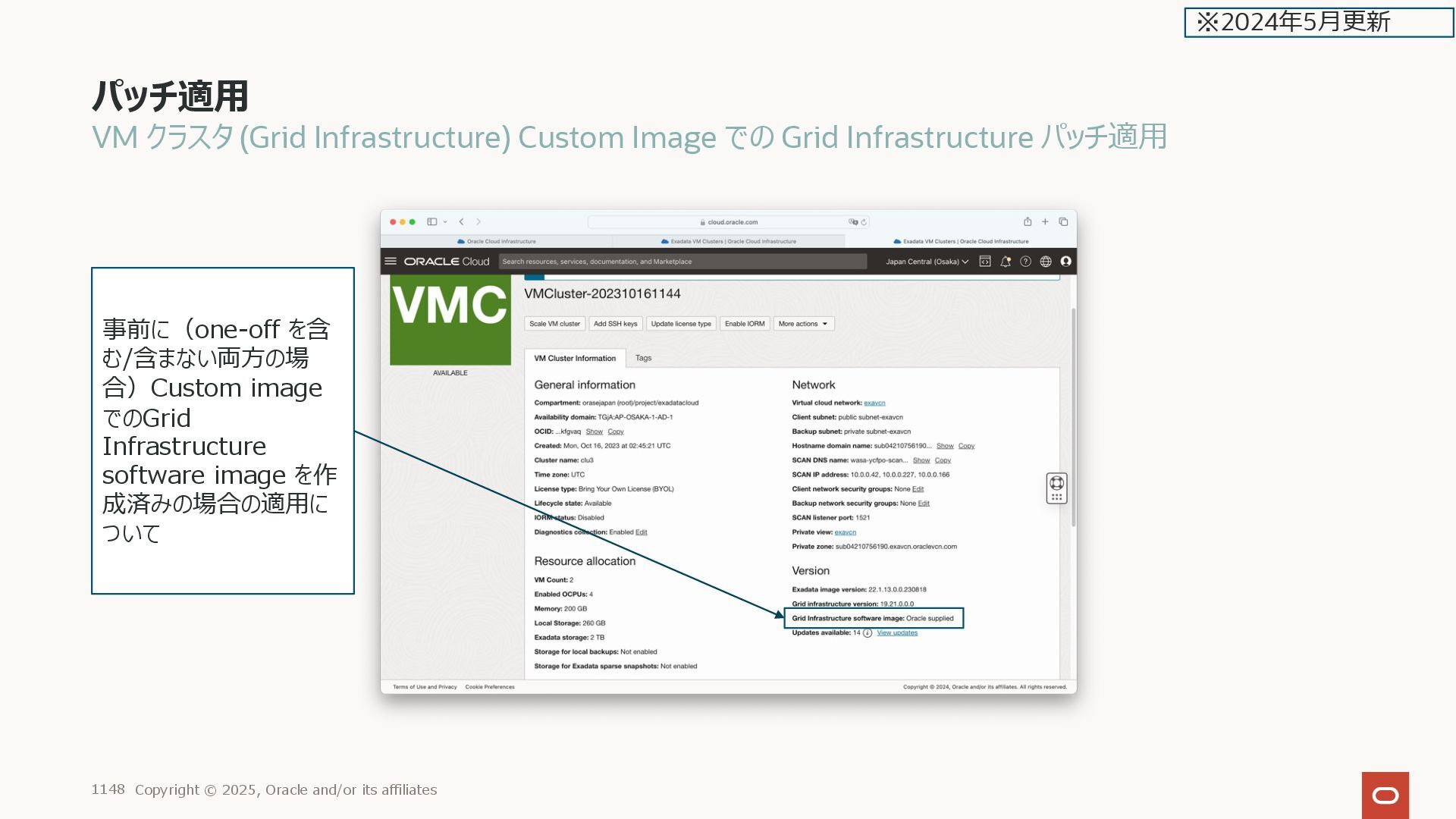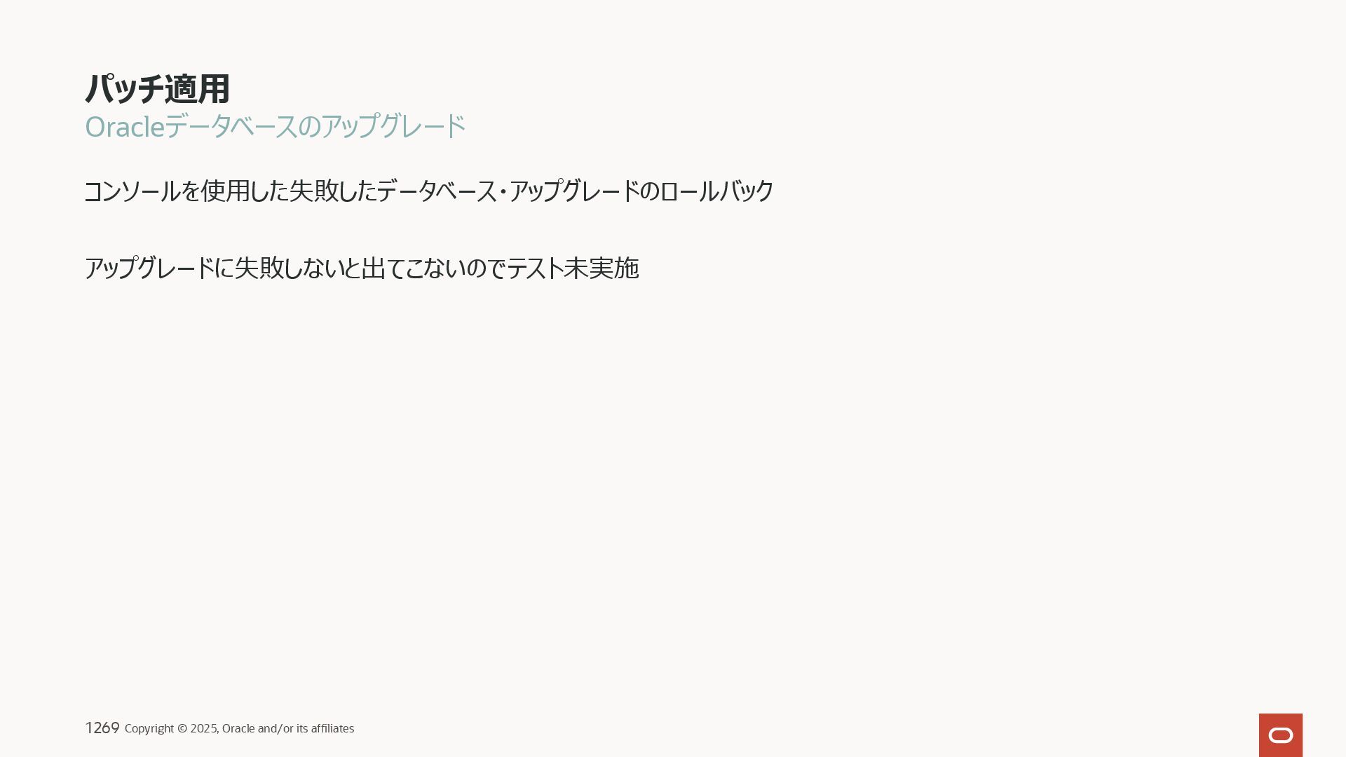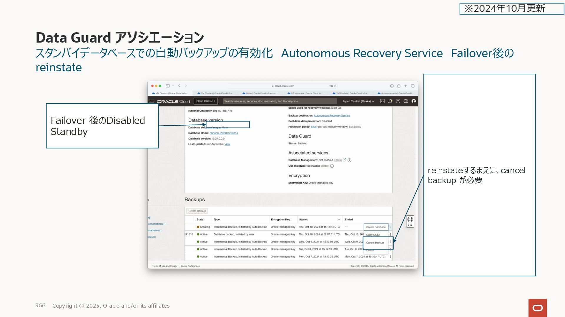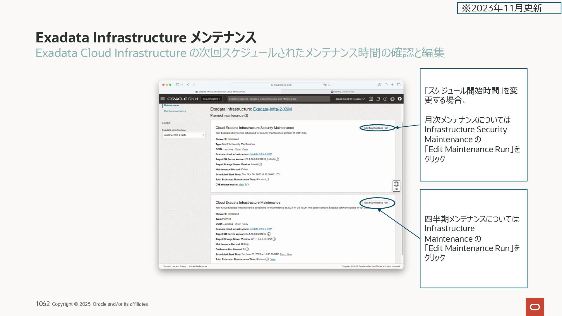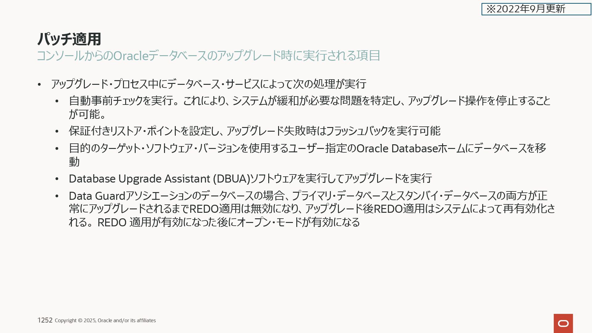 2025-04-03T01:31:51.131744+00:00 SQL> ALTER DISKGROUP DATAC2 DROP DISK 'DATAC2_CD_00_kix101117exdcl10', 'DATAC2_CD_01_kix101117exdcl10', 'DATAC2_CD_02_kix101117exdcl10', 'DATAC2_CD_03_kix101117exdcl10', 'DATAC2_CD_04_kix101117exdcl10', 'DATAC2_CD_05_kix101117exdcl10', 'DATAC2_CD_06_kix101117exdcl10', 'DATAC2_CD_07_kix101117exdcl10', 'DATAC2_CD_08_kix101117exdcl10', 'DATAC2_CD_09_kix101117exdcl10', 'DATAC2_CD_10_kix101117exdcl10', 'DATAC2_CD_11_kix101117exdcl10' REBALANCE POWER 4 略 SUCCESS: ALTER DISKGROUP RECOC2 DROP DISK 'RECOC2_CD_00_kix101117exdcl10', 'RECOC2_CD_01_kix101117exdcl10', 'RECOC2_CD_02_kix101117exdcl10', 'RECOC2_CD_03_kix101117exdcl10', 'RECOC2_CD_04_kix101117exdcl10', 'RECOC2_CD_05_kix101117exdcl10', 'RECOC2_CD_06_kix101117exdcl10', 'RECOC2_CD_07_kix101117exdcl10', 'RECOC2_CD_08_kix101117exdcl10', 'RECOC2_CD_09_kix101117exdcl10', 'RECOC2_CD_10_kix101117exdcl10', 'RECOC2_CD_11_kix101117exdcl10' REBALANCE POWER 4 NOTE: Attempting voting file refresh on diskgroup RECOC2 NOTE: Refresh completed on diskgroup RECOC2. No voting file found. 2025-04-03T01:32:19.466977+00:00 Exadata Infrastructure Copyright © 2025, Oracle and/or its affiliates 132 ※2025年4⽉更新