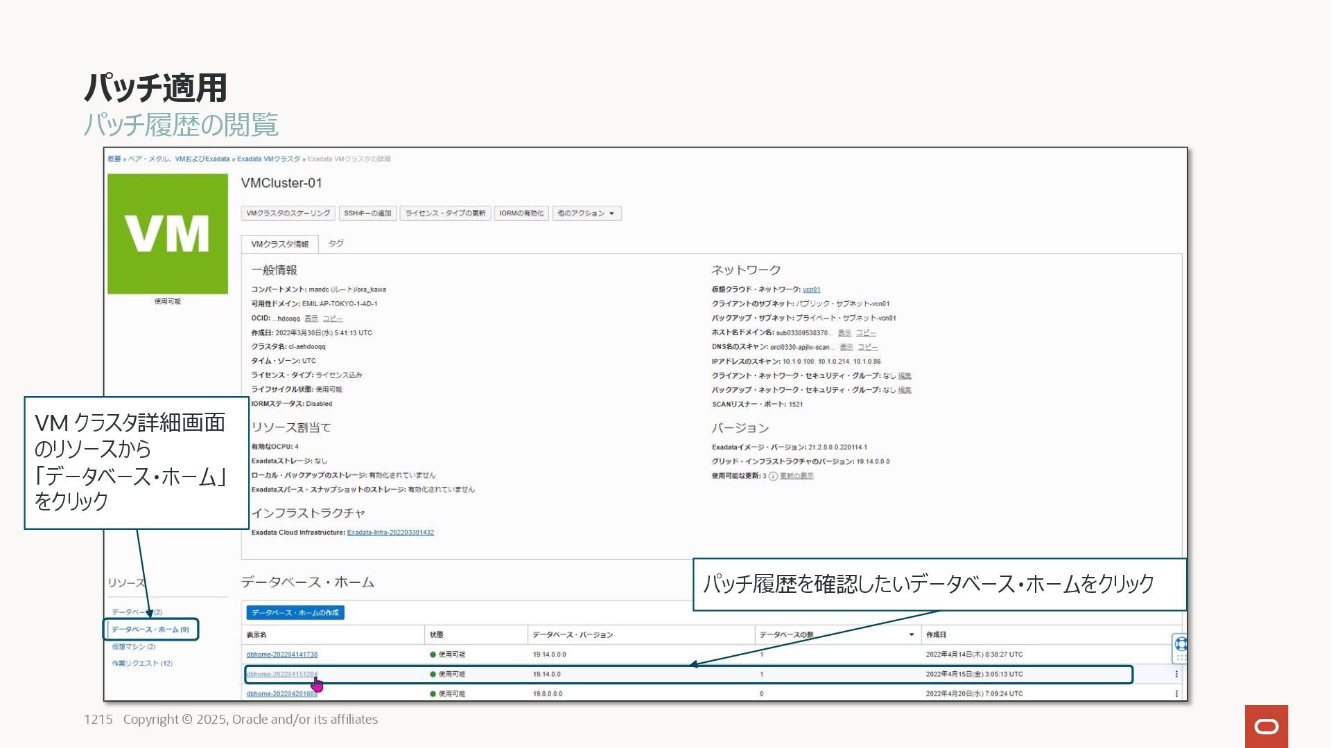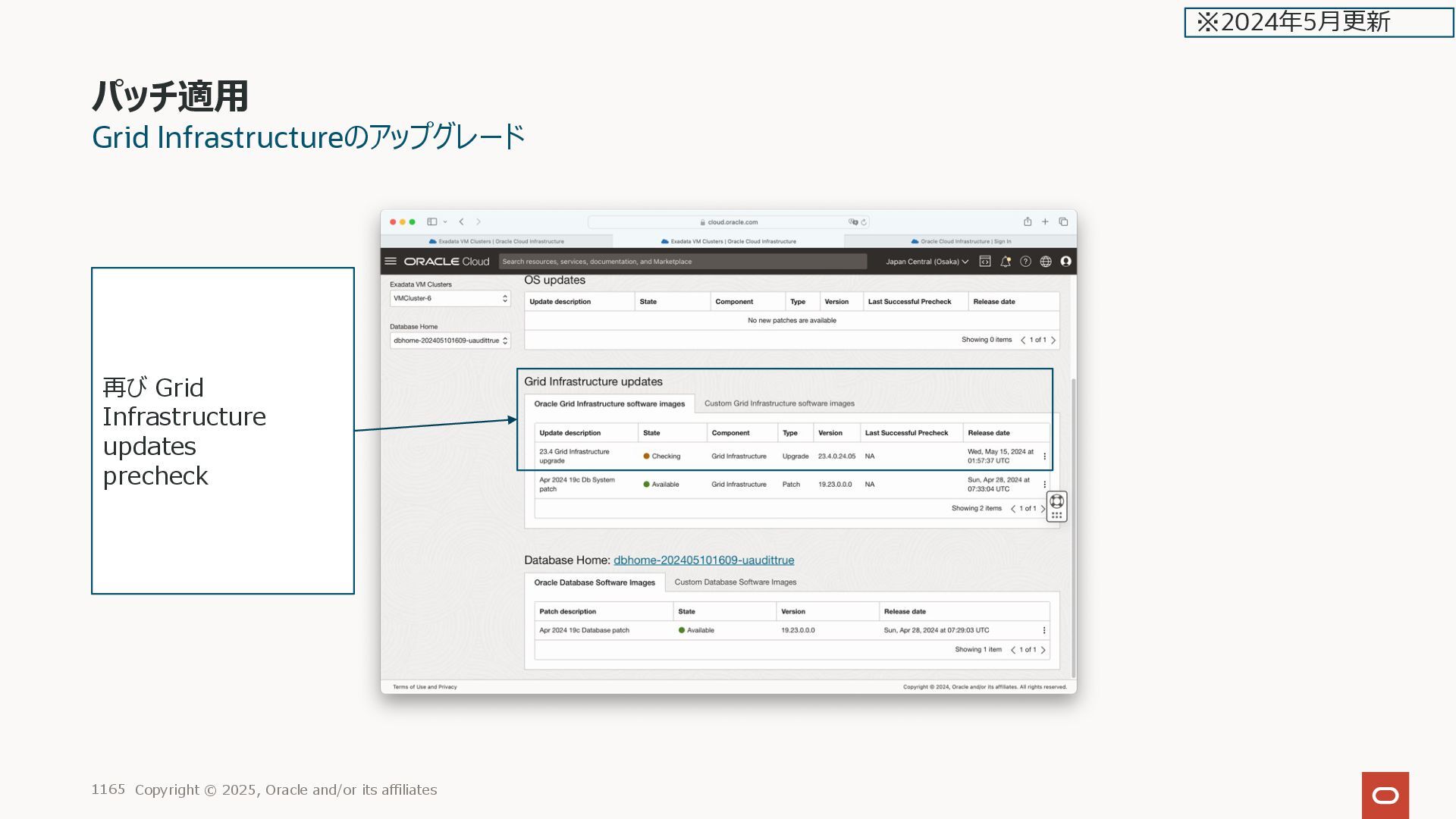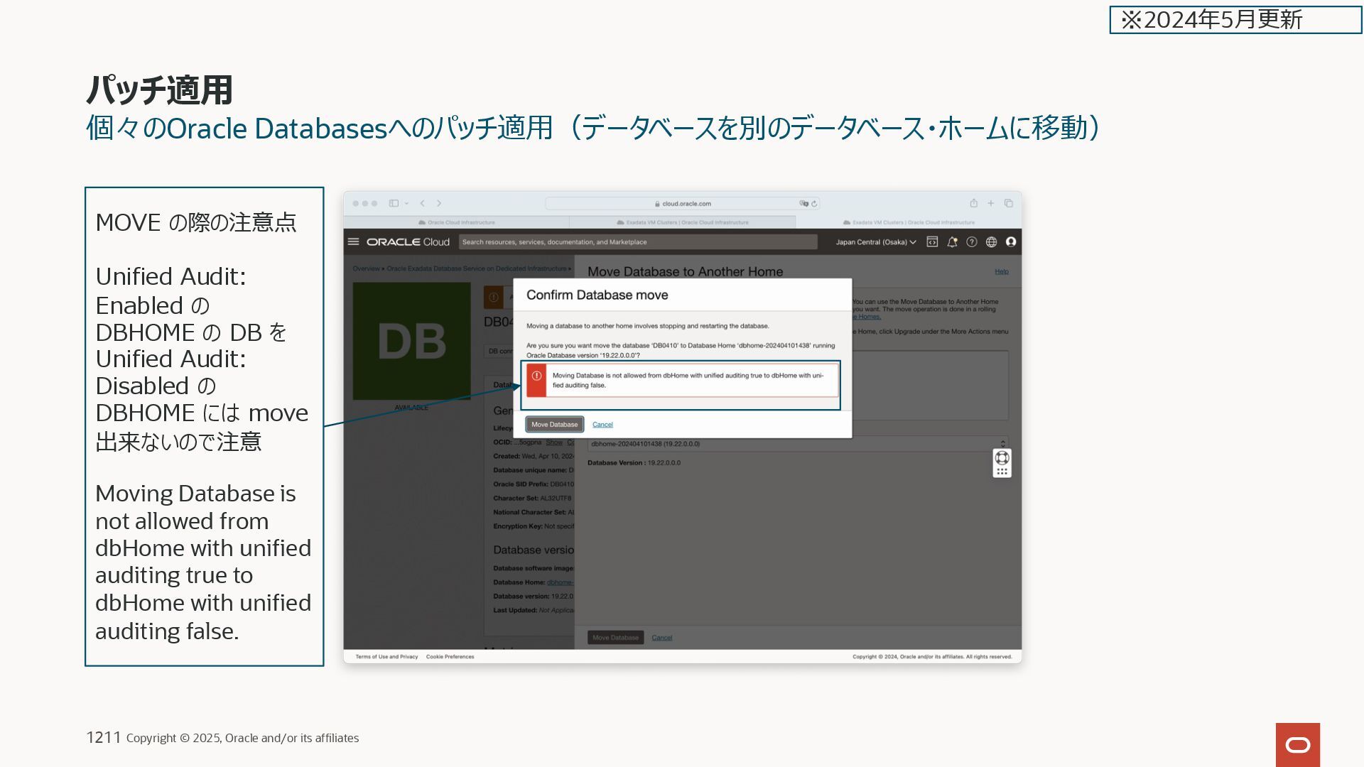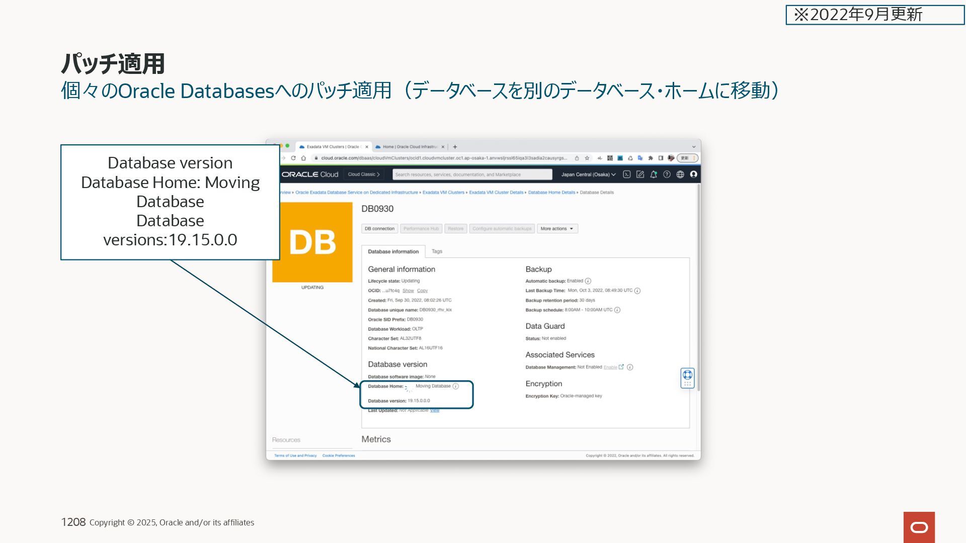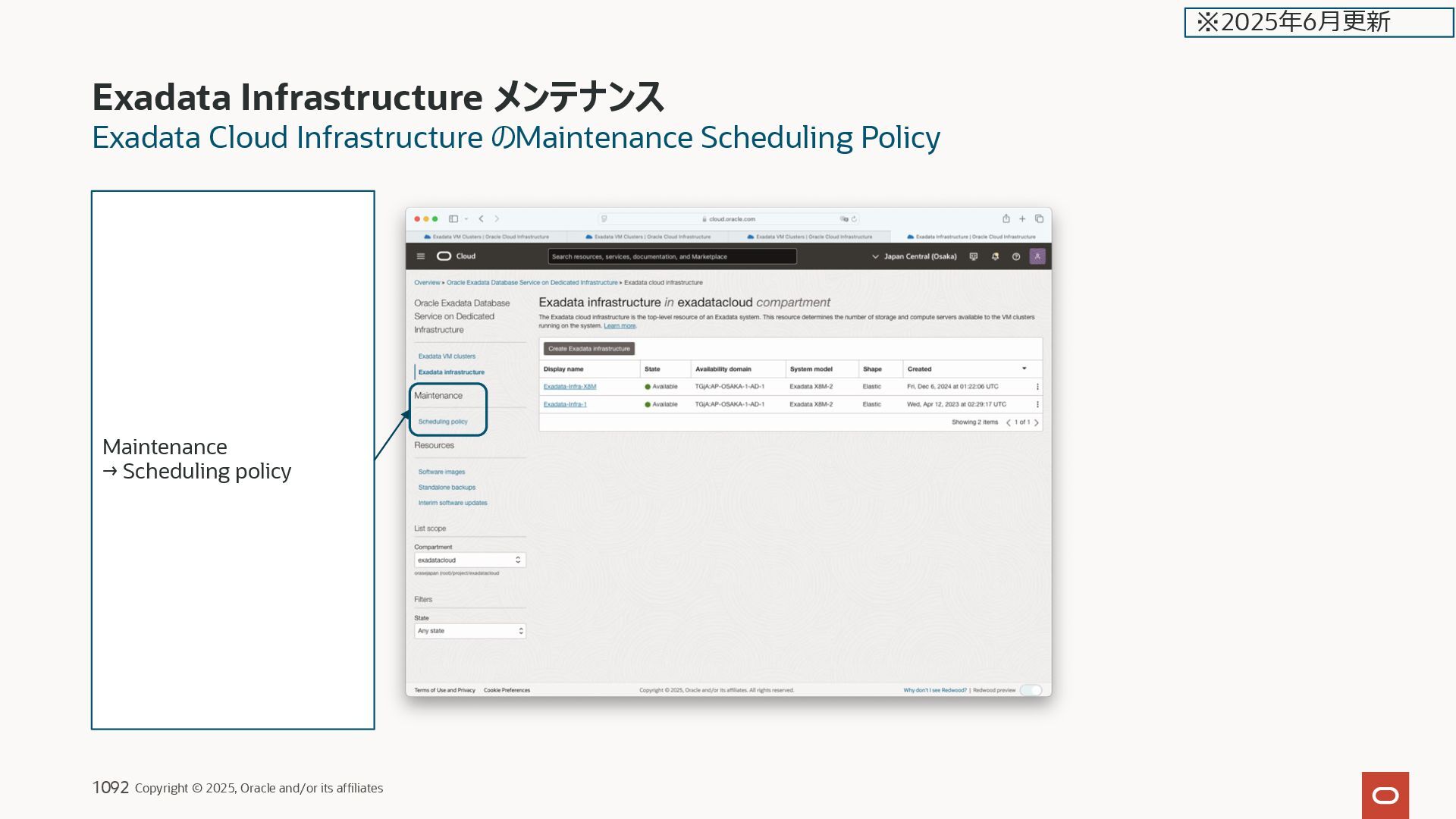2025-04-03T01:31:51.131744+00:00 SQL> ALTER DISKGROUP DATAC2 DROP DISK 'DATAC2_CD_00_kix101117exdcl10', 'DATAC2_CD_01_kix101117exdcl10', 'DATAC2_CD_02_kix101117exdcl10', 'DATAC2_CD_03_kix101117exdcl10', 'DATAC2_CD_04_kix101117exdcl10', 'DATAC2_CD_05_kix101117exdcl10', 'DATAC2_CD_06_kix101117exdcl10', 'DATAC2_CD_07_kix101117exdcl10', 'DATAC2_CD_08_kix101117exdcl10', 'DATAC2_CD_09_kix101117exdcl10', 'DATAC2_CD_10_kix101117exdcl10', 'DATAC2_CD_11_kix101117exdcl10' REBALANCE POWER 4 略 SUCCESS: ALTER DISKGROUP RECOC2 DROP DISK 'RECOC2_CD_00_kix101117exdcl10', 'RECOC2_CD_01_kix101117exdcl10', 'RECOC2_CD_02_kix101117exdcl10', 'RECOC2_CD_03_kix101117exdcl10', 'RECOC2_CD_04_kix101117exdcl10', 'RECOC2_CD_05_kix101117exdcl10', 'RECOC2_CD_06_kix101117exdcl10', 'RECOC2_CD_07_kix101117exdcl10', 'RECOC2_CD_08_kix101117exdcl10', 'RECOC2_CD_09_kix101117exdcl10', 'RECOC2_CD_10_kix101117exdcl10', 'RECOC2_CD_11_kix101117exdcl10' REBALANCE POWER 4 NOTE: Attempting voting file refresh on diskgroup RECOC2 NOTE: Refresh completed on diskgroup RECOC2. No voting file found. 2025-04-03T01:32:19.466977+00:00 Exadata Infrastructure Copyright © 2025, Oracle and/or its affiliates 132 ※2025年4⽉更新