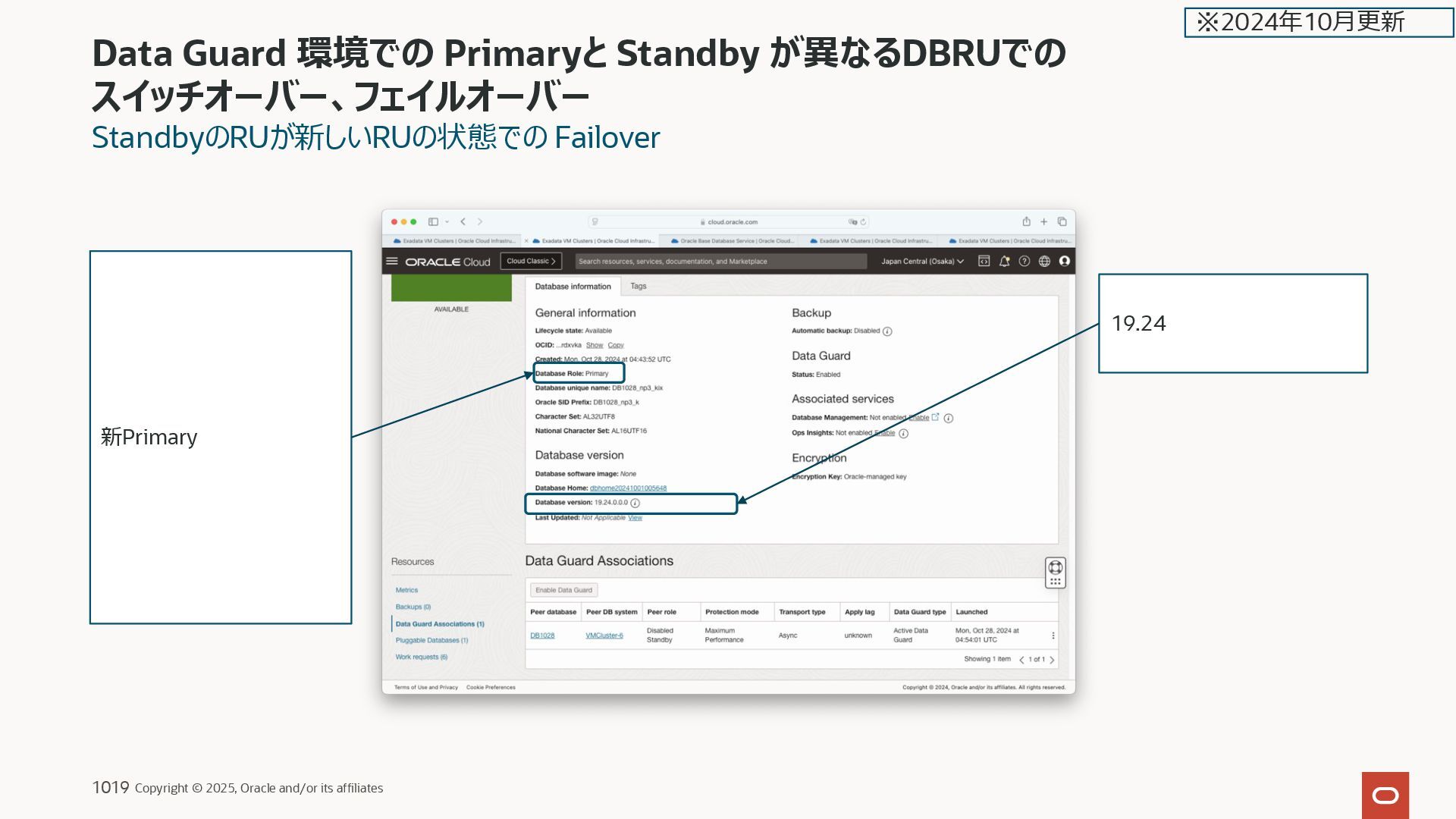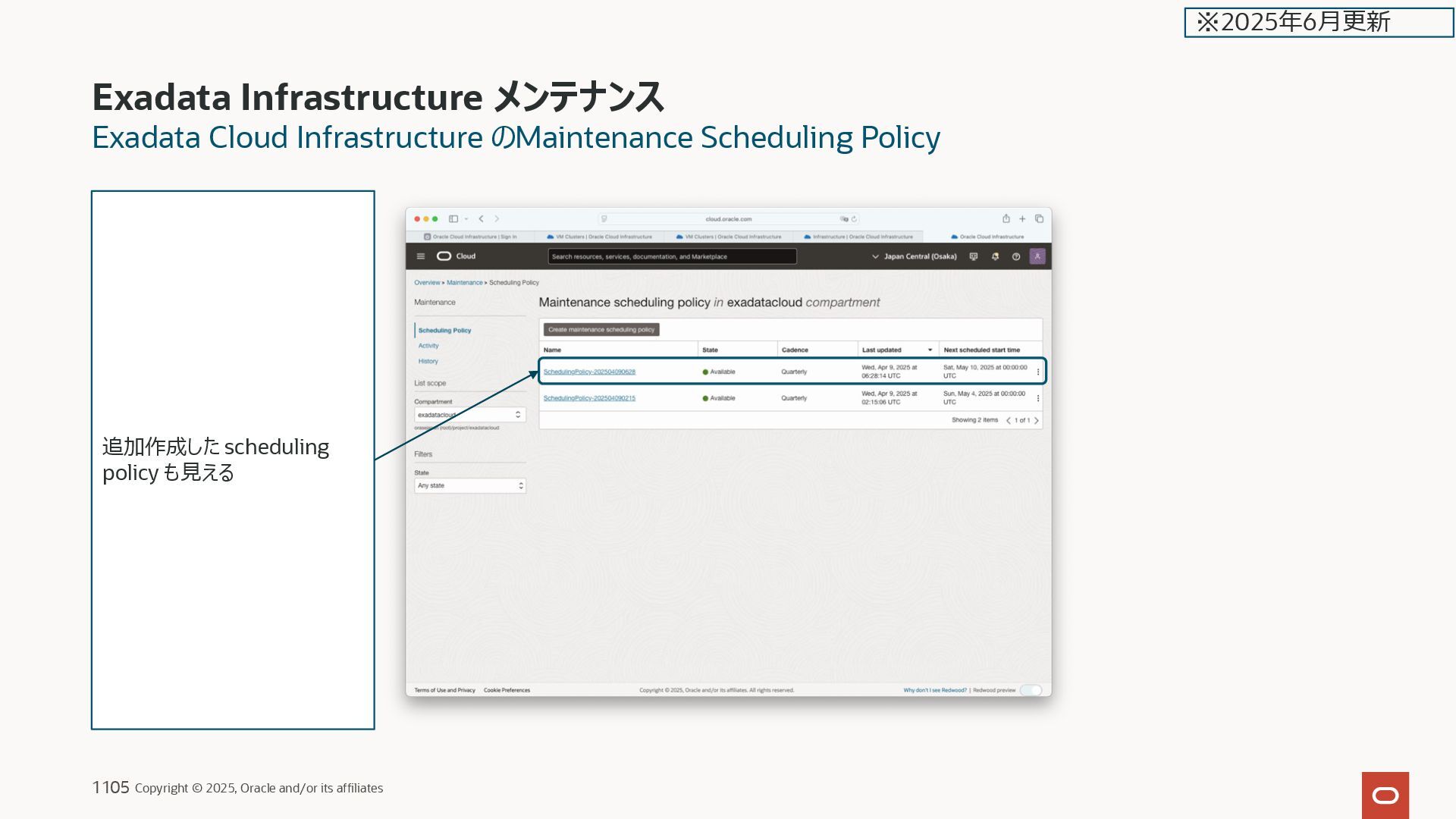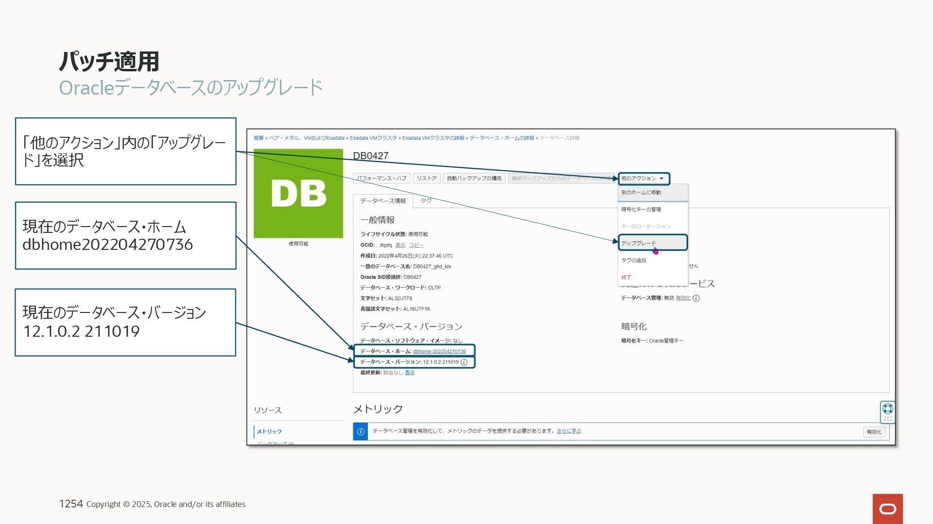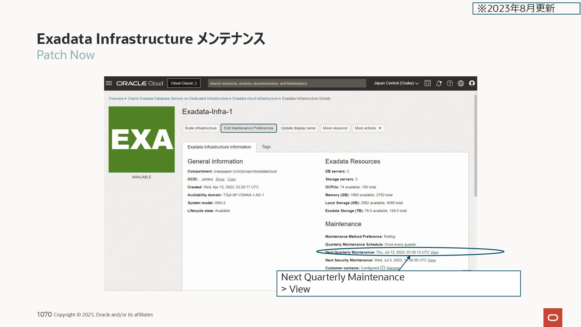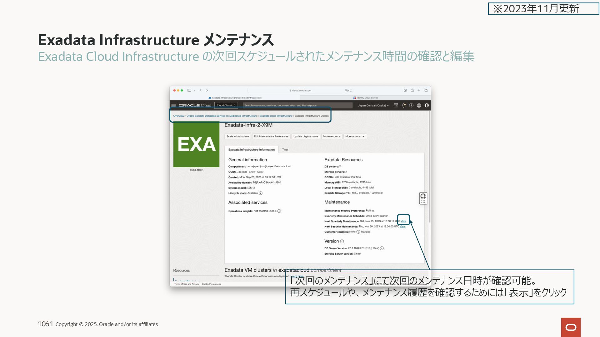 2025-04-03T01:31:51.131744+00:00 SQL> ALTER DISKGROUP DATAC2 DROP DISK 'DATAC2_CD_00_kix101117exdcl10', 'DATAC2_CD_01_kix101117exdcl10', 'DATAC2_CD_02_kix101117exdcl10', 'DATAC2_CD_03_kix101117exdcl10', 'DATAC2_CD_04_kix101117exdcl10', 'DATAC2_CD_05_kix101117exdcl10', 'DATAC2_CD_06_kix101117exdcl10', 'DATAC2_CD_07_kix101117exdcl10', 'DATAC2_CD_08_kix101117exdcl10', 'DATAC2_CD_09_kix101117exdcl10', 'DATAC2_CD_10_kix101117exdcl10', 'DATAC2_CD_11_kix101117exdcl10' REBALANCE POWER 4 略 SUCCESS: ALTER DISKGROUP RECOC2 DROP DISK 'RECOC2_CD_00_kix101117exdcl10', 'RECOC2_CD_01_kix101117exdcl10', 'RECOC2_CD_02_kix101117exdcl10', 'RECOC2_CD_03_kix101117exdcl10', 'RECOC2_CD_04_kix101117exdcl10', 'RECOC2_CD_05_kix101117exdcl10', 'RECOC2_CD_06_kix101117exdcl10', 'RECOC2_CD_07_kix101117exdcl10', 'RECOC2_CD_08_kix101117exdcl10', 'RECOC2_CD_09_kix101117exdcl10', 'RECOC2_CD_10_kix101117exdcl10', 'RECOC2_CD_11_kix101117exdcl10' REBALANCE POWER 4 NOTE: Attempting voting file refresh on diskgroup RECOC2 NOTE: Refresh completed on diskgroup RECOC2. No voting file found. 2025-04-03T01:32:19.466977+00:00 Exadata Infrastructure Copyright © 2025, Oracle and/or its affiliates 132 ※2025年4⽉更新