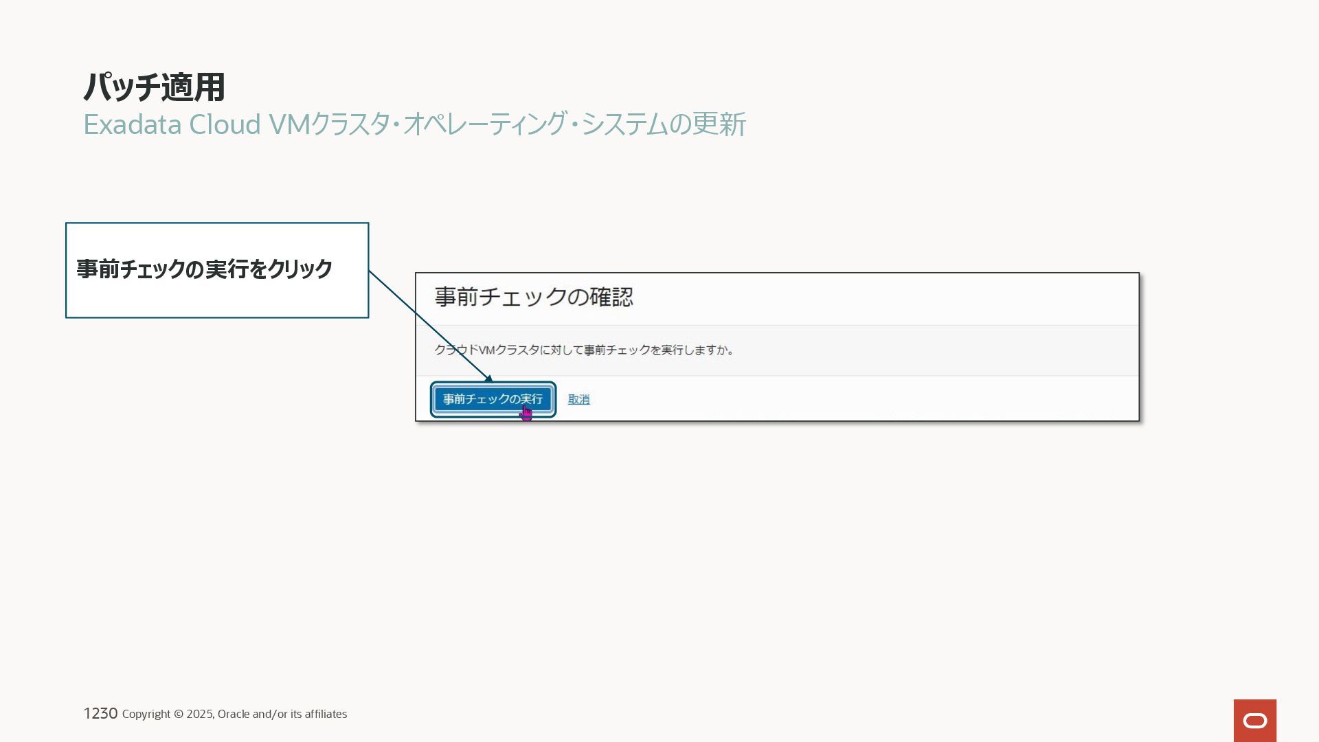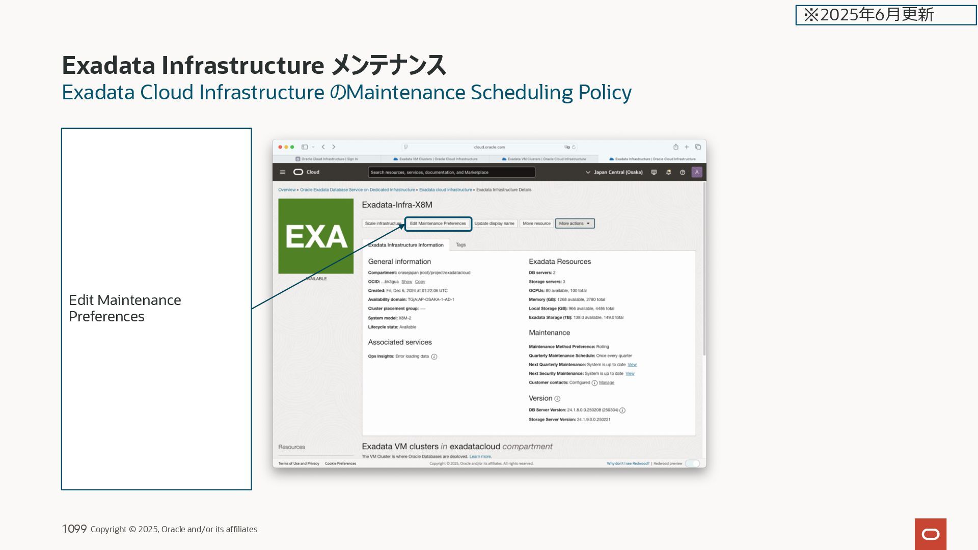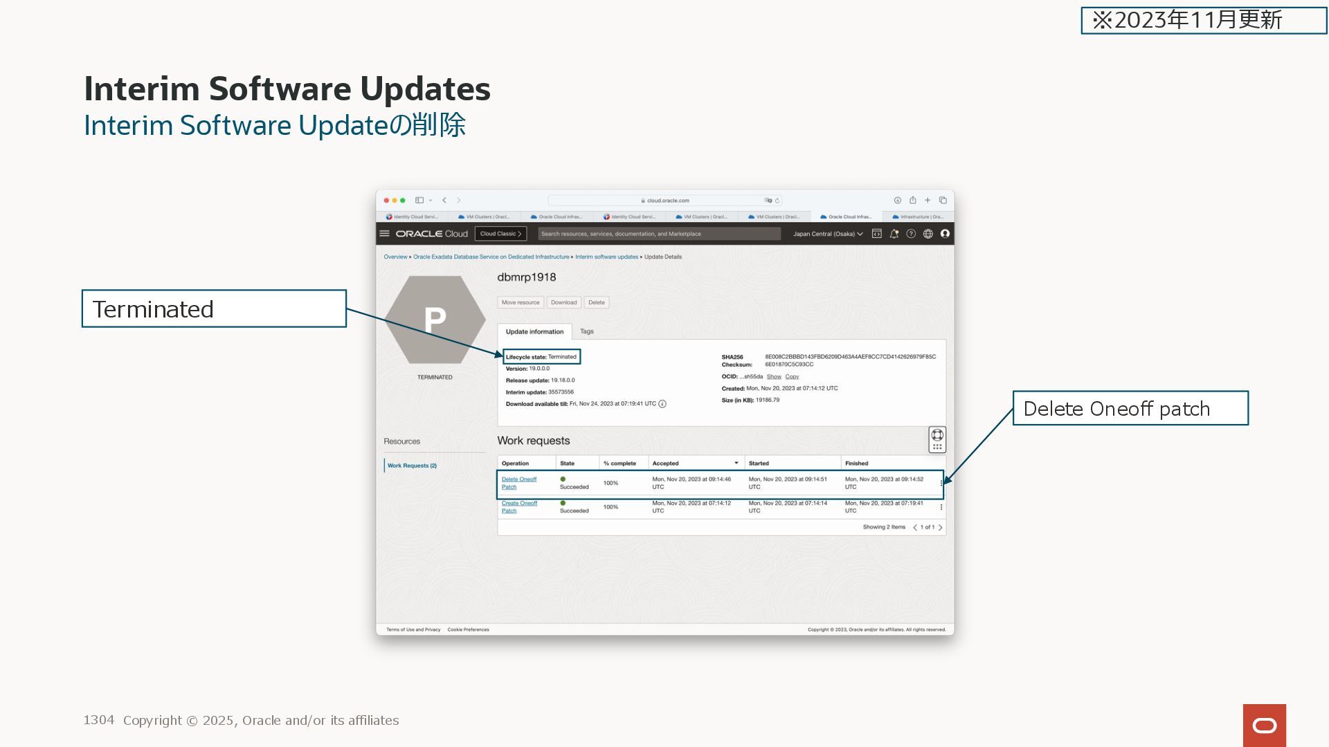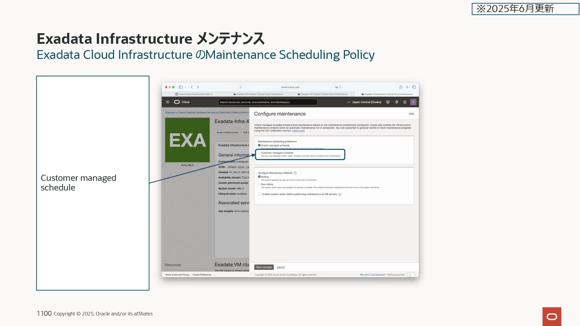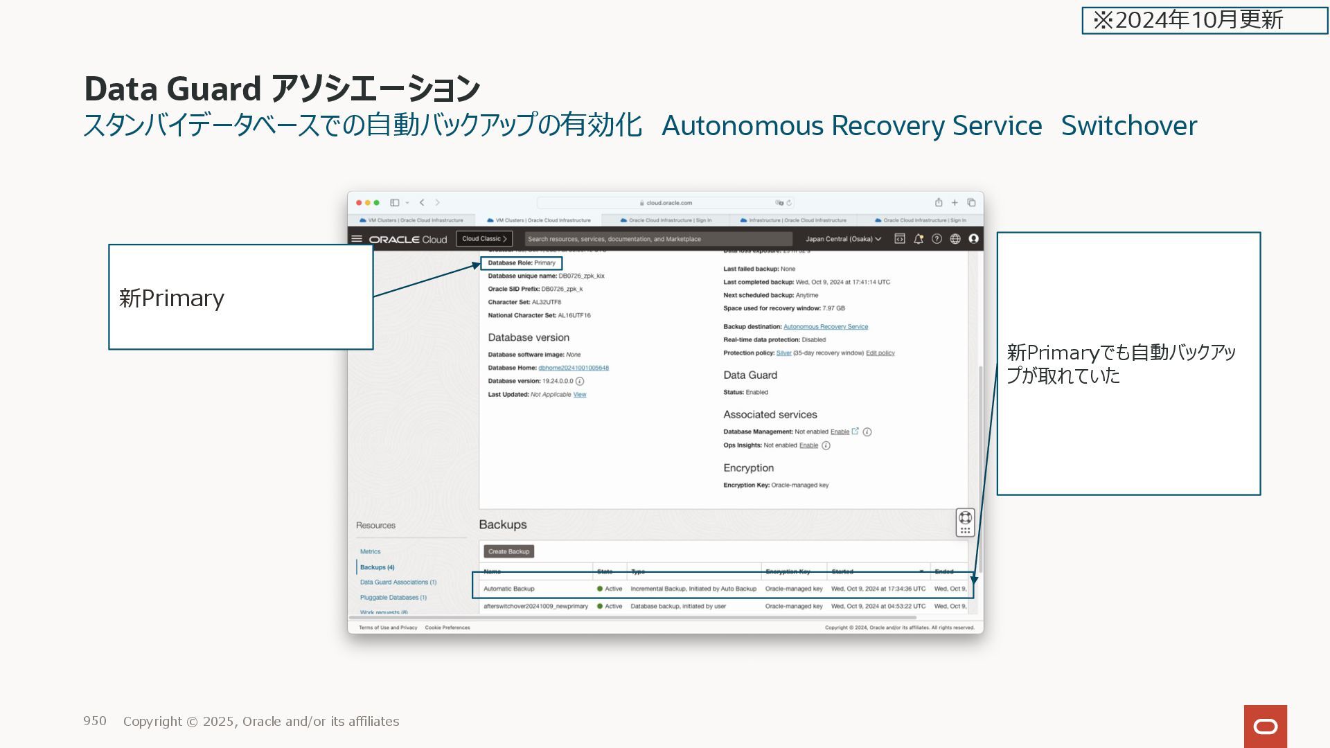 2025-04-03T01:31:51.131744+00:00 SQL> ALTER DISKGROUP DATAC2 DROP DISK 'DATAC2_CD_00_kix101117exdcl10', 'DATAC2_CD_01_kix101117exdcl10', 'DATAC2_CD_02_kix101117exdcl10', 'DATAC2_CD_03_kix101117exdcl10', 'DATAC2_CD_04_kix101117exdcl10', 'DATAC2_CD_05_kix101117exdcl10', 'DATAC2_CD_06_kix101117exdcl10', 'DATAC2_CD_07_kix101117exdcl10', 'DATAC2_CD_08_kix101117exdcl10', 'DATAC2_CD_09_kix101117exdcl10', 'DATAC2_CD_10_kix101117exdcl10', 'DATAC2_CD_11_kix101117exdcl10' REBALANCE POWER 4 略 SUCCESS: ALTER DISKGROUP RECOC2 DROP DISK 'RECOC2_CD_00_kix101117exdcl10', 'RECOC2_CD_01_kix101117exdcl10', 'RECOC2_CD_02_kix101117exdcl10', 'RECOC2_CD_03_kix101117exdcl10', 'RECOC2_CD_04_kix101117exdcl10', 'RECOC2_CD_05_kix101117exdcl10', 'RECOC2_CD_06_kix101117exdcl10', 'RECOC2_CD_07_kix101117exdcl10', 'RECOC2_CD_08_kix101117exdcl10', 'RECOC2_CD_09_kix101117exdcl10', 'RECOC2_CD_10_kix101117exdcl10', 'RECOC2_CD_11_kix101117exdcl10' REBALANCE POWER 4 NOTE: Attempting voting file refresh on diskgroup RECOC2 NOTE: Refresh completed on diskgroup RECOC2. No voting file found. 2025-04-03T01:32:19.466977+00:00 Exadata Infrastructure Copyright © 2025, Oracle and/or its affiliates 132 ※2025年4⽉更新