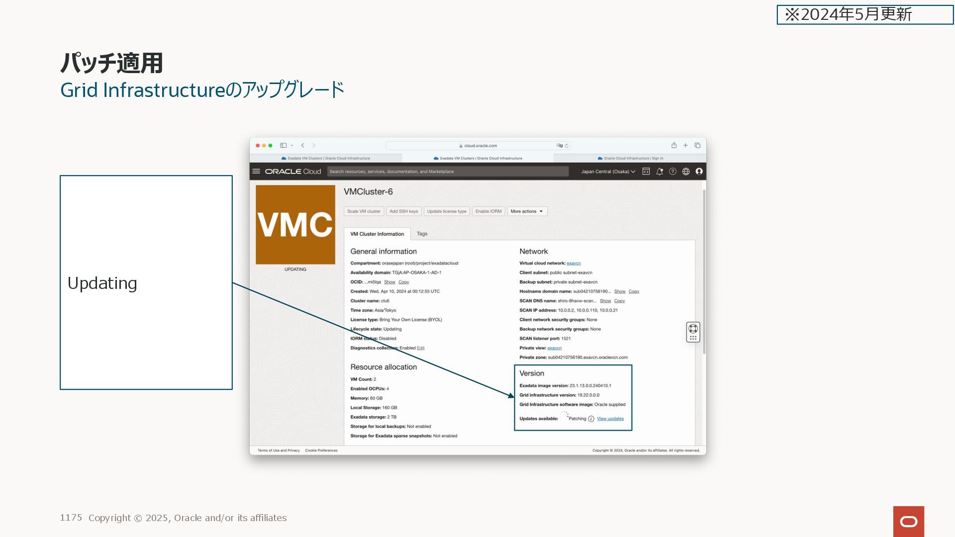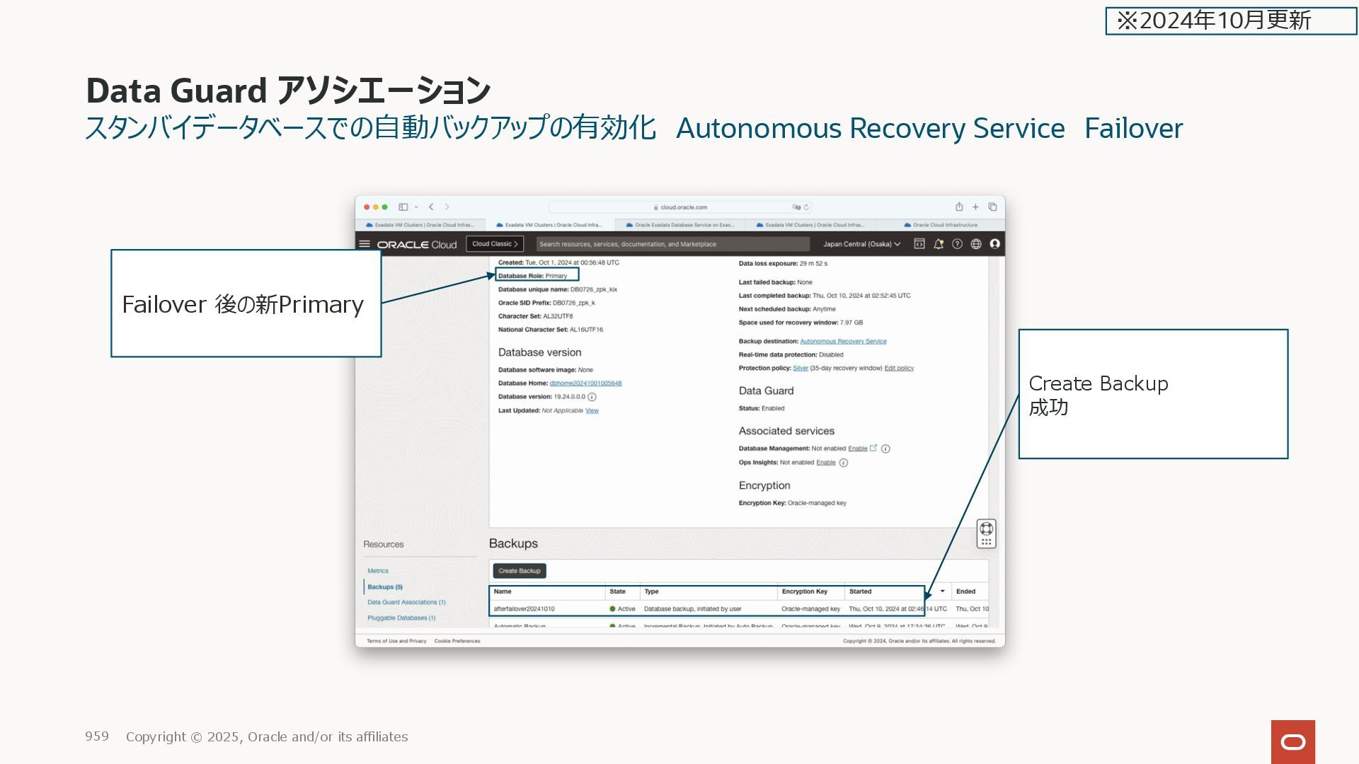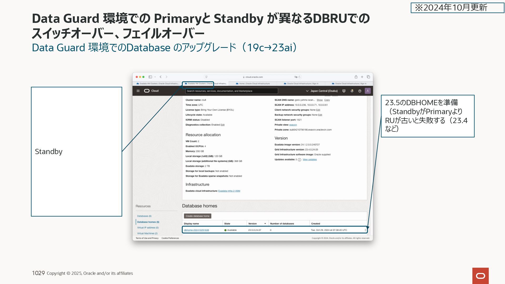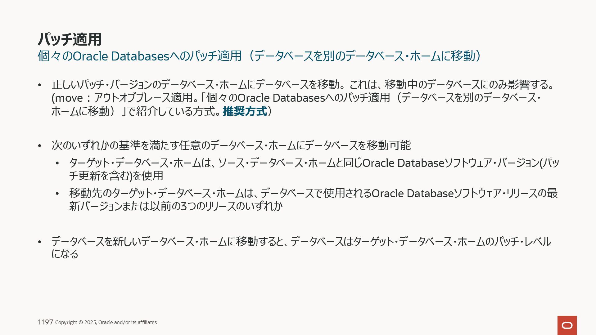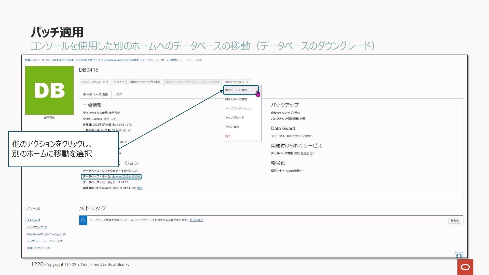 2025-04-03T01:31:51.131744+00:00 SQL> ALTER DISKGROUP DATAC2 DROP DISK 'DATAC2_CD_00_kix101117exdcl10', 'DATAC2_CD_01_kix101117exdcl10', 'DATAC2_CD_02_kix101117exdcl10', 'DATAC2_CD_03_kix101117exdcl10', 'DATAC2_CD_04_kix101117exdcl10', 'DATAC2_CD_05_kix101117exdcl10', 'DATAC2_CD_06_kix101117exdcl10', 'DATAC2_CD_07_kix101117exdcl10', 'DATAC2_CD_08_kix101117exdcl10', 'DATAC2_CD_09_kix101117exdcl10', 'DATAC2_CD_10_kix101117exdcl10', 'DATAC2_CD_11_kix101117exdcl10' REBALANCE POWER 4 略 SUCCESS: ALTER DISKGROUP RECOC2 DROP DISK 'RECOC2_CD_00_kix101117exdcl10', 'RECOC2_CD_01_kix101117exdcl10', 'RECOC2_CD_02_kix101117exdcl10', 'RECOC2_CD_03_kix101117exdcl10', 'RECOC2_CD_04_kix101117exdcl10', 'RECOC2_CD_05_kix101117exdcl10', 'RECOC2_CD_06_kix101117exdcl10', 'RECOC2_CD_07_kix101117exdcl10', 'RECOC2_CD_08_kix101117exdcl10', 'RECOC2_CD_09_kix101117exdcl10', 'RECOC2_CD_10_kix101117exdcl10', 'RECOC2_CD_11_kix101117exdcl10' REBALANCE POWER 4 NOTE: Attempting voting file refresh on diskgroup RECOC2 NOTE: Refresh completed on diskgroup RECOC2. No voting file found. 2025-04-03T01:32:19.466977+00:00 Exadata Infrastructure Copyright © 2025, Oracle and/or its affiliates 132 ※2025年4⽉更新