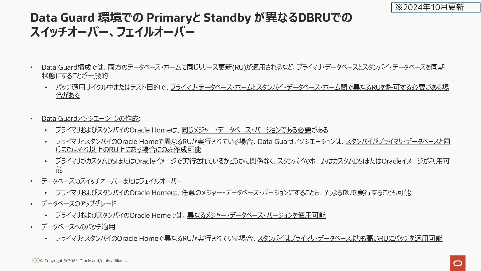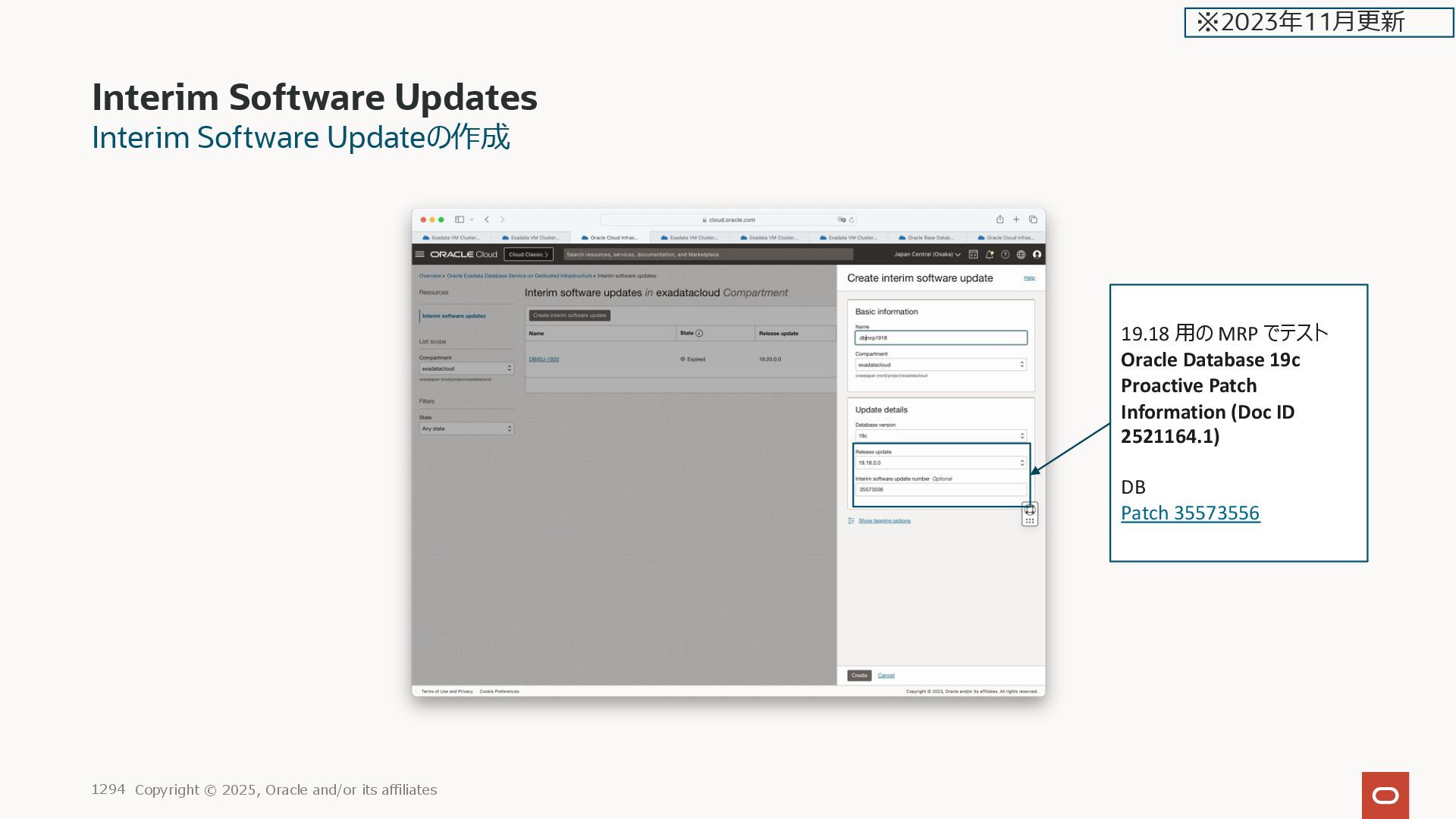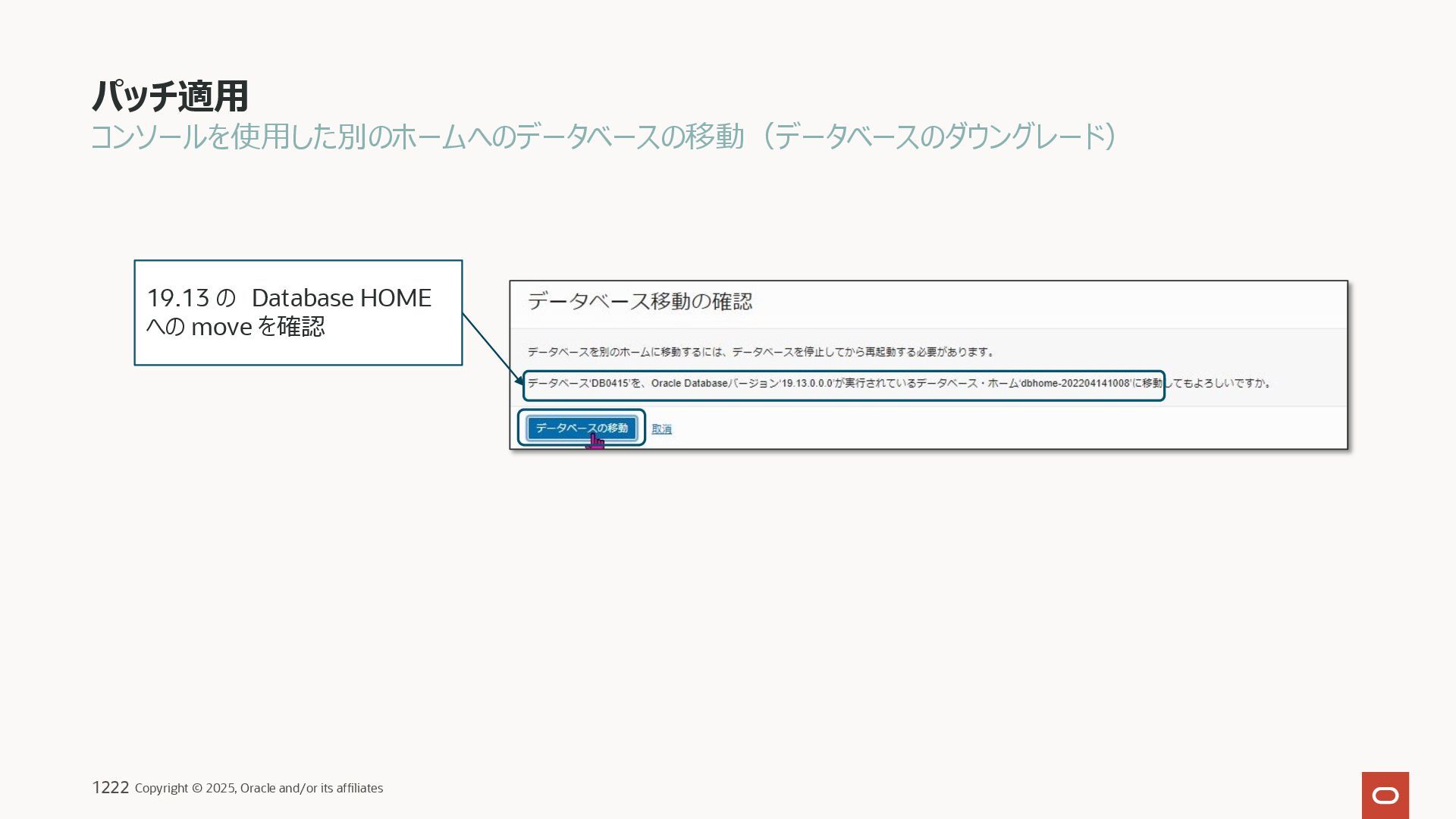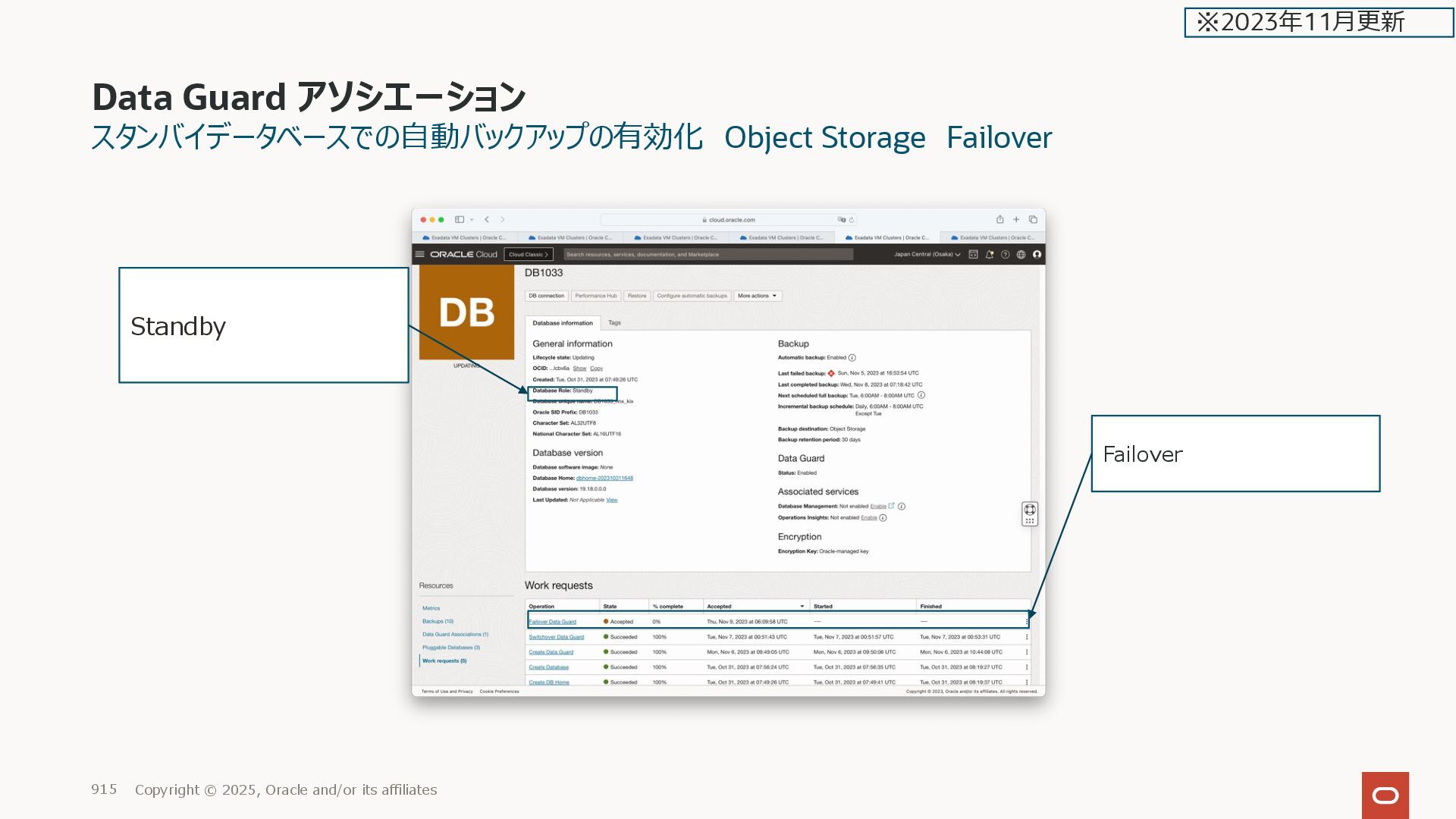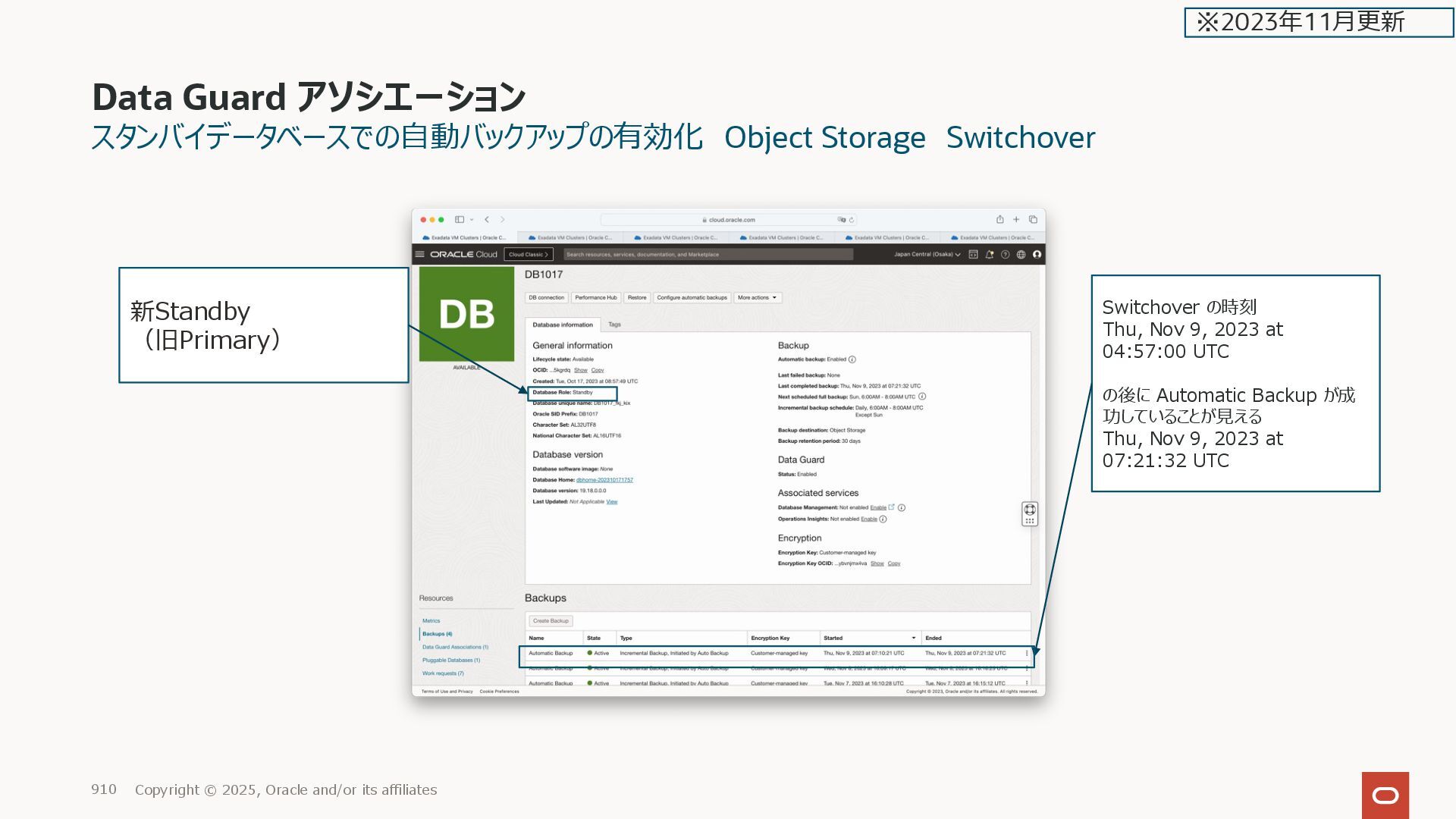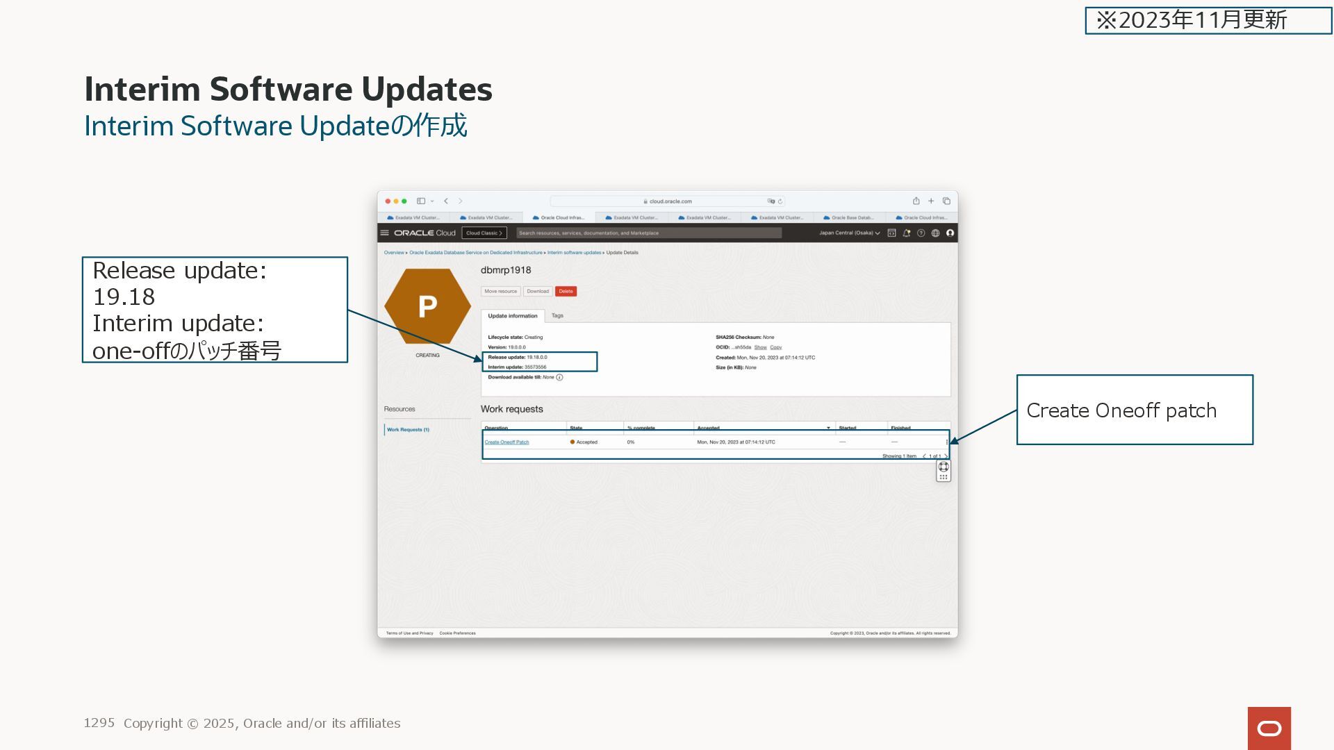 2025-04-03T01:31:51.131744+00:00 SQL> ALTER DISKGROUP DATAC2 DROP DISK 'DATAC2_CD_00_kix101117exdcl10', 'DATAC2_CD_01_kix101117exdcl10', 'DATAC2_CD_02_kix101117exdcl10', 'DATAC2_CD_03_kix101117exdcl10', 'DATAC2_CD_04_kix101117exdcl10', 'DATAC2_CD_05_kix101117exdcl10', 'DATAC2_CD_06_kix101117exdcl10', 'DATAC2_CD_07_kix101117exdcl10', 'DATAC2_CD_08_kix101117exdcl10', 'DATAC2_CD_09_kix101117exdcl10', 'DATAC2_CD_10_kix101117exdcl10', 'DATAC2_CD_11_kix101117exdcl10' REBALANCE POWER 4 略 SUCCESS: ALTER DISKGROUP RECOC2 DROP DISK 'RECOC2_CD_00_kix101117exdcl10', 'RECOC2_CD_01_kix101117exdcl10', 'RECOC2_CD_02_kix101117exdcl10', 'RECOC2_CD_03_kix101117exdcl10', 'RECOC2_CD_04_kix101117exdcl10', 'RECOC2_CD_05_kix101117exdcl10', 'RECOC2_CD_06_kix101117exdcl10', 'RECOC2_CD_07_kix101117exdcl10', 'RECOC2_CD_08_kix101117exdcl10', 'RECOC2_CD_09_kix101117exdcl10', 'RECOC2_CD_10_kix101117exdcl10', 'RECOC2_CD_11_kix101117exdcl10' REBALANCE POWER 4 NOTE: Attempting voting file refresh on diskgroup RECOC2 NOTE: Refresh completed on diskgroup RECOC2. No voting file found. 2025-04-03T01:32:19.466977+00:00 Exadata Infrastructure Copyright © 2025, Oracle and/or its affiliates 132 ※2025年4⽉更新