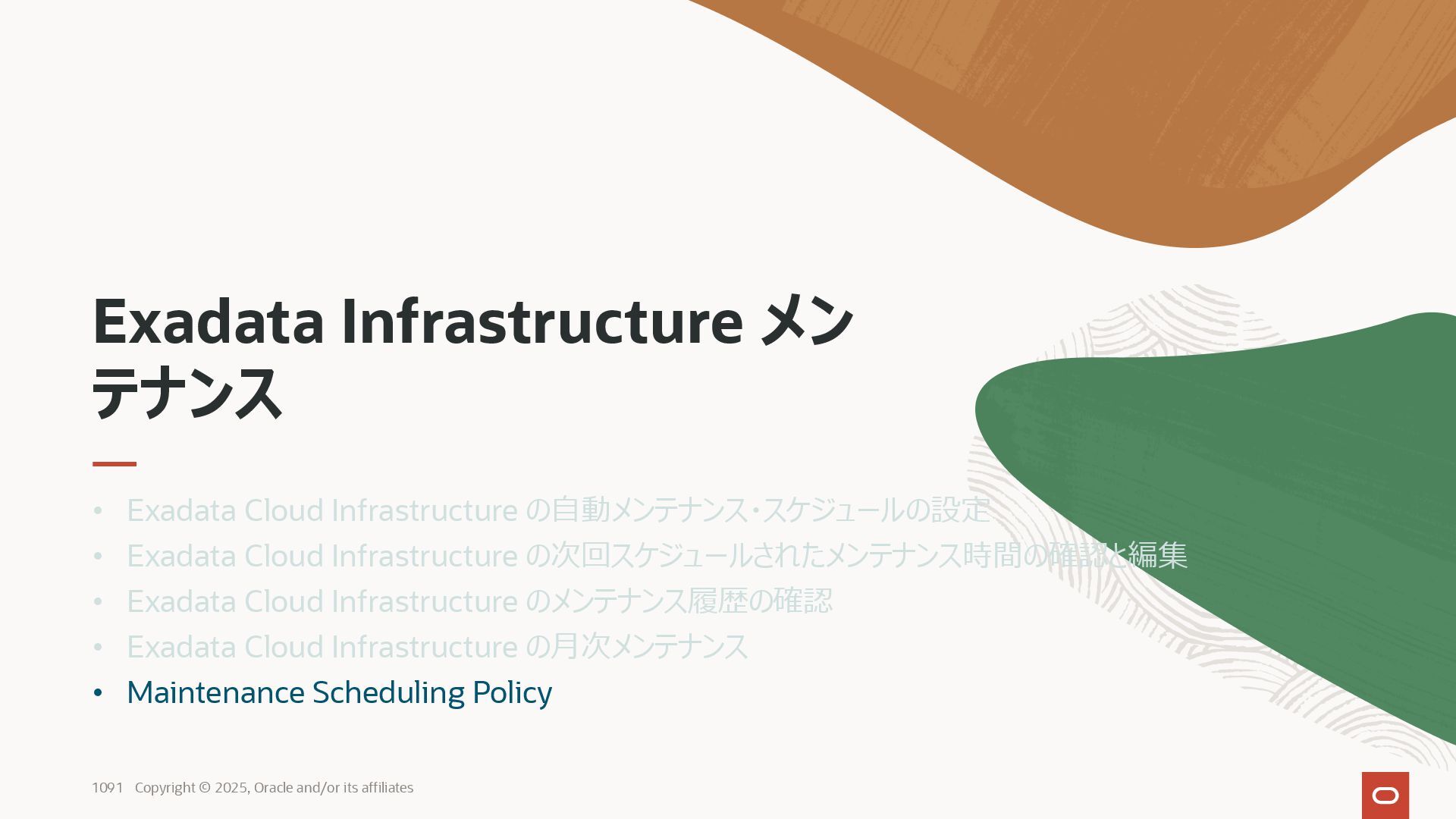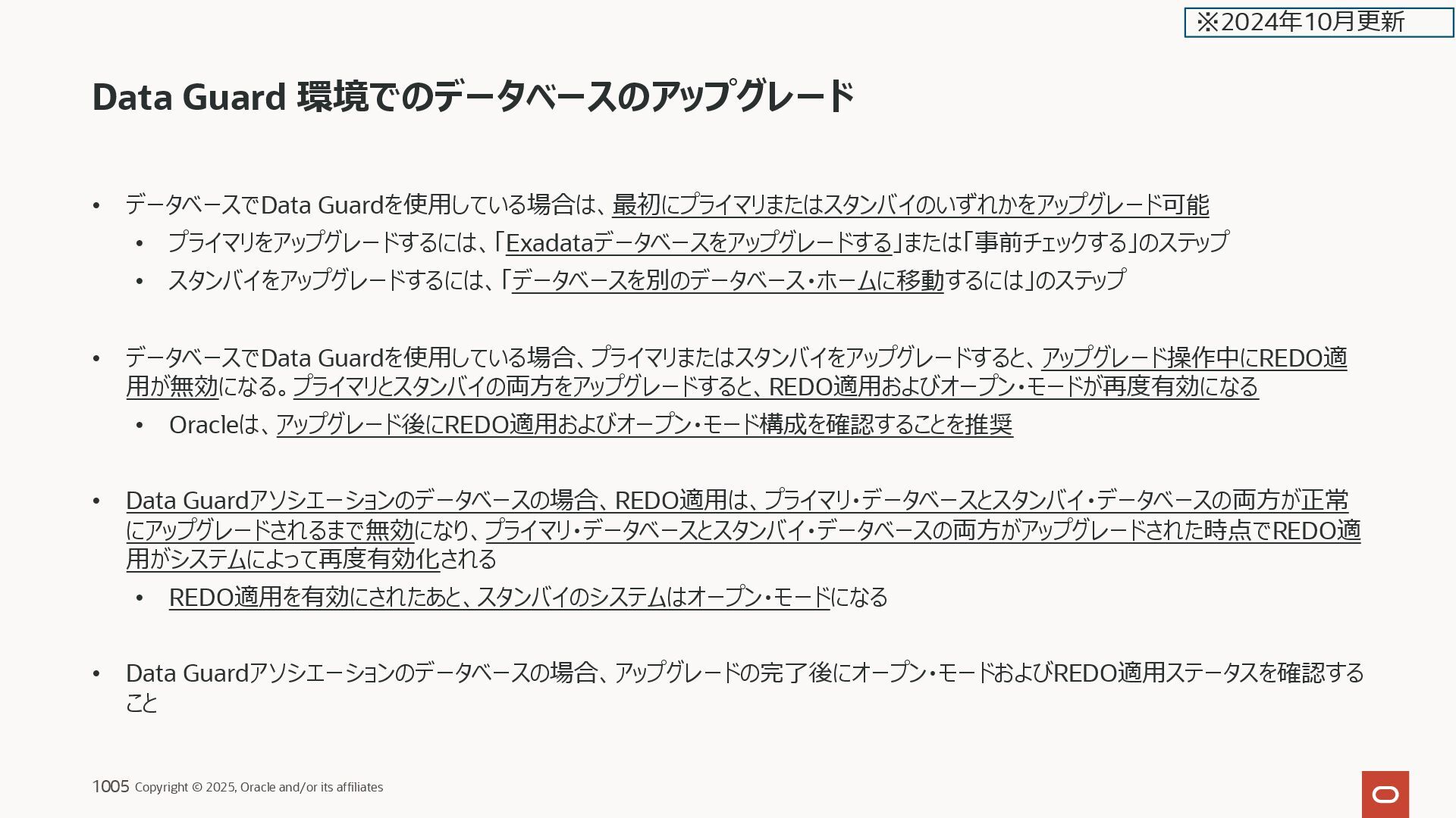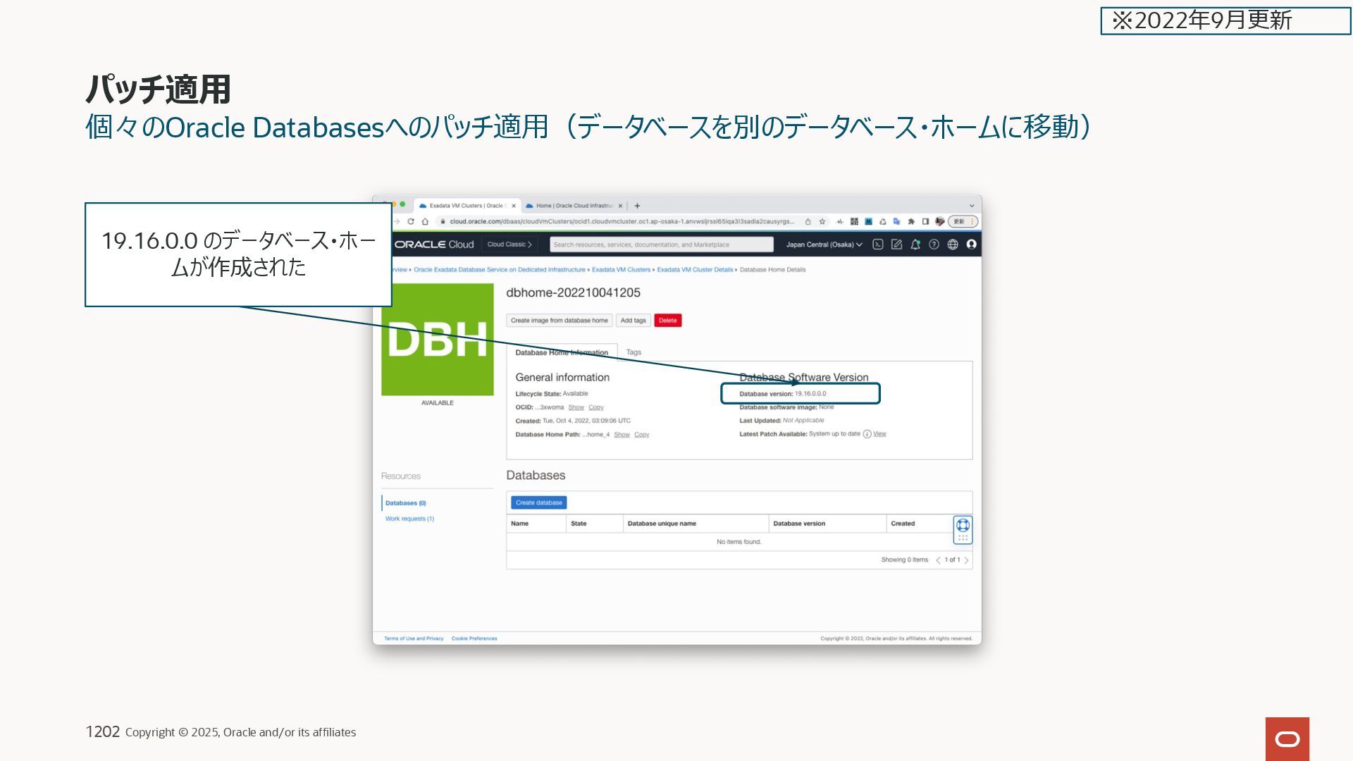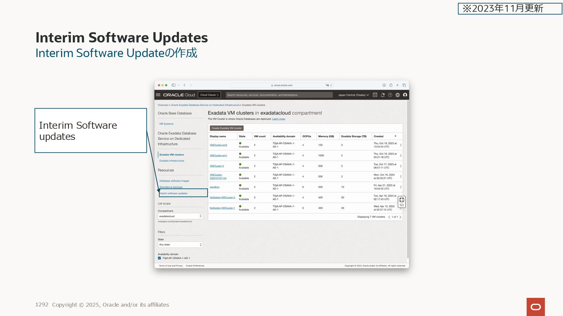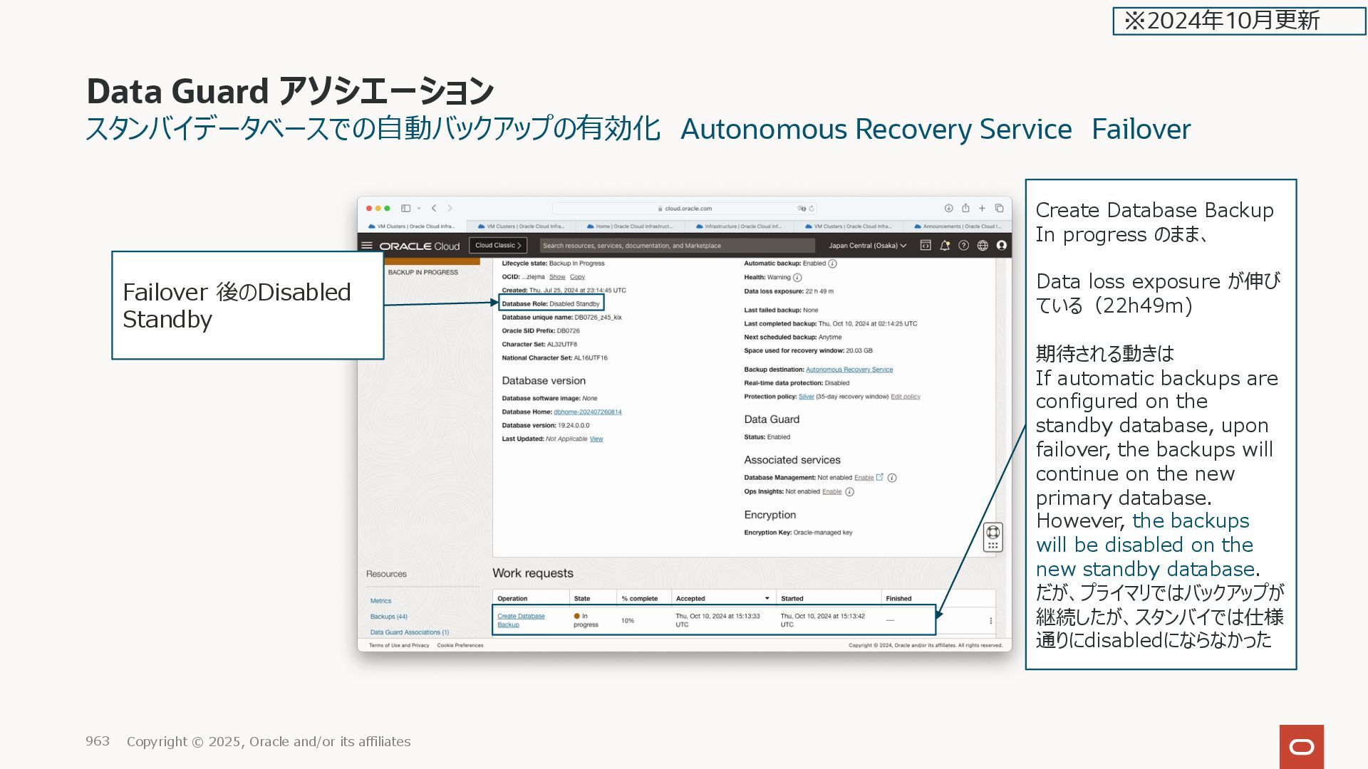 2025-04-03T01:31:51.131744+00:00 SQL> ALTER DISKGROUP DATAC2 DROP DISK 'DATAC2_CD_00_kix101117exdcl10', 'DATAC2_CD_01_kix101117exdcl10', 'DATAC2_CD_02_kix101117exdcl10', 'DATAC2_CD_03_kix101117exdcl10', 'DATAC2_CD_04_kix101117exdcl10', 'DATAC2_CD_05_kix101117exdcl10', 'DATAC2_CD_06_kix101117exdcl10', 'DATAC2_CD_07_kix101117exdcl10', 'DATAC2_CD_08_kix101117exdcl10', 'DATAC2_CD_09_kix101117exdcl10', 'DATAC2_CD_10_kix101117exdcl10', 'DATAC2_CD_11_kix101117exdcl10' REBALANCE POWER 4 略 SUCCESS: ALTER DISKGROUP RECOC2 DROP DISK 'RECOC2_CD_00_kix101117exdcl10', 'RECOC2_CD_01_kix101117exdcl10', 'RECOC2_CD_02_kix101117exdcl10', 'RECOC2_CD_03_kix101117exdcl10', 'RECOC2_CD_04_kix101117exdcl10', 'RECOC2_CD_05_kix101117exdcl10', 'RECOC2_CD_06_kix101117exdcl10', 'RECOC2_CD_07_kix101117exdcl10', 'RECOC2_CD_08_kix101117exdcl10', 'RECOC2_CD_09_kix101117exdcl10', 'RECOC2_CD_10_kix101117exdcl10', 'RECOC2_CD_11_kix101117exdcl10' REBALANCE POWER 4 NOTE: Attempting voting file refresh on diskgroup RECOC2 NOTE: Refresh completed on diskgroup RECOC2. No voting file found. 2025-04-03T01:32:19.466977+00:00 Exadata Infrastructure Copyright © 2025, Oracle and/or its affiliates 132 ※2025年4⽉更新