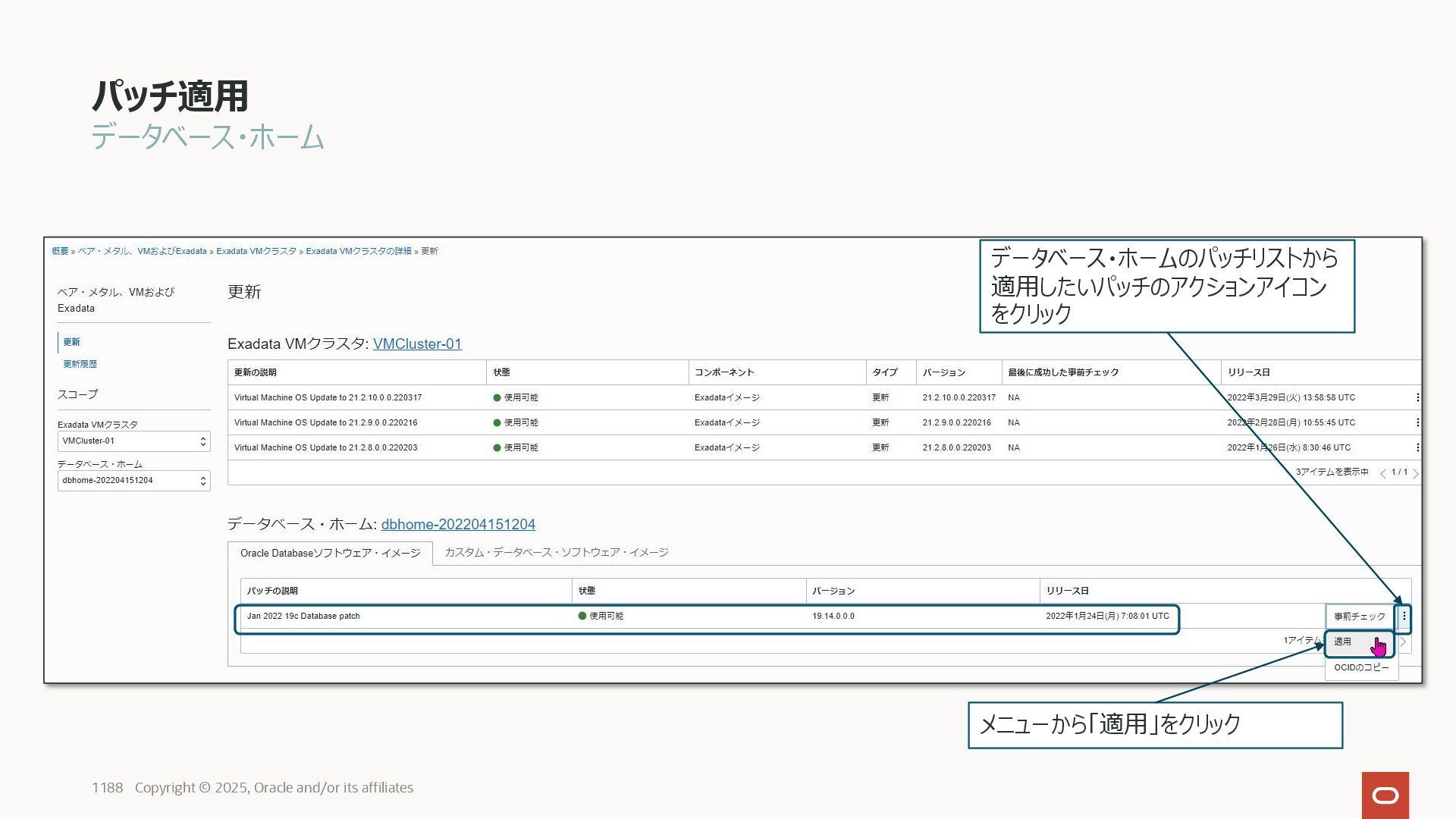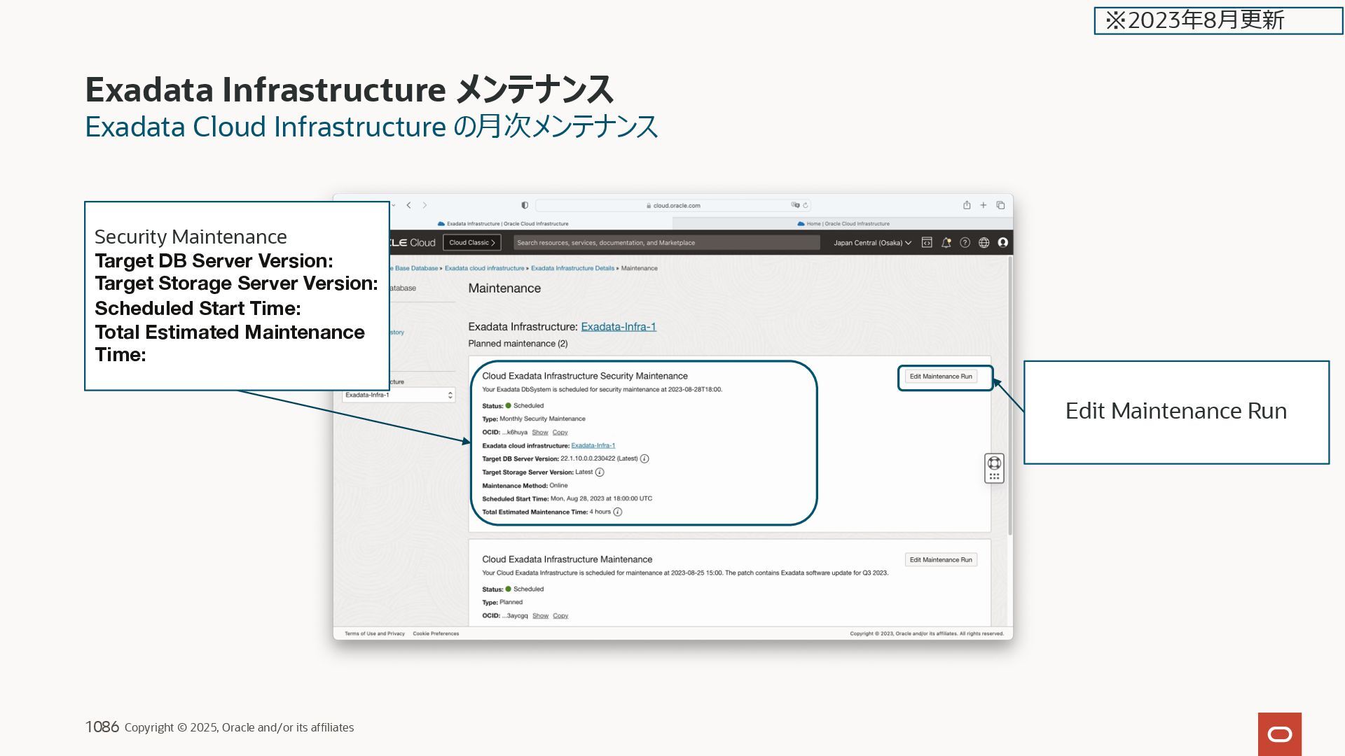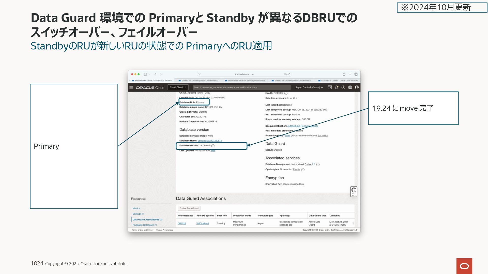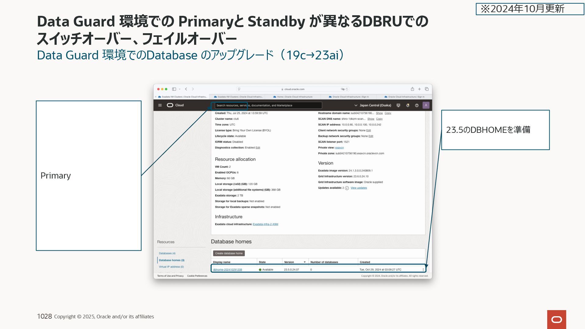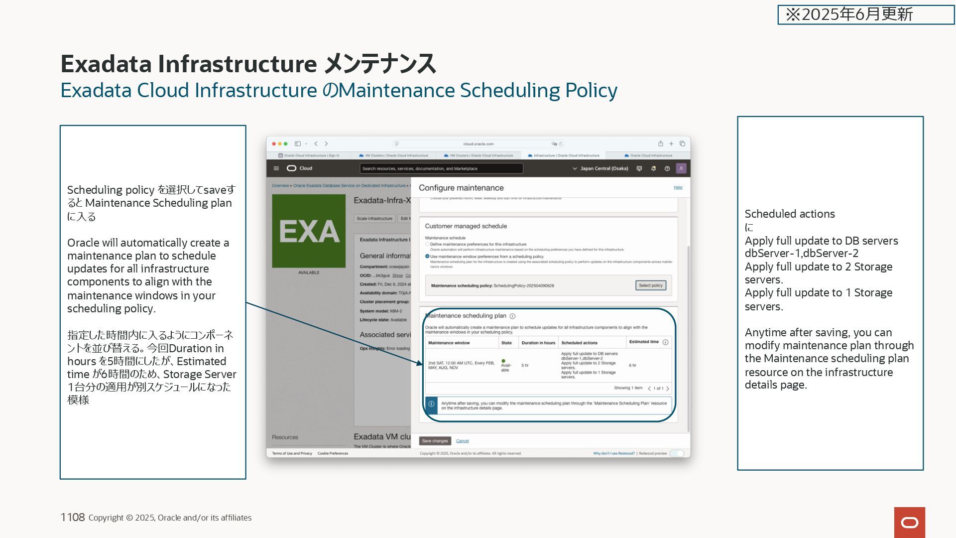 2025-04-03T01:31:51.131744+00:00 SQL> ALTER DISKGROUP DATAC2 DROP DISK 'DATAC2_CD_00_kix101117exdcl10', 'DATAC2_CD_01_kix101117exdcl10', 'DATAC2_CD_02_kix101117exdcl10', 'DATAC2_CD_03_kix101117exdcl10', 'DATAC2_CD_04_kix101117exdcl10', 'DATAC2_CD_05_kix101117exdcl10', 'DATAC2_CD_06_kix101117exdcl10', 'DATAC2_CD_07_kix101117exdcl10', 'DATAC2_CD_08_kix101117exdcl10', 'DATAC2_CD_09_kix101117exdcl10', 'DATAC2_CD_10_kix101117exdcl10', 'DATAC2_CD_11_kix101117exdcl10' REBALANCE POWER 4 略 SUCCESS: ALTER DISKGROUP RECOC2 DROP DISK 'RECOC2_CD_00_kix101117exdcl10', 'RECOC2_CD_01_kix101117exdcl10', 'RECOC2_CD_02_kix101117exdcl10', 'RECOC2_CD_03_kix101117exdcl10', 'RECOC2_CD_04_kix101117exdcl10', 'RECOC2_CD_05_kix101117exdcl10', 'RECOC2_CD_06_kix101117exdcl10', 'RECOC2_CD_07_kix101117exdcl10', 'RECOC2_CD_08_kix101117exdcl10', 'RECOC2_CD_09_kix101117exdcl10', 'RECOC2_CD_10_kix101117exdcl10', 'RECOC2_CD_11_kix101117exdcl10' REBALANCE POWER 4 NOTE: Attempting voting file refresh on diskgroup RECOC2 NOTE: Refresh completed on diskgroup RECOC2. No voting file found. 2025-04-03T01:32:19.466977+00:00 Exadata Infrastructure Copyright © 2025, Oracle and/or its affiliates 132 ※2025年4⽉更新