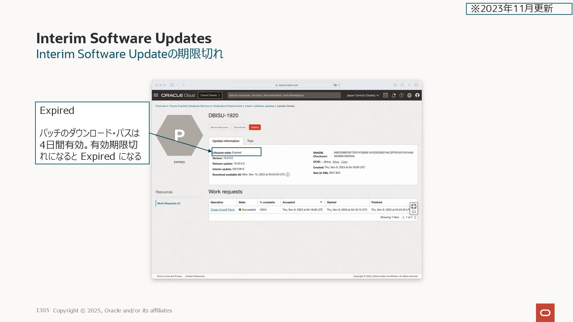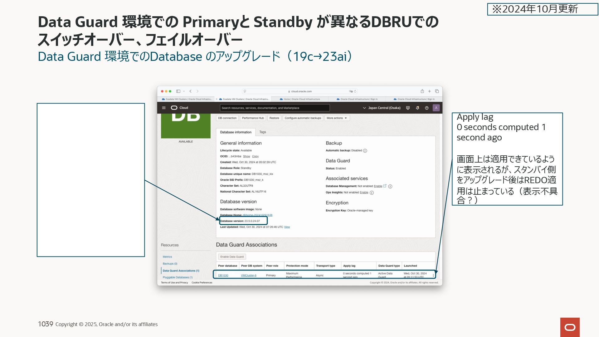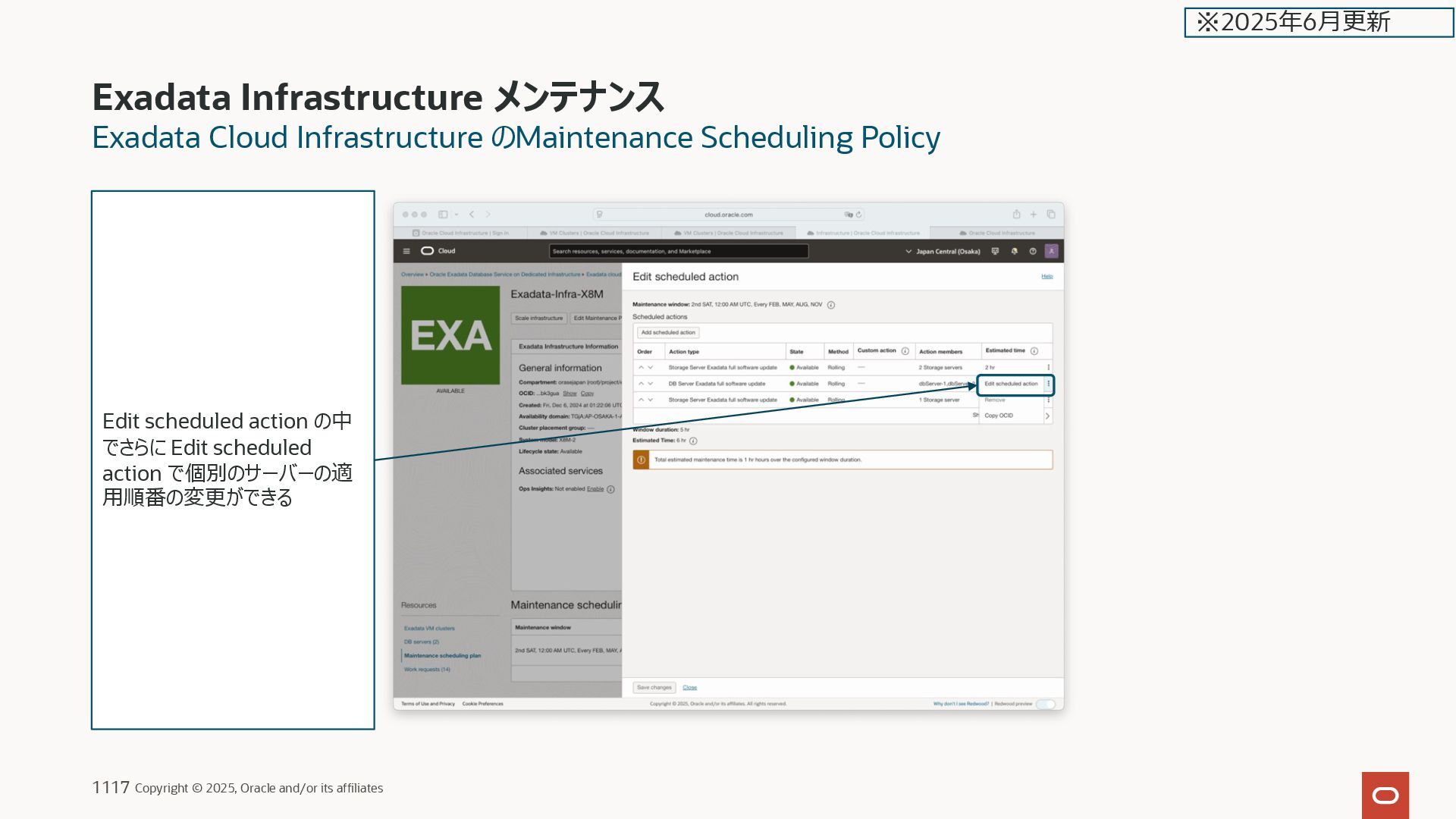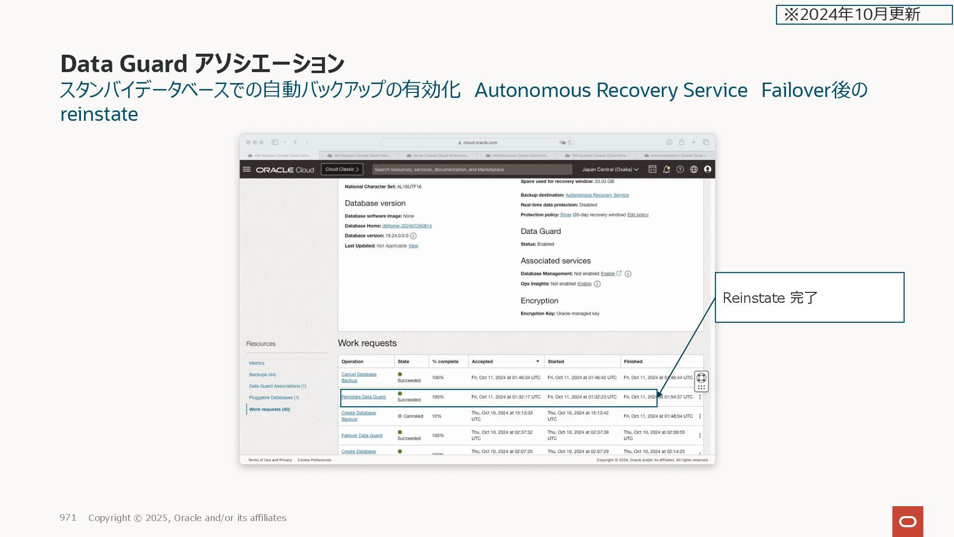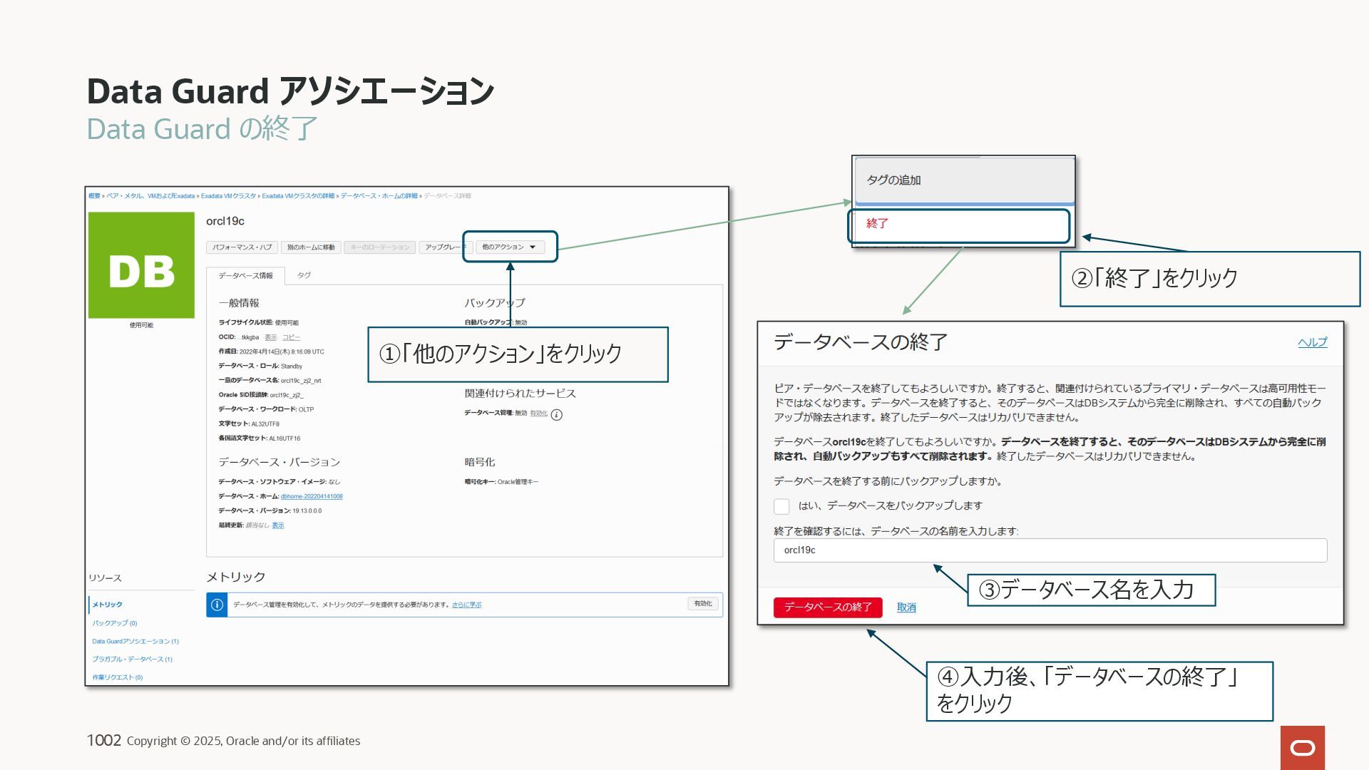 2025-04-03T01:31:51.131744+00:00 SQL> ALTER DISKGROUP DATAC2 DROP DISK 'DATAC2_CD_00_kix101117exdcl10', 'DATAC2_CD_01_kix101117exdcl10', 'DATAC2_CD_02_kix101117exdcl10', 'DATAC2_CD_03_kix101117exdcl10', 'DATAC2_CD_04_kix101117exdcl10', 'DATAC2_CD_05_kix101117exdcl10', 'DATAC2_CD_06_kix101117exdcl10', 'DATAC2_CD_07_kix101117exdcl10', 'DATAC2_CD_08_kix101117exdcl10', 'DATAC2_CD_09_kix101117exdcl10', 'DATAC2_CD_10_kix101117exdcl10', 'DATAC2_CD_11_kix101117exdcl10' REBALANCE POWER 4 略 SUCCESS: ALTER DISKGROUP RECOC2 DROP DISK 'RECOC2_CD_00_kix101117exdcl10', 'RECOC2_CD_01_kix101117exdcl10', 'RECOC2_CD_02_kix101117exdcl10', 'RECOC2_CD_03_kix101117exdcl10', 'RECOC2_CD_04_kix101117exdcl10', 'RECOC2_CD_05_kix101117exdcl10', 'RECOC2_CD_06_kix101117exdcl10', 'RECOC2_CD_07_kix101117exdcl10', 'RECOC2_CD_08_kix101117exdcl10', 'RECOC2_CD_09_kix101117exdcl10', 'RECOC2_CD_10_kix101117exdcl10', 'RECOC2_CD_11_kix101117exdcl10' REBALANCE POWER 4 NOTE: Attempting voting file refresh on diskgroup RECOC2 NOTE: Refresh completed on diskgroup RECOC2. No voting file found. 2025-04-03T01:32:19.466977+00:00 Exadata Infrastructure Copyright © 2025, Oracle and/or its affiliates 132 ※2025年4⽉更新