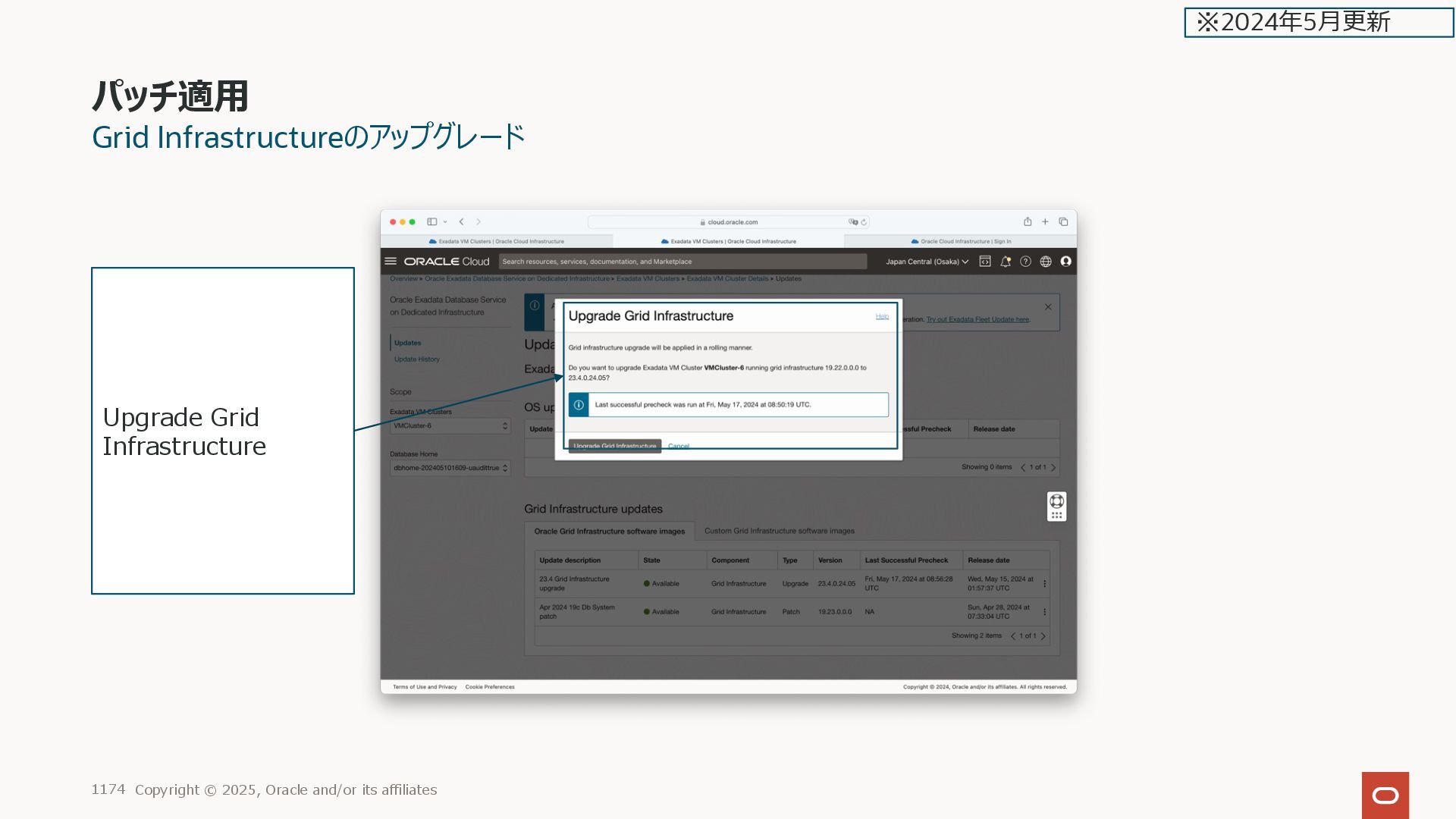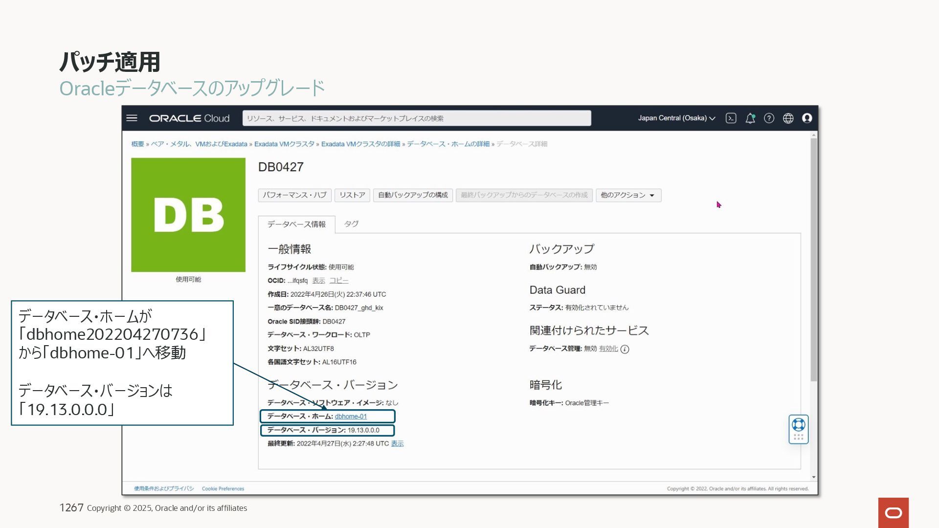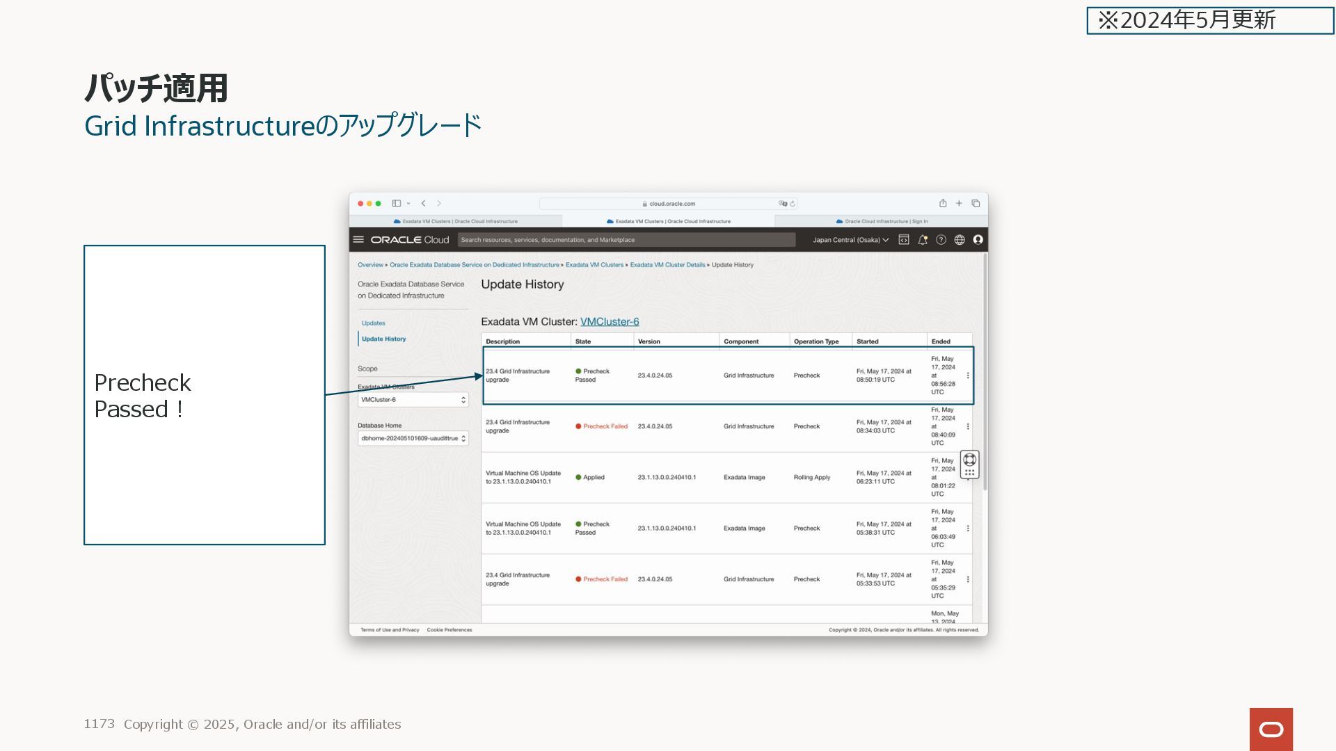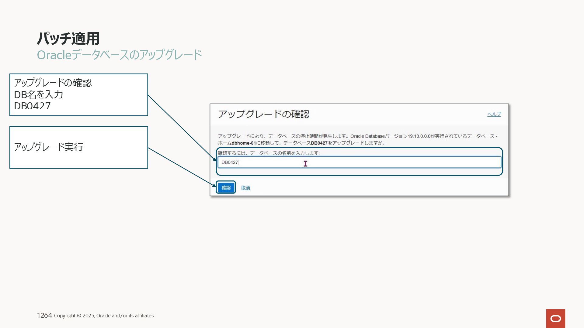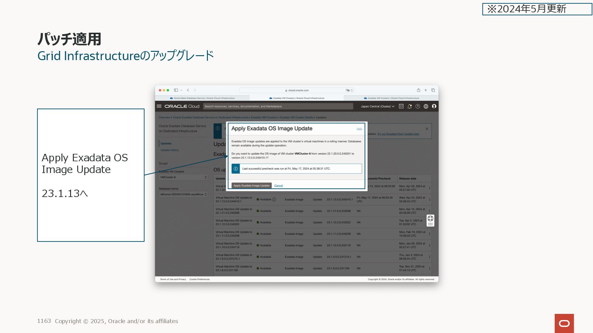 2025-04-03T01:31:51.131744+00:00 SQL> ALTER DISKGROUP DATAC2 DROP DISK 'DATAC2_CD_00_kix101117exdcl10', 'DATAC2_CD_01_kix101117exdcl10', 'DATAC2_CD_02_kix101117exdcl10', 'DATAC2_CD_03_kix101117exdcl10', 'DATAC2_CD_04_kix101117exdcl10', 'DATAC2_CD_05_kix101117exdcl10', 'DATAC2_CD_06_kix101117exdcl10', 'DATAC2_CD_07_kix101117exdcl10', 'DATAC2_CD_08_kix101117exdcl10', 'DATAC2_CD_09_kix101117exdcl10', 'DATAC2_CD_10_kix101117exdcl10', 'DATAC2_CD_11_kix101117exdcl10' REBALANCE POWER 4 略 SUCCESS: ALTER DISKGROUP RECOC2 DROP DISK 'RECOC2_CD_00_kix101117exdcl10', 'RECOC2_CD_01_kix101117exdcl10', 'RECOC2_CD_02_kix101117exdcl10', 'RECOC2_CD_03_kix101117exdcl10', 'RECOC2_CD_04_kix101117exdcl10', 'RECOC2_CD_05_kix101117exdcl10', 'RECOC2_CD_06_kix101117exdcl10', 'RECOC2_CD_07_kix101117exdcl10', 'RECOC2_CD_08_kix101117exdcl10', 'RECOC2_CD_09_kix101117exdcl10', 'RECOC2_CD_10_kix101117exdcl10', 'RECOC2_CD_11_kix101117exdcl10' REBALANCE POWER 4 NOTE: Attempting voting file refresh on diskgroup RECOC2 NOTE: Refresh completed on diskgroup RECOC2. No voting file found. 2025-04-03T01:32:19.466977+00:00 Exadata Infrastructure Copyright © 2025, Oracle and/or its affiliates 132 ※2025年4⽉更新