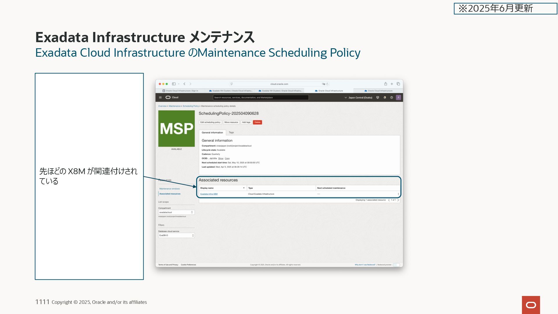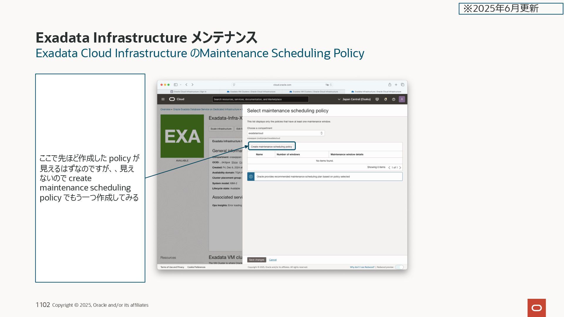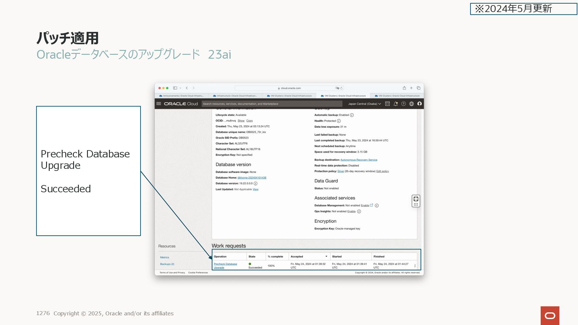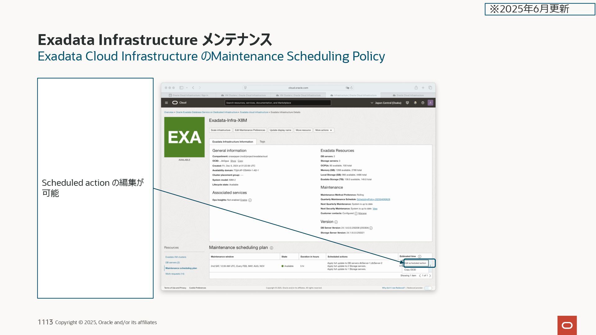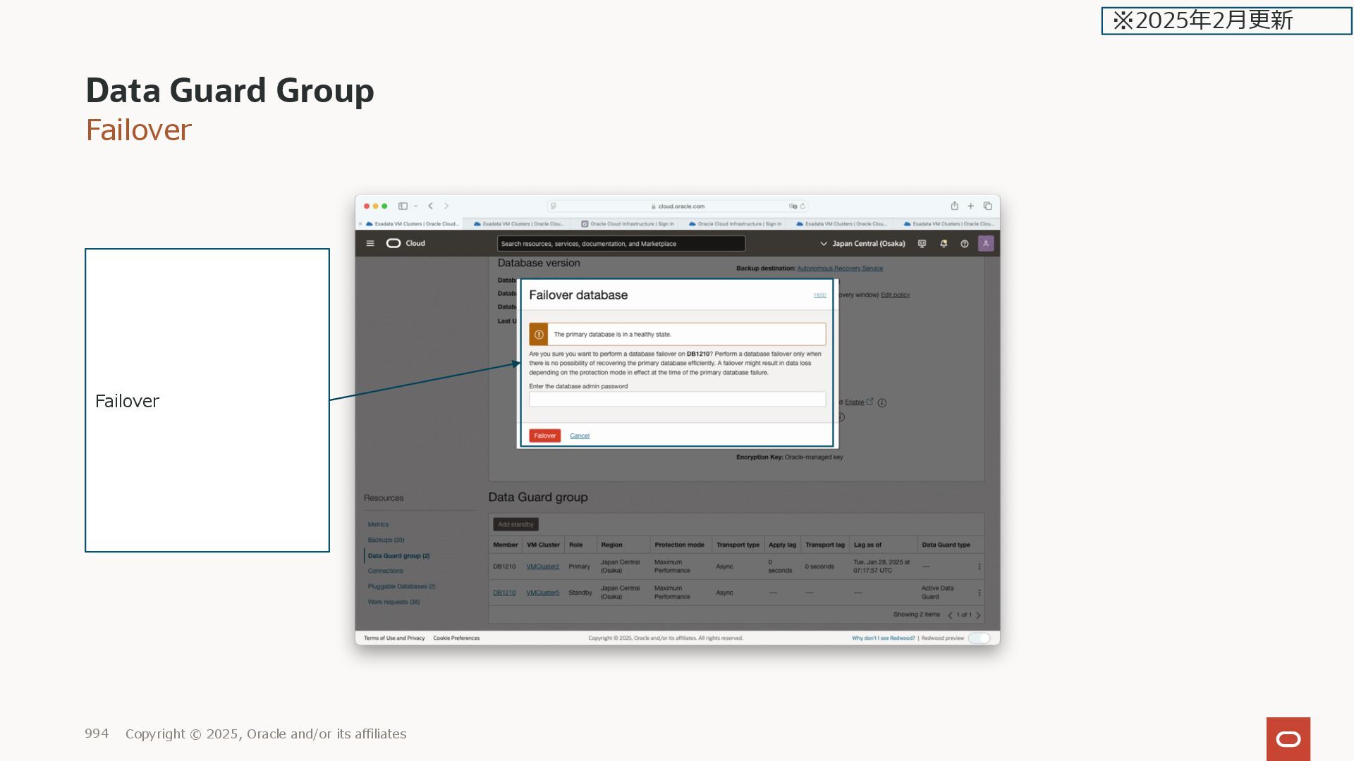 2025-04-03T01:31:51.131744+00:00 SQL> ALTER DISKGROUP DATAC2 DROP DISK 'DATAC2_CD_00_kix101117exdcl10', 'DATAC2_CD_01_kix101117exdcl10', 'DATAC2_CD_02_kix101117exdcl10', 'DATAC2_CD_03_kix101117exdcl10', 'DATAC2_CD_04_kix101117exdcl10', 'DATAC2_CD_05_kix101117exdcl10', 'DATAC2_CD_06_kix101117exdcl10', 'DATAC2_CD_07_kix101117exdcl10', 'DATAC2_CD_08_kix101117exdcl10', 'DATAC2_CD_09_kix101117exdcl10', 'DATAC2_CD_10_kix101117exdcl10', 'DATAC2_CD_11_kix101117exdcl10' REBALANCE POWER 4 略 SUCCESS: ALTER DISKGROUP RECOC2 DROP DISK 'RECOC2_CD_00_kix101117exdcl10', 'RECOC2_CD_01_kix101117exdcl10', 'RECOC2_CD_02_kix101117exdcl10', 'RECOC2_CD_03_kix101117exdcl10', 'RECOC2_CD_04_kix101117exdcl10', 'RECOC2_CD_05_kix101117exdcl10', 'RECOC2_CD_06_kix101117exdcl10', 'RECOC2_CD_07_kix101117exdcl10', 'RECOC2_CD_08_kix101117exdcl10', 'RECOC2_CD_09_kix101117exdcl10', 'RECOC2_CD_10_kix101117exdcl10', 'RECOC2_CD_11_kix101117exdcl10' REBALANCE POWER 4 NOTE: Attempting voting file refresh on diskgroup RECOC2 NOTE: Refresh completed on diskgroup RECOC2. No voting file found. 2025-04-03T01:32:19.466977+00:00 Exadata Infrastructure Copyright © 2025, Oracle and/or its affiliates 132 ※2025年4⽉更新