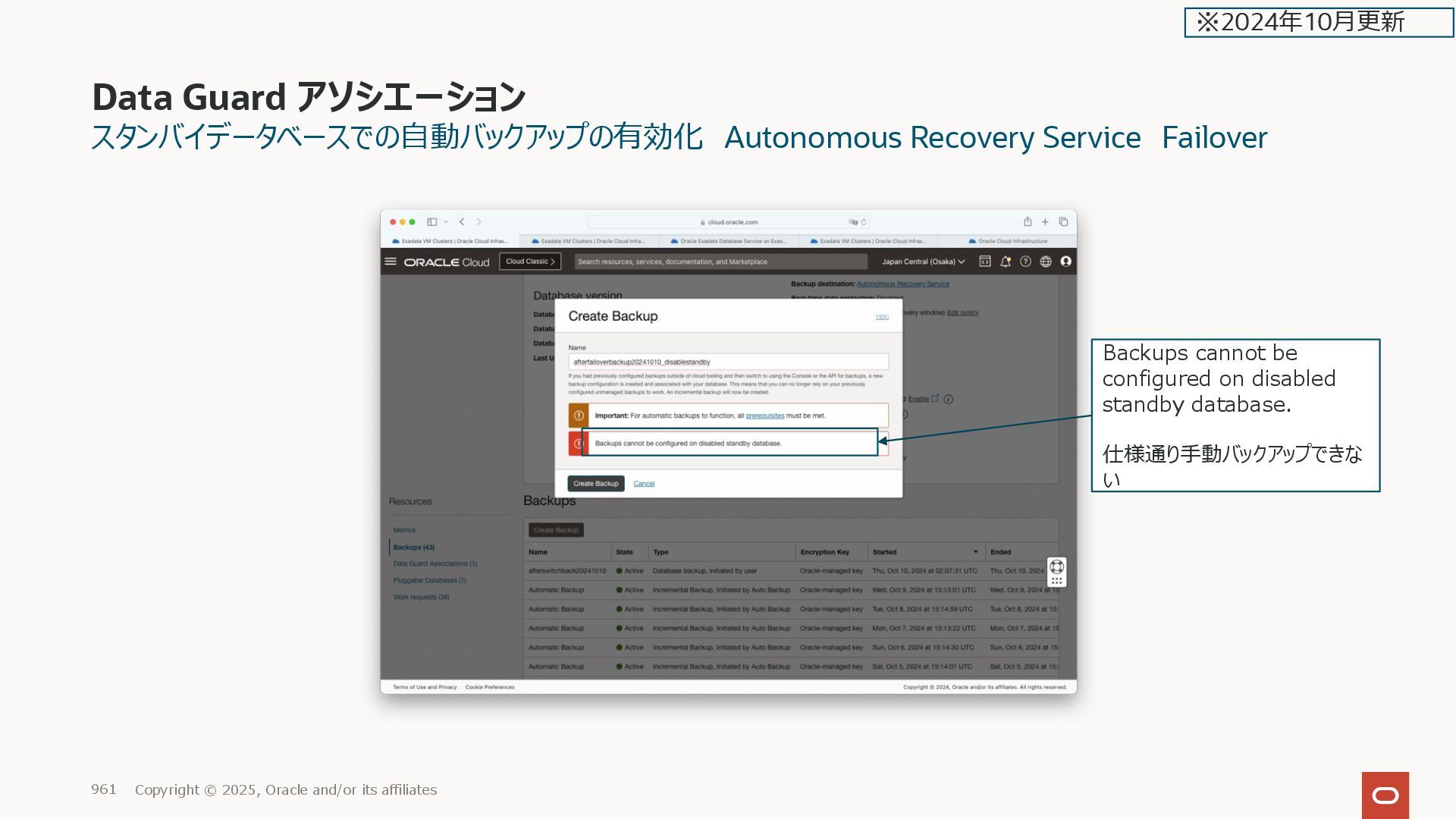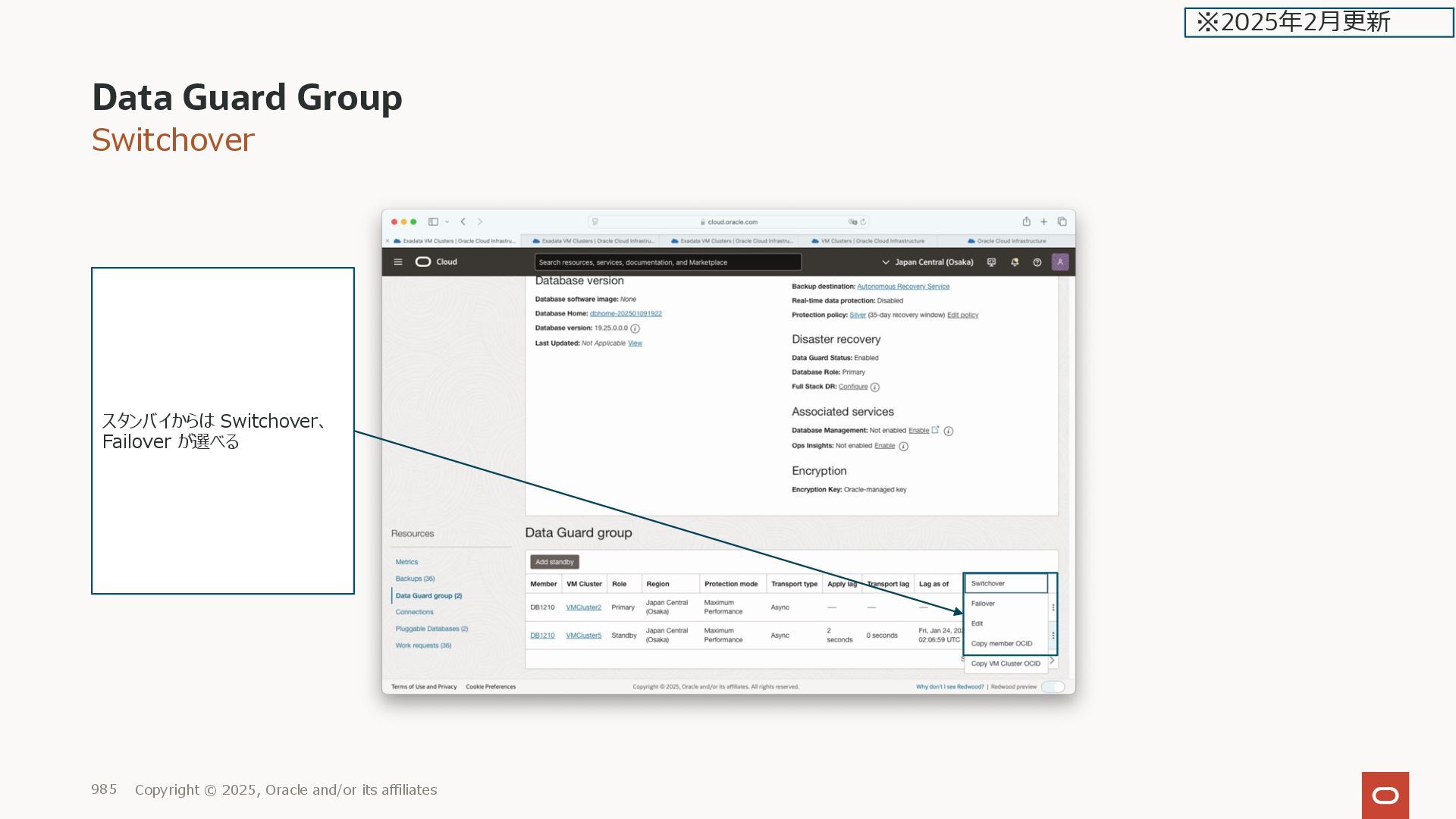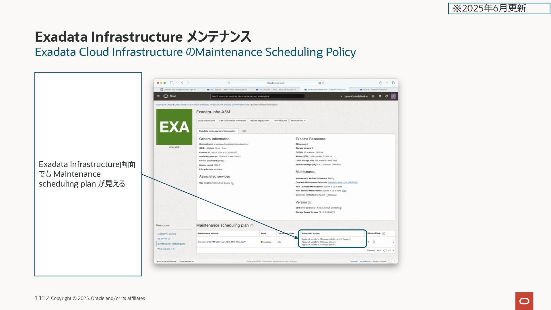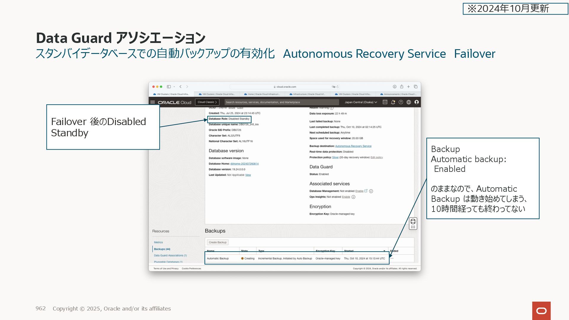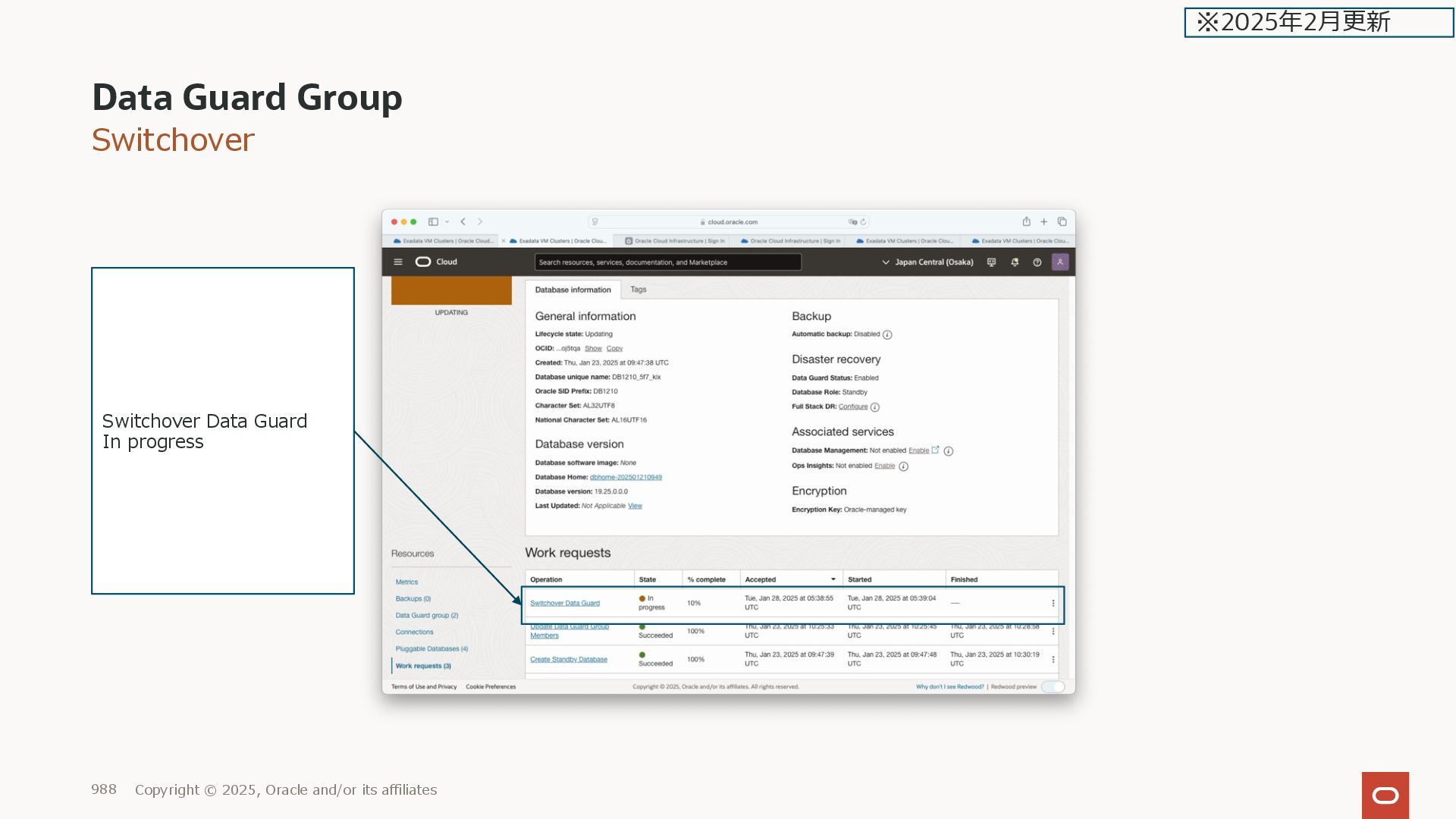 2025-04-03T01:31:51.131744+00:00 SQL> ALTER DISKGROUP DATAC2 DROP DISK 'DATAC2_CD_00_kix101117exdcl10', 'DATAC2_CD_01_kix101117exdcl10', 'DATAC2_CD_02_kix101117exdcl10', 'DATAC2_CD_03_kix101117exdcl10', 'DATAC2_CD_04_kix101117exdcl10', 'DATAC2_CD_05_kix101117exdcl10', 'DATAC2_CD_06_kix101117exdcl10', 'DATAC2_CD_07_kix101117exdcl10', 'DATAC2_CD_08_kix101117exdcl10', 'DATAC2_CD_09_kix101117exdcl10', 'DATAC2_CD_10_kix101117exdcl10', 'DATAC2_CD_11_kix101117exdcl10' REBALANCE POWER 4 略 SUCCESS: ALTER DISKGROUP RECOC2 DROP DISK 'RECOC2_CD_00_kix101117exdcl10', 'RECOC2_CD_01_kix101117exdcl10', 'RECOC2_CD_02_kix101117exdcl10', 'RECOC2_CD_03_kix101117exdcl10', 'RECOC2_CD_04_kix101117exdcl10', 'RECOC2_CD_05_kix101117exdcl10', 'RECOC2_CD_06_kix101117exdcl10', 'RECOC2_CD_07_kix101117exdcl10', 'RECOC2_CD_08_kix101117exdcl10', 'RECOC2_CD_09_kix101117exdcl10', 'RECOC2_CD_10_kix101117exdcl10', 'RECOC2_CD_11_kix101117exdcl10' REBALANCE POWER 4 NOTE: Attempting voting file refresh on diskgroup RECOC2 NOTE: Refresh completed on diskgroup RECOC2. No voting file found. 2025-04-03T01:32:19.466977+00:00 Exadata Infrastructure Copyright © 2025, Oracle and/or its affiliates 132 ※2025年4⽉更新