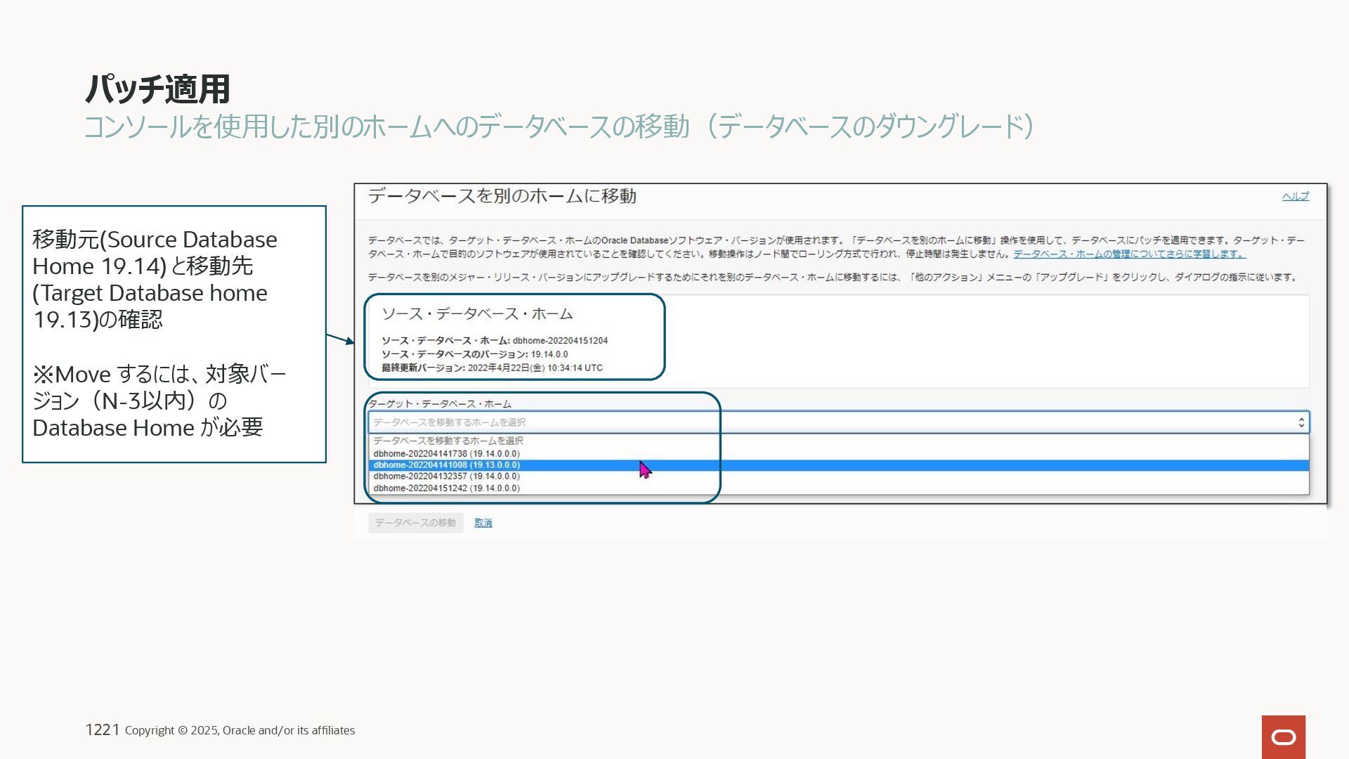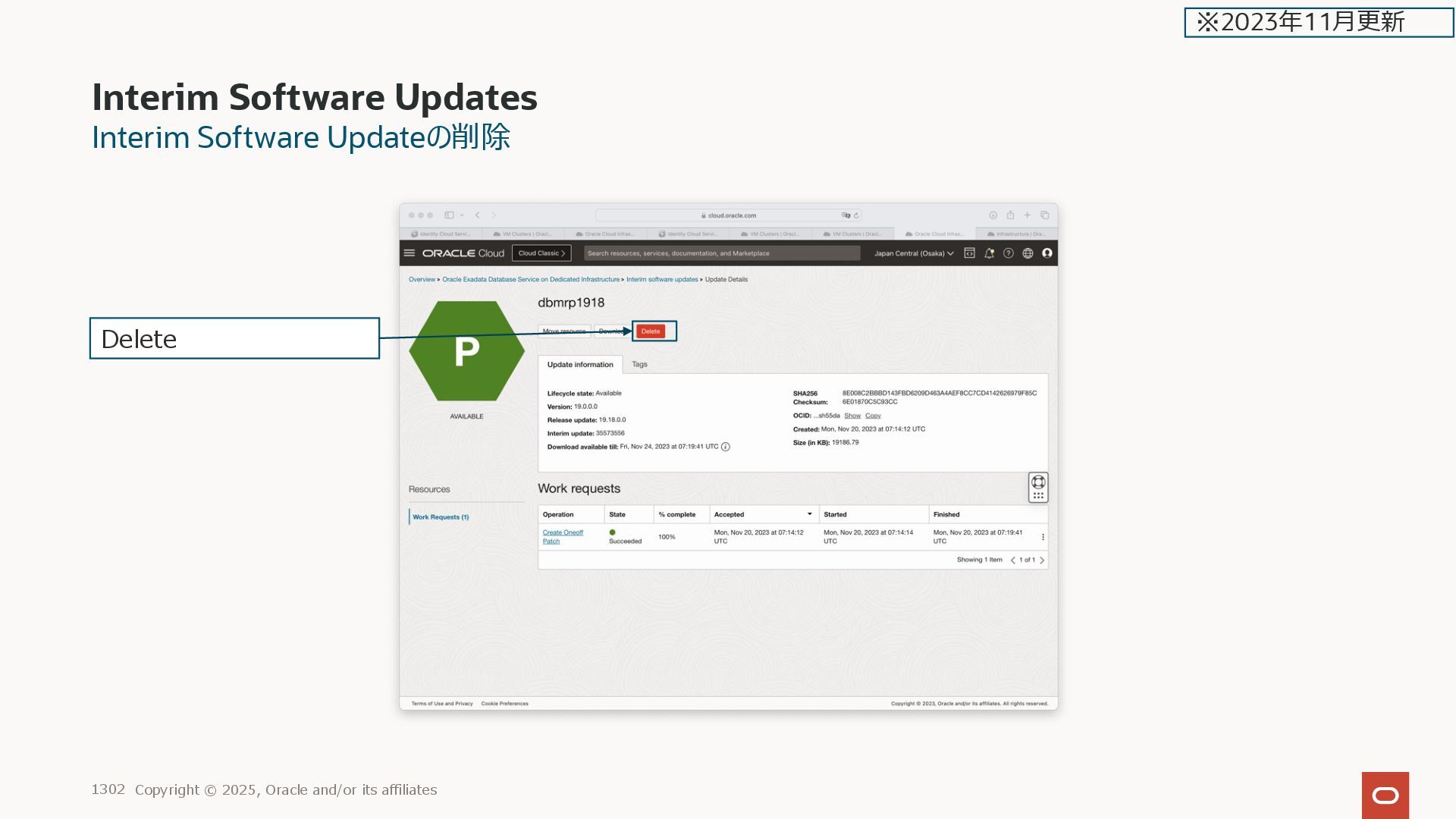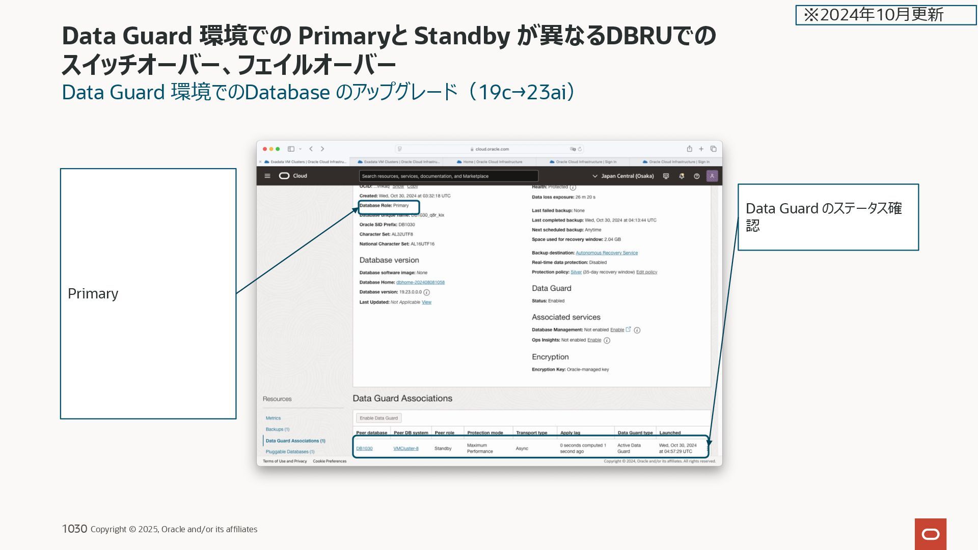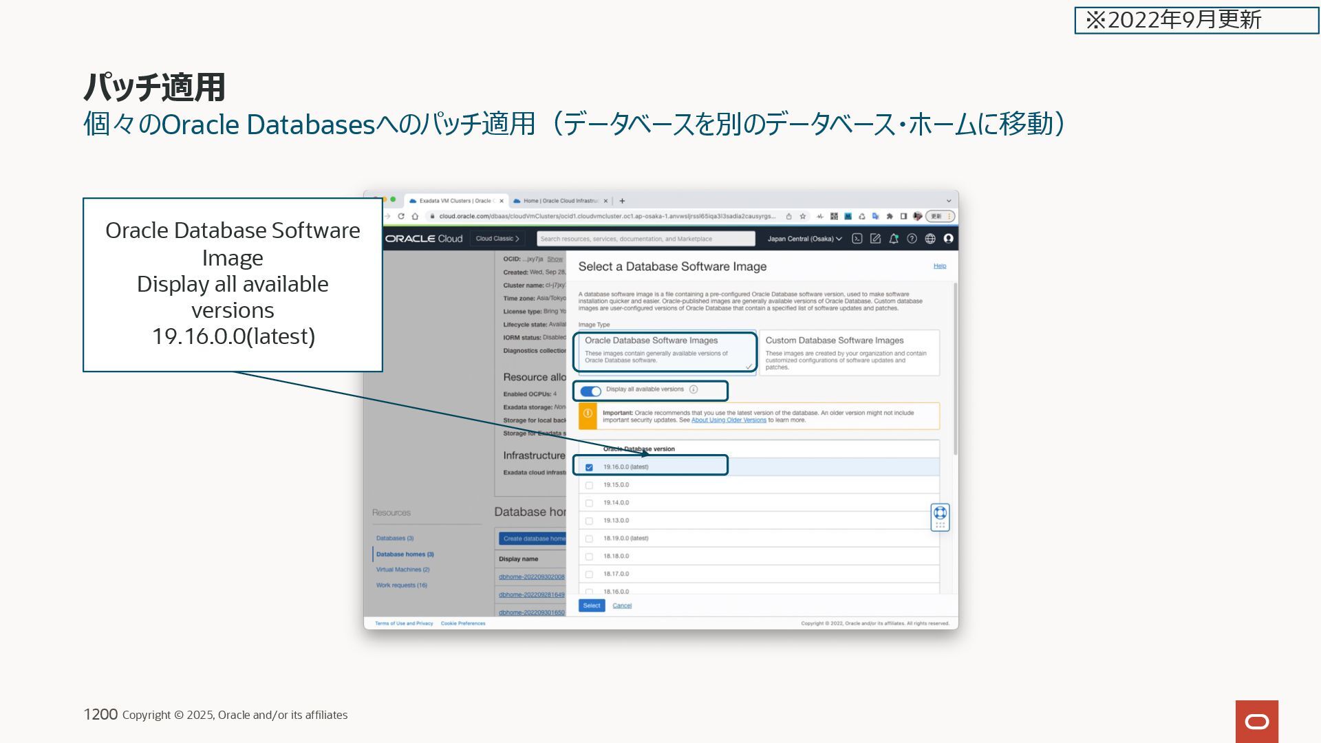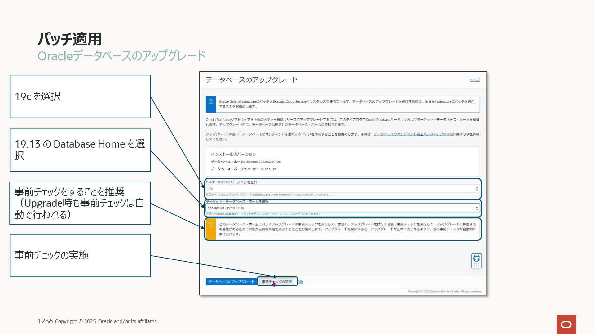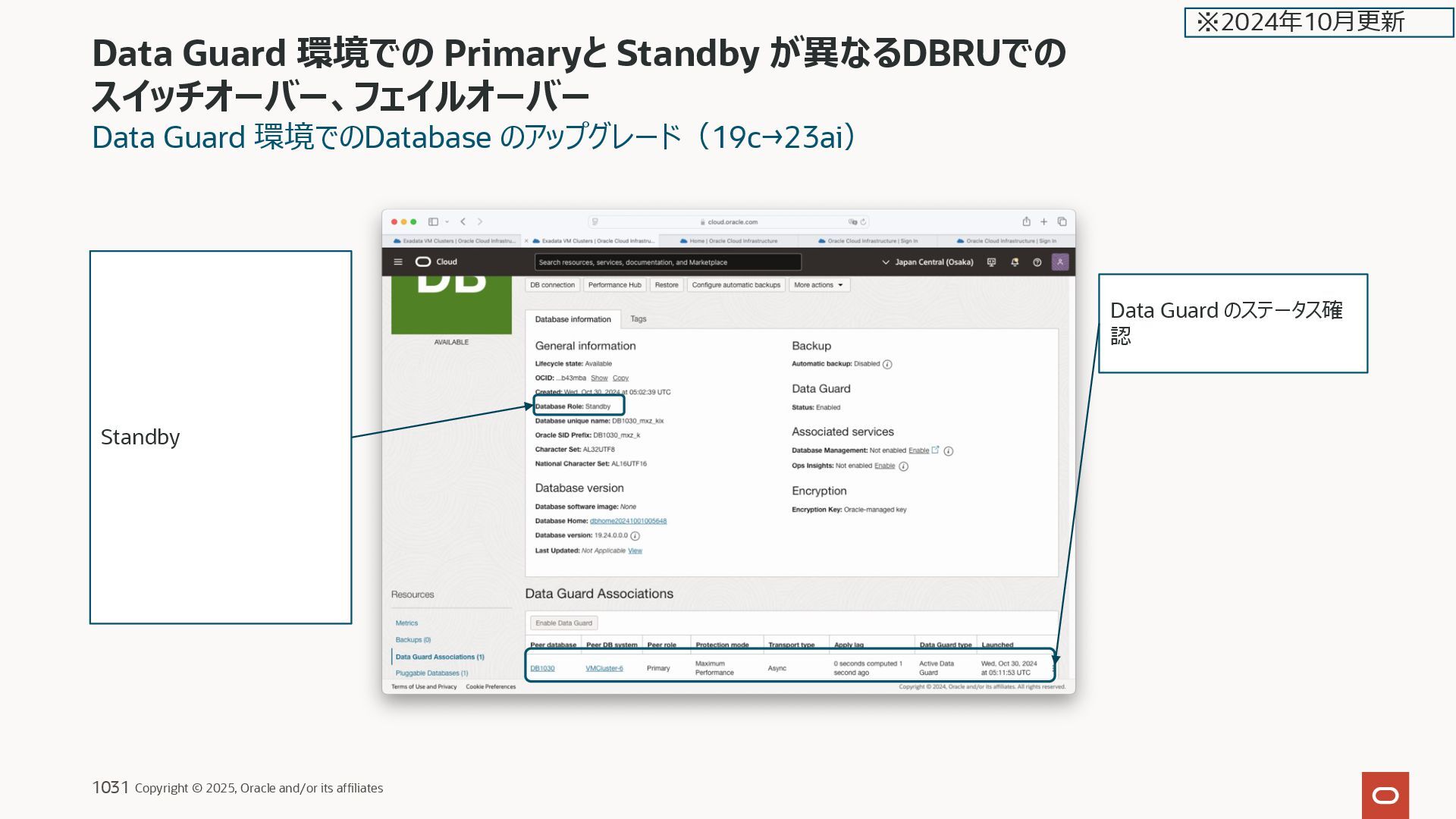 2025-04-03T01:31:51.131744+00:00 SQL> ALTER DISKGROUP DATAC2 DROP DISK 'DATAC2_CD_00_kix101117exdcl10', 'DATAC2_CD_01_kix101117exdcl10', 'DATAC2_CD_02_kix101117exdcl10', 'DATAC2_CD_03_kix101117exdcl10', 'DATAC2_CD_04_kix101117exdcl10', 'DATAC2_CD_05_kix101117exdcl10', 'DATAC2_CD_06_kix101117exdcl10', 'DATAC2_CD_07_kix101117exdcl10', 'DATAC2_CD_08_kix101117exdcl10', 'DATAC2_CD_09_kix101117exdcl10', 'DATAC2_CD_10_kix101117exdcl10', 'DATAC2_CD_11_kix101117exdcl10' REBALANCE POWER 4 略 SUCCESS: ALTER DISKGROUP RECOC2 DROP DISK 'RECOC2_CD_00_kix101117exdcl10', 'RECOC2_CD_01_kix101117exdcl10', 'RECOC2_CD_02_kix101117exdcl10', 'RECOC2_CD_03_kix101117exdcl10', 'RECOC2_CD_04_kix101117exdcl10', 'RECOC2_CD_05_kix101117exdcl10', 'RECOC2_CD_06_kix101117exdcl10', 'RECOC2_CD_07_kix101117exdcl10', 'RECOC2_CD_08_kix101117exdcl10', 'RECOC2_CD_09_kix101117exdcl10', 'RECOC2_CD_10_kix101117exdcl10', 'RECOC2_CD_11_kix101117exdcl10' REBALANCE POWER 4 NOTE: Attempting voting file refresh on diskgroup RECOC2 NOTE: Refresh completed on diskgroup RECOC2. No voting file found. 2025-04-03T01:32:19.466977+00:00 Exadata Infrastructure Copyright © 2025, Oracle and/or its affiliates 132 ※2025年4⽉更新