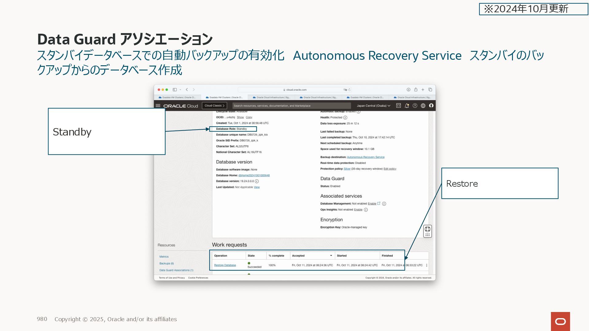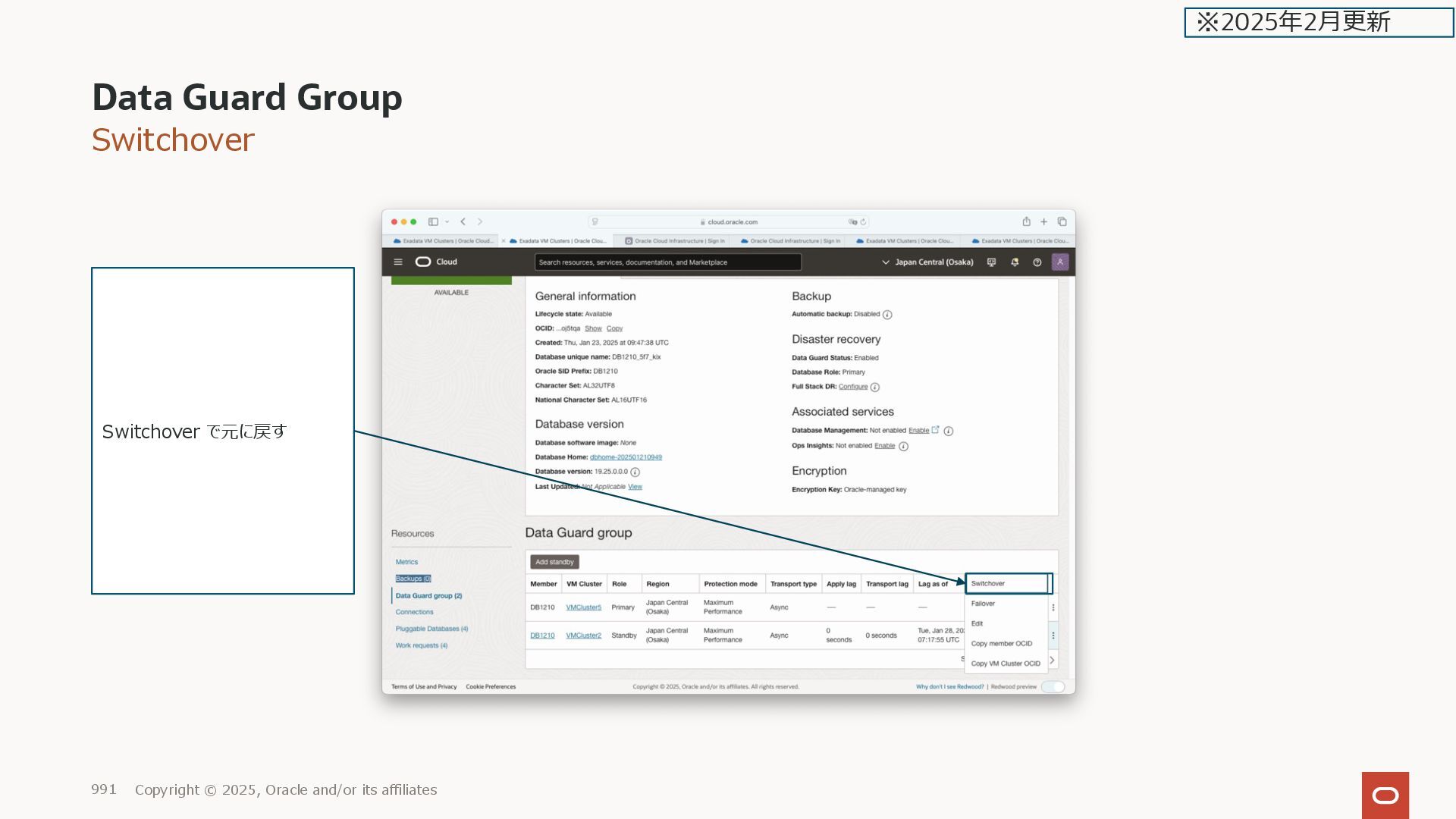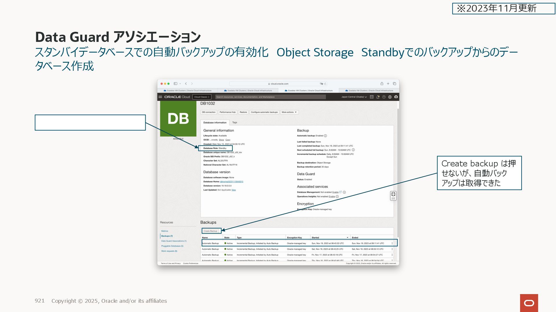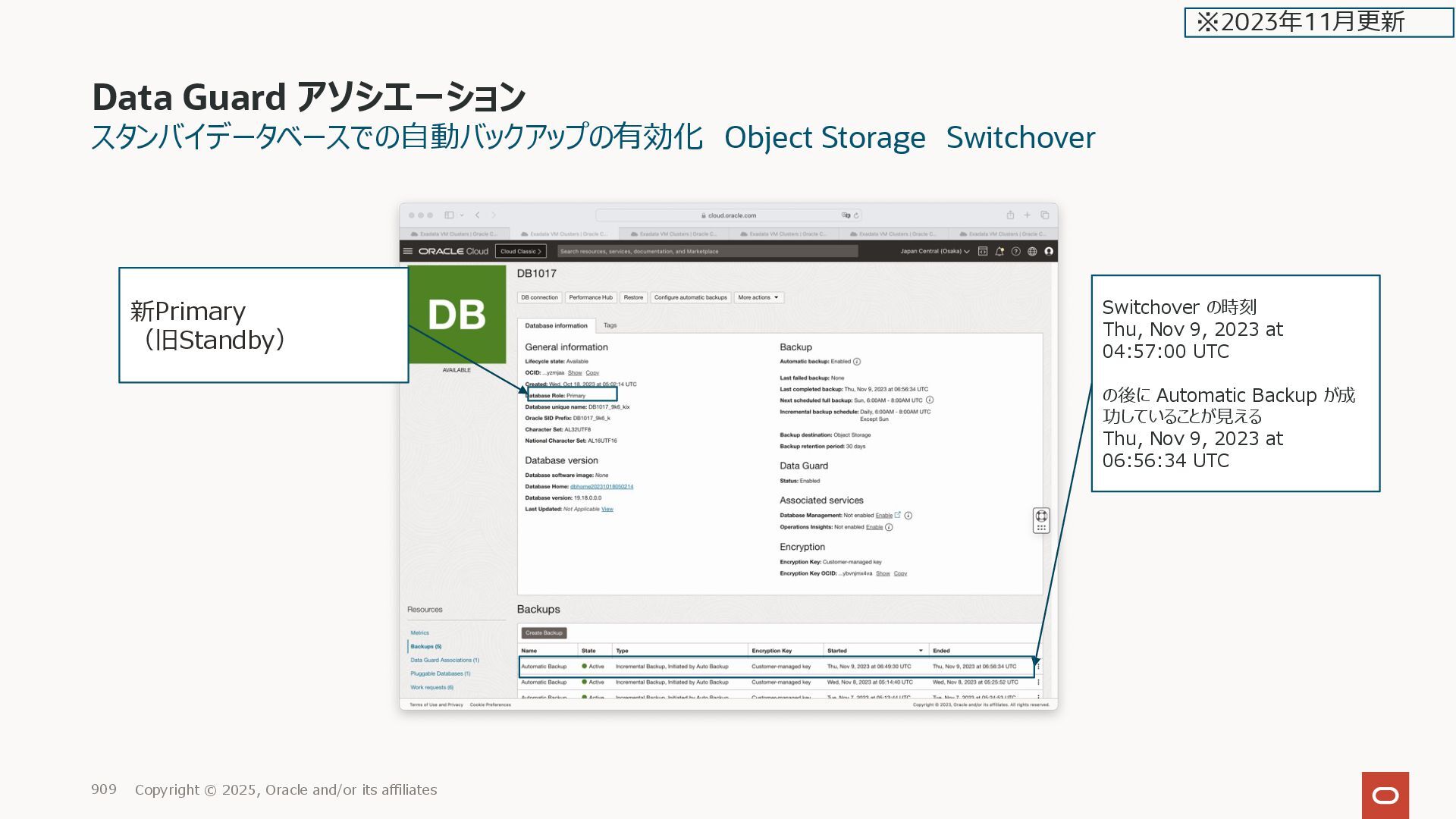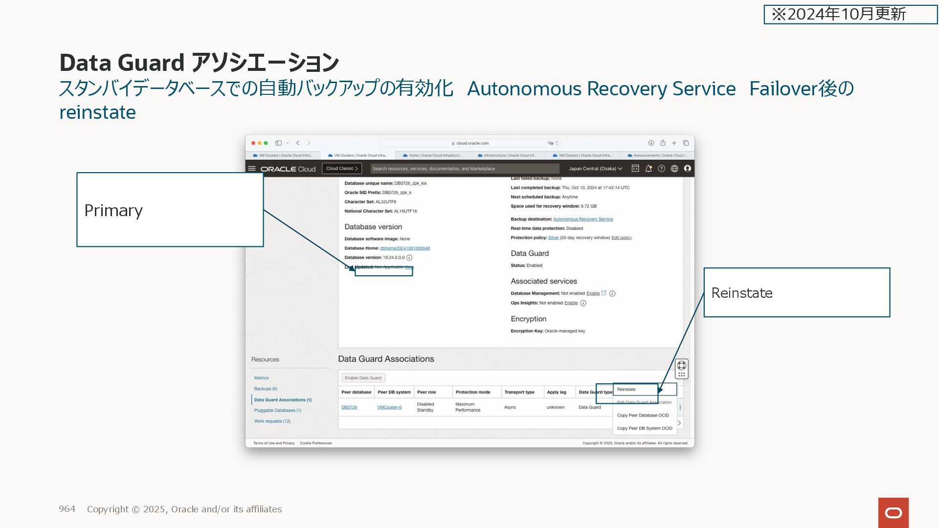 2025-04-03T01:31:51.131744+00:00 SQL> ALTER DISKGROUP DATAC2 DROP DISK 'DATAC2_CD_00_kix101117exdcl10', 'DATAC2_CD_01_kix101117exdcl10', 'DATAC2_CD_02_kix101117exdcl10', 'DATAC2_CD_03_kix101117exdcl10', 'DATAC2_CD_04_kix101117exdcl10', 'DATAC2_CD_05_kix101117exdcl10', 'DATAC2_CD_06_kix101117exdcl10', 'DATAC2_CD_07_kix101117exdcl10', 'DATAC2_CD_08_kix101117exdcl10', 'DATAC2_CD_09_kix101117exdcl10', 'DATAC2_CD_10_kix101117exdcl10', 'DATAC2_CD_11_kix101117exdcl10' REBALANCE POWER 4 略 SUCCESS: ALTER DISKGROUP RECOC2 DROP DISK 'RECOC2_CD_00_kix101117exdcl10', 'RECOC2_CD_01_kix101117exdcl10', 'RECOC2_CD_02_kix101117exdcl10', 'RECOC2_CD_03_kix101117exdcl10', 'RECOC2_CD_04_kix101117exdcl10', 'RECOC2_CD_05_kix101117exdcl10', 'RECOC2_CD_06_kix101117exdcl10', 'RECOC2_CD_07_kix101117exdcl10', 'RECOC2_CD_08_kix101117exdcl10', 'RECOC2_CD_09_kix101117exdcl10', 'RECOC2_CD_10_kix101117exdcl10', 'RECOC2_CD_11_kix101117exdcl10' REBALANCE POWER 4 NOTE: Attempting voting file refresh on diskgroup RECOC2 NOTE: Refresh completed on diskgroup RECOC2. No voting file found. 2025-04-03T01:32:19.466977+00:00 Exadata Infrastructure Copyright © 2025, Oracle and/or its affiliates 132 ※2025年4⽉更新