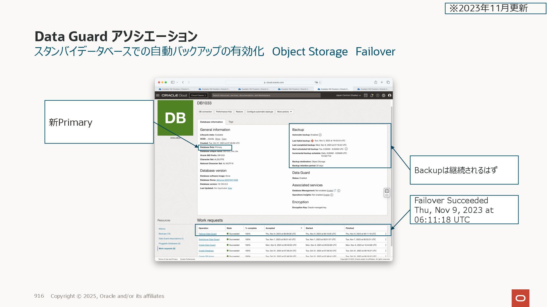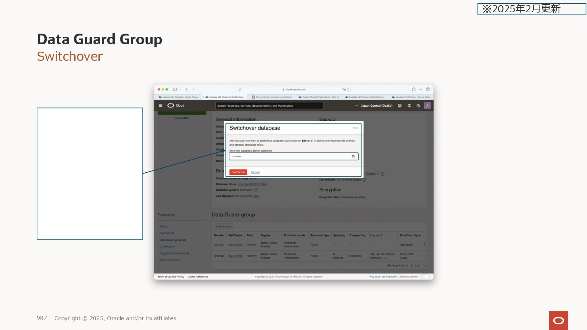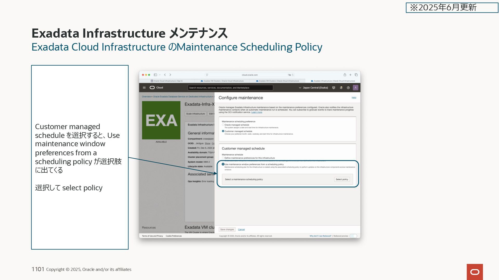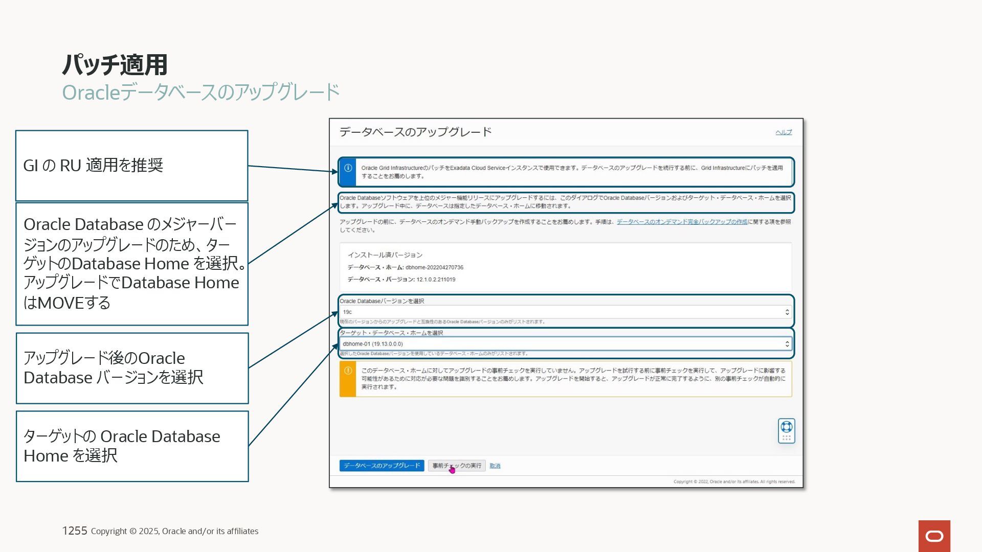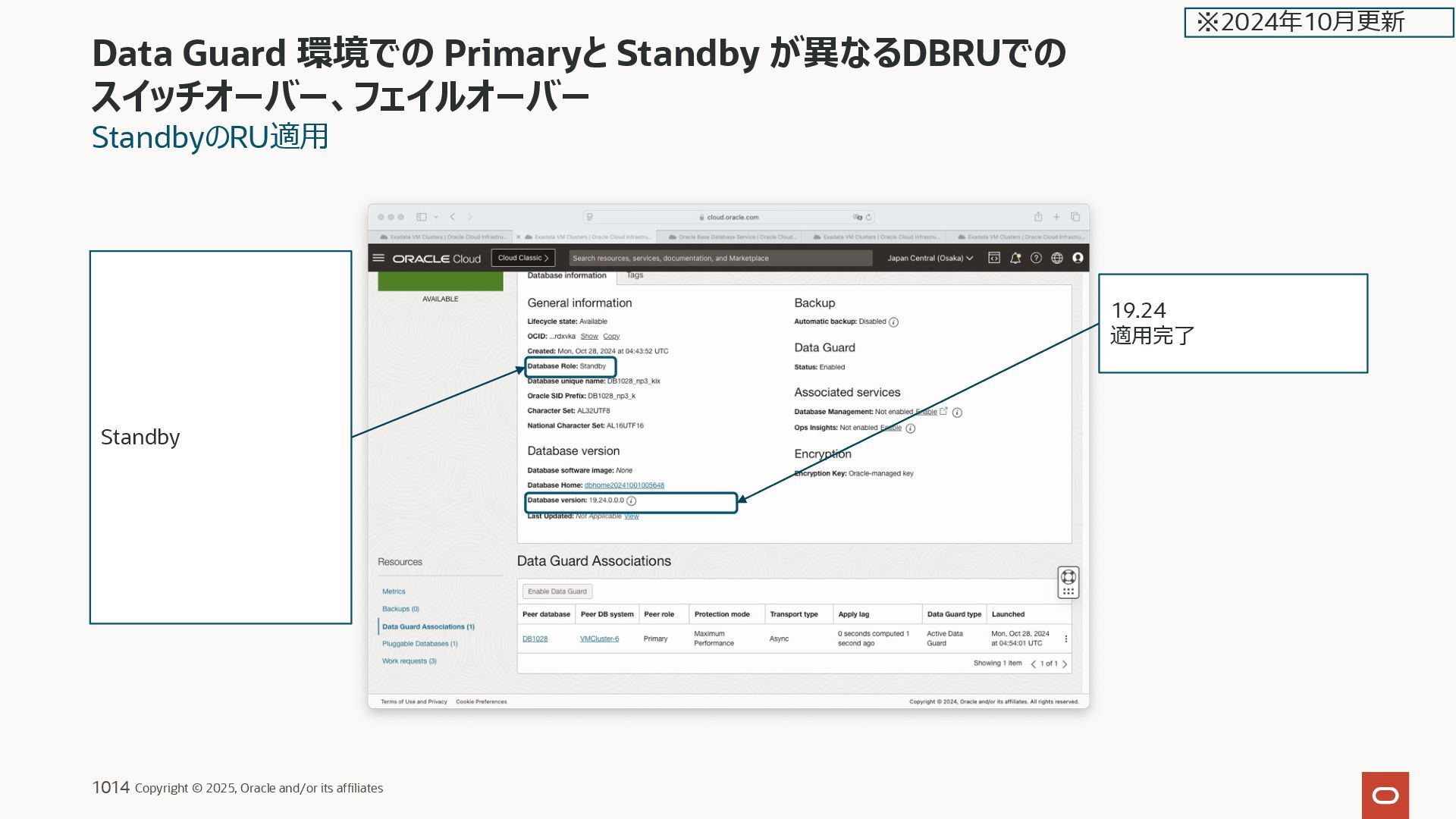 2025-04-03T01:31:51.131744+00:00 SQL> ALTER DISKGROUP DATAC2 DROP DISK 'DATAC2_CD_00_kix101117exdcl10', 'DATAC2_CD_01_kix101117exdcl10', 'DATAC2_CD_02_kix101117exdcl10', 'DATAC2_CD_03_kix101117exdcl10', 'DATAC2_CD_04_kix101117exdcl10', 'DATAC2_CD_05_kix101117exdcl10', 'DATAC2_CD_06_kix101117exdcl10', 'DATAC2_CD_07_kix101117exdcl10', 'DATAC2_CD_08_kix101117exdcl10', 'DATAC2_CD_09_kix101117exdcl10', 'DATAC2_CD_10_kix101117exdcl10', 'DATAC2_CD_11_kix101117exdcl10' REBALANCE POWER 4 略 SUCCESS: ALTER DISKGROUP RECOC2 DROP DISK 'RECOC2_CD_00_kix101117exdcl10', 'RECOC2_CD_01_kix101117exdcl10', 'RECOC2_CD_02_kix101117exdcl10', 'RECOC2_CD_03_kix101117exdcl10', 'RECOC2_CD_04_kix101117exdcl10', 'RECOC2_CD_05_kix101117exdcl10', 'RECOC2_CD_06_kix101117exdcl10', 'RECOC2_CD_07_kix101117exdcl10', 'RECOC2_CD_08_kix101117exdcl10', 'RECOC2_CD_09_kix101117exdcl10', 'RECOC2_CD_10_kix101117exdcl10', 'RECOC2_CD_11_kix101117exdcl10' REBALANCE POWER 4 NOTE: Attempting voting file refresh on diskgroup RECOC2 NOTE: Refresh completed on diskgroup RECOC2. No voting file found. 2025-04-03T01:32:19.466977+00:00 Exadata Infrastructure Copyright © 2025, Oracle and/or its affiliates 132 ※2025年4⽉更新